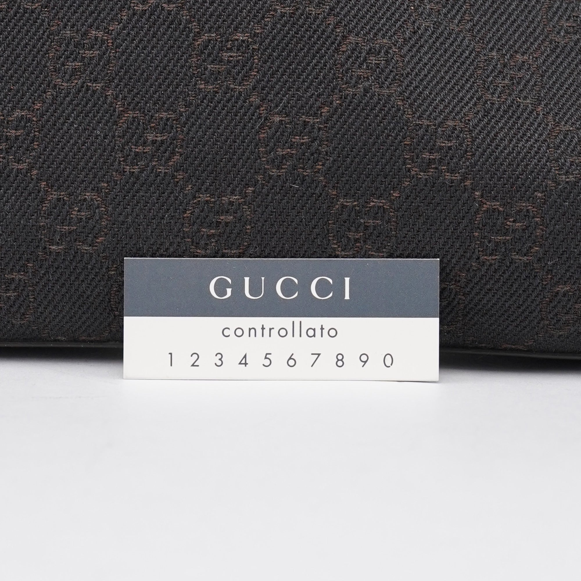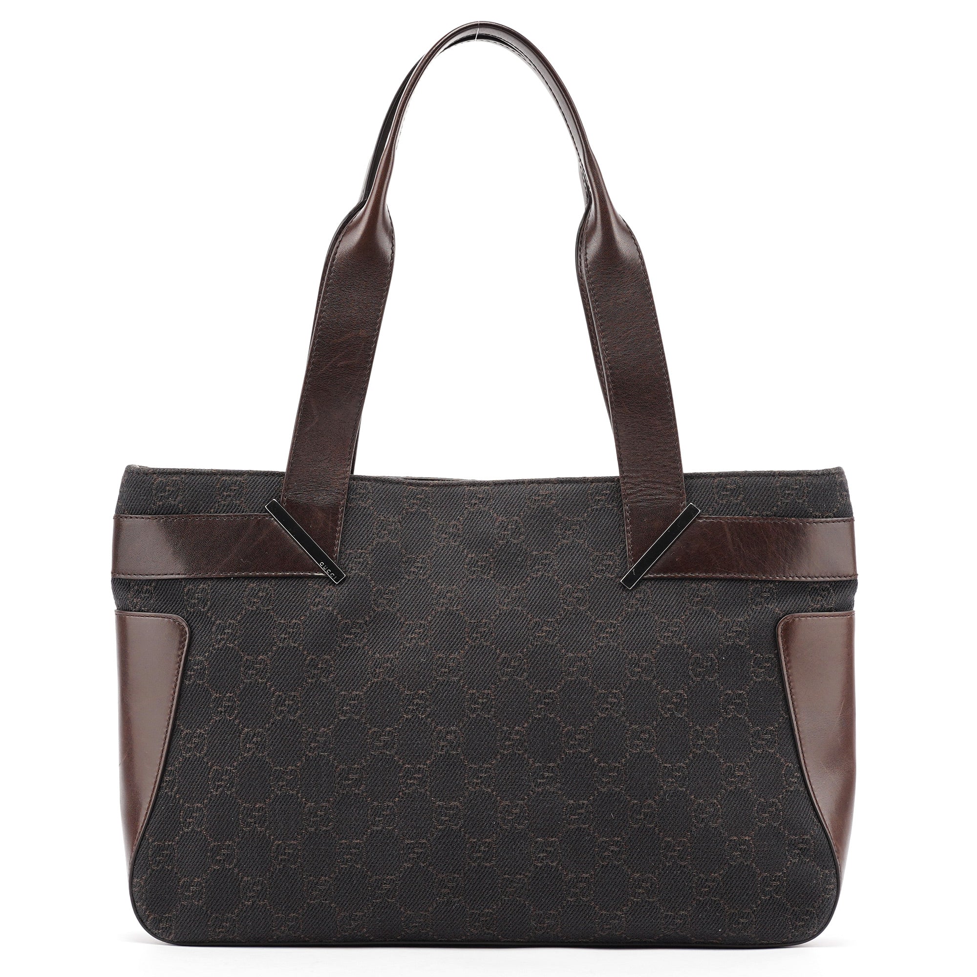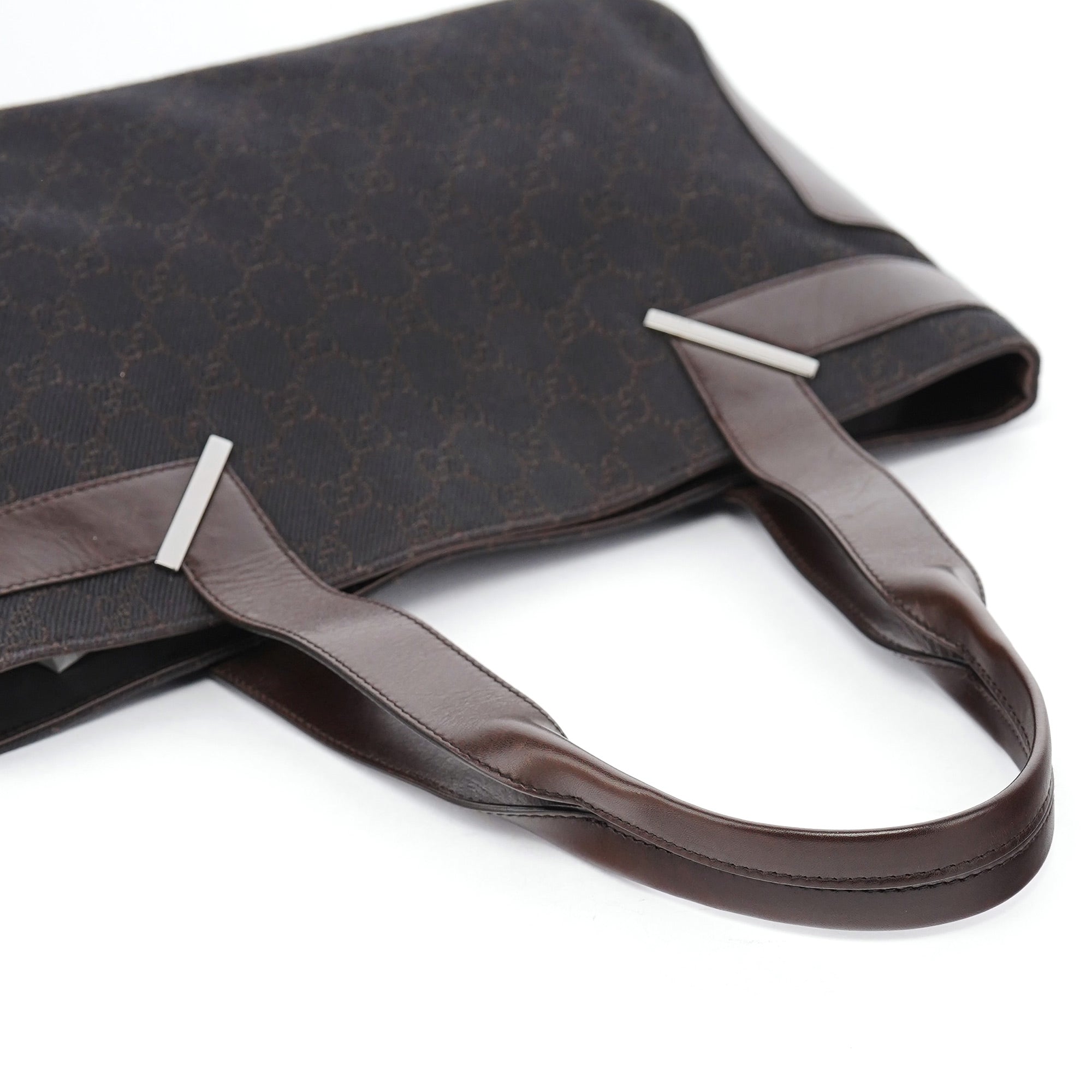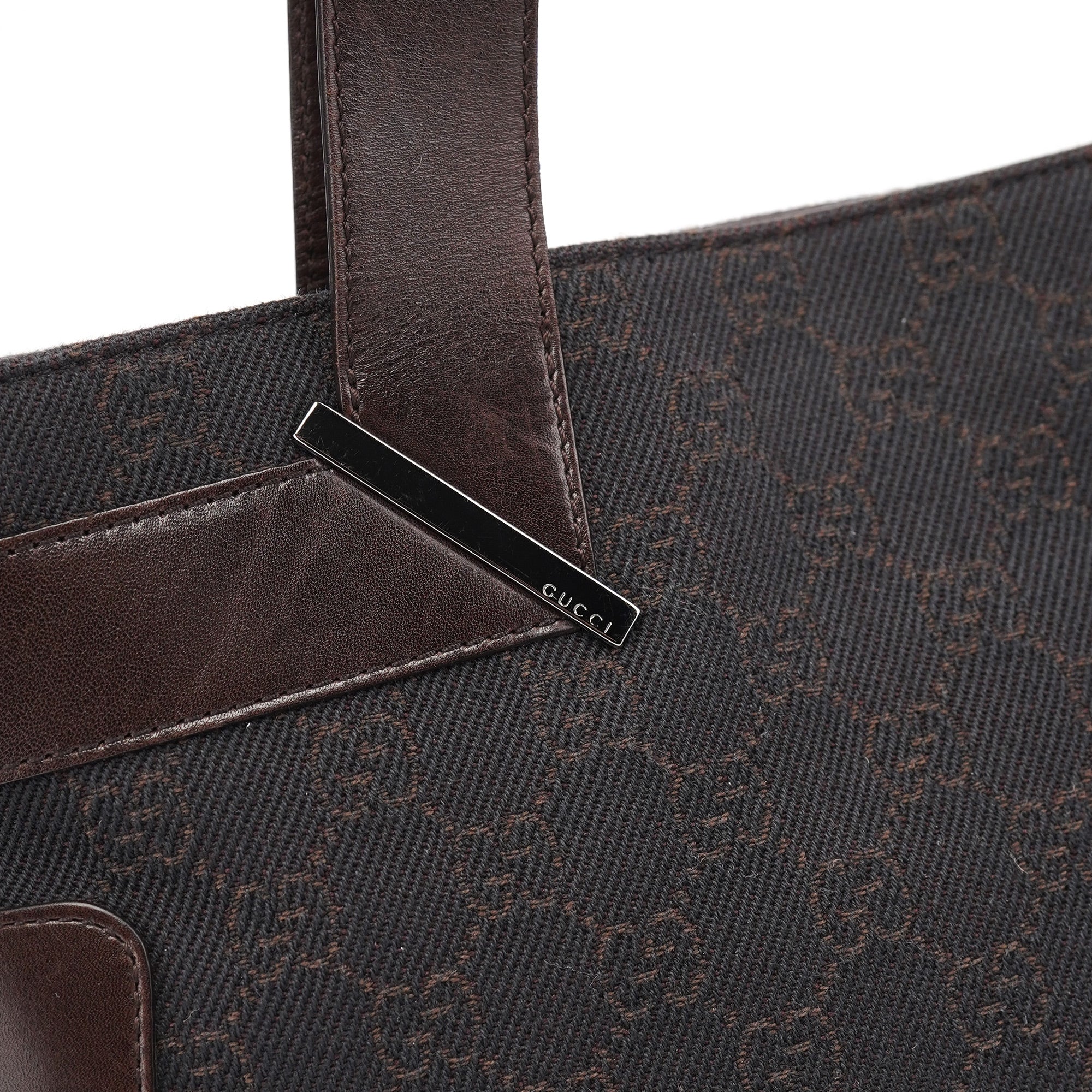 Designed in the early 2000s under Tom Ford, this structured Gucci tote is crafted in brown GG monogram canvas with smooth leather trim and angular corner reinforcements. The elongated shape and dual top handles lend it a sharp, modernist profile, while the interior features a zip compartment and slip pocket for organization.