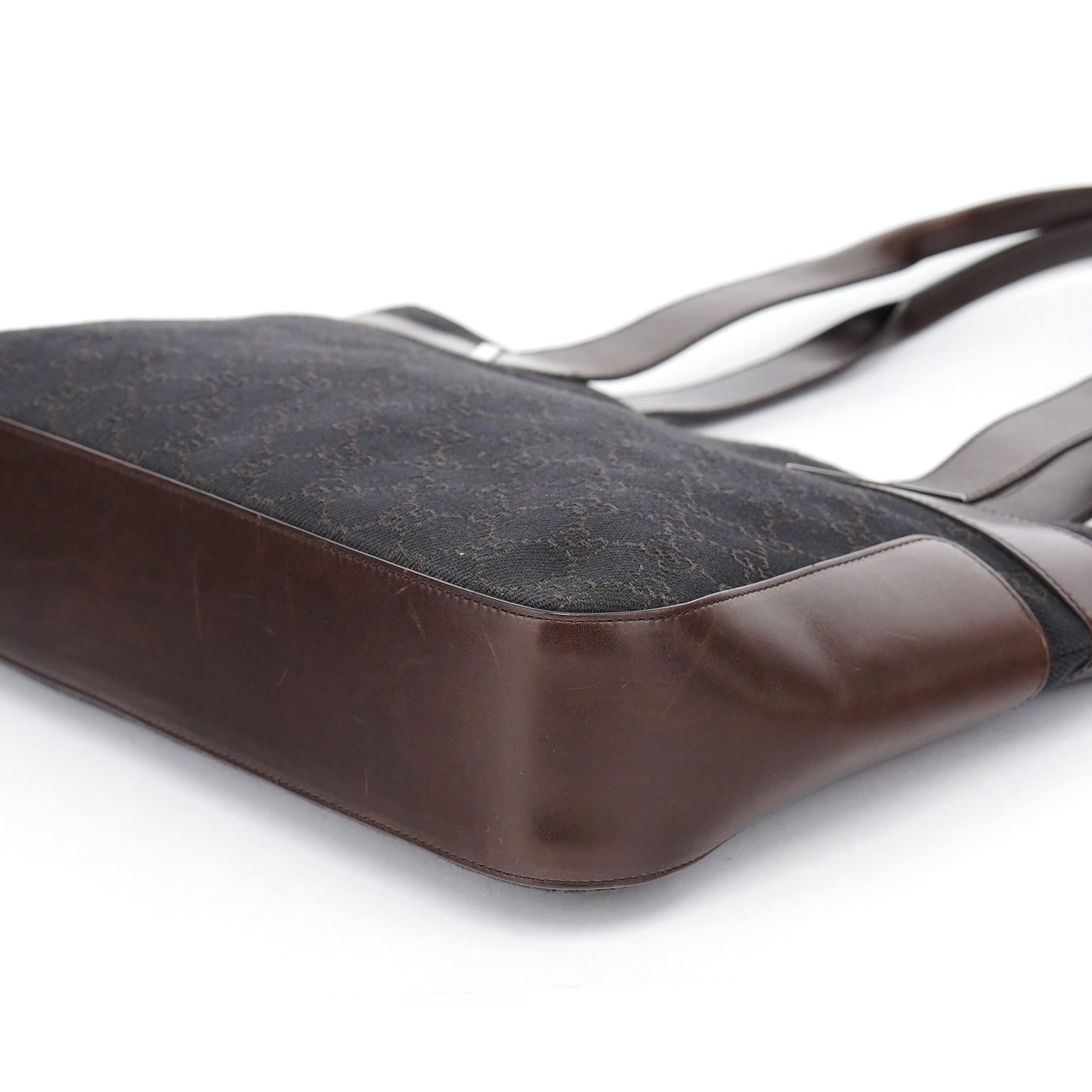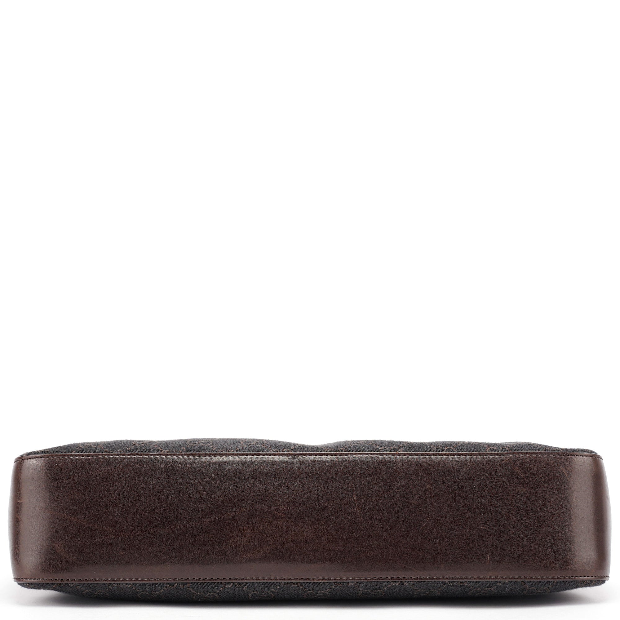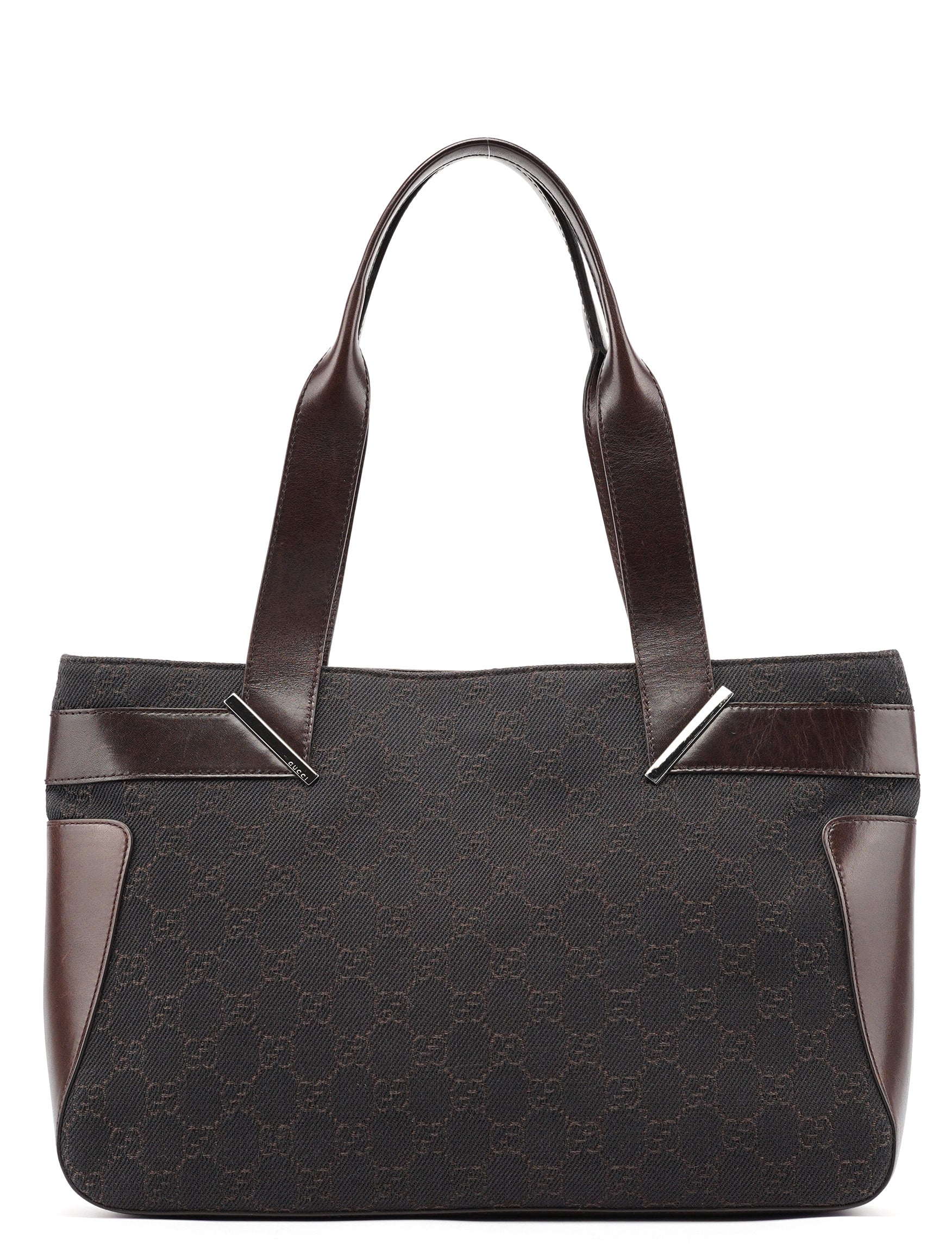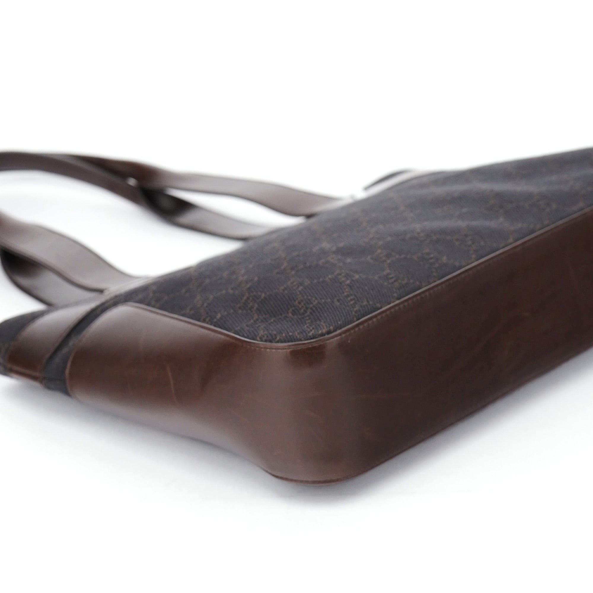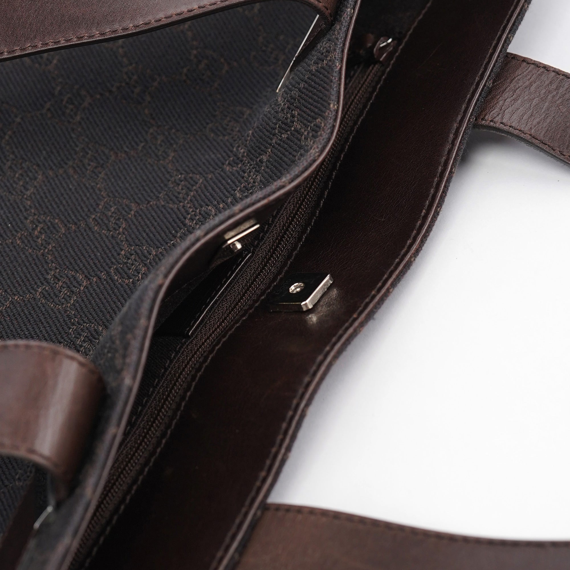 Designed in the early 2000s under Tom Ford, this structured Gucci tote is crafted in brown GG monogram canvas with smooth leather trim and angular corner reinforcements. The elongated shape and dual top handles lend it a sharp, modernist profile, while the interior features a zip compartment and slip pocket for organization.