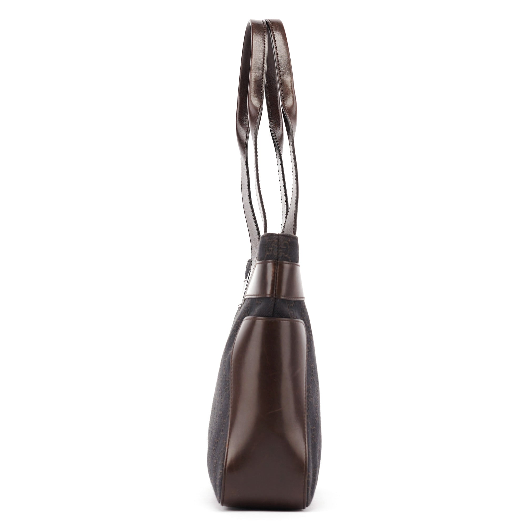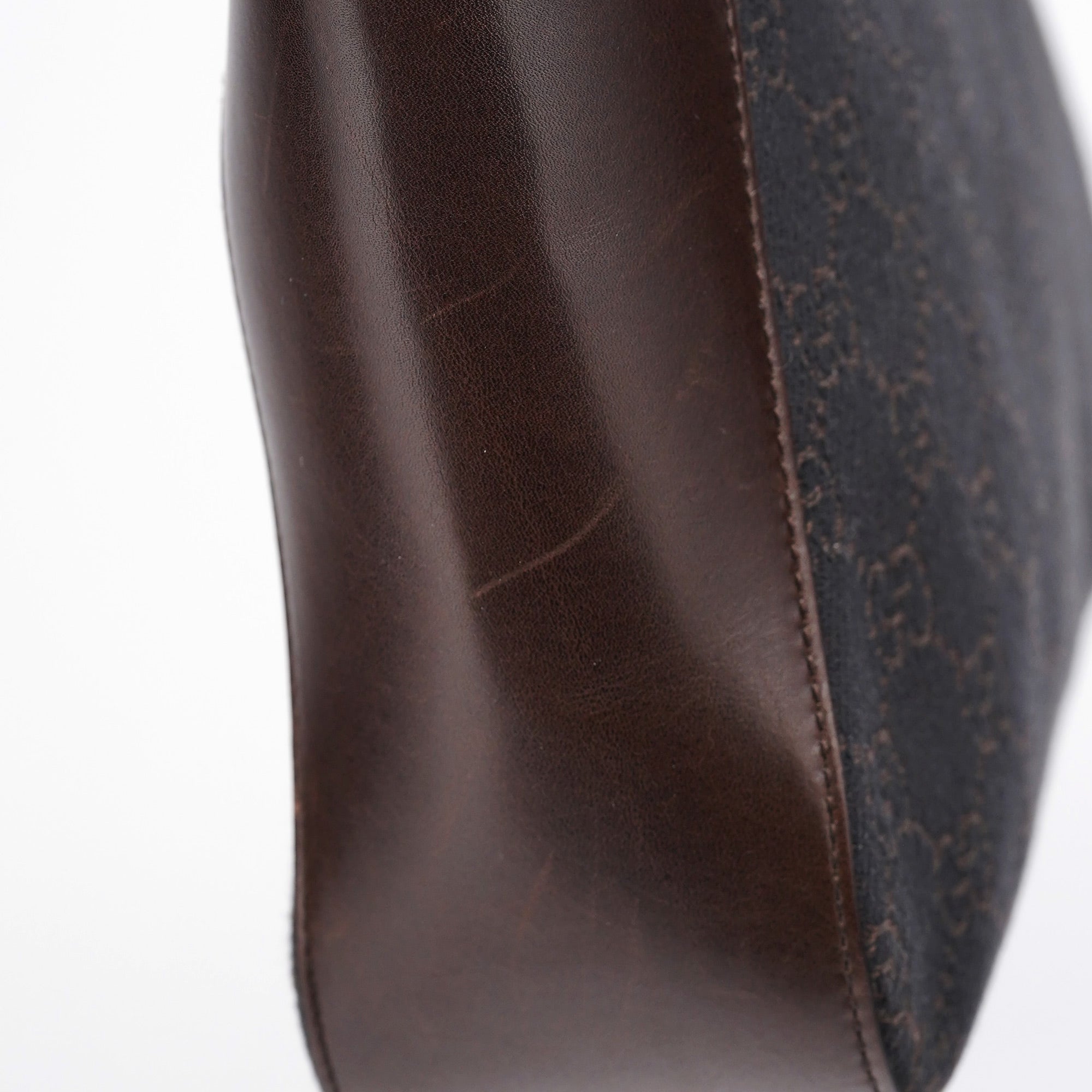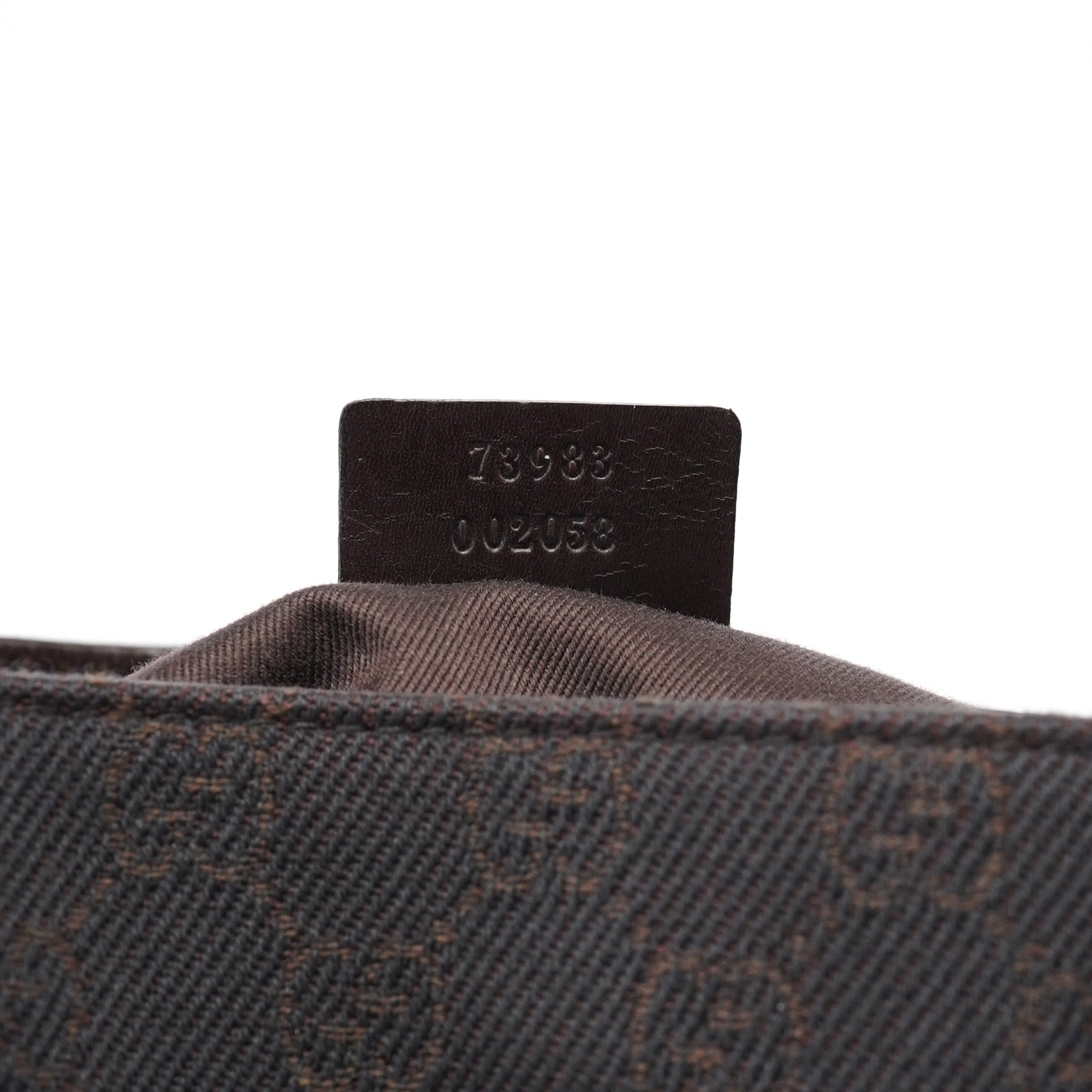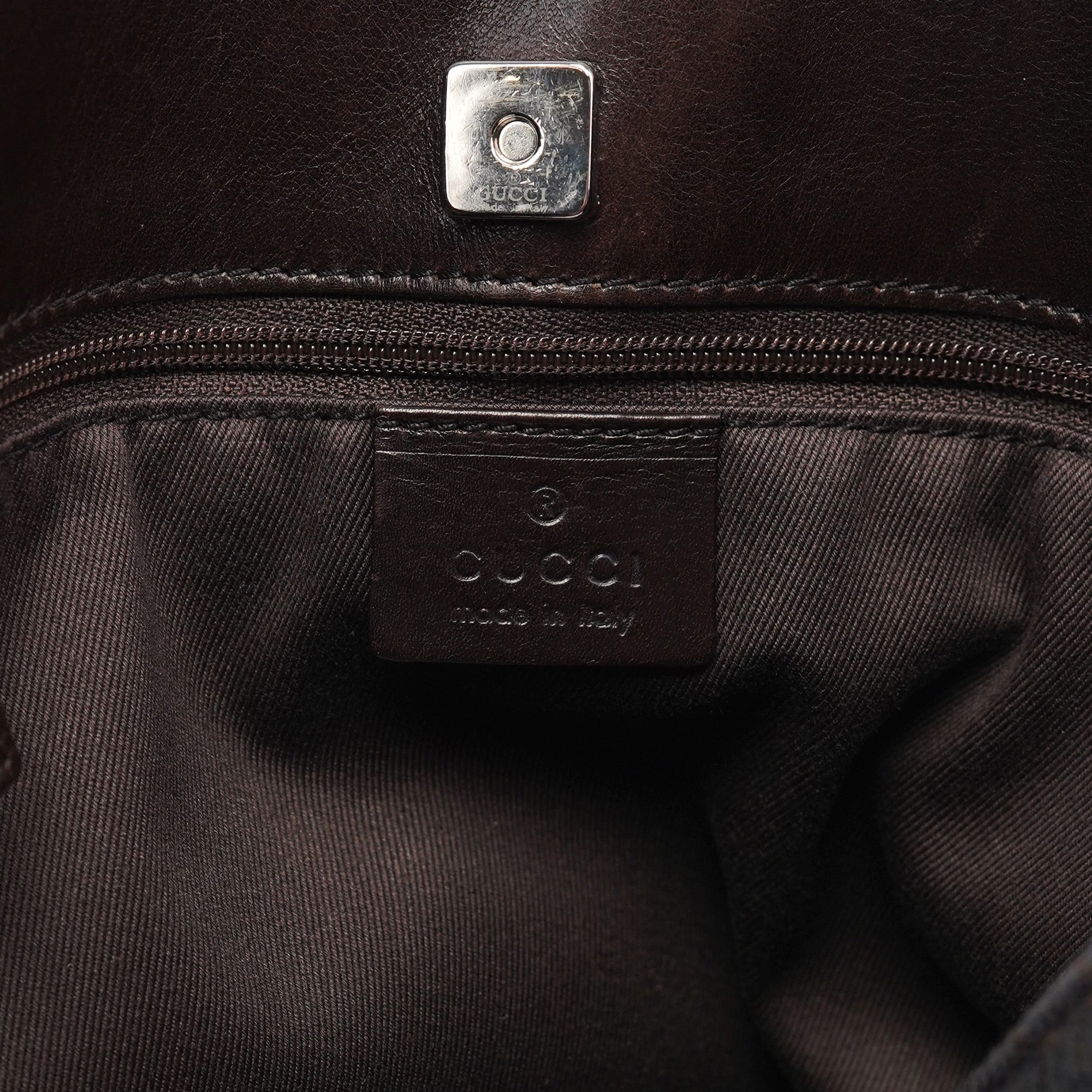 Designed in the early 2000s under Tom Ford, this structured Gucci tote is crafted in brown GG monogram canvas with smooth leather trim and angular corner reinforcements. The elongated shape and dual top handles lend it a sharp, modernist profile, while the interior features a zip compartment and slip pocket for organization.