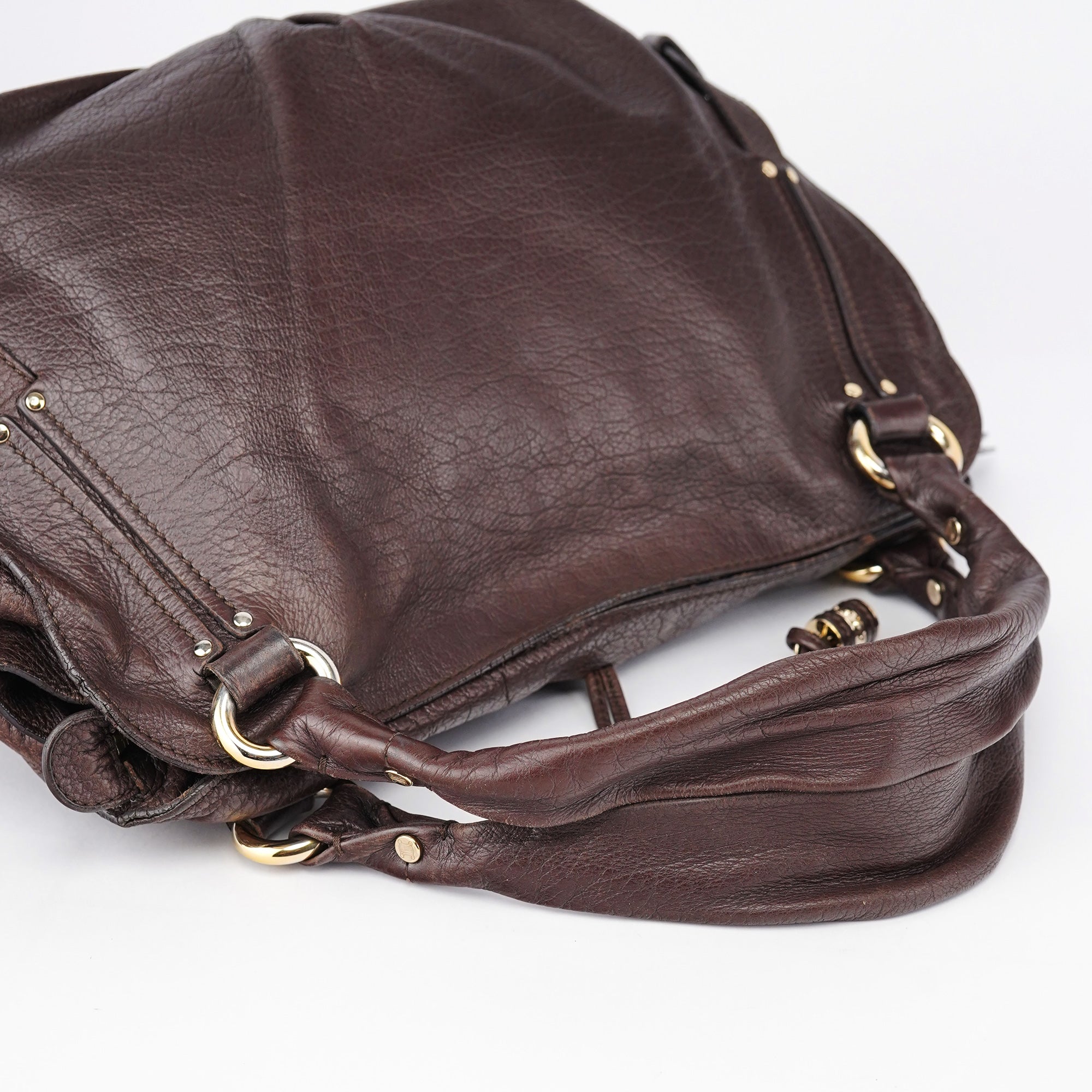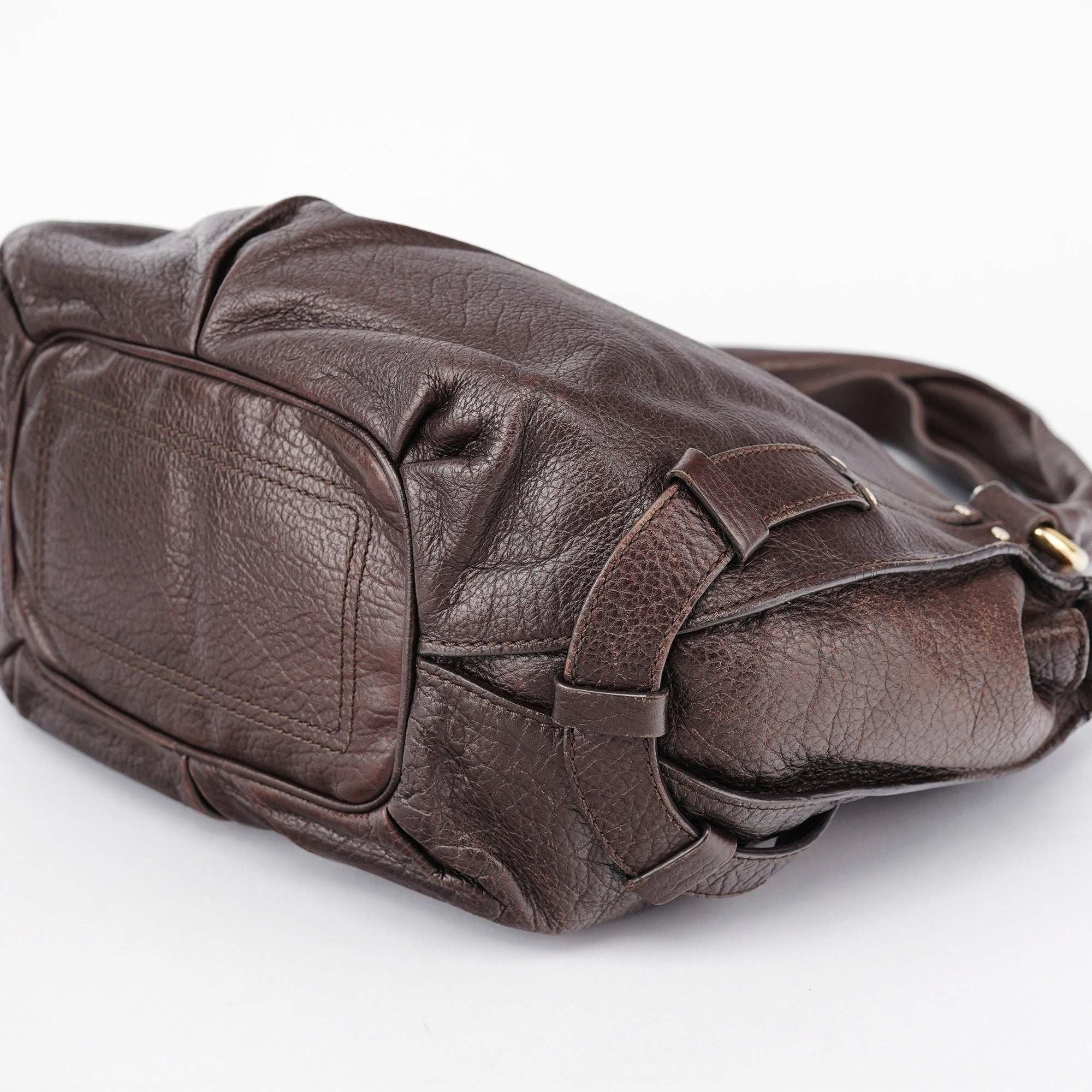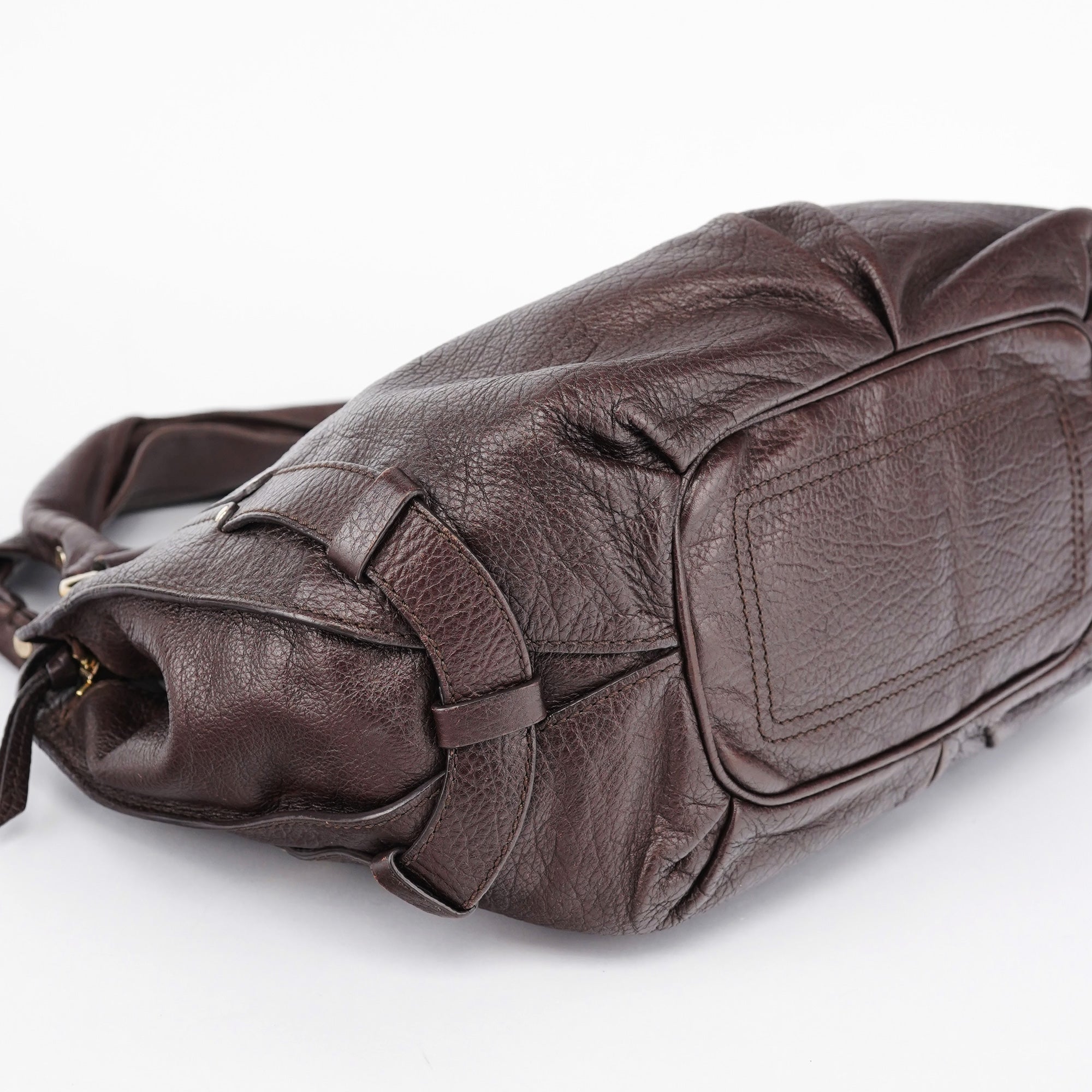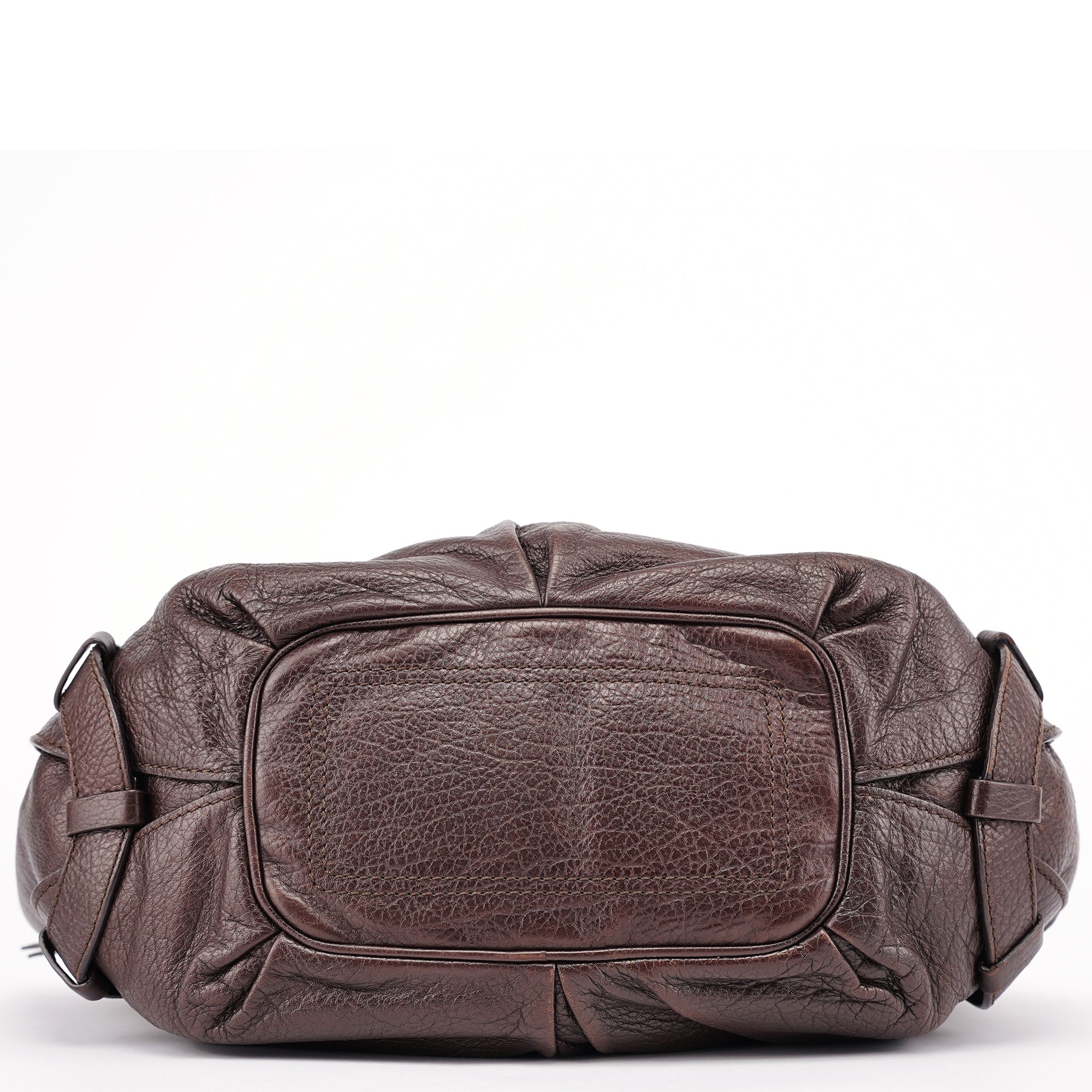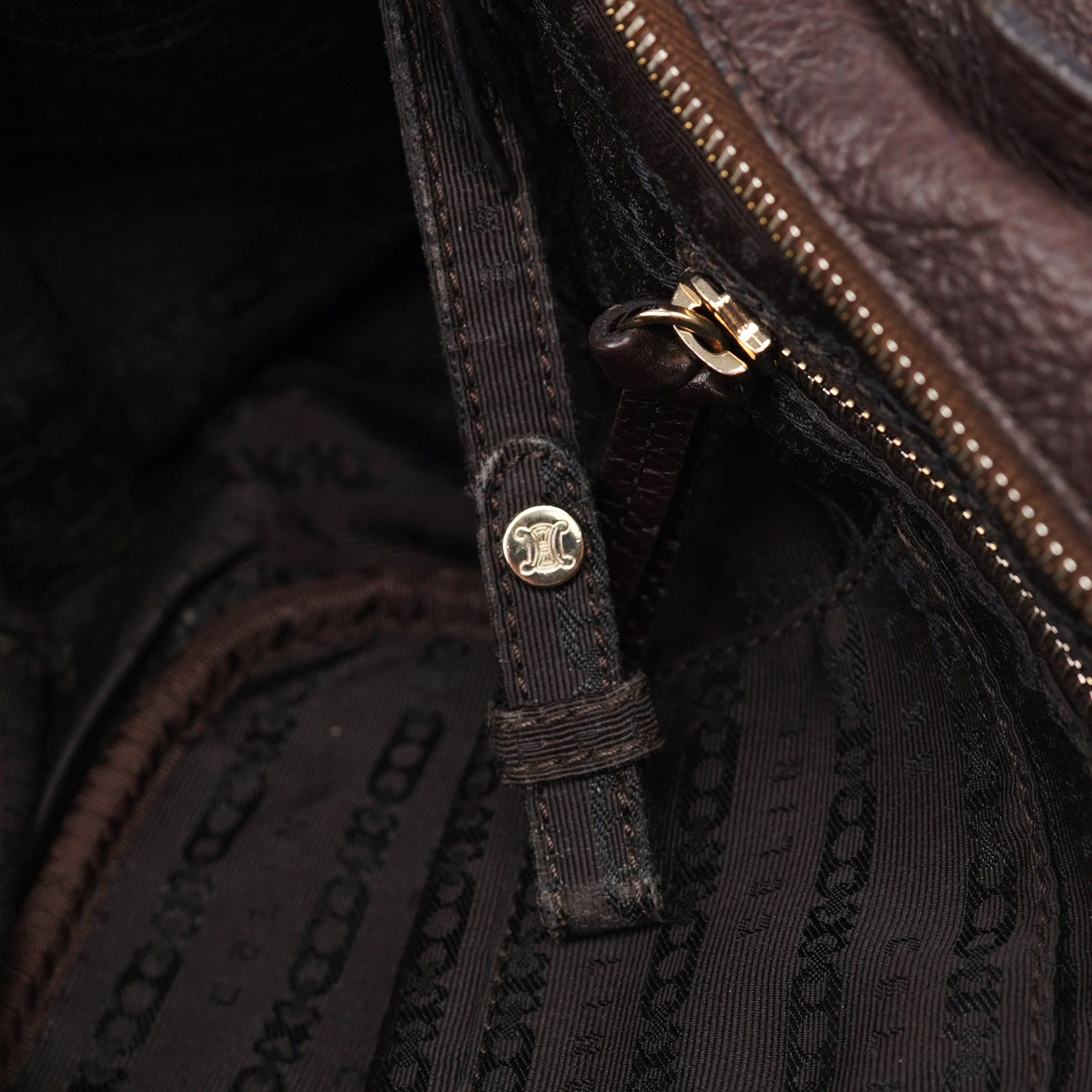 Designed in the early 2000s, the Celine Bittersweet shoulder bag is crafted in supple brown leather with pleated gussets and a signature drawstring tie. The double handle design is accented with gold-tone hardware and side buckles, while the interior is lined in tonal logo jacquard with a zip pocket and slip compartments.