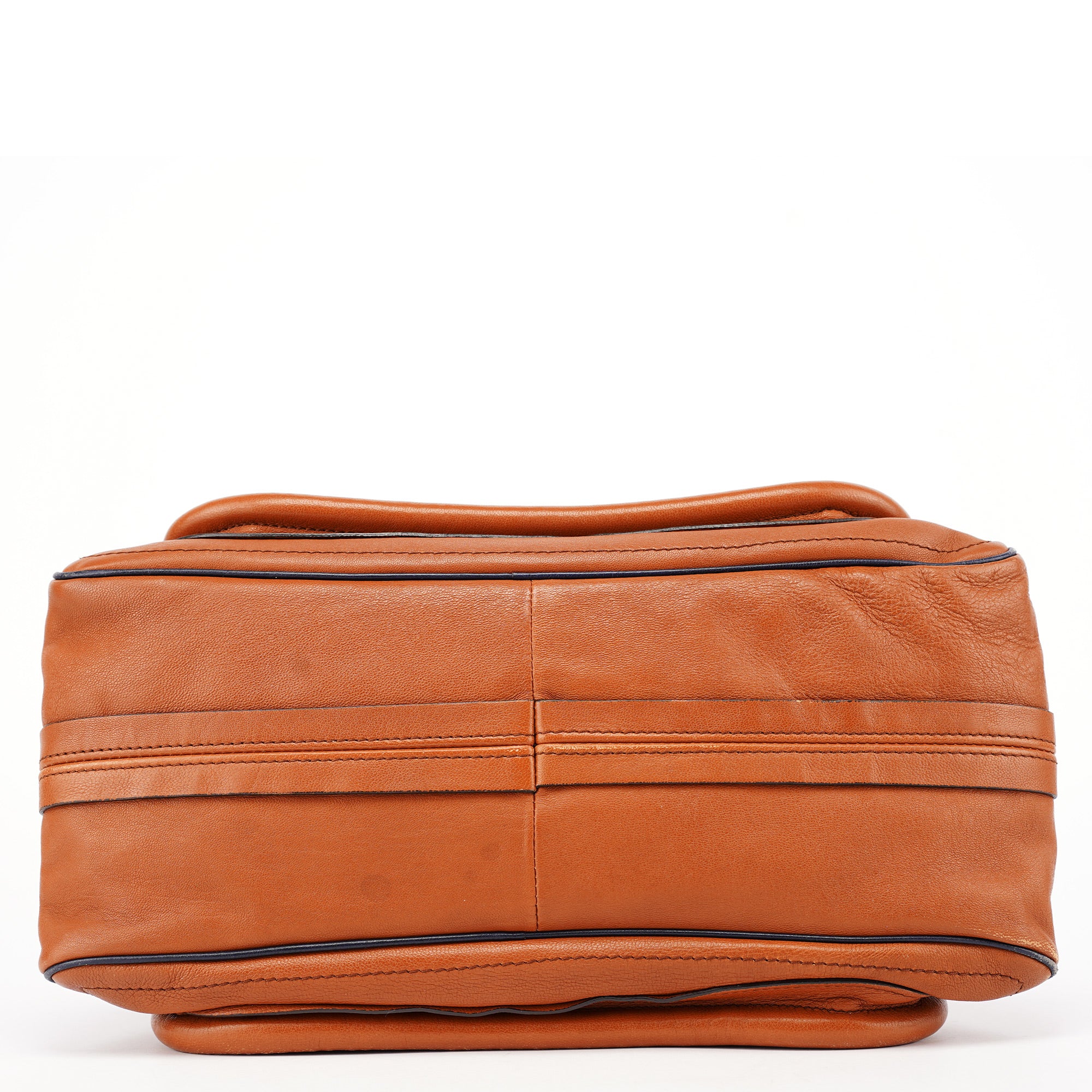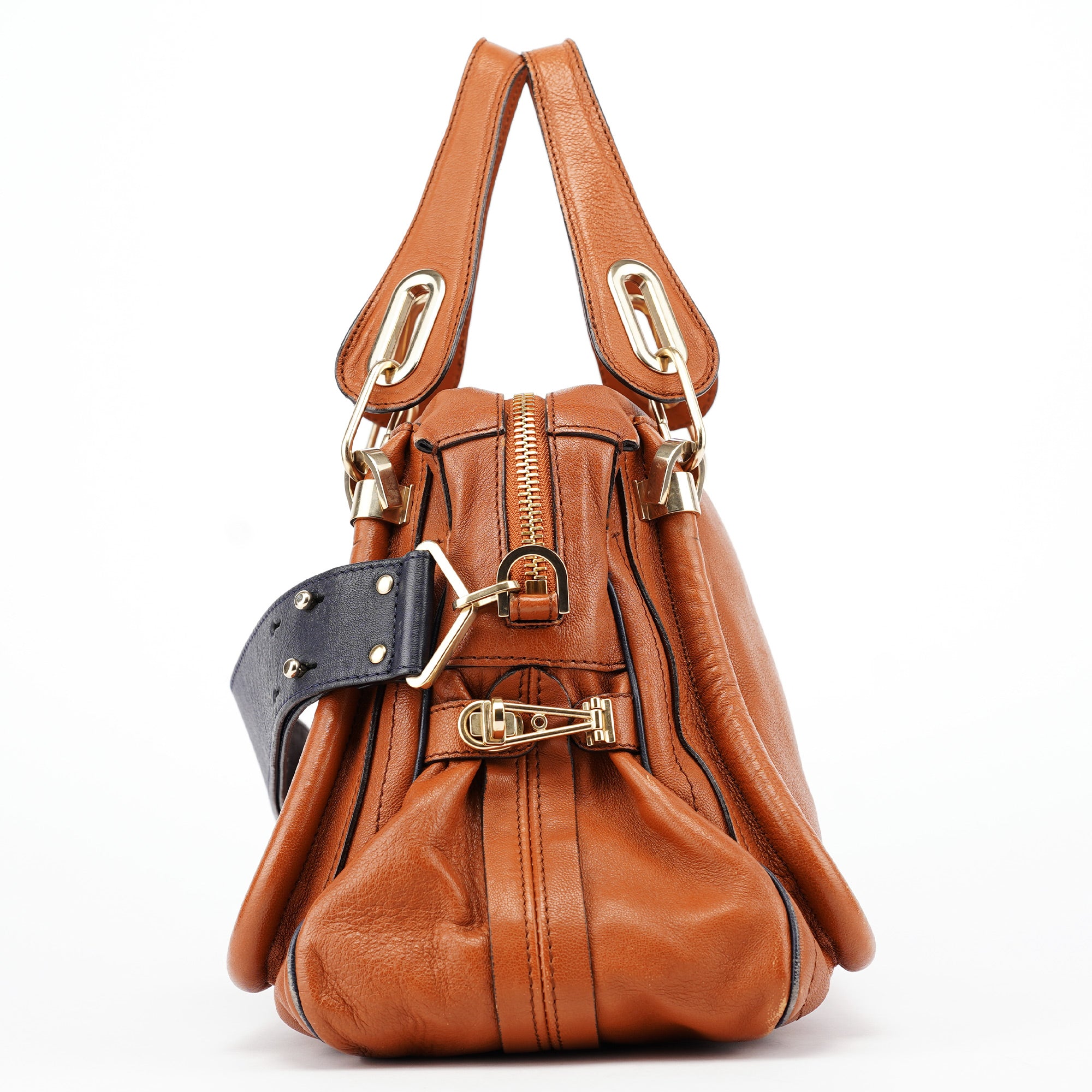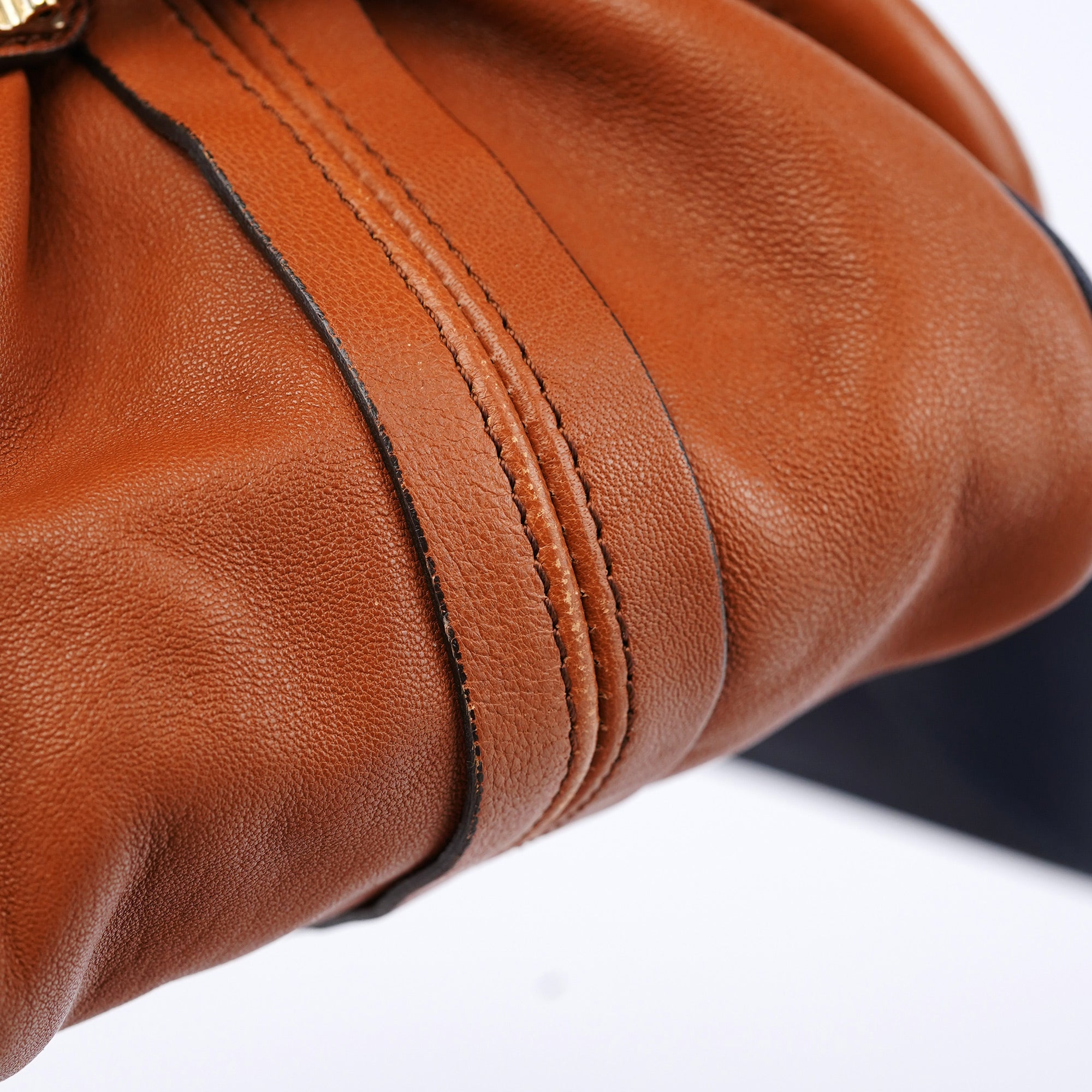Designed by Hannah MacGibbon in 2008, this Chloé Paraty bag is crafted from rich brown leather with a contrast navy shoulder strap and the line’s signature piped trim. Gold-tone hardware accents the sculptural silhouette, complete with rolled top handles and a fixed shoulder strap.. The zip closure opens to a spacious canvas-lined interior, blending everyday practicality with Chloé’s elegant, bohemian aesthetic.