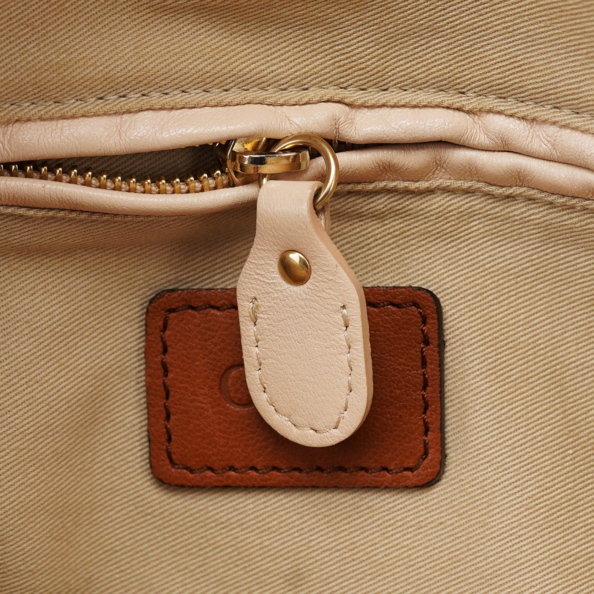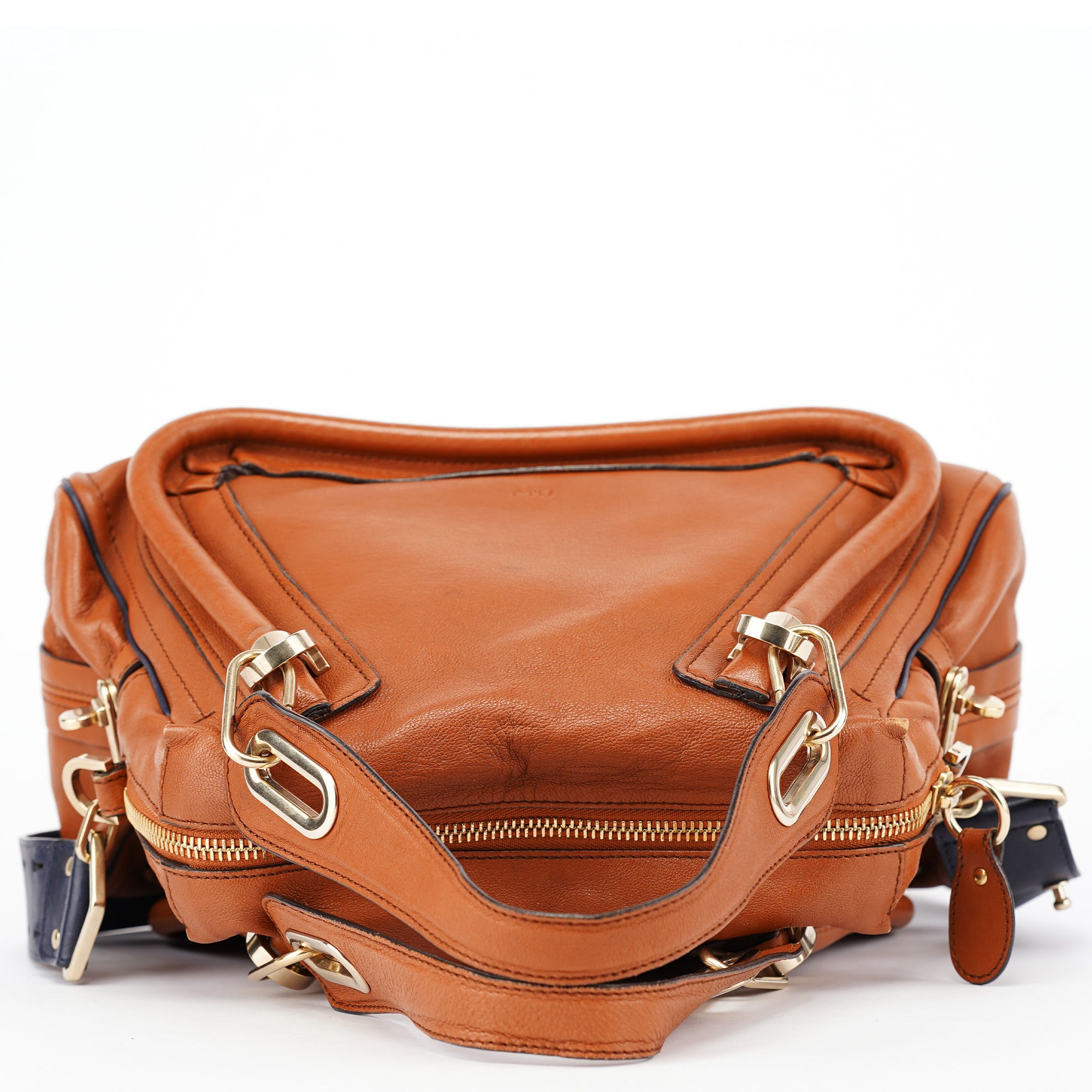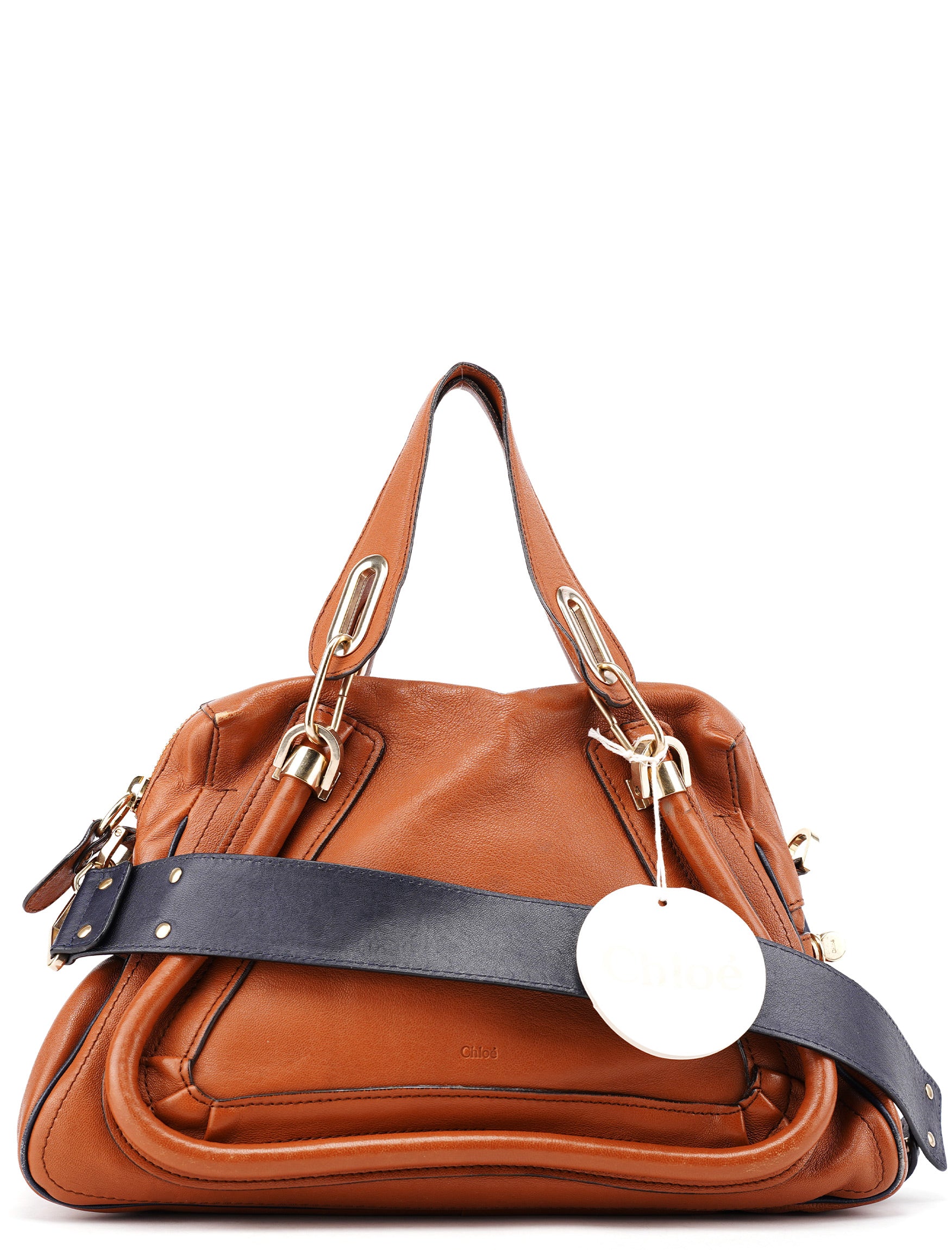 Designed by Hannah MacGibbon in 2008, this Chloé Paraty bag is crafted from rich brown leather with a contrast navy shoulder strap and the line’s signature piped trim. Gold-tone hardware accents the sculptural silhouette, complete with rolled top handles and a fixed shoulder strap.. The zip closure opens to a spacious canvas-lined interior, blending everyday practicality with Chloé’s elegant, bohemian aesthetic.