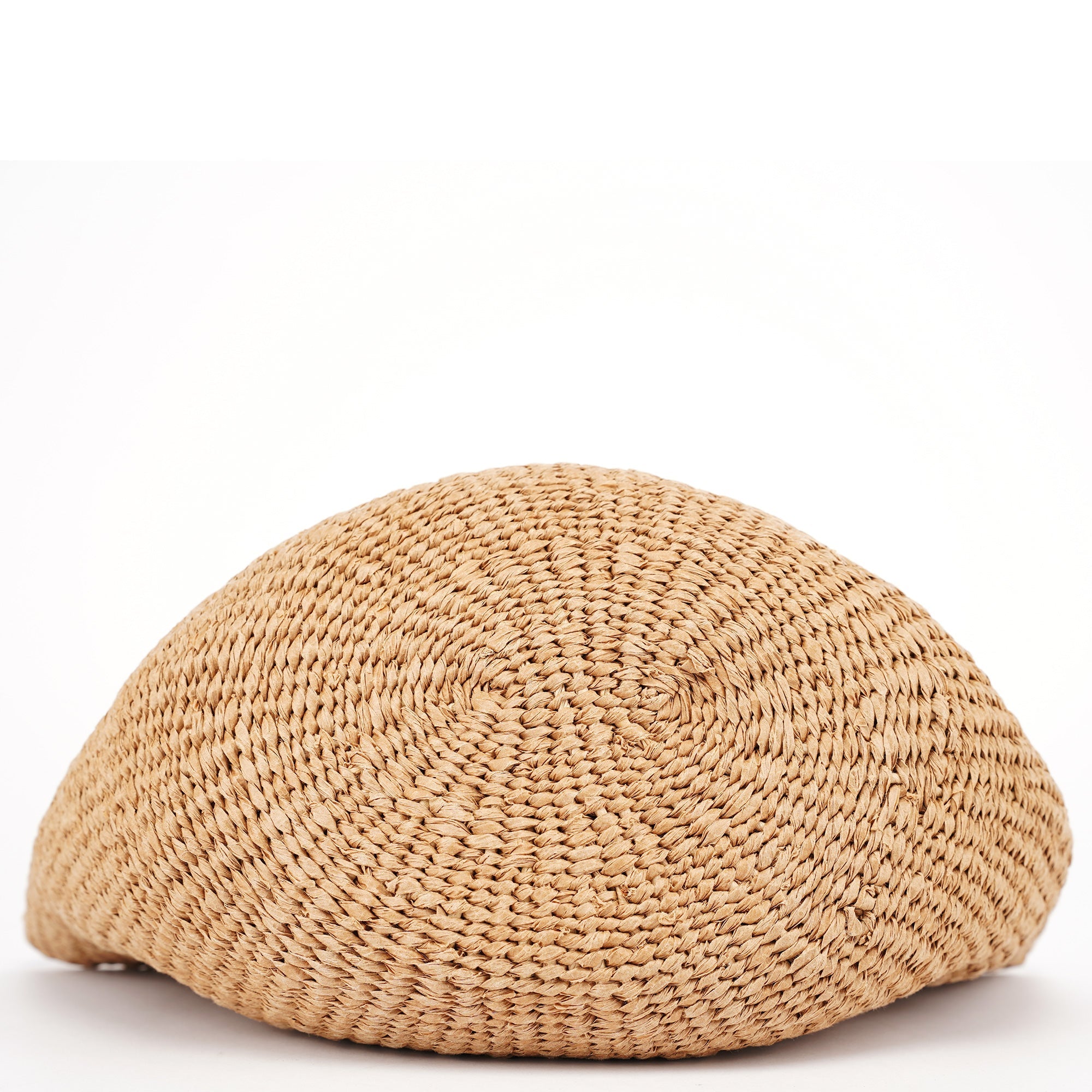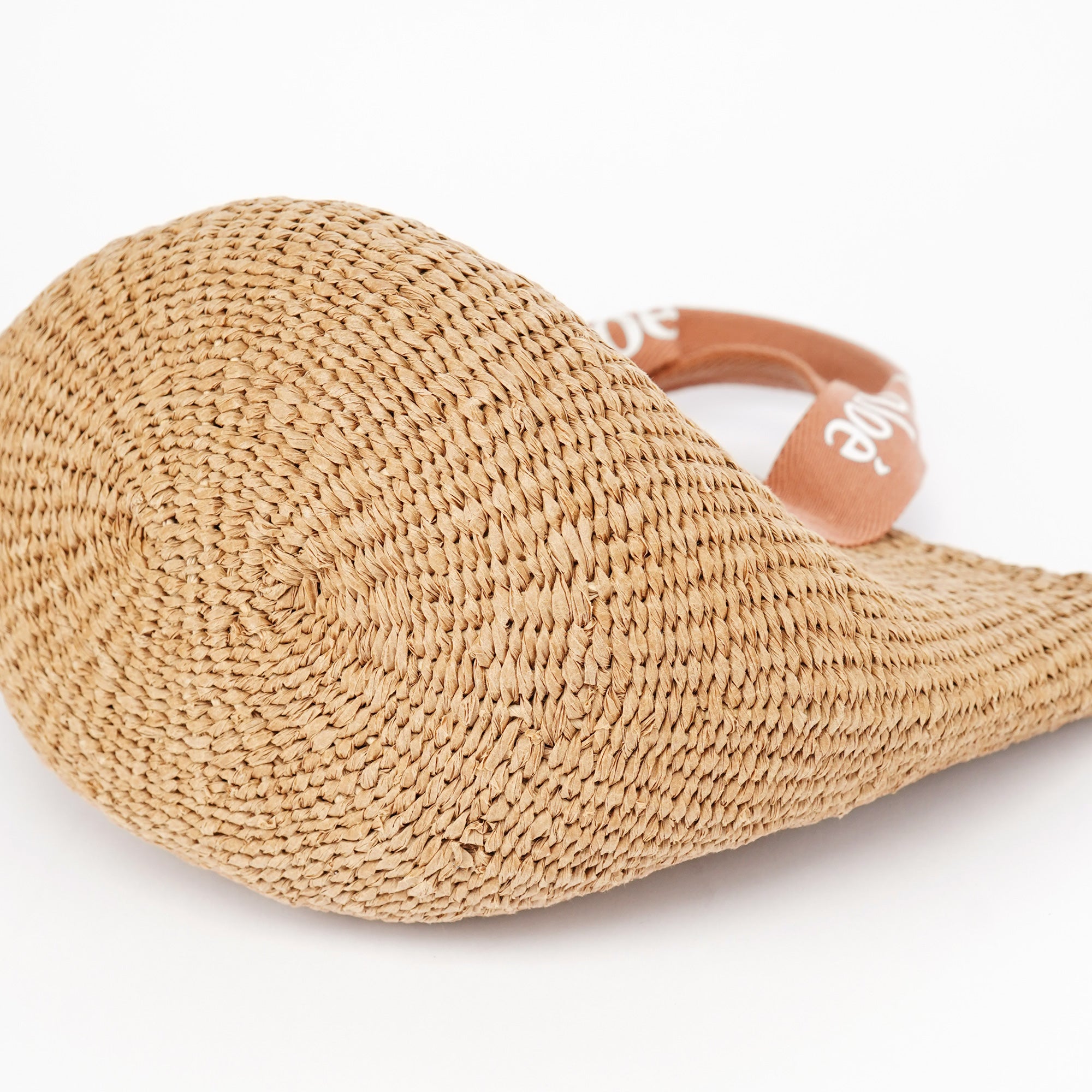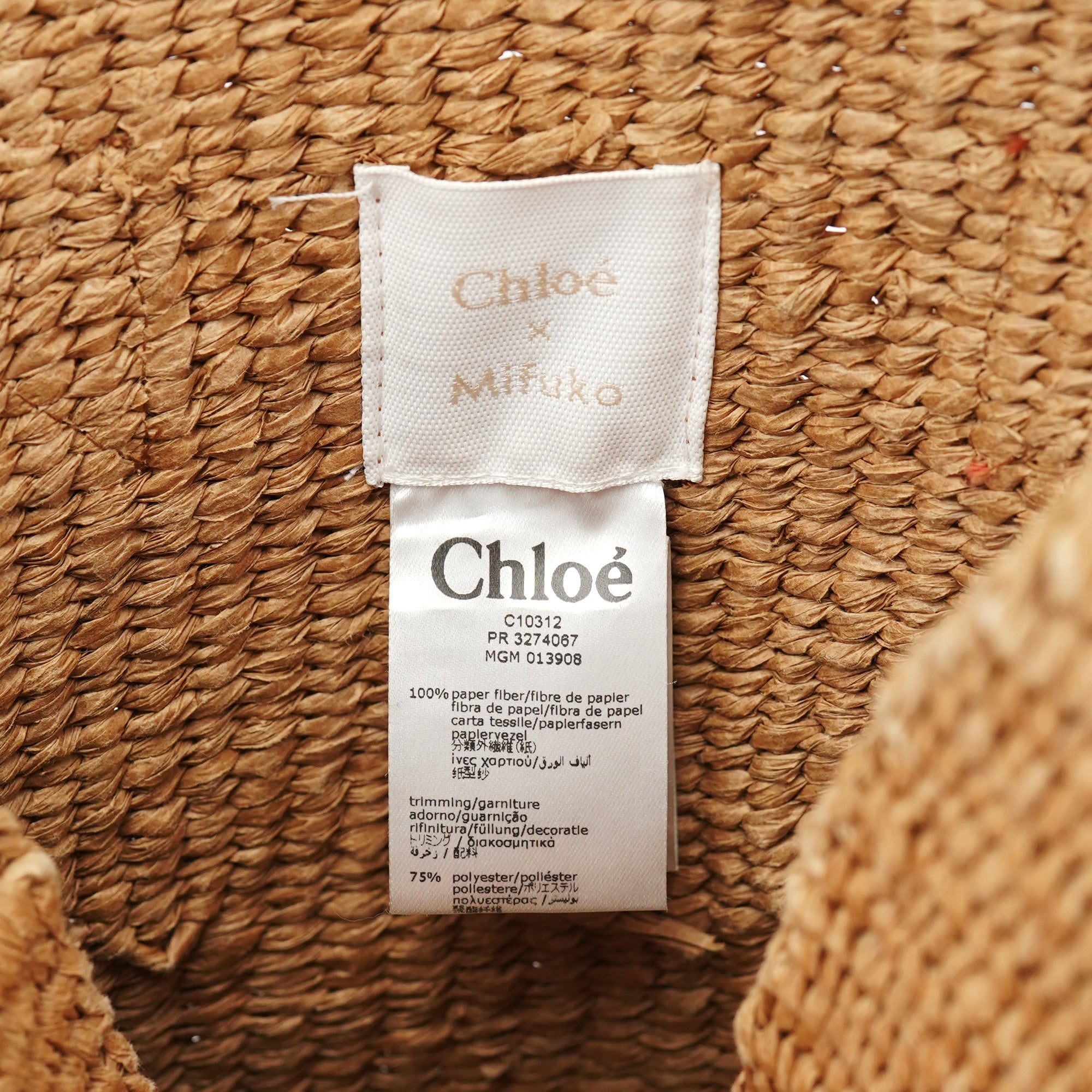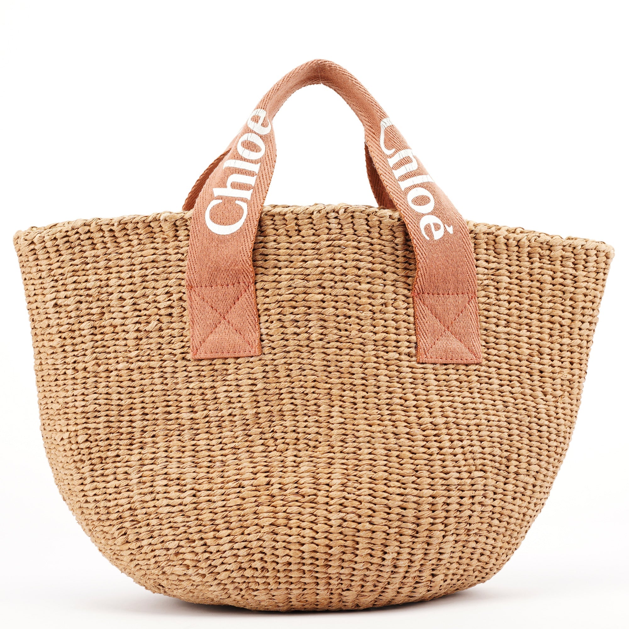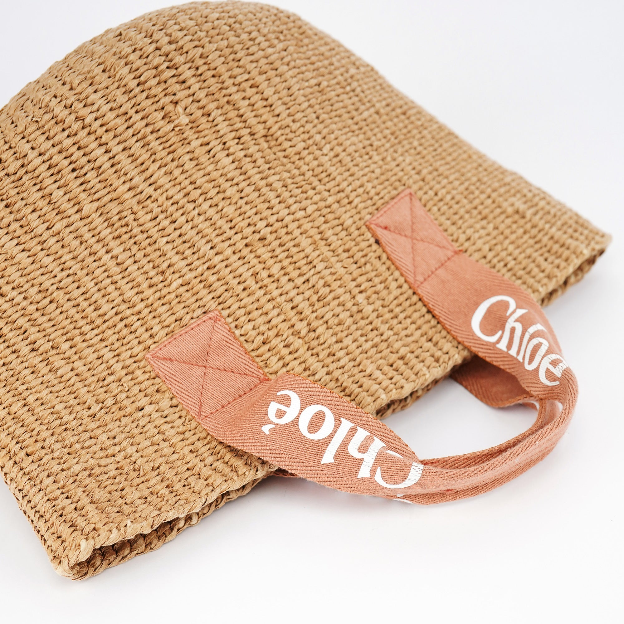 Designed in the 2010s, this Chloé woven raffia tote features a softly structured silhouette with wide rounded base and short rolled logo webbing handles in a muted terracotta tone. Crafted from natural raffia with no lining or interior compartments, it’s ideal as a lightweight summer carryall or beach bag.