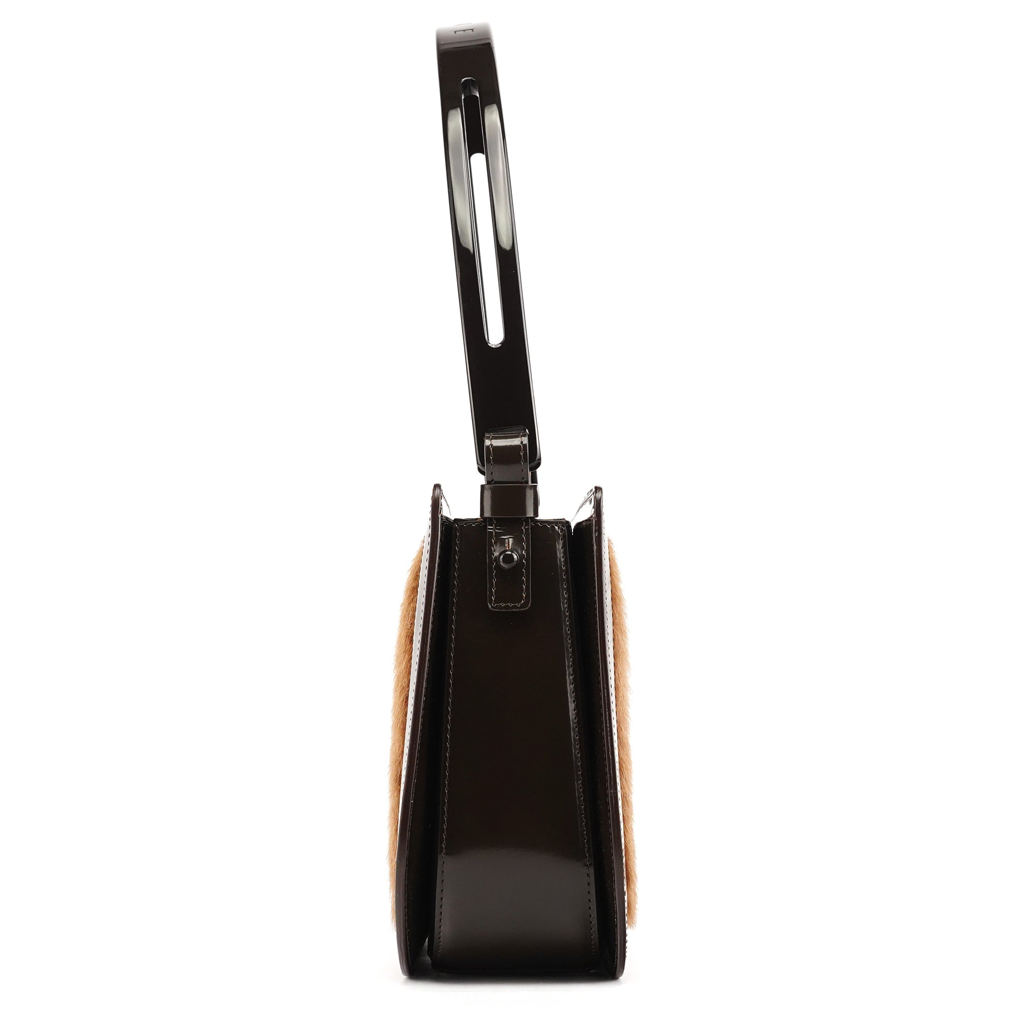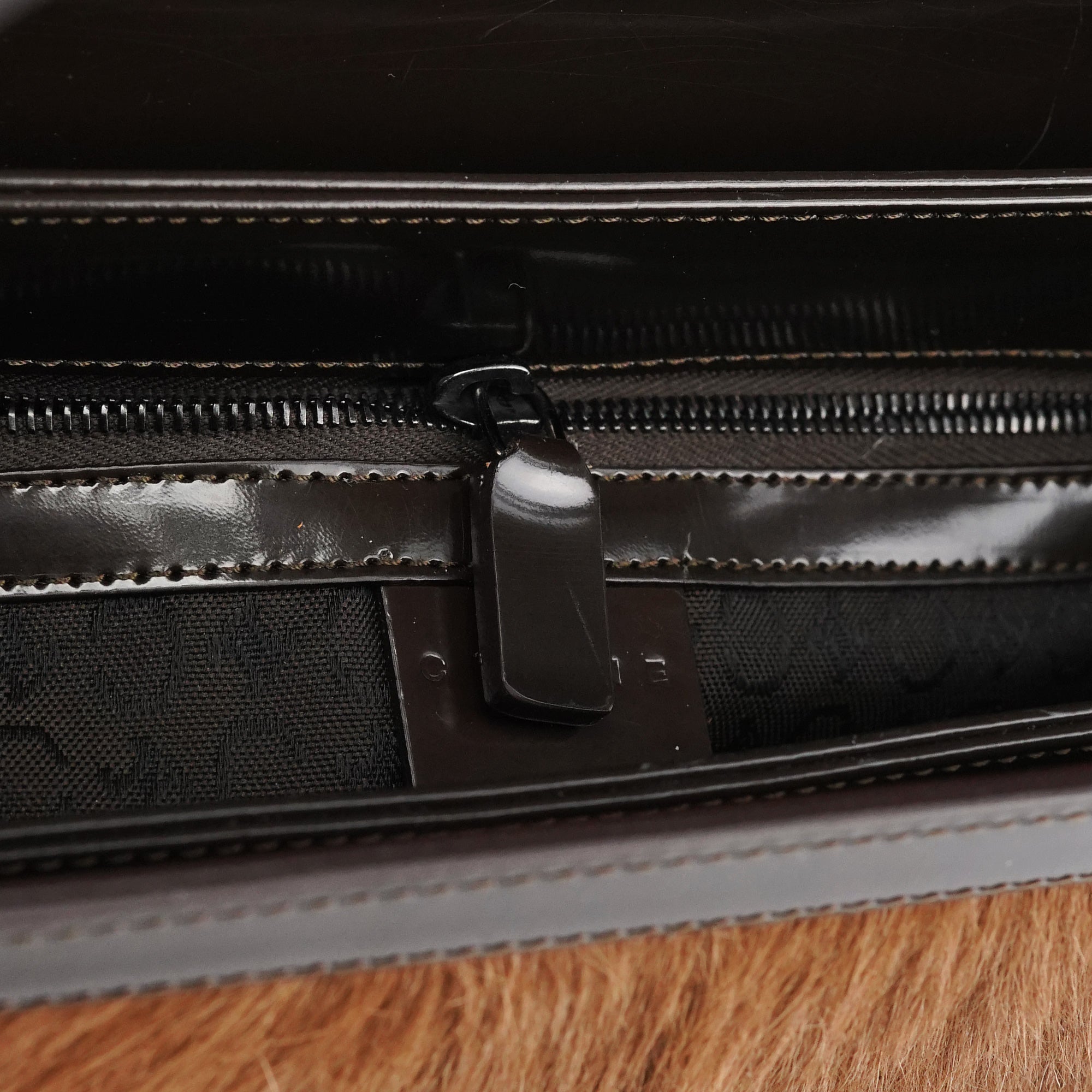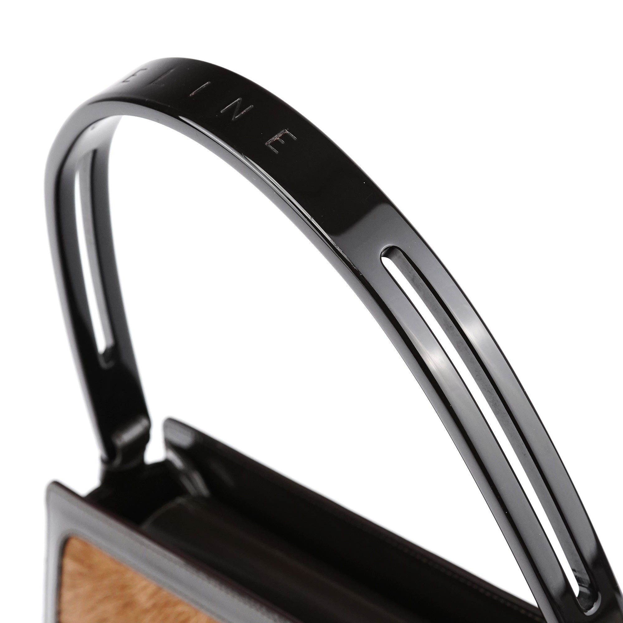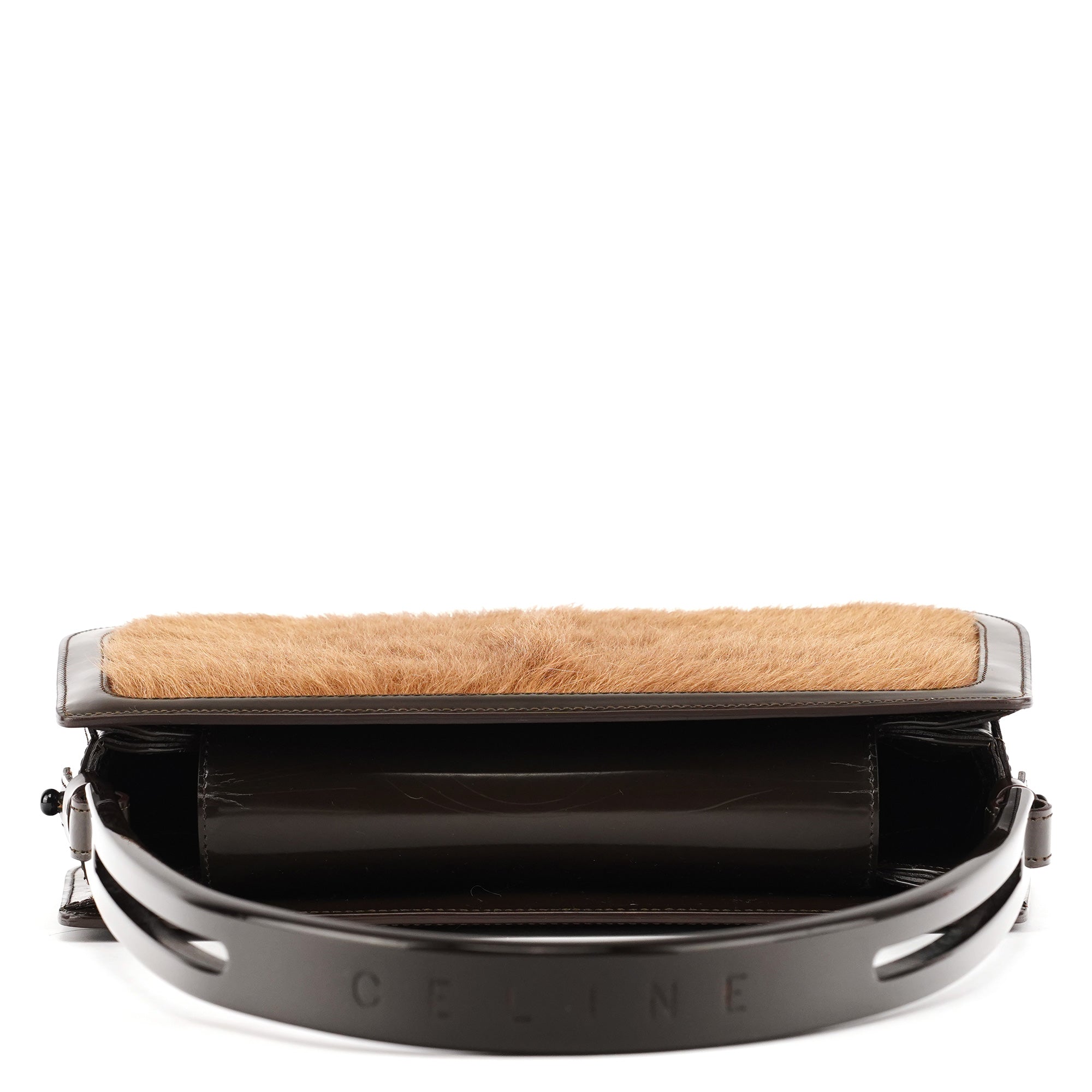 Designed in the early 2000s, this Céline bag features chestnut pony hair framed by dark patent leather with a sculptural resin handle engraved “CELINE.” Its structured shape opens to a minimalist interior with a zip pocket — a rare, tactile example of the house’s early 2000s design.