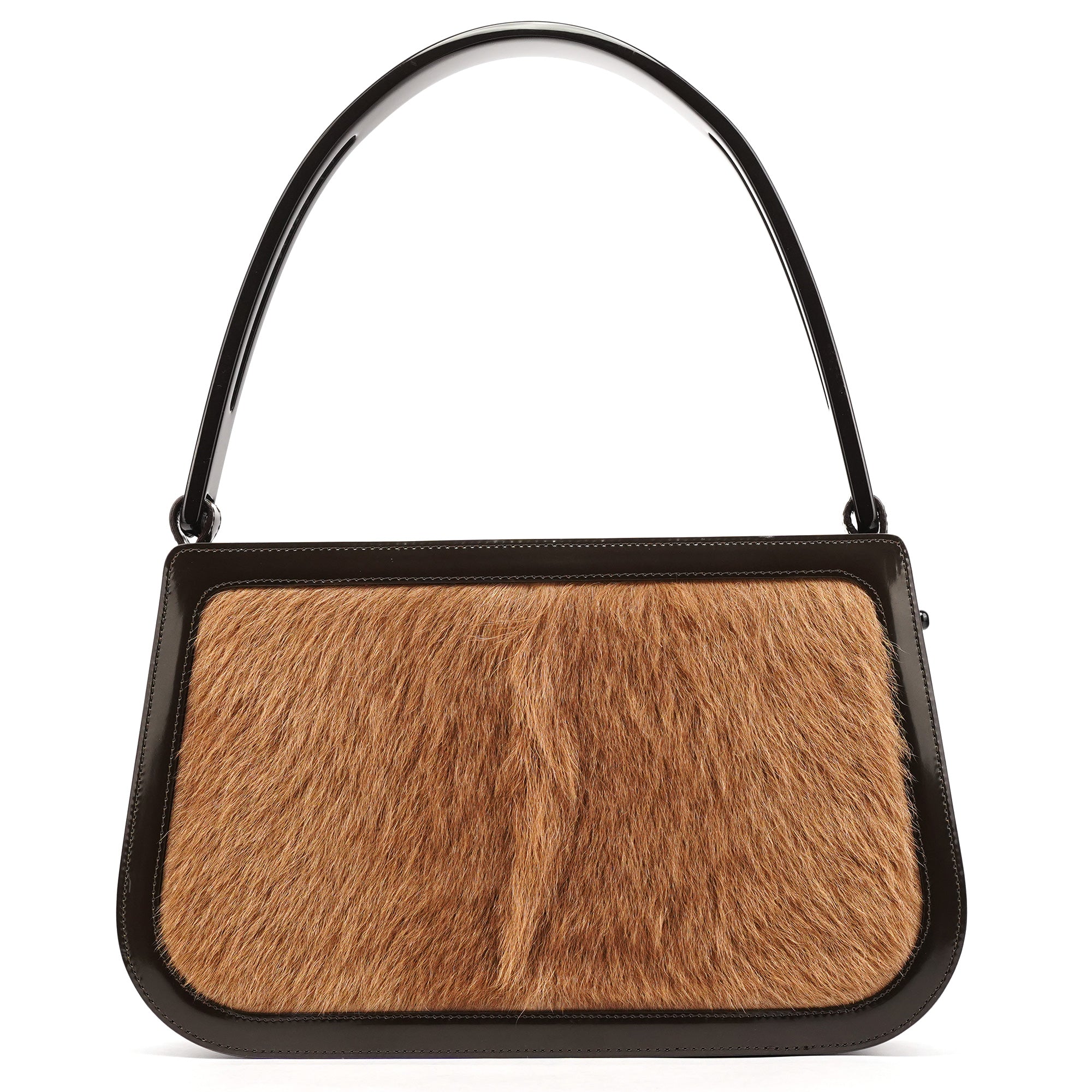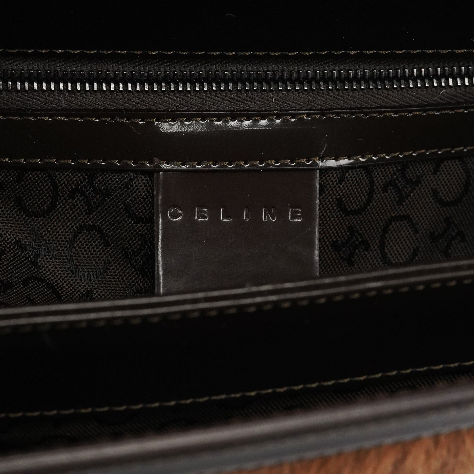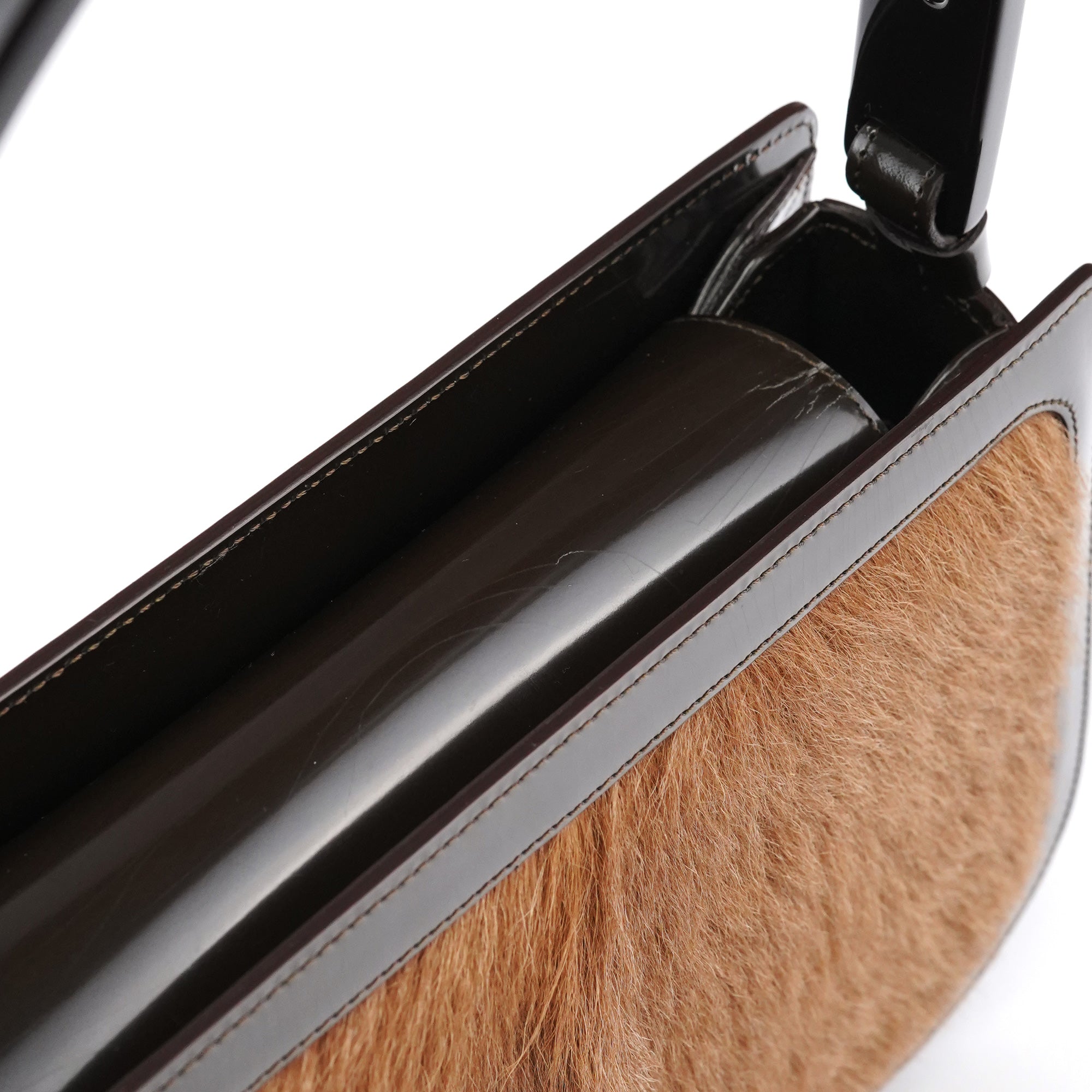 Designed in the early 2000s, this Céline bag features chestnut pony hair framed by dark patent leather with a sculptural resin handle engraved “CELINE.” Its structured shape opens to a minimalist interior with a zip pocket — a rare, tactile example of the house’s early 2000s design.