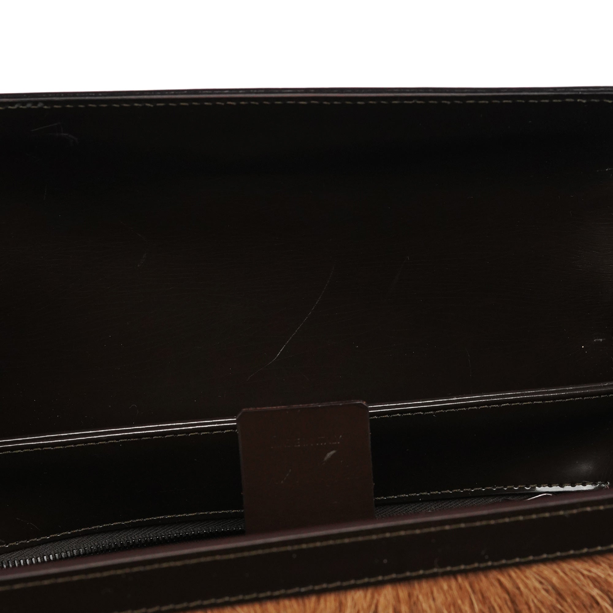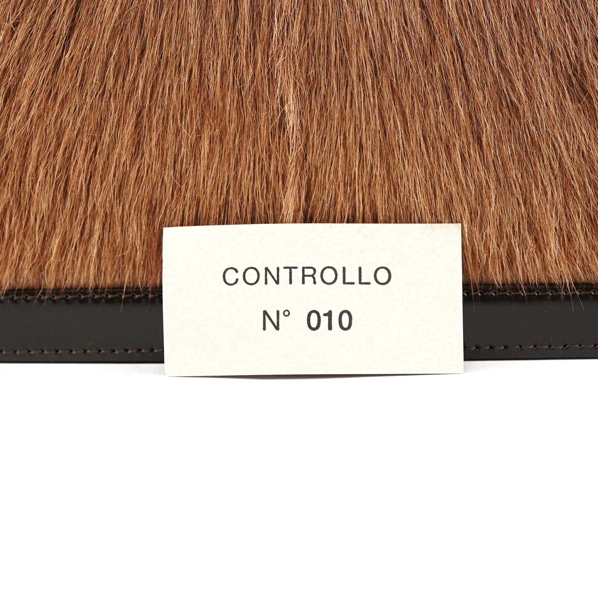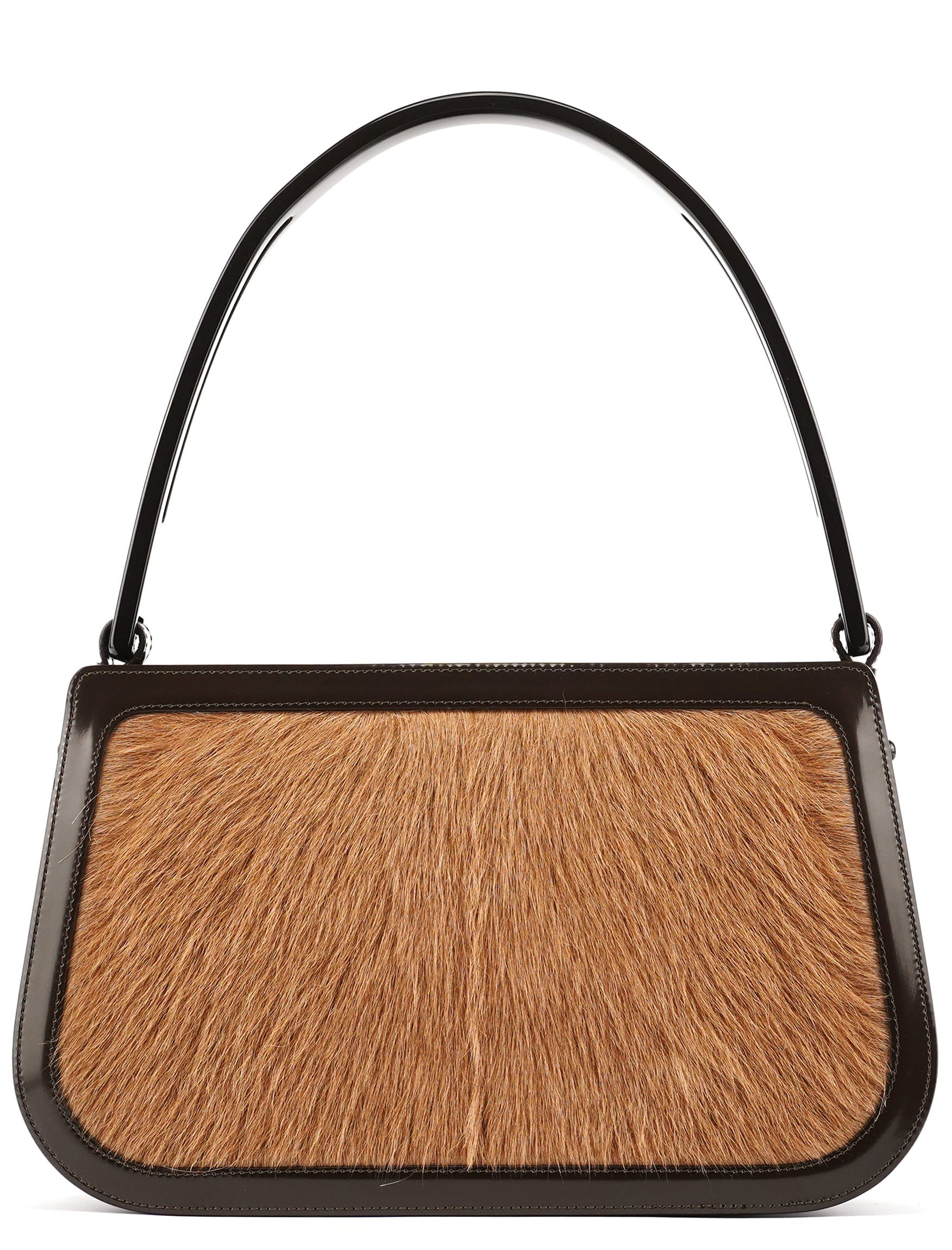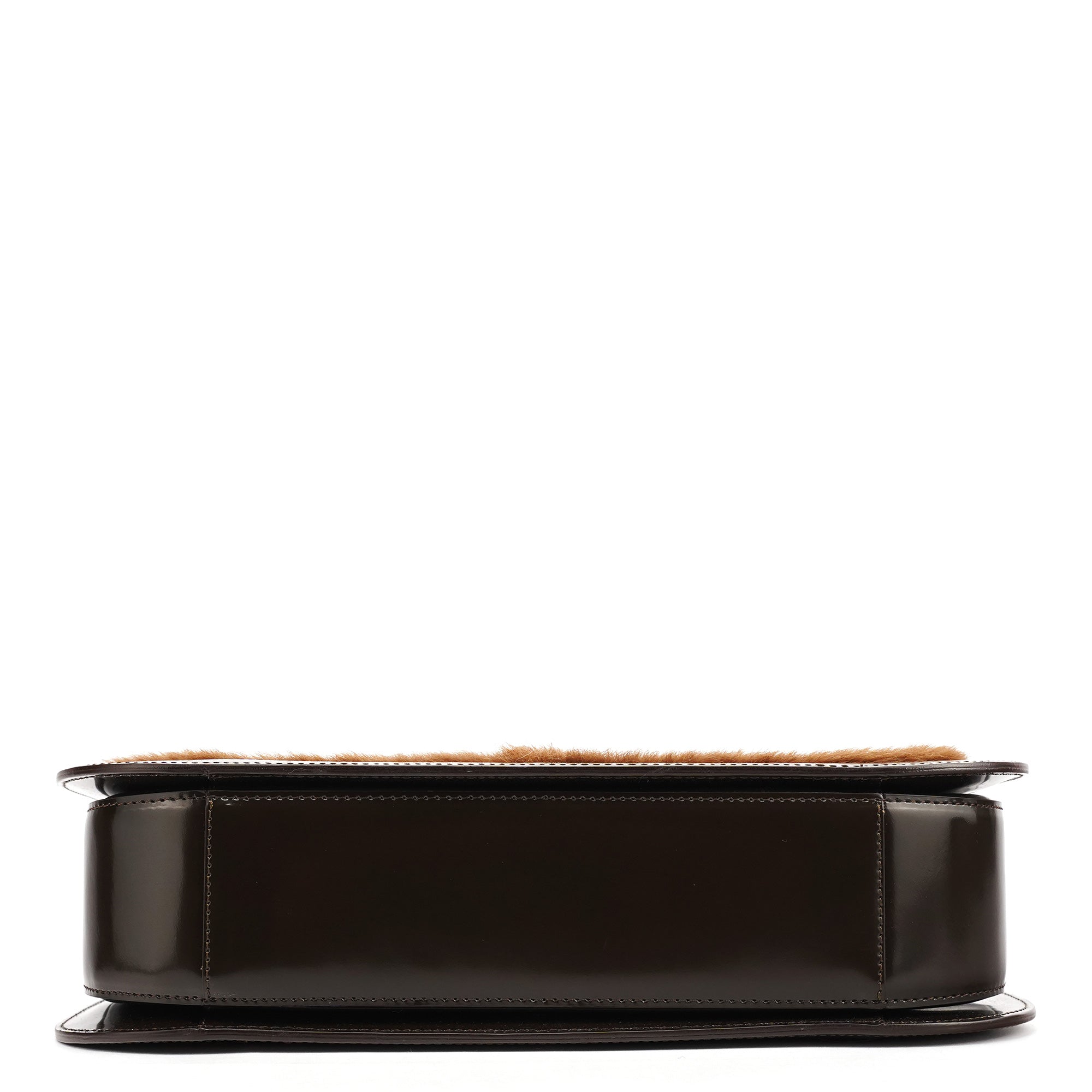 Designed in the early 2000s, this Céline bag features chestnut pony hair framed by dark patent leather with a sculptural resin handle engraved “CELINE.” Its structured shape opens to a minimalist interior with a zip pocket — a rare, tactile example of the house’s early 2000s design.