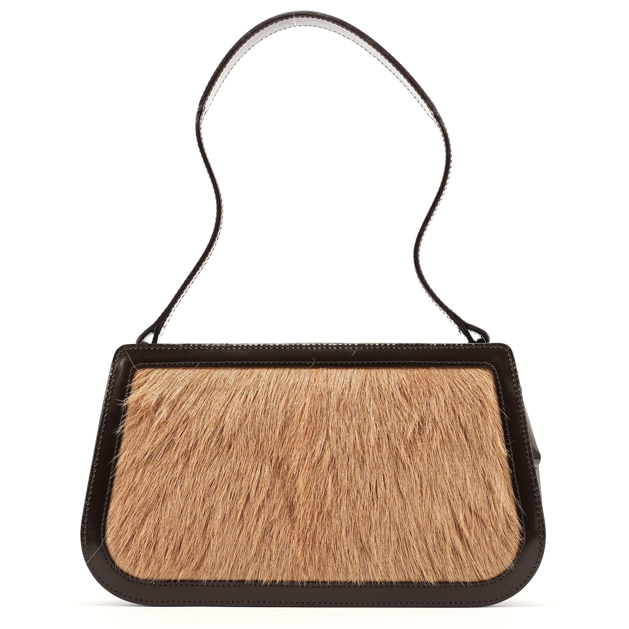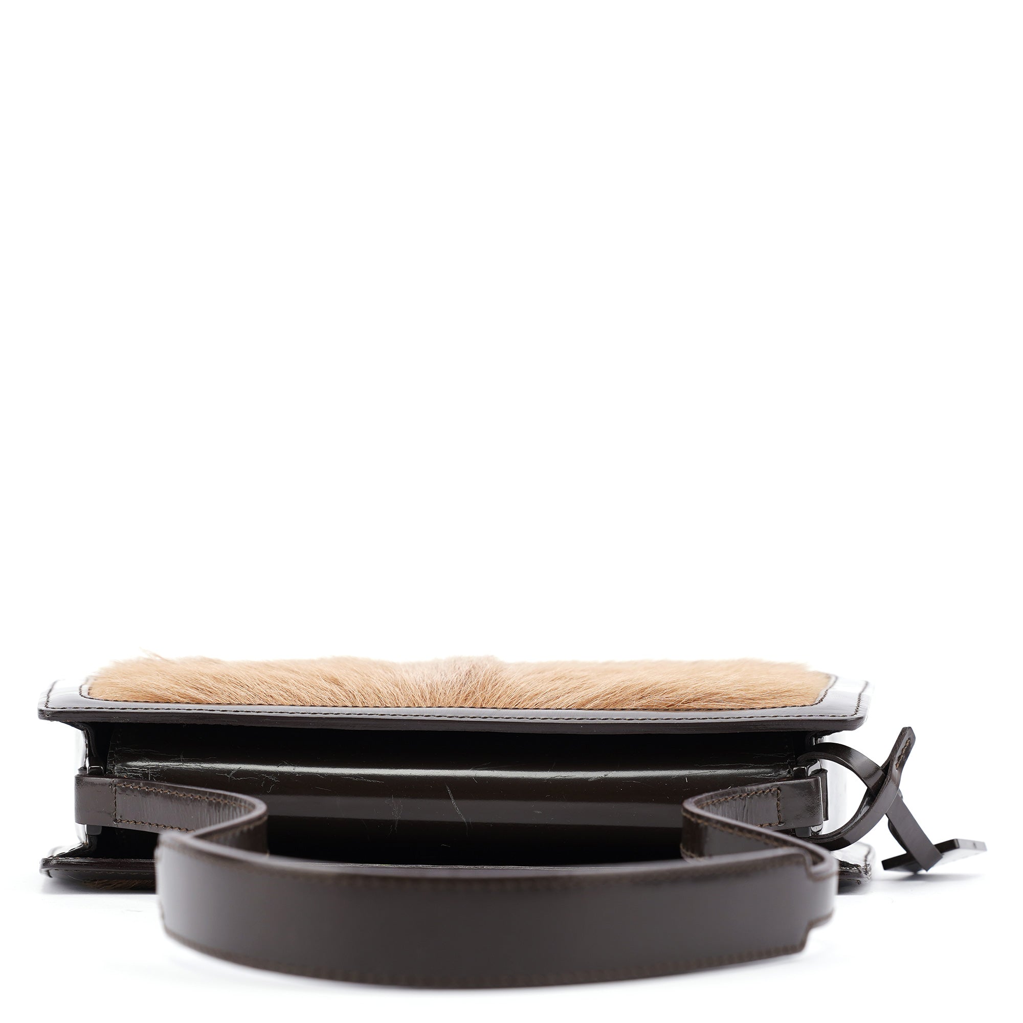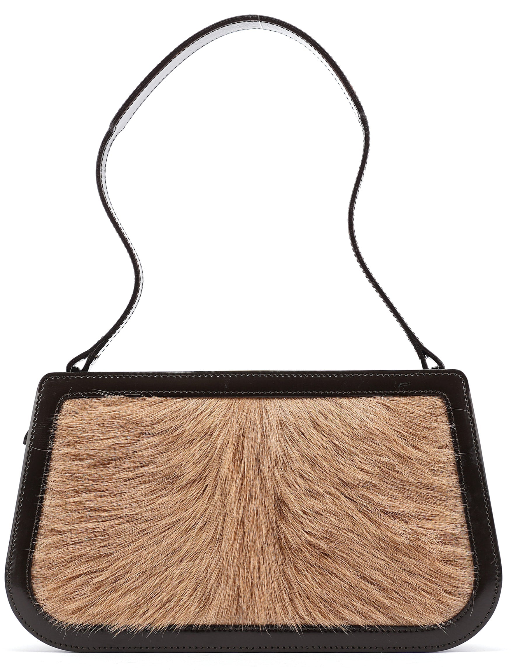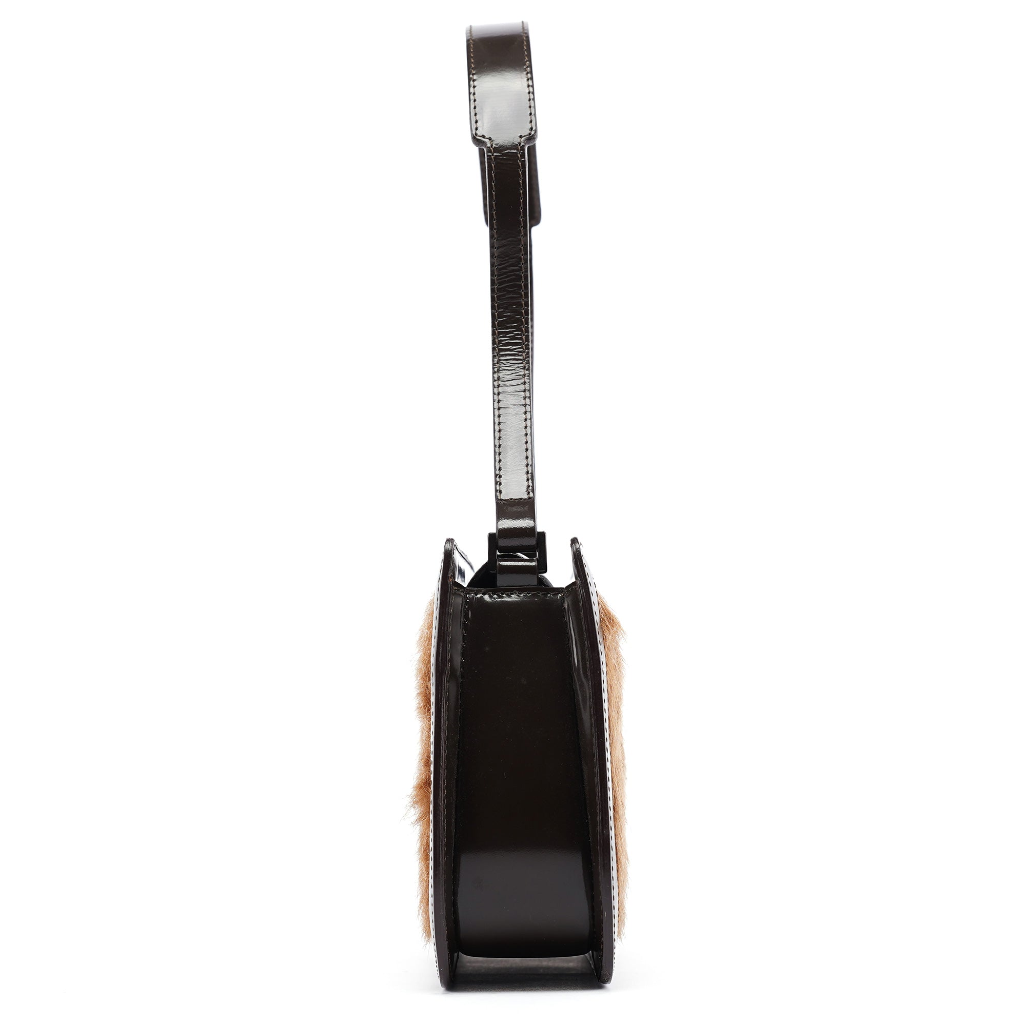 Designed in the early 2000's, this vintage Celine shoulder bag features a beige fur front panel set within a structured brown patent leather frame. The compact silhouette is finished with a single leather shoulder strap, top frame closure with leather-wrapped hardware, and a fabric-lined interior with a zip pocket. The contrast between the textured fur and smooth leather creates a distinctive look.