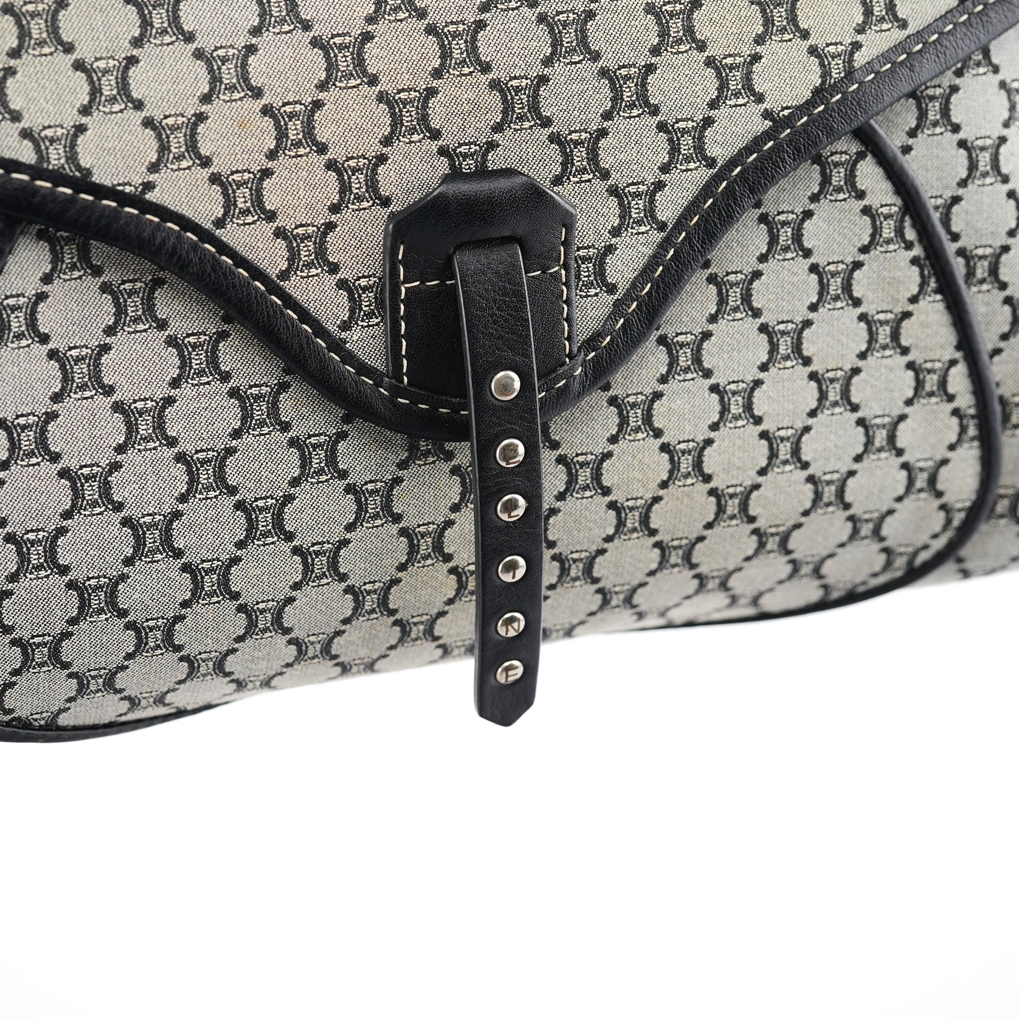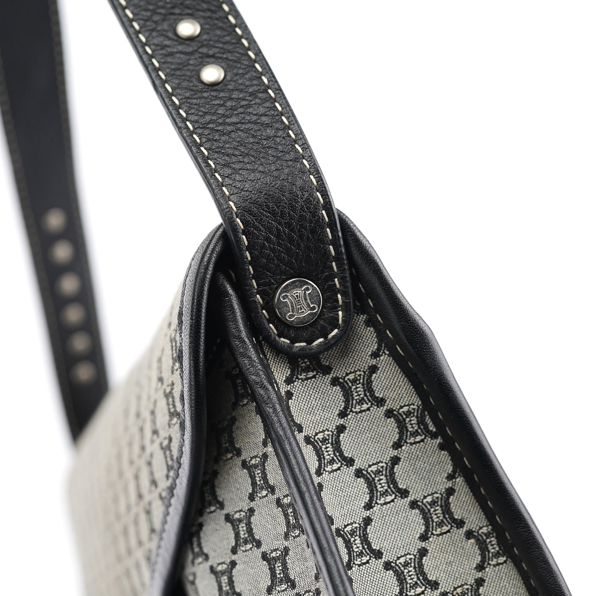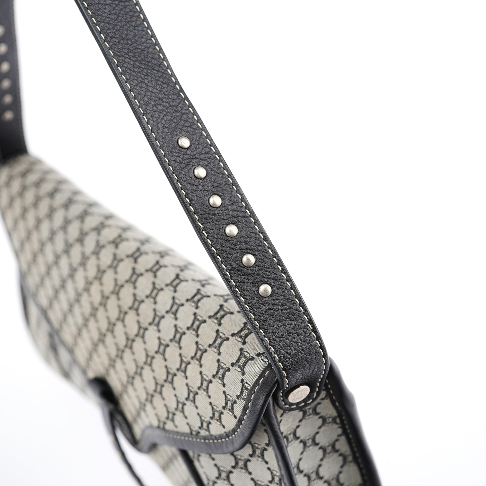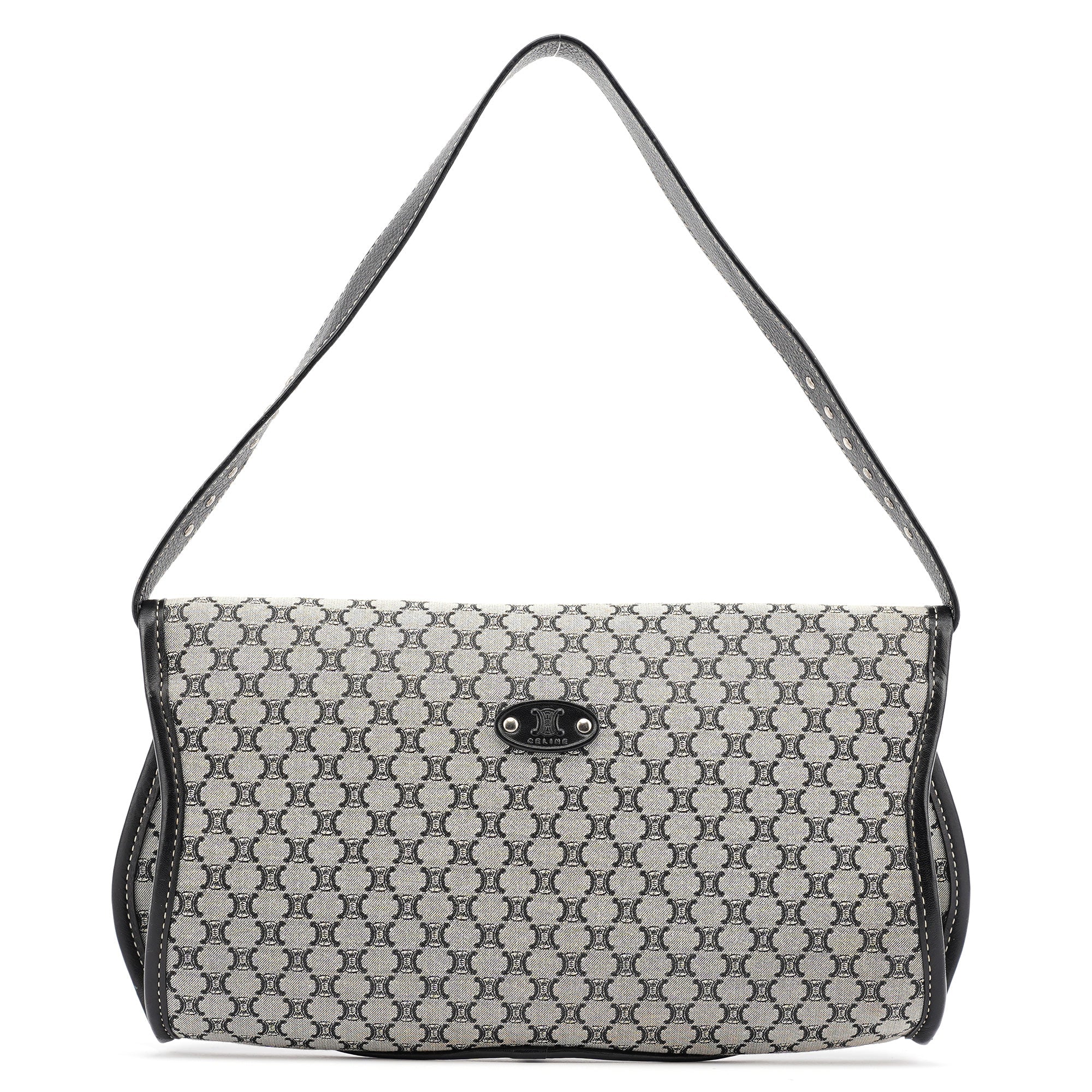 Designed in the early 2000s, this vintage Céline shoulder bag features the classic macadam monogram canvas in gray and black tones. The flap-front silhouette showcases studded leather trim details, a magnetic closure, and a single shoulder strap for comfortable carrying.