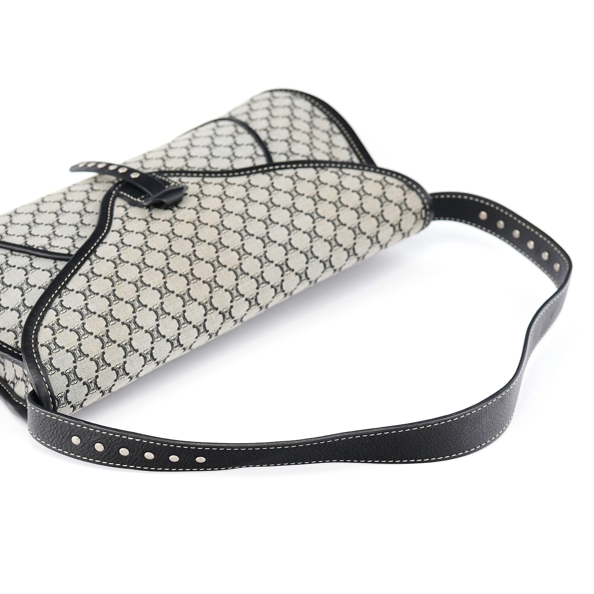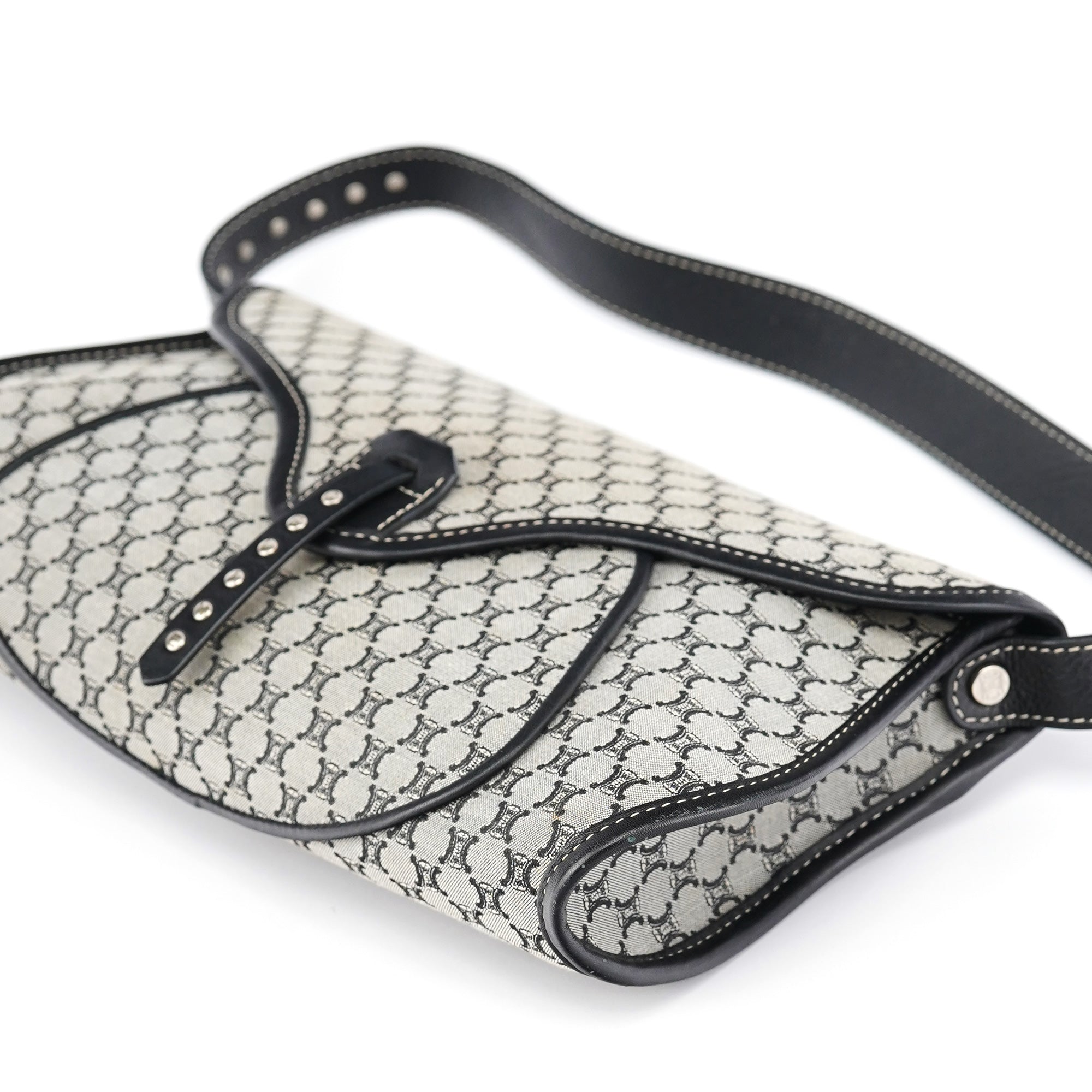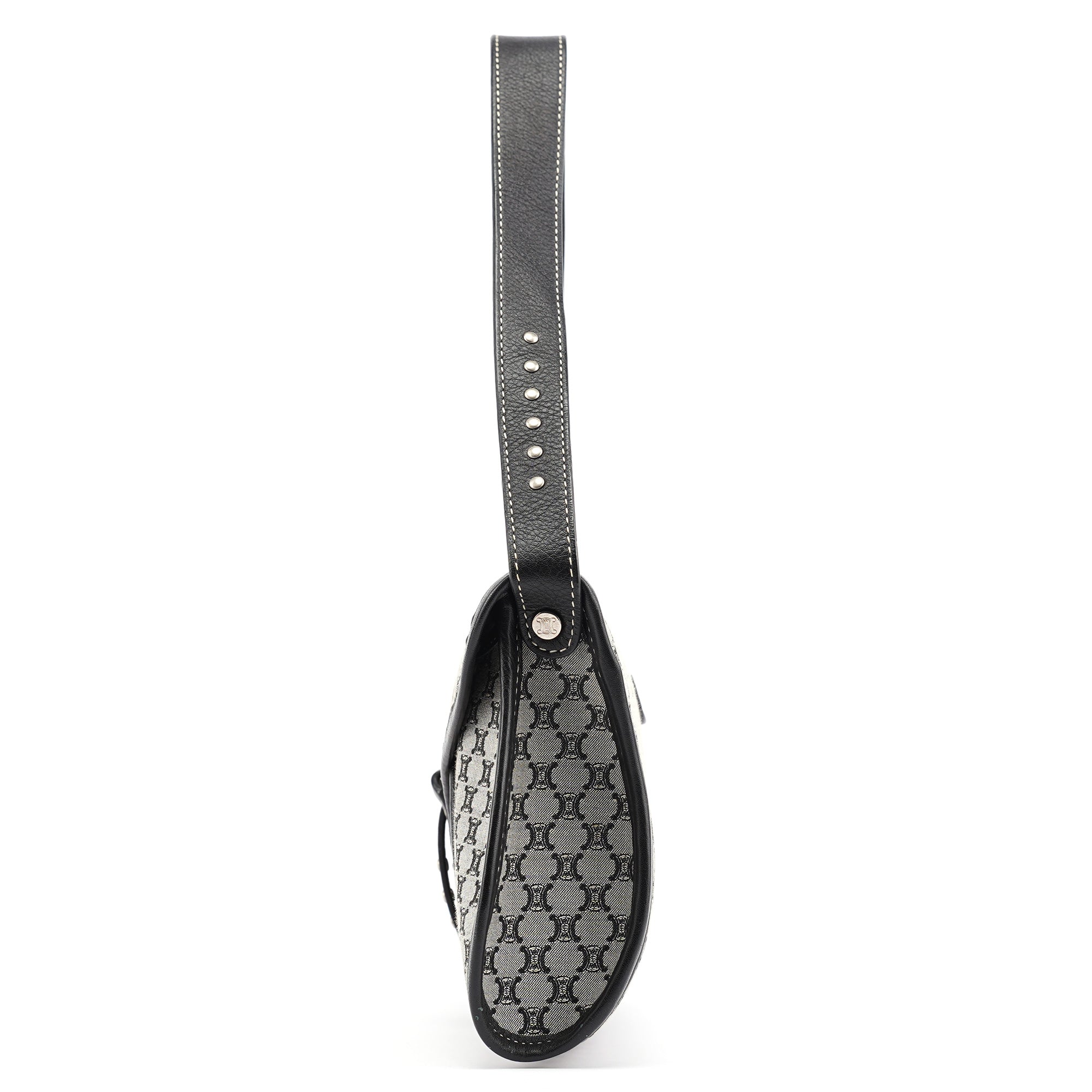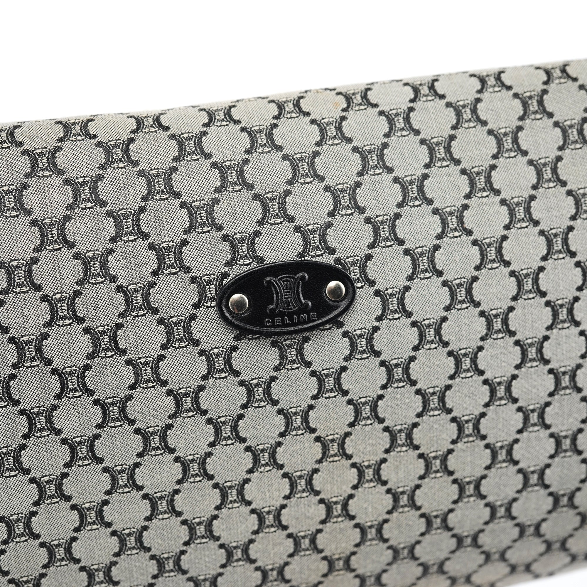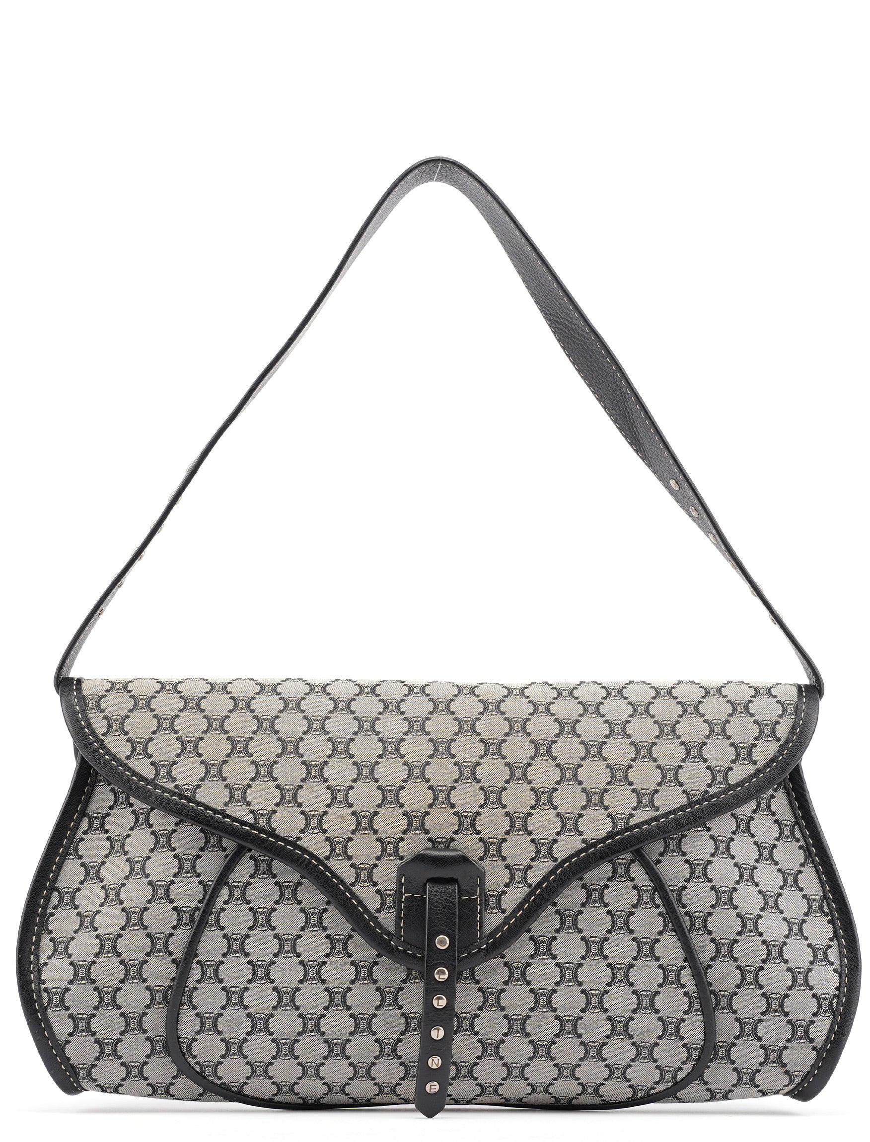 Designed in the early 2000s, this vintage Céline shoulder bag features the classic macadam monogram canvas in gray and black tones. The flap-front silhouette showcases studded leather trim details, a magnetic closure, and a single shoulder strap for comfortable carrying.