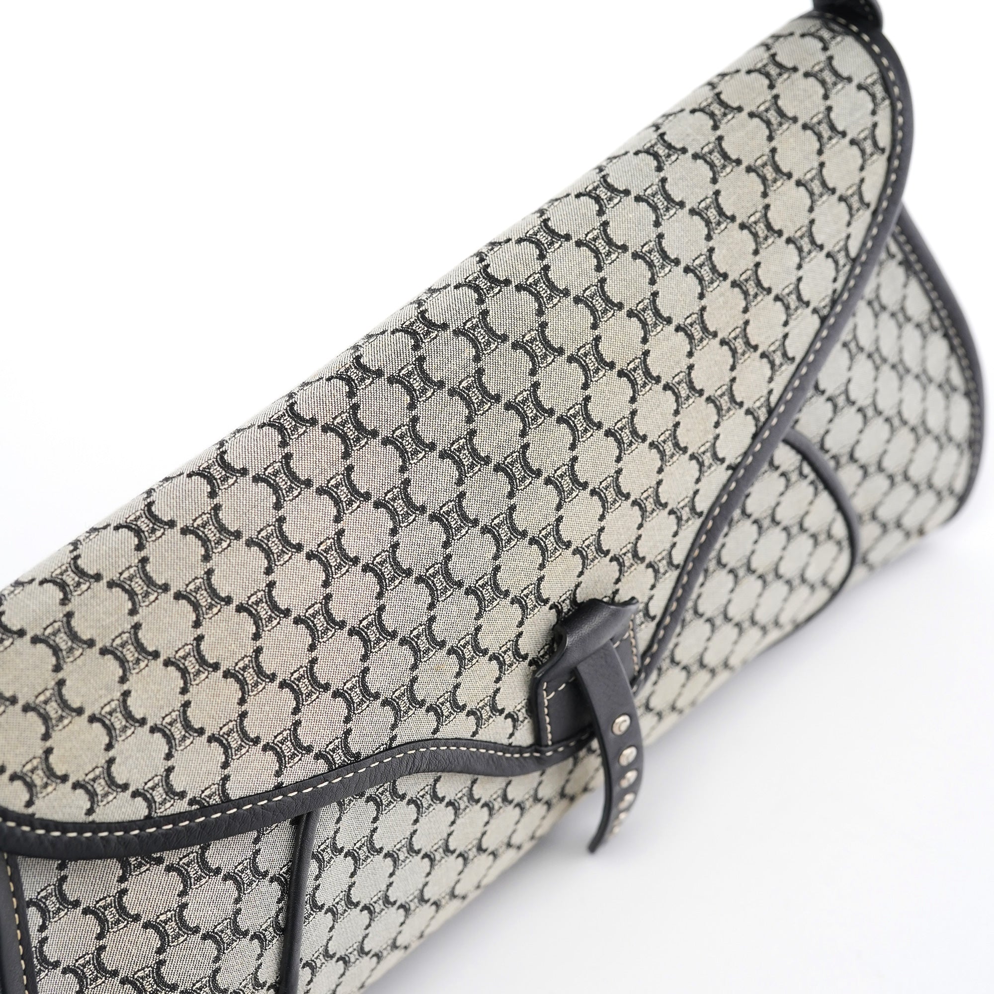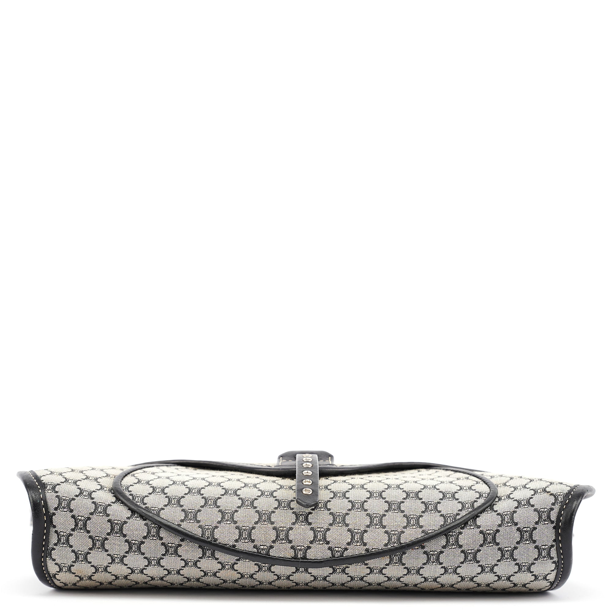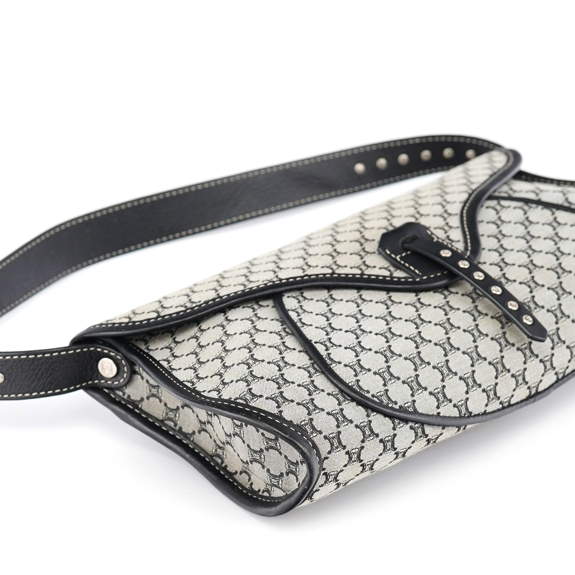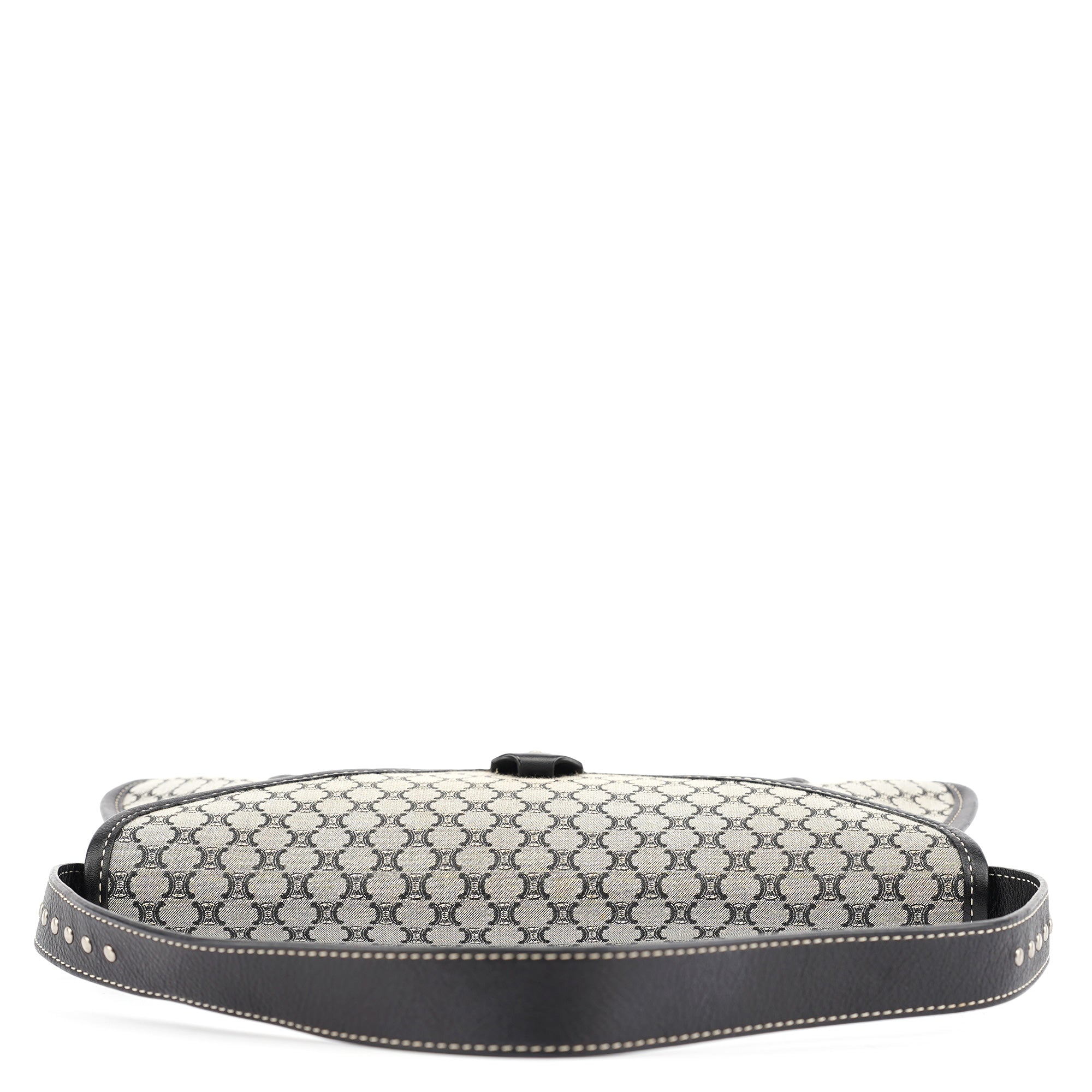 Designed in the early 2000s, this vintage Céline shoulder bag features the classic macadam monogram canvas in gray and black tones. The flap-front silhouette showcases studded leather trim details, a magnetic closure, and a single shoulder strap for comfortable carrying.