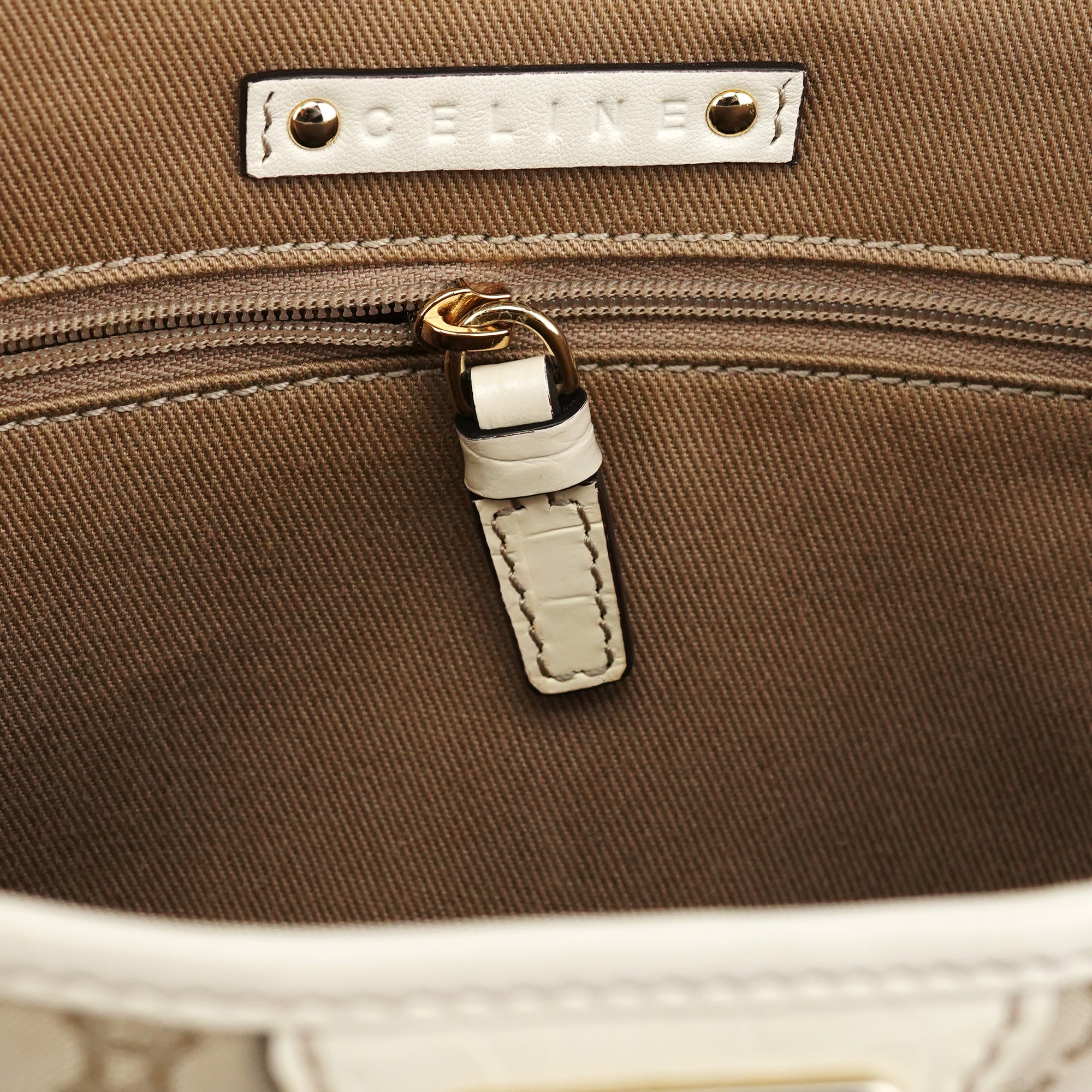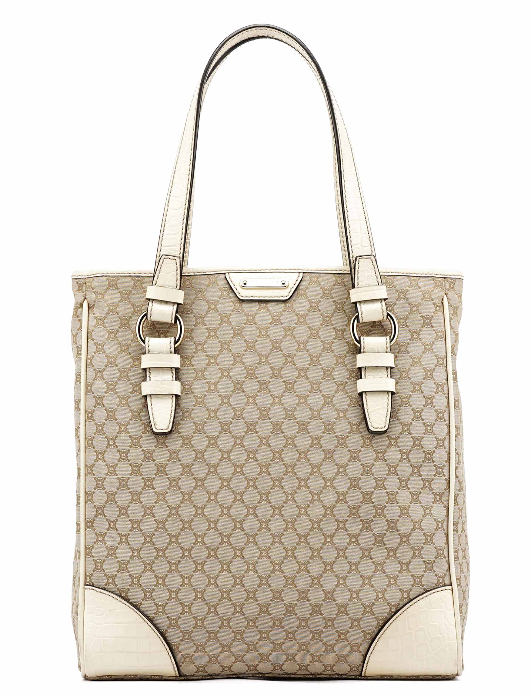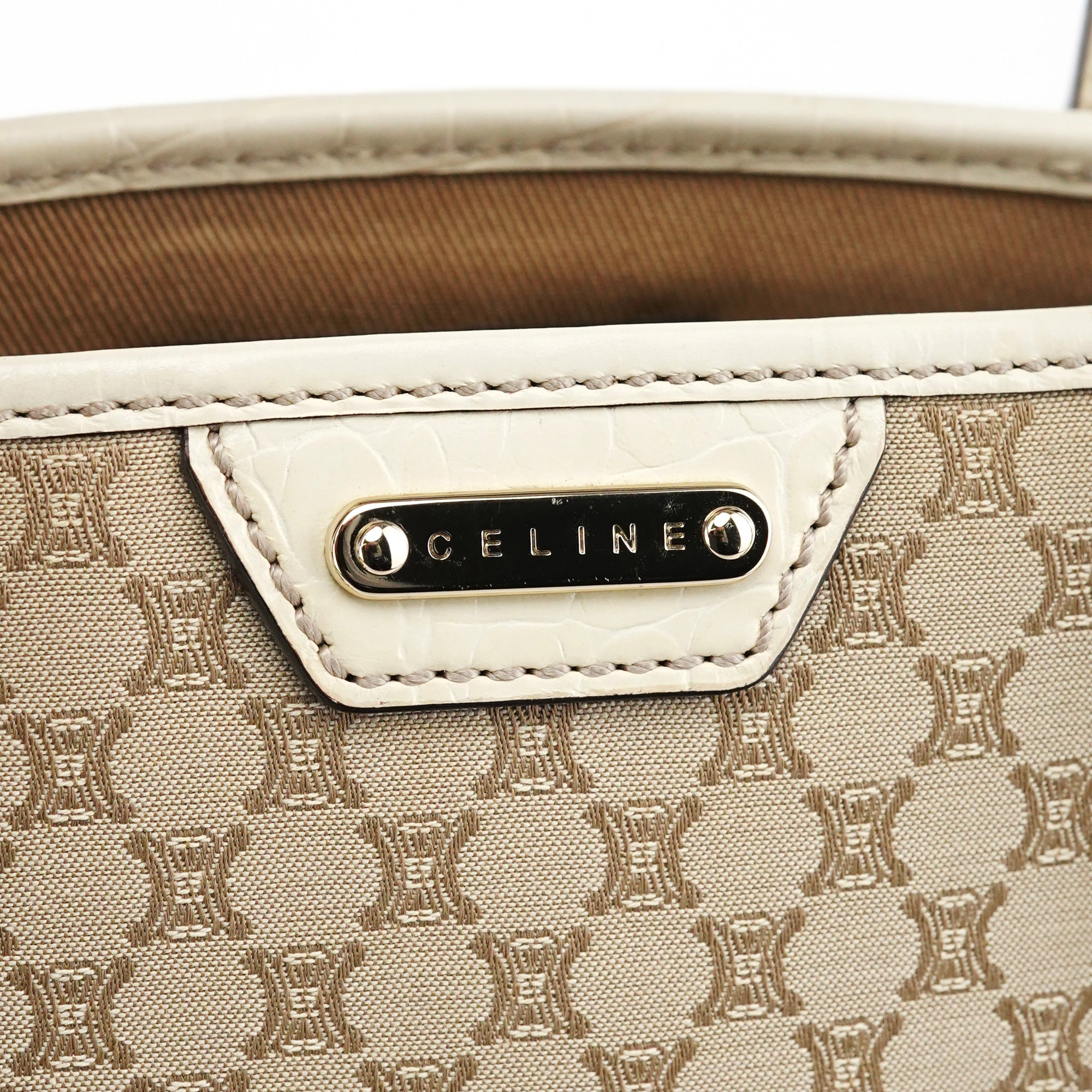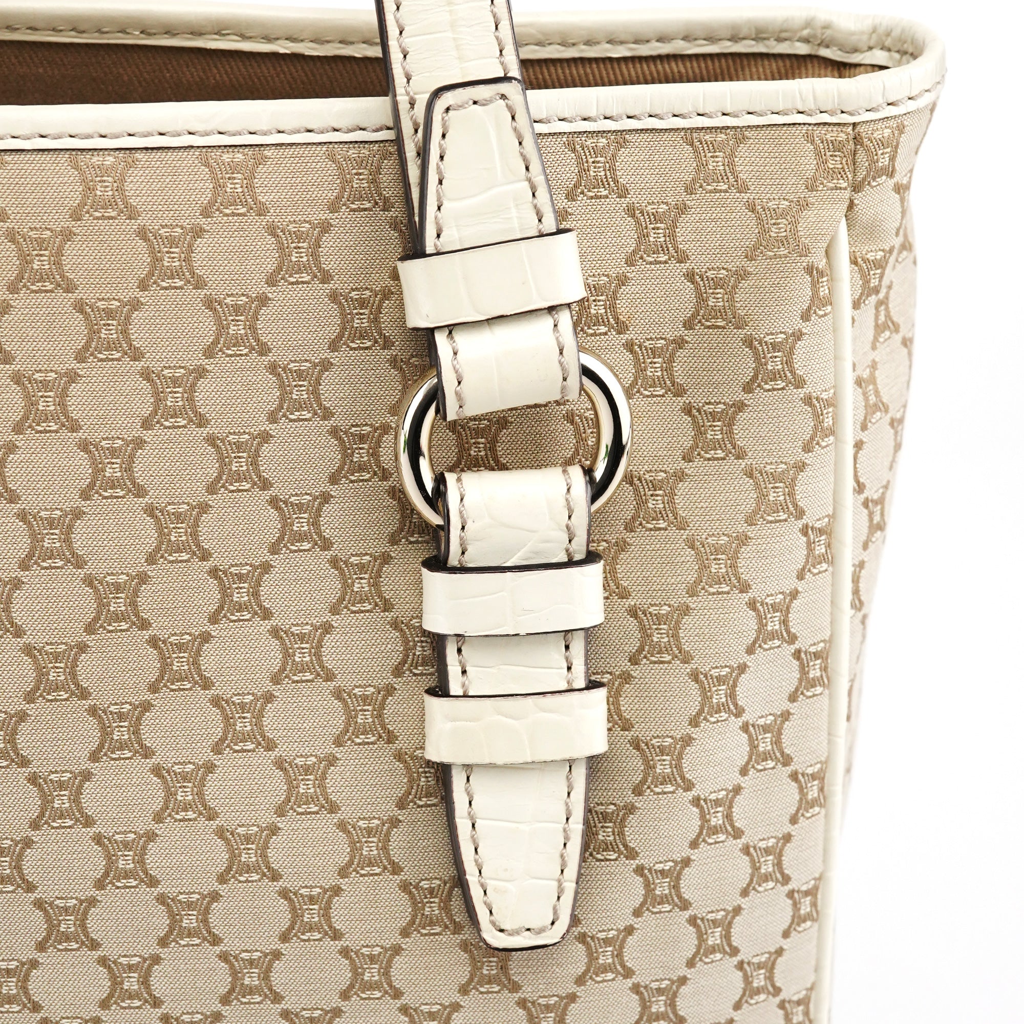Designed in the early 2000s, this Céline Triomphe tote bag is crafted in signature Triomphe canvas with white leather trim and matching shoulder straps. The structured silhouette opens to a three-compartment interior, fully leather-lined, with a central zip compartment for added organization. Finished with gold-tone hardware and reinforced base.