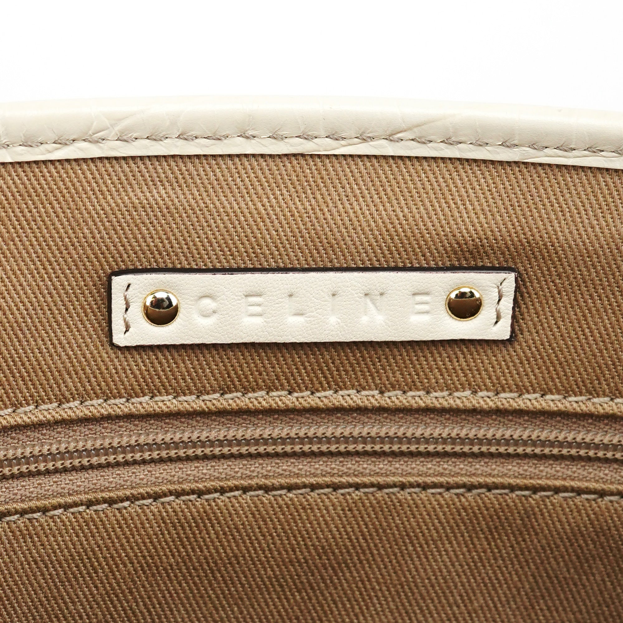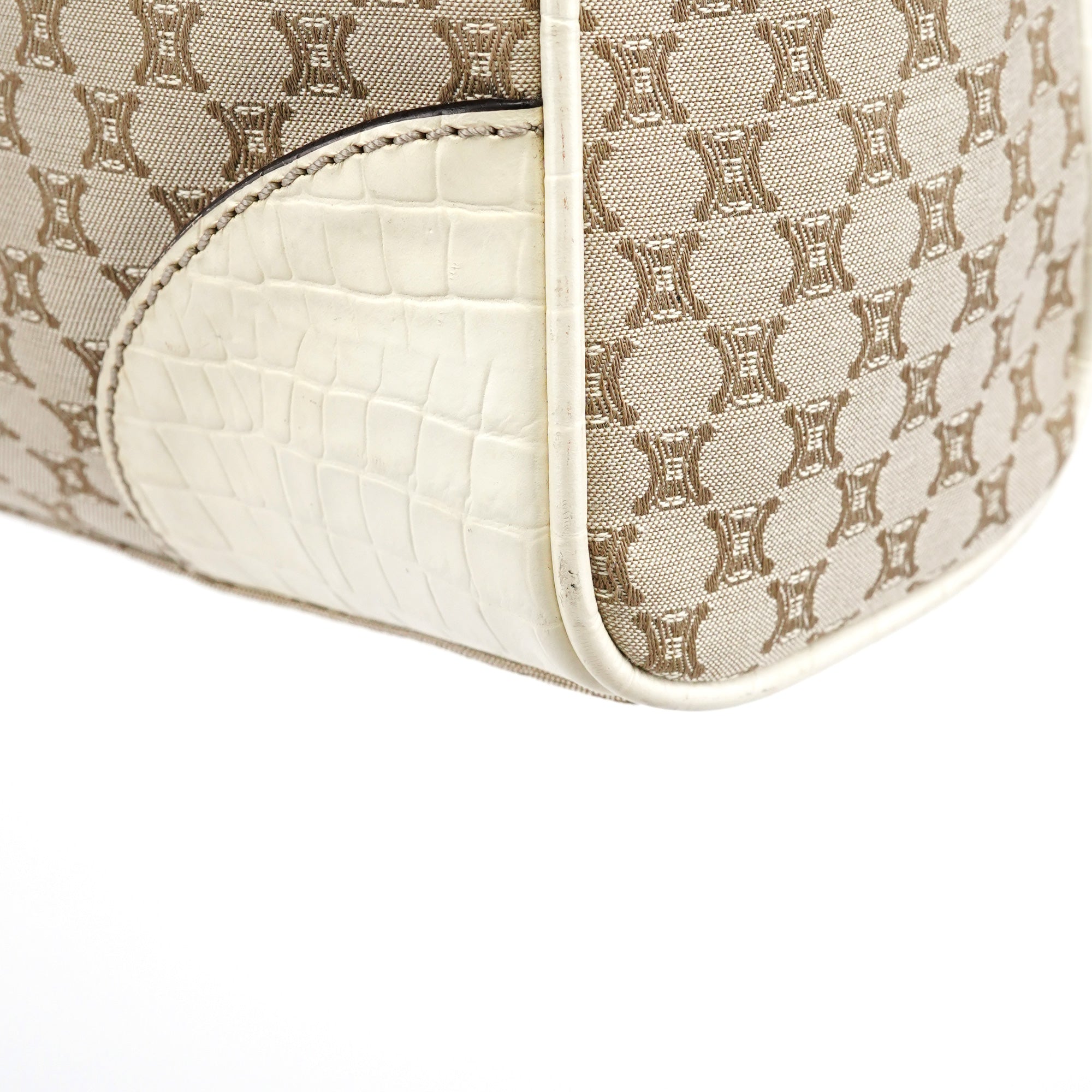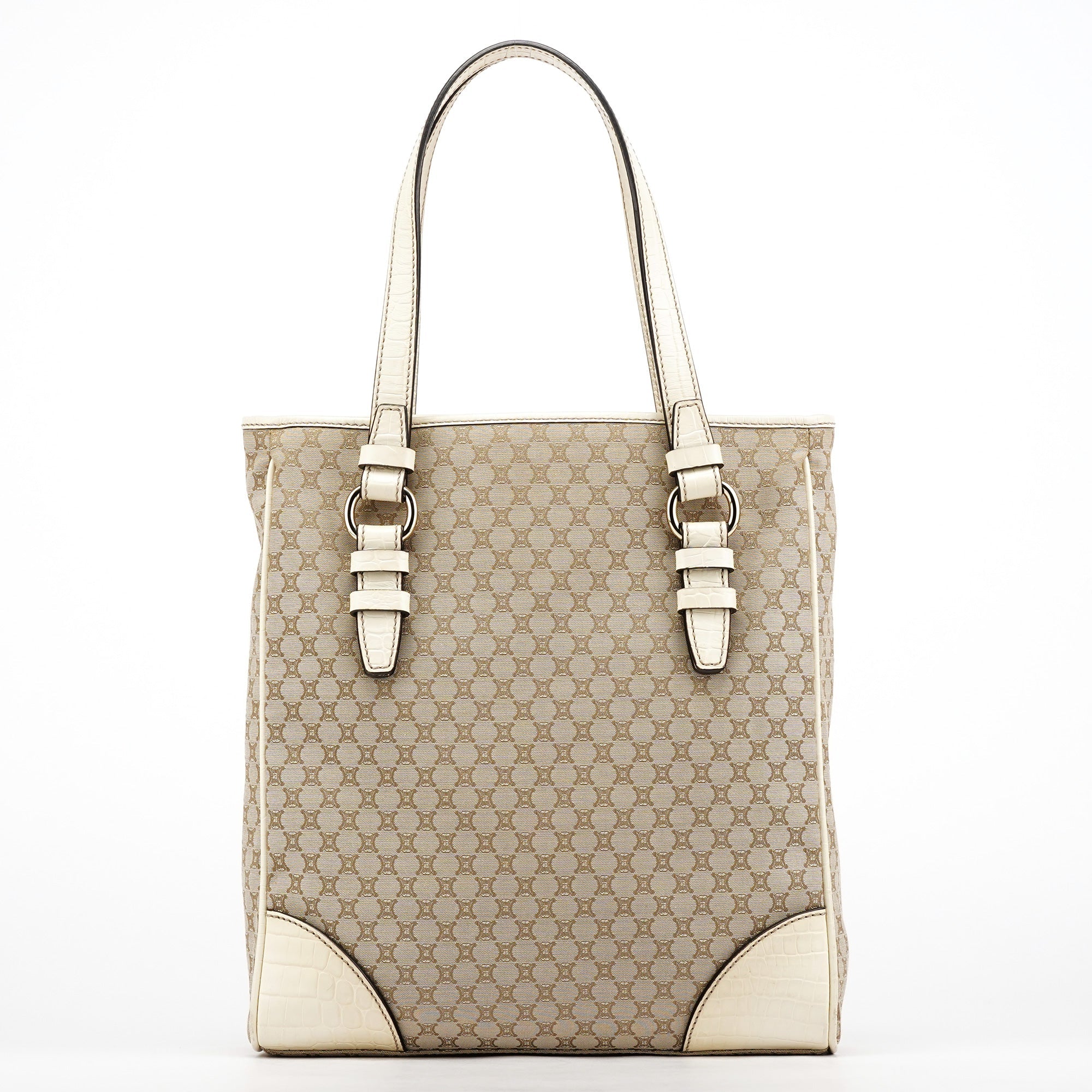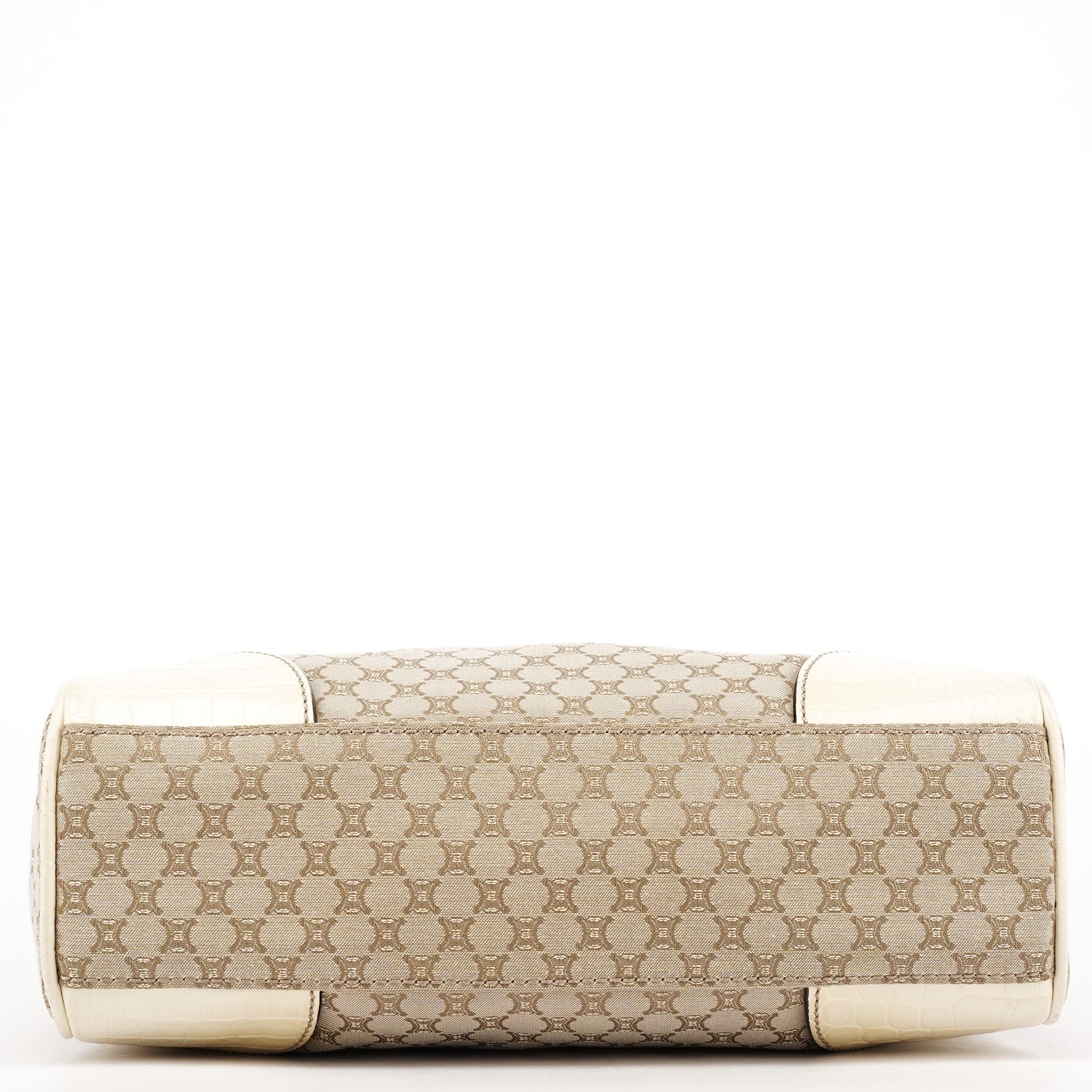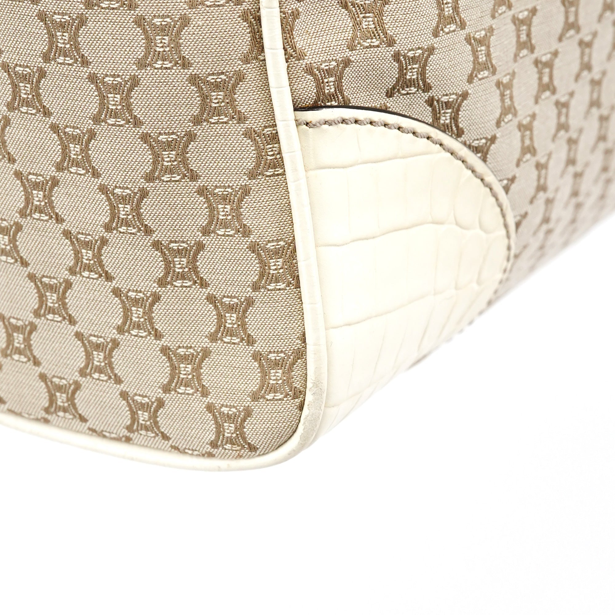 Designed in the early 2000s, this Céline Triomphe tote bag is crafted in signature Triomphe canvas with white leather trim and matching shoulder straps. The structured silhouette opens to a three-compartment interior, fully leather-lined, with a central zip compartment for added organization. Finished with gold-tone hardware and reinforced base.