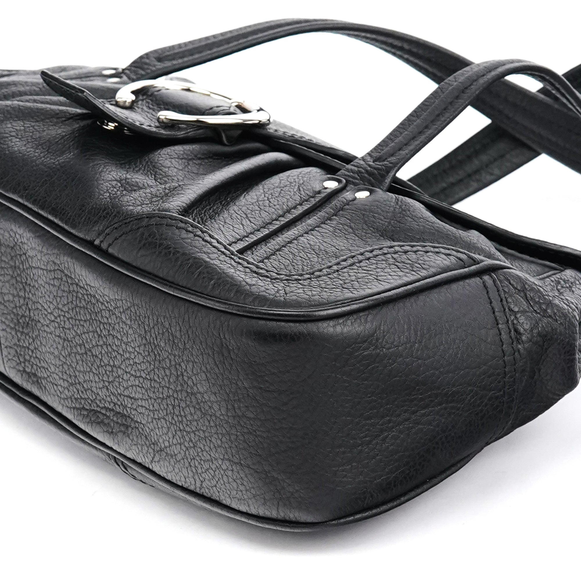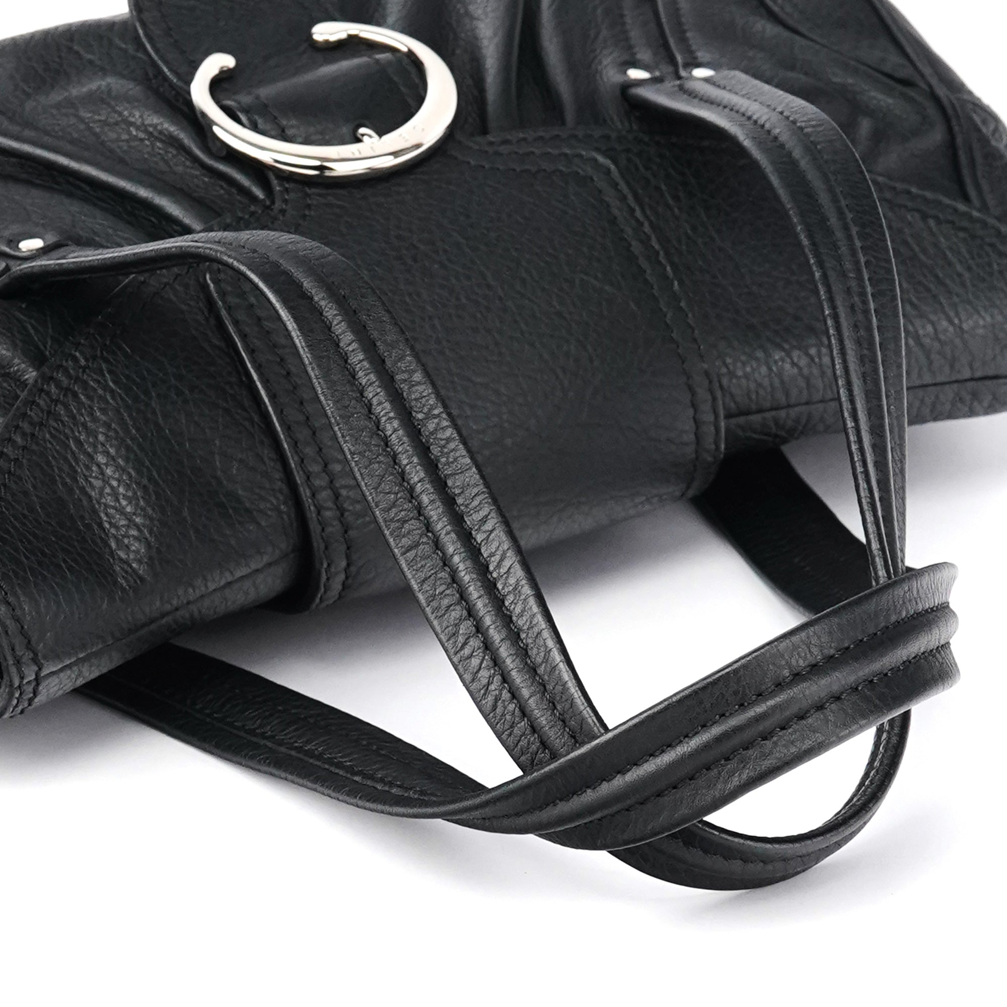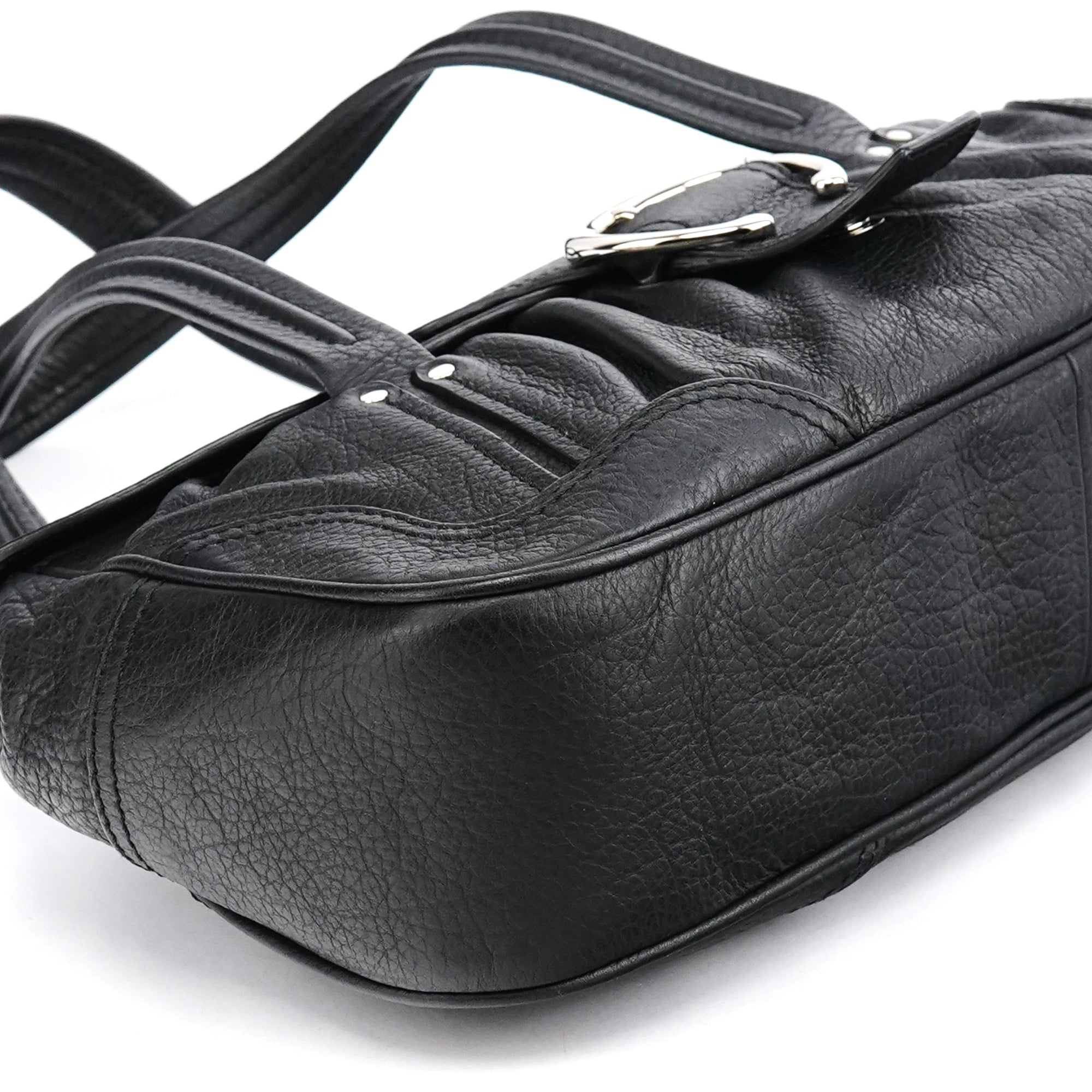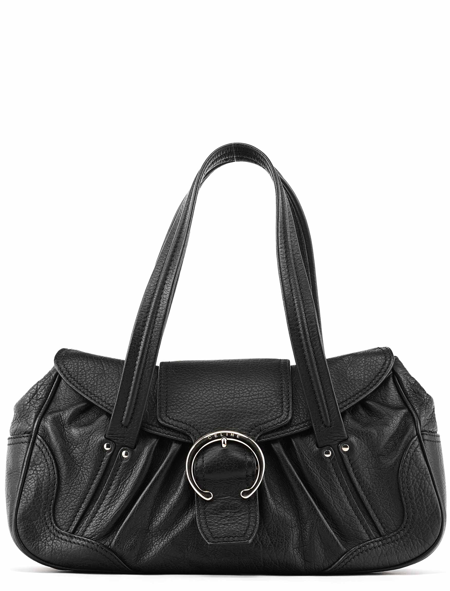 Designed in the early 2000s, this Céline belt tote is crafted from black pebbled calfskin with silver-tone hardware. The design features dual top handles, a front belt-style closure with circular hardware, and a softly structured silhouette. The interior is lined in fabric with a zip pocket.