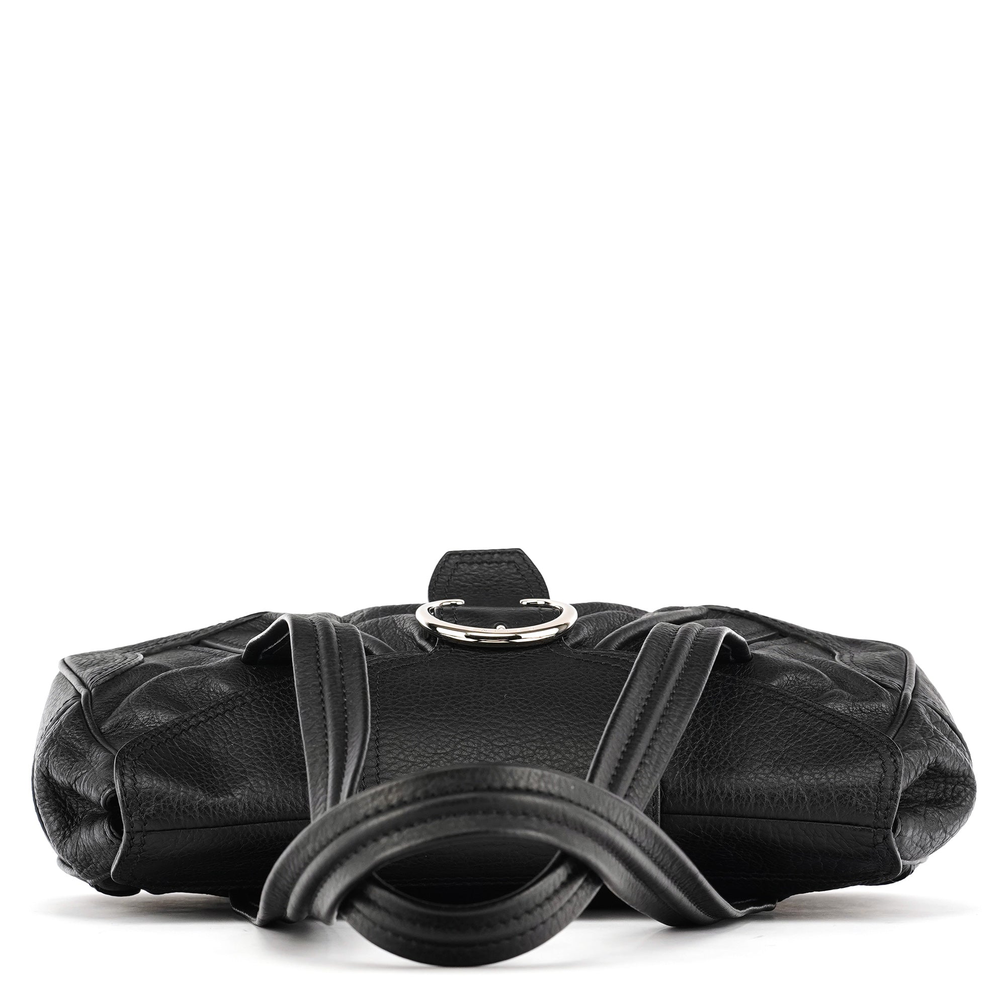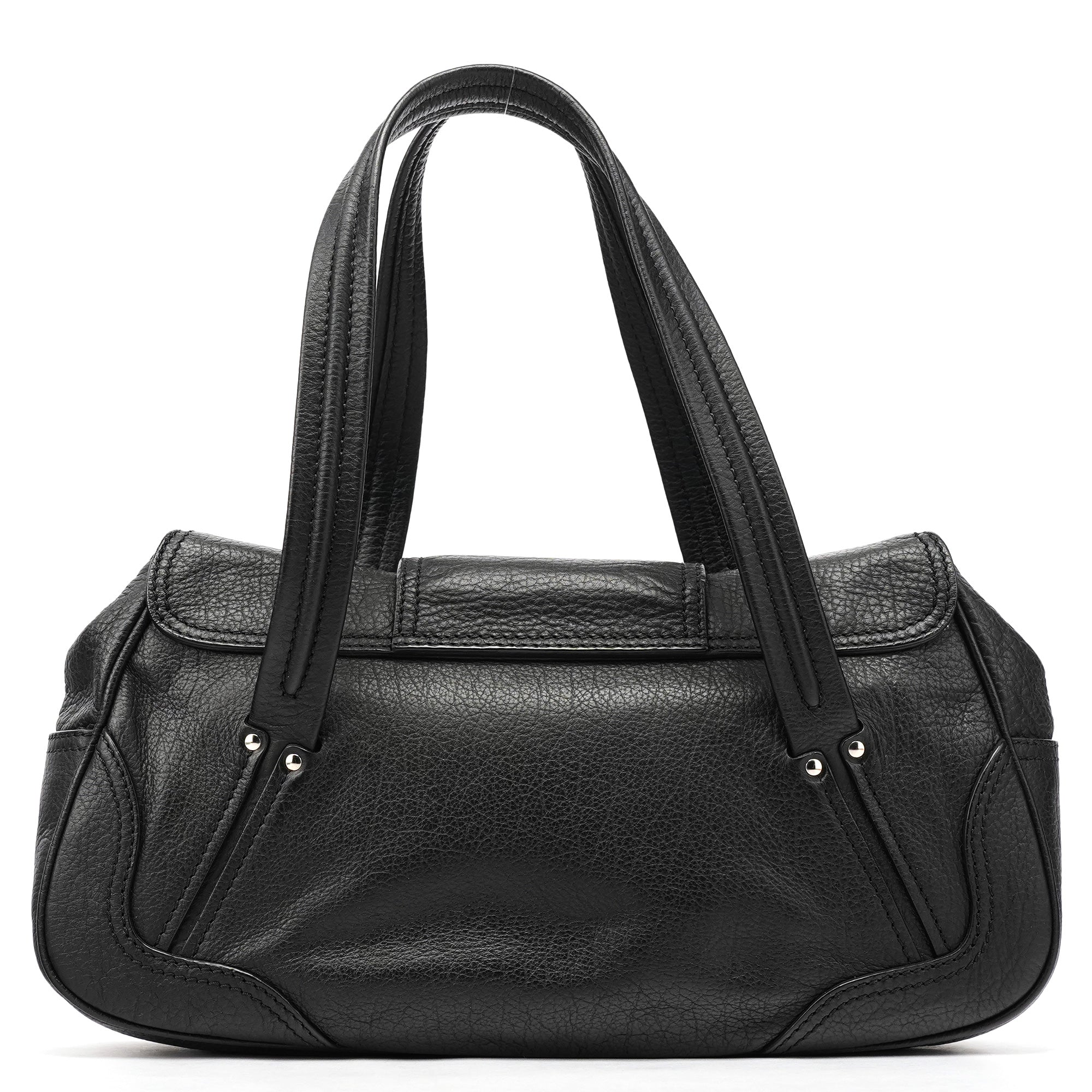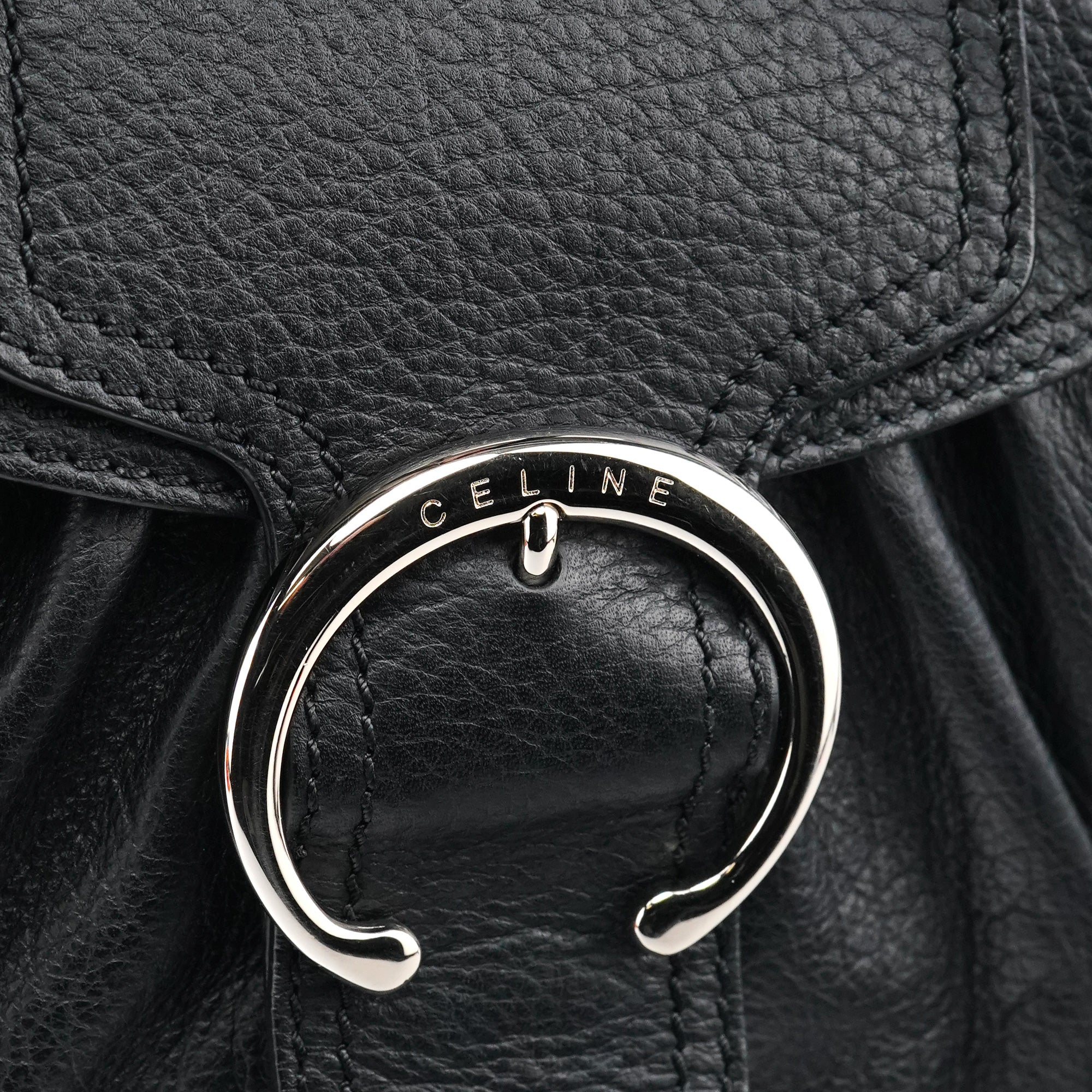 Designed in the early 2000s, this Céline belt tote is crafted from black pebbled calfskin with silver-tone hardware. The design features dual top handles, a front belt-style closure with circular hardware, and a softly structured silhouette. The interior is lined in fabric with a zip pocket.