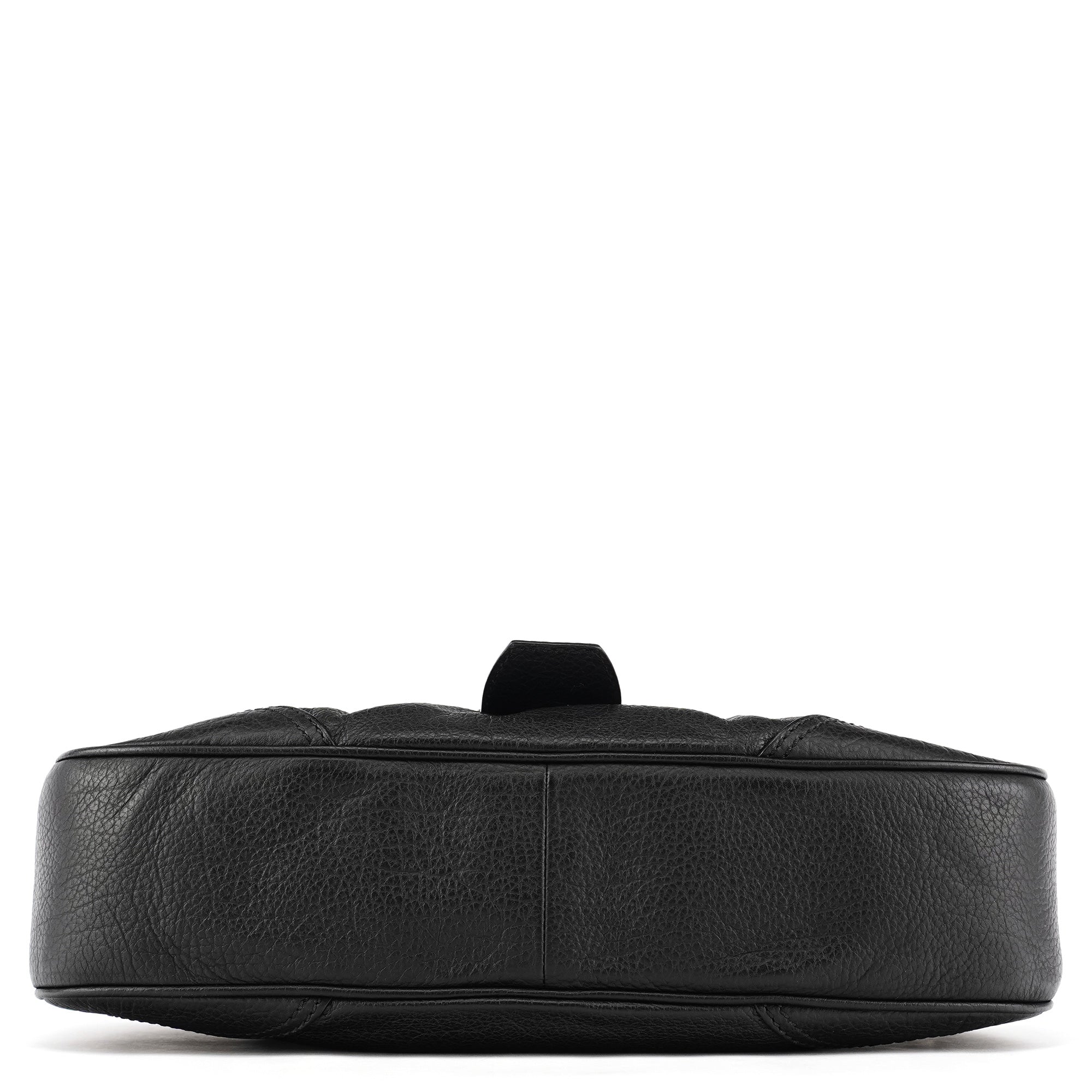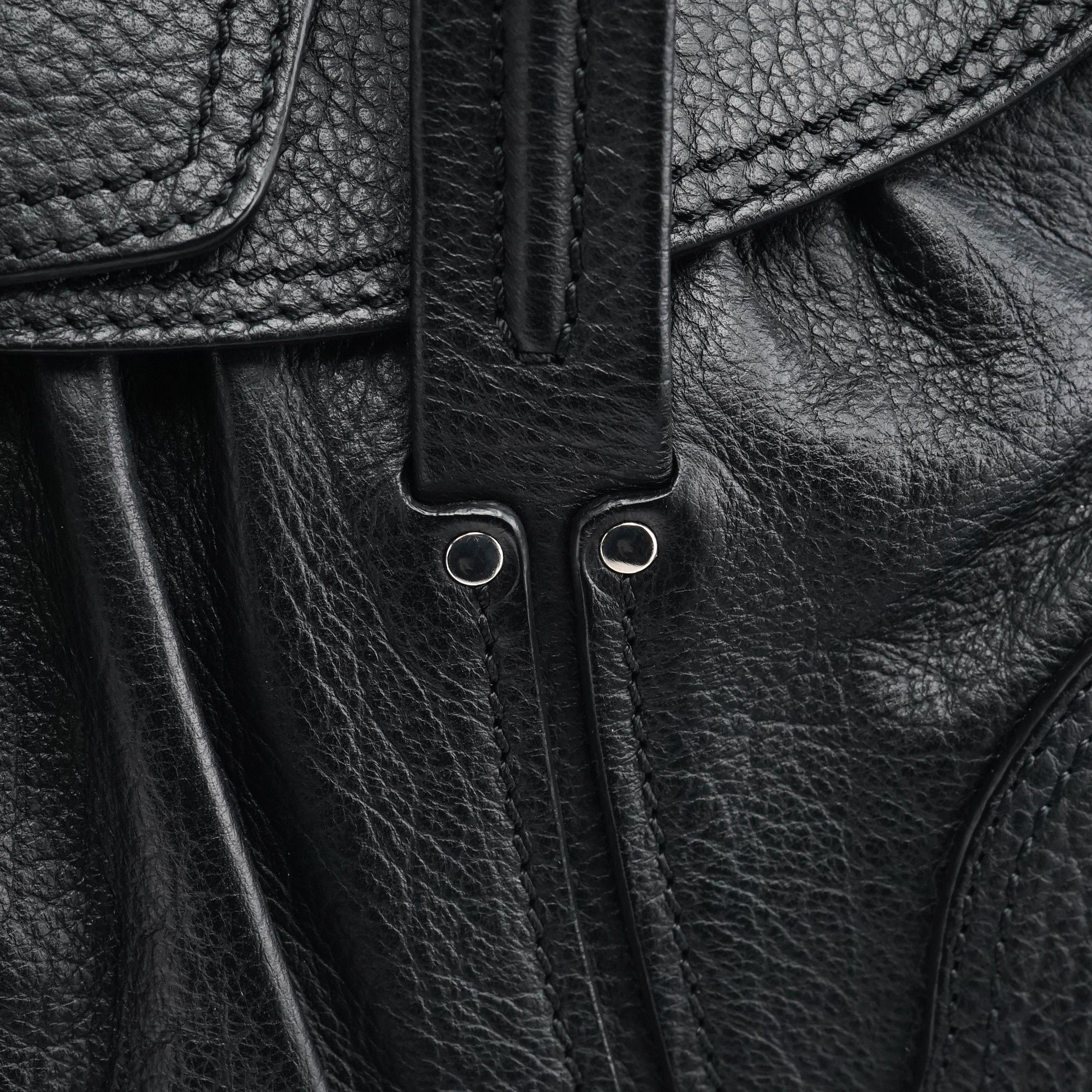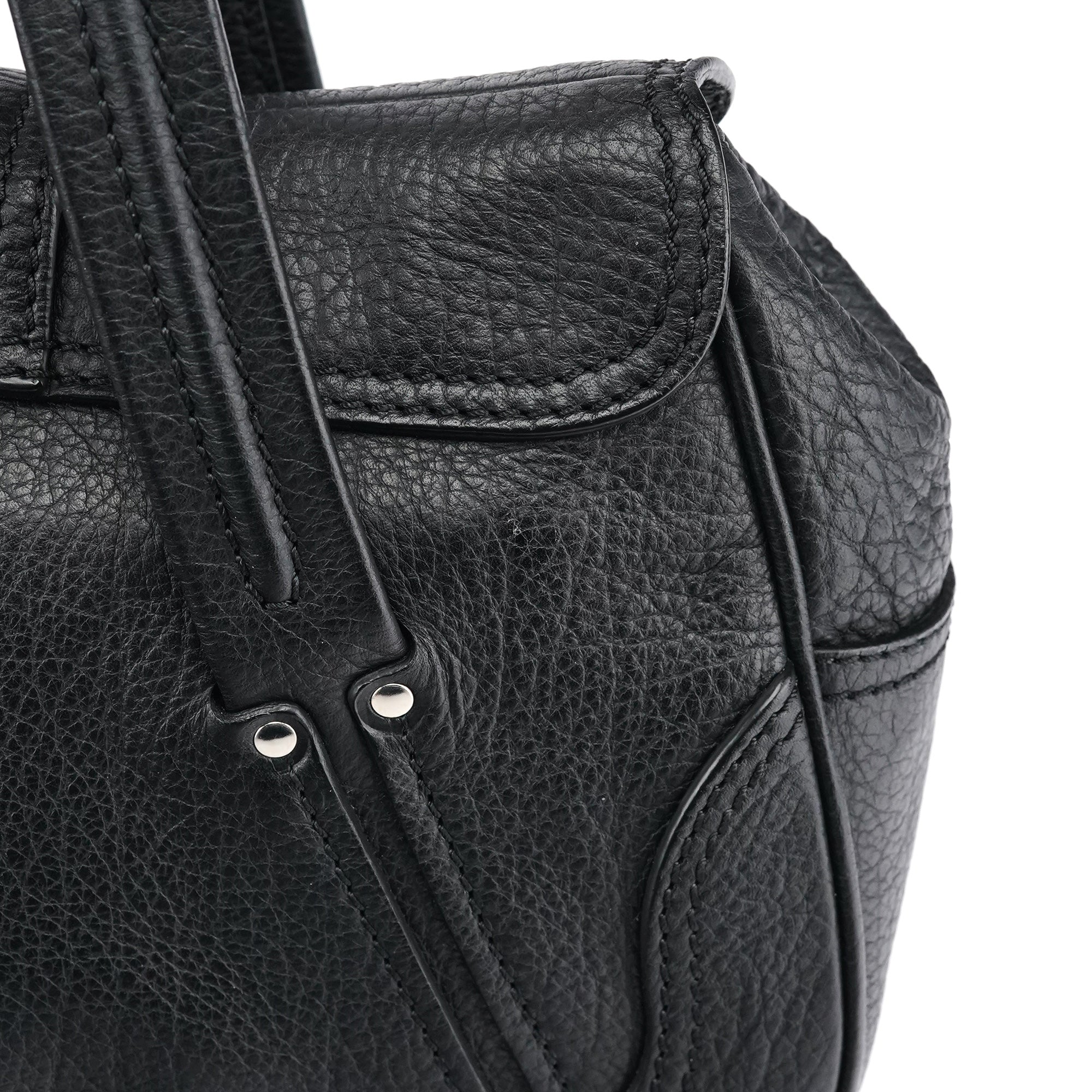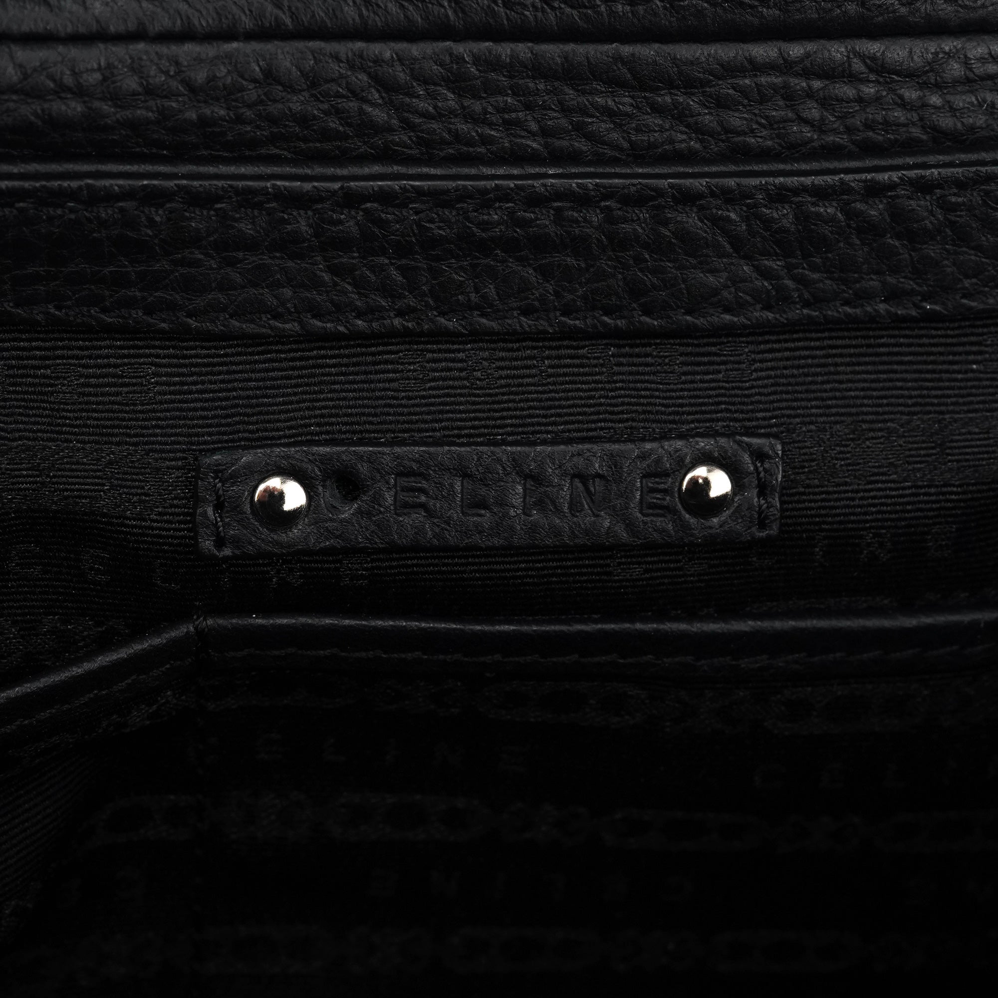 Designed in the early 2000s, this Céline belt tote is crafted from black pebbled calfskin with silver-tone hardware. The design features dual top handles, a front belt-style closure with circular hardware, and a softly structured silhouette. The interior is lined in fabric with a zip pocket.