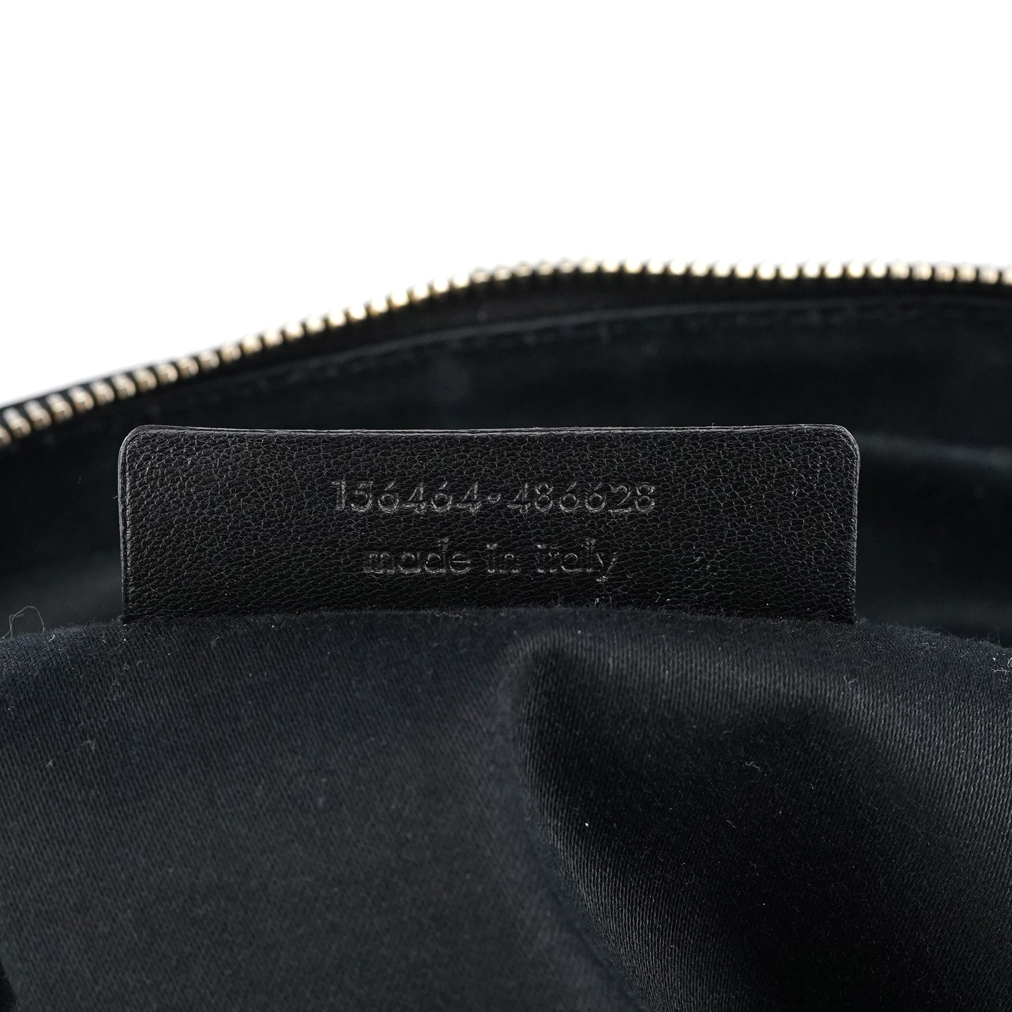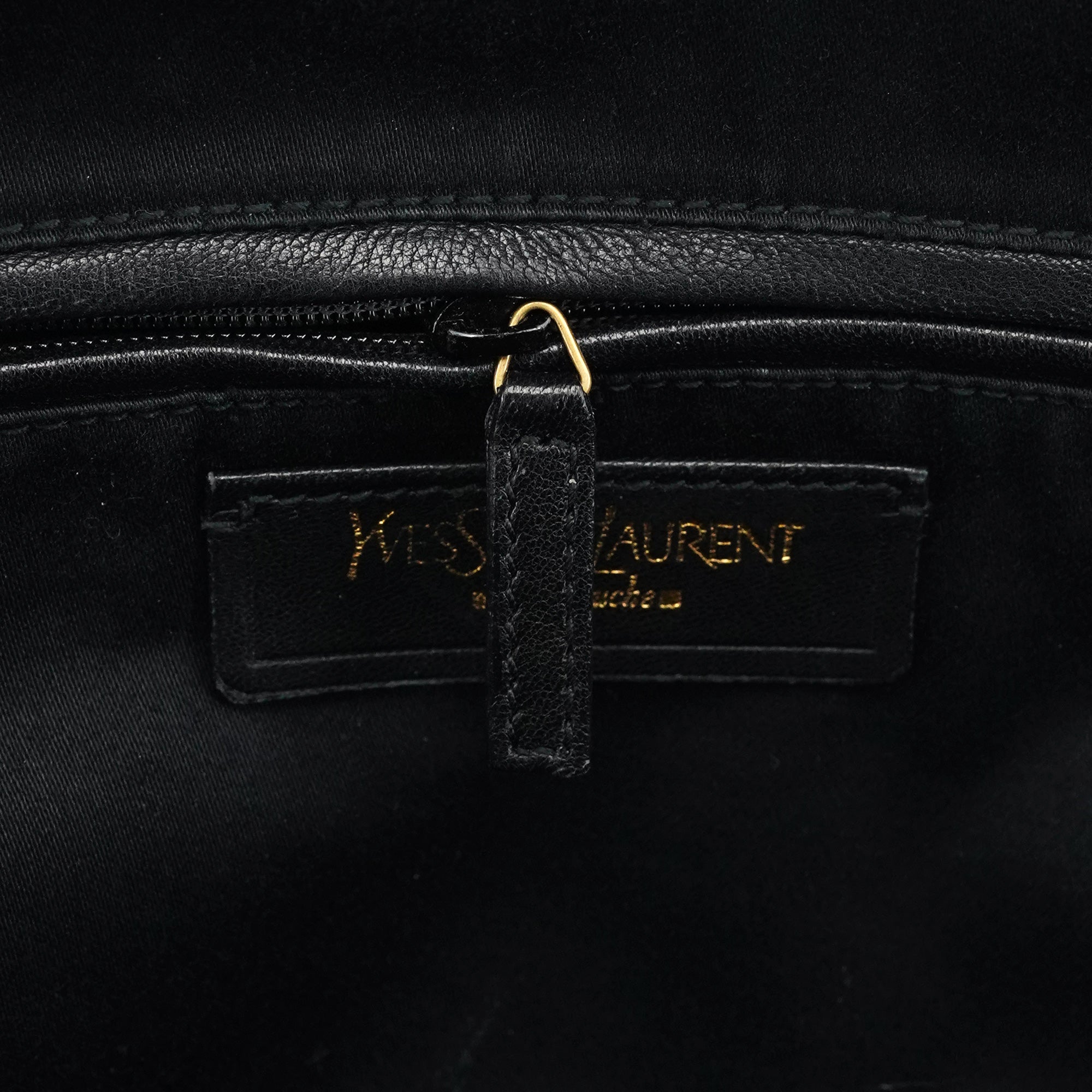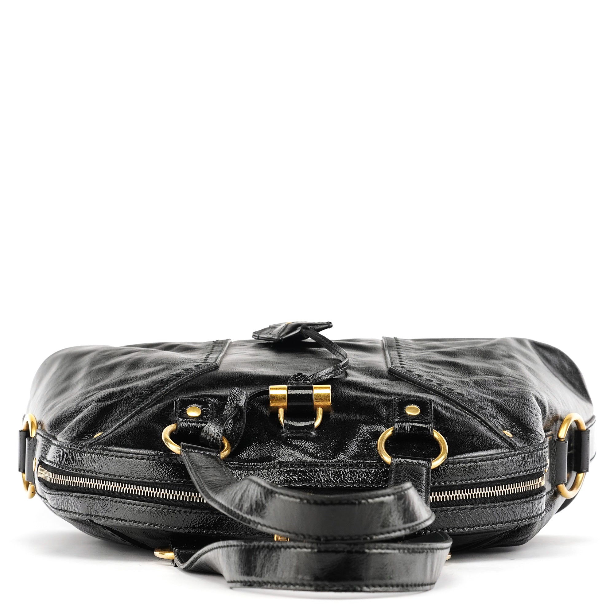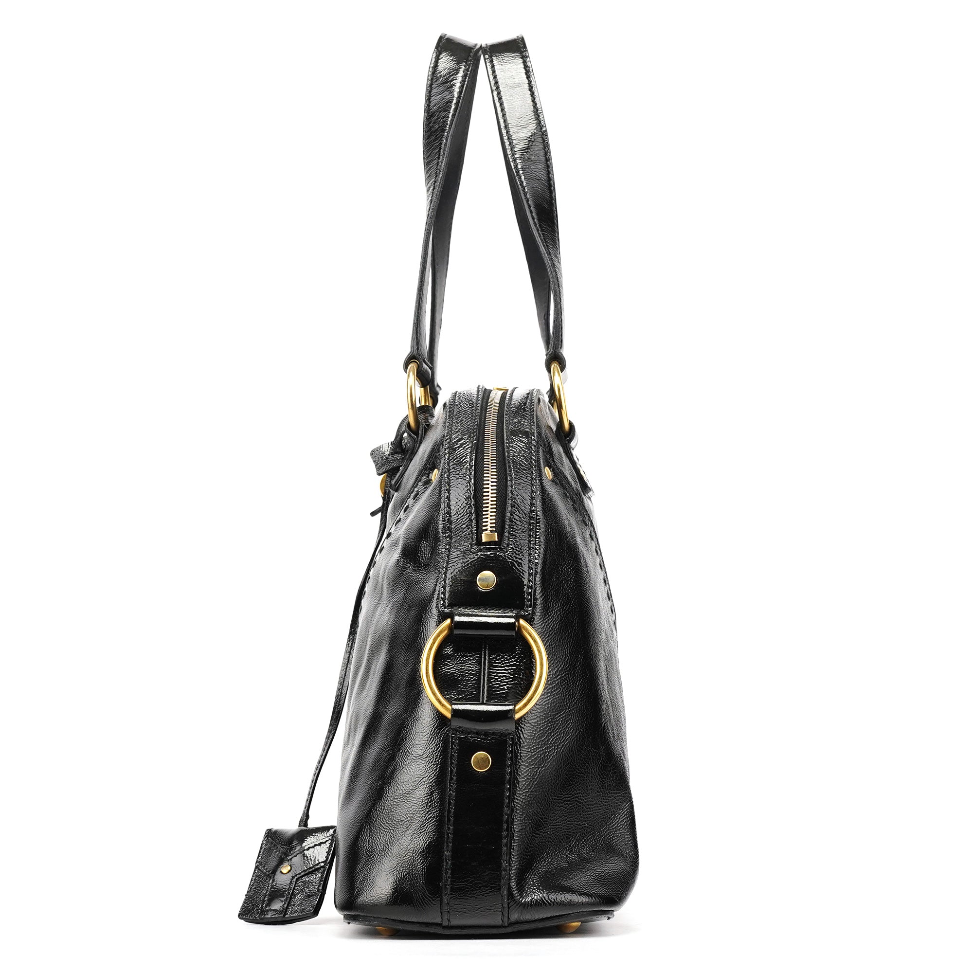 Designed in the late 2000s, this Yves Saint Laurent Muse tote is crafted in glossy black patent leather with brass hardware. The structured dome silhouette features dual top handles, a double-zip closure, and the signature front padlock with leather clochette and key. The satin-lined interior includes a zip pocket.