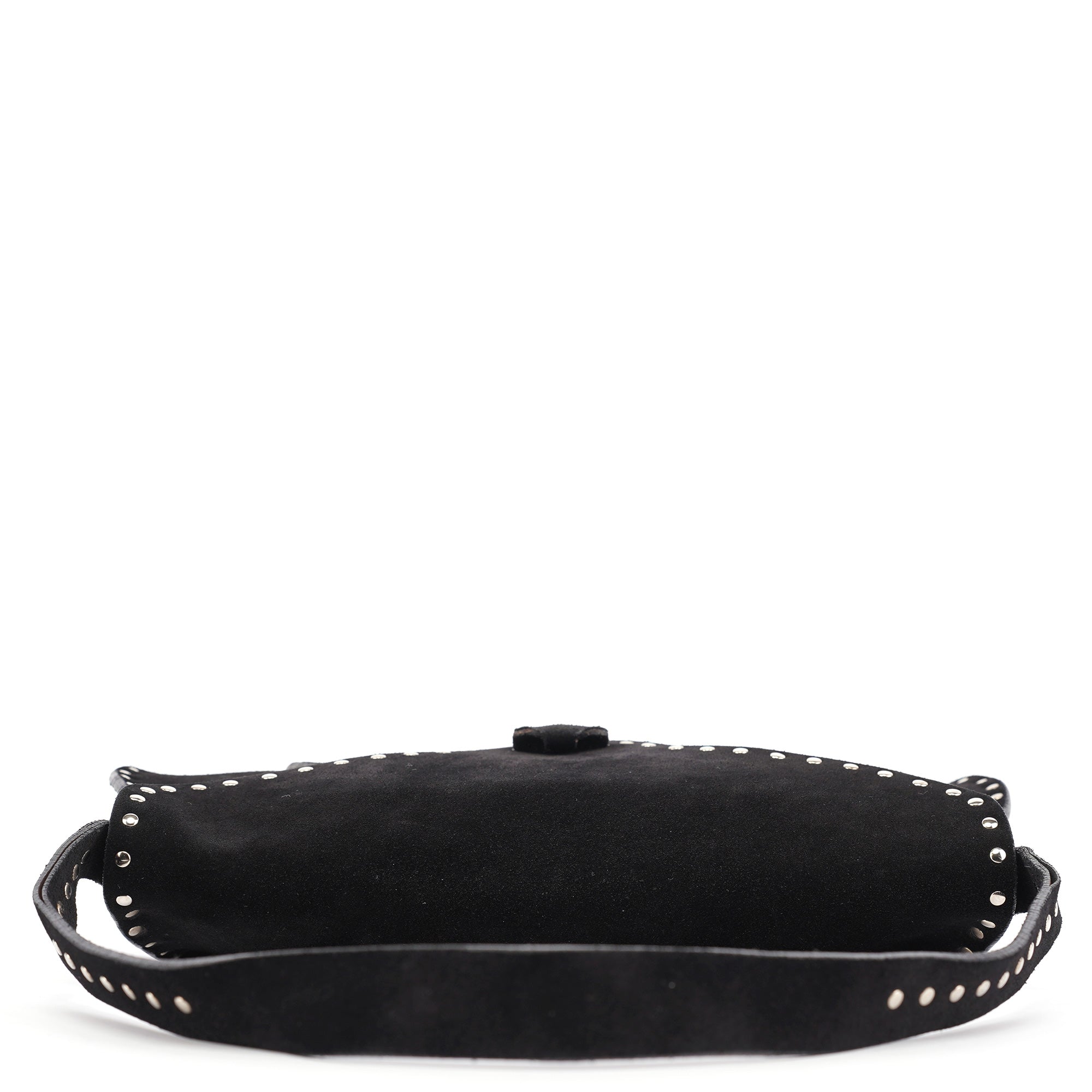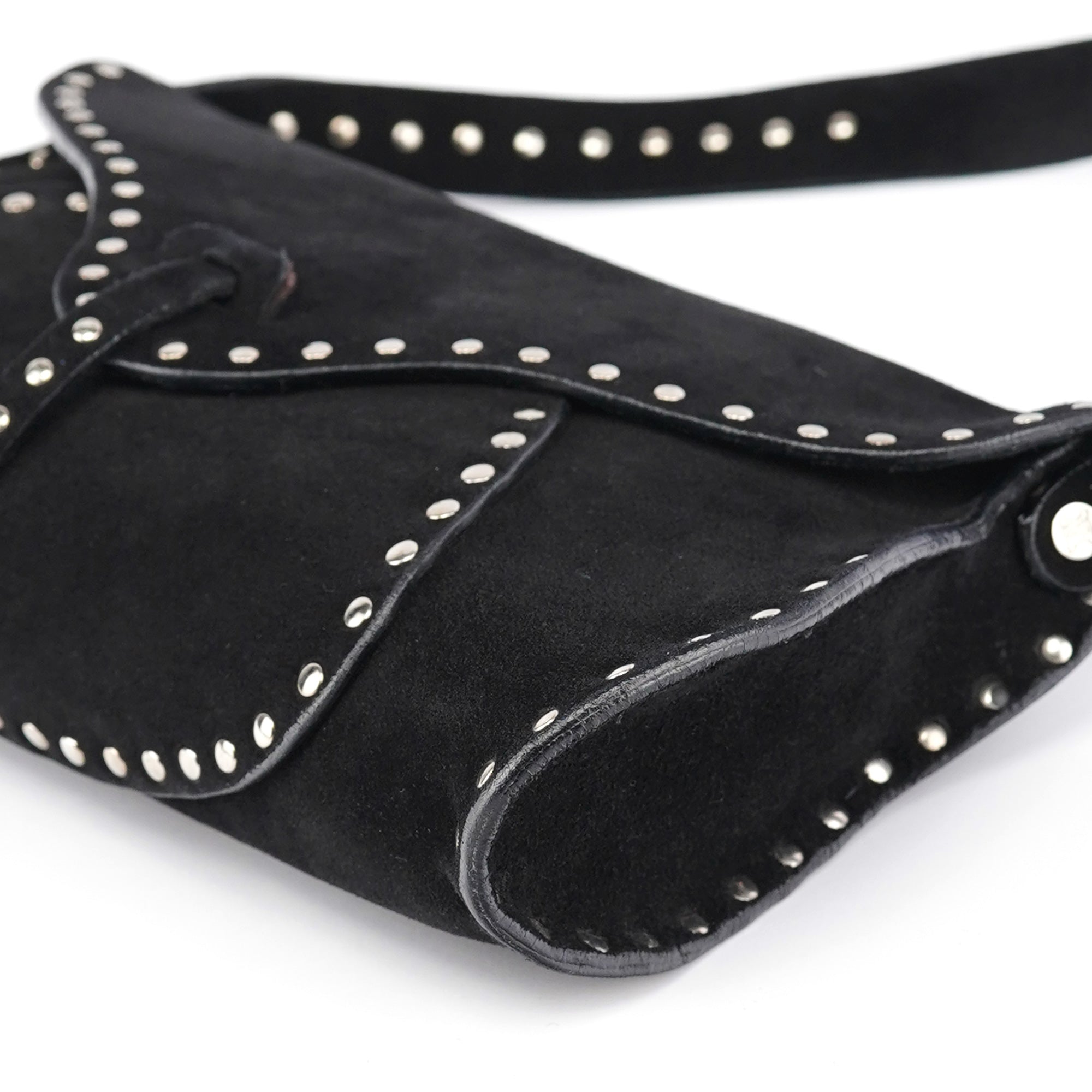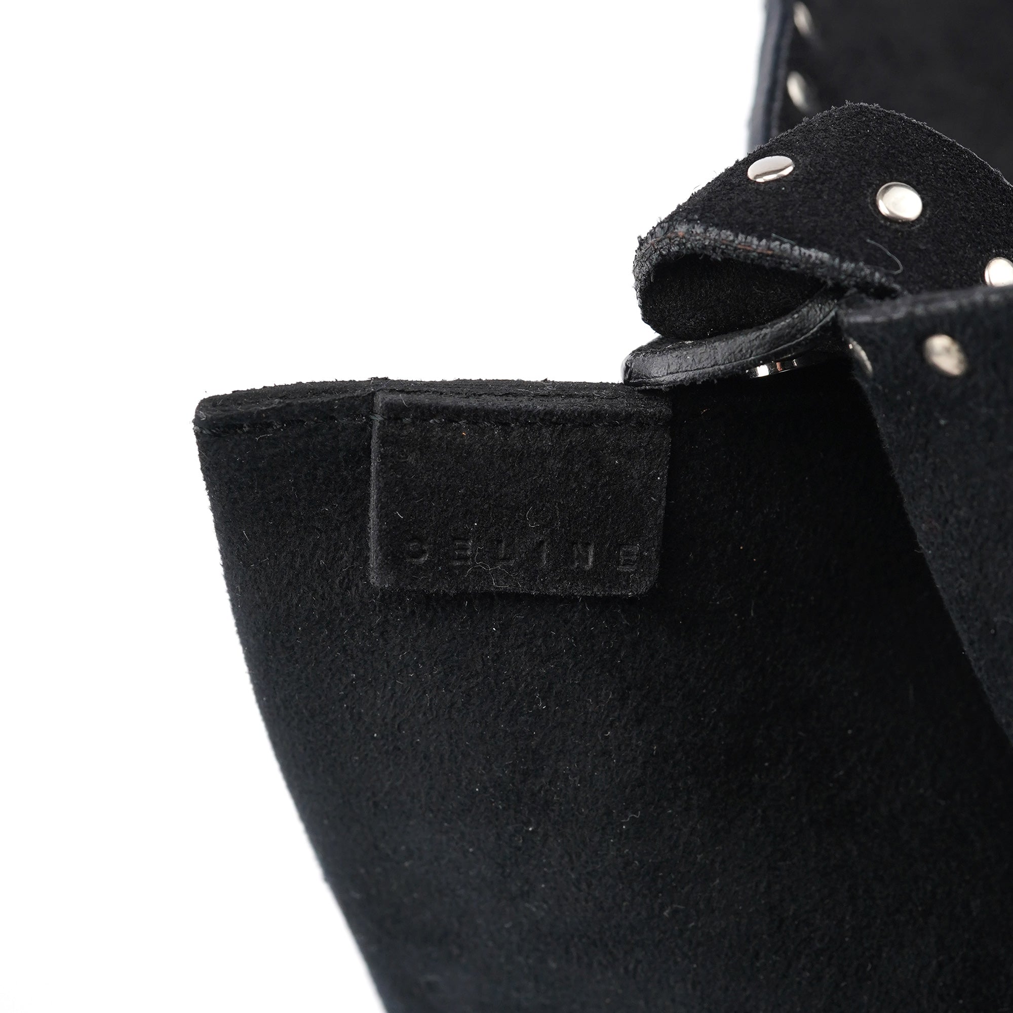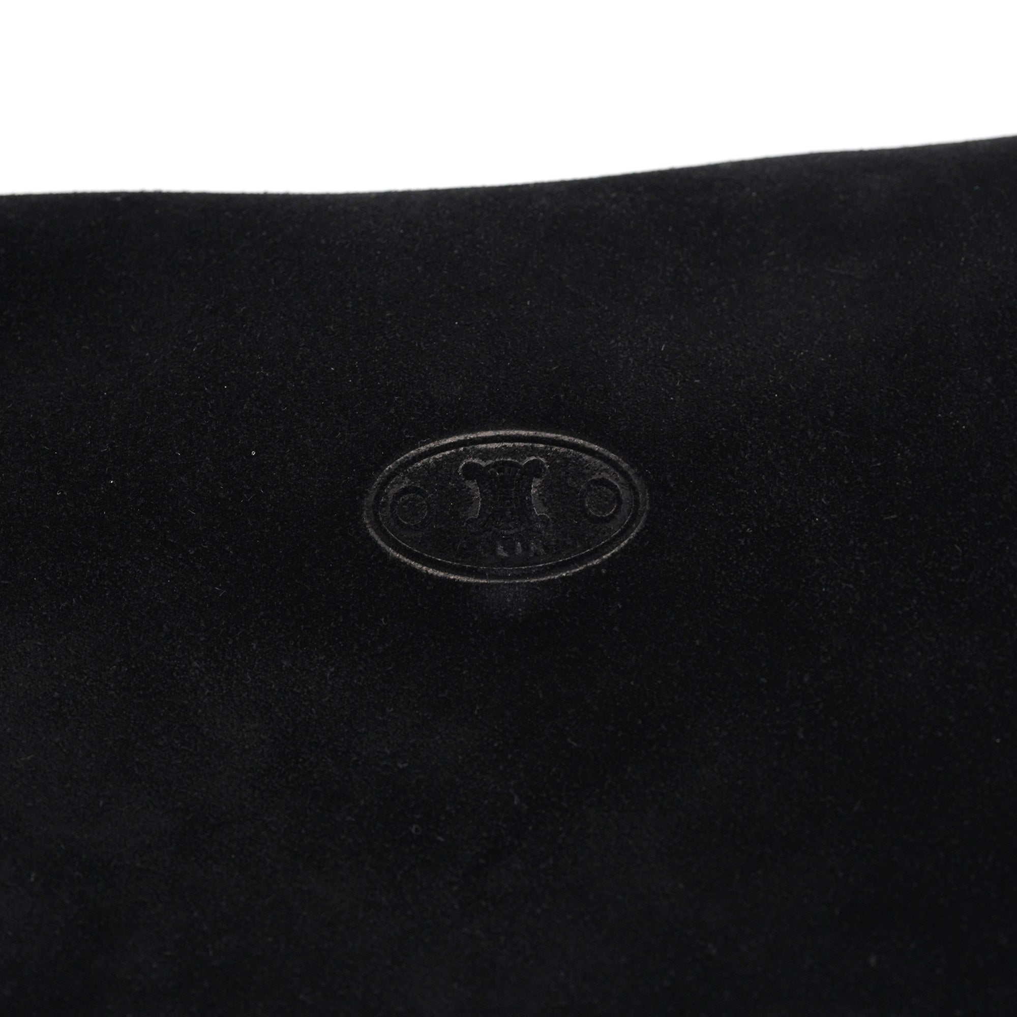 Designed in the early 2000s, this vintage Céline shoulder bag showcases a distinctive Western-inspired aesthetic that predates Phoebe Philo's arrival at the house. Crafted in black suede with silver-tone studs outlining the envelope-style flap and continuing along the shoulder strap, the bag features a magnetic closure and a sleek elongated silhouette. The interior includes one inner pocket.
