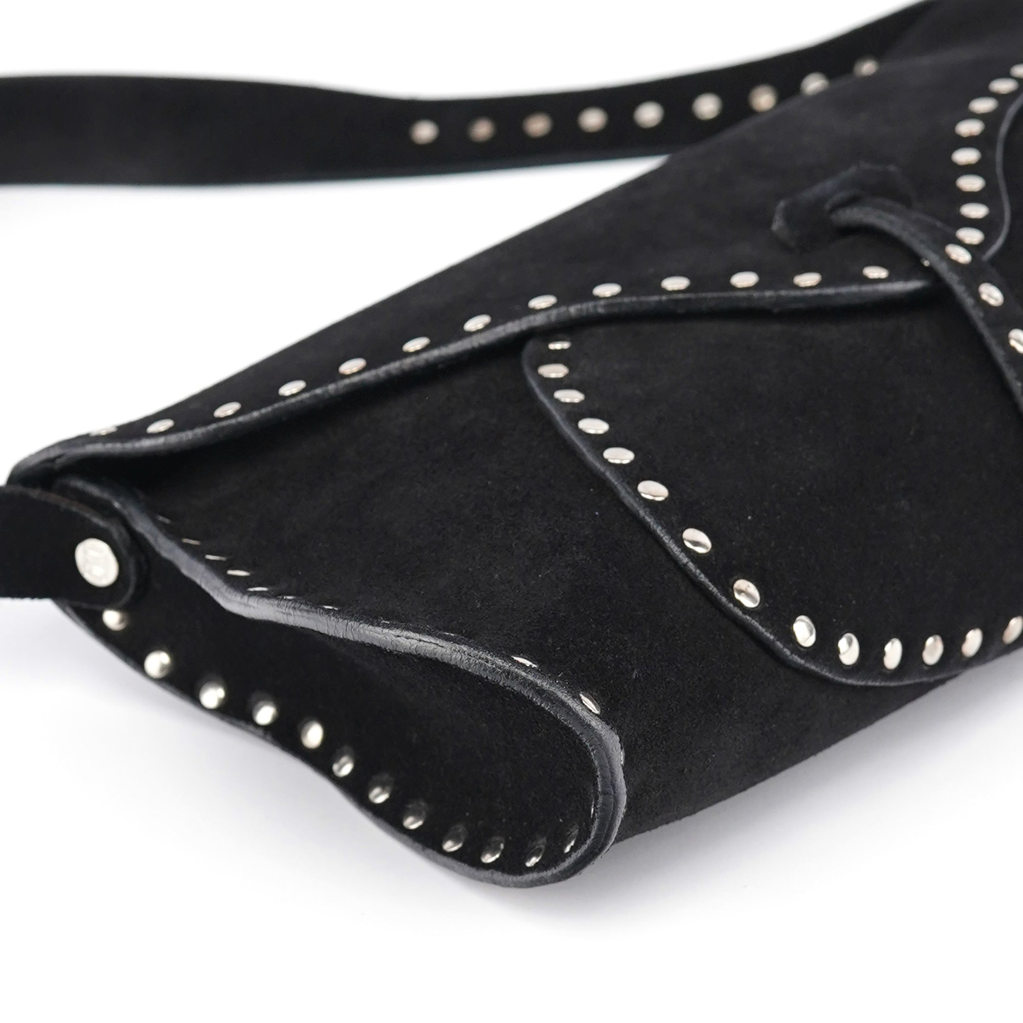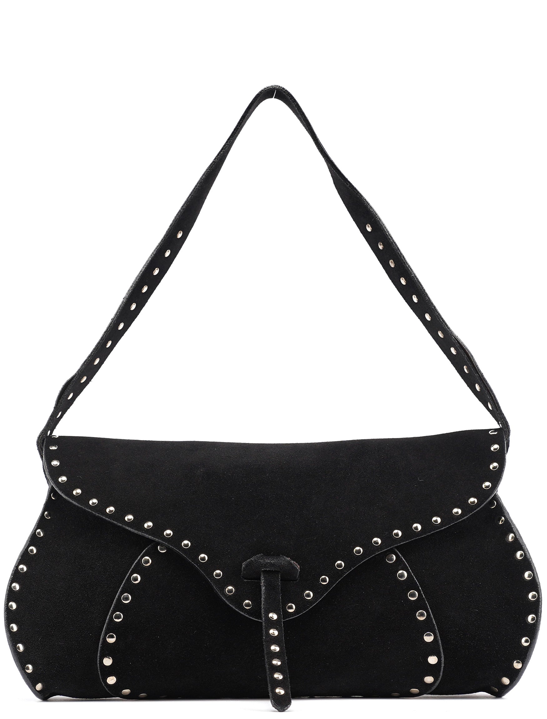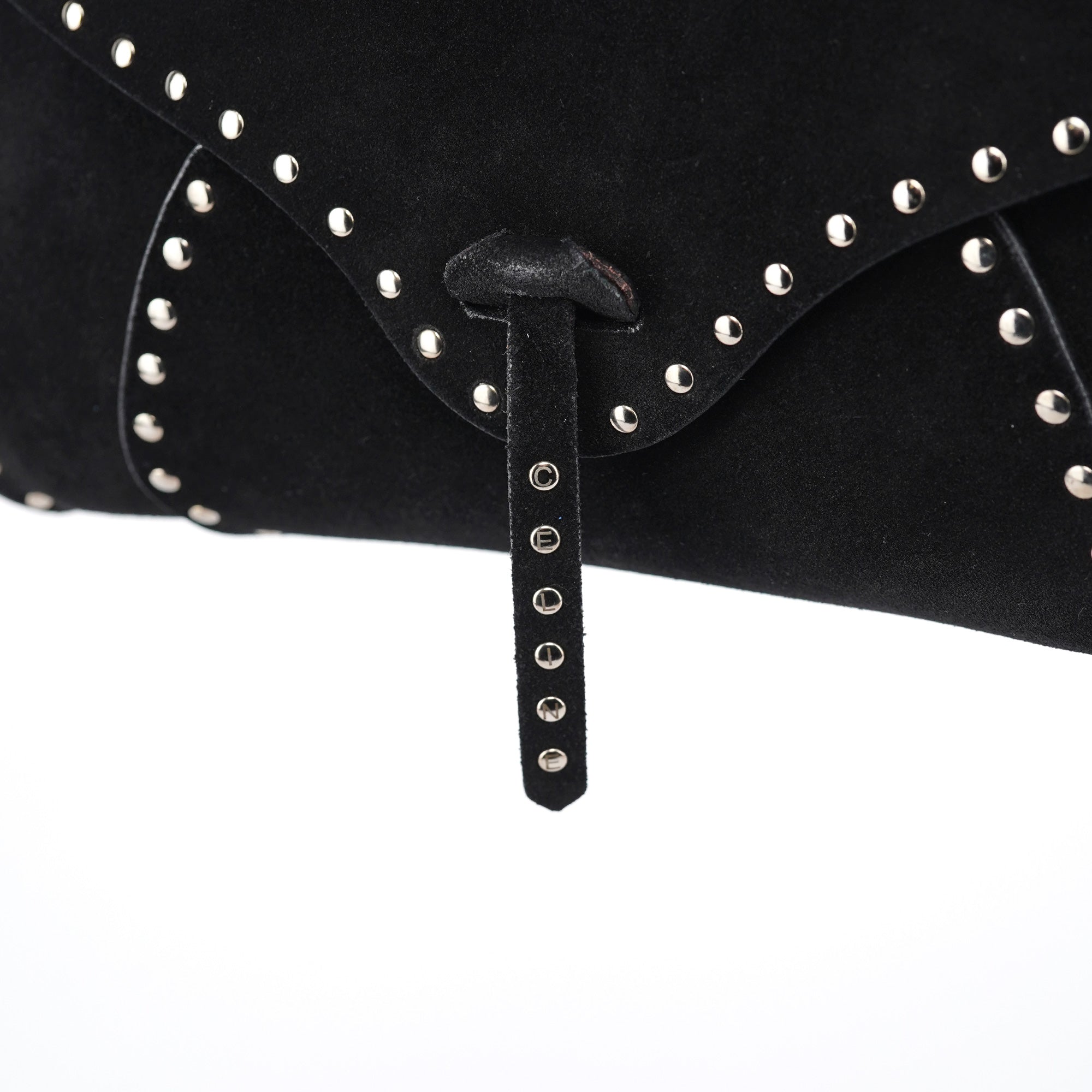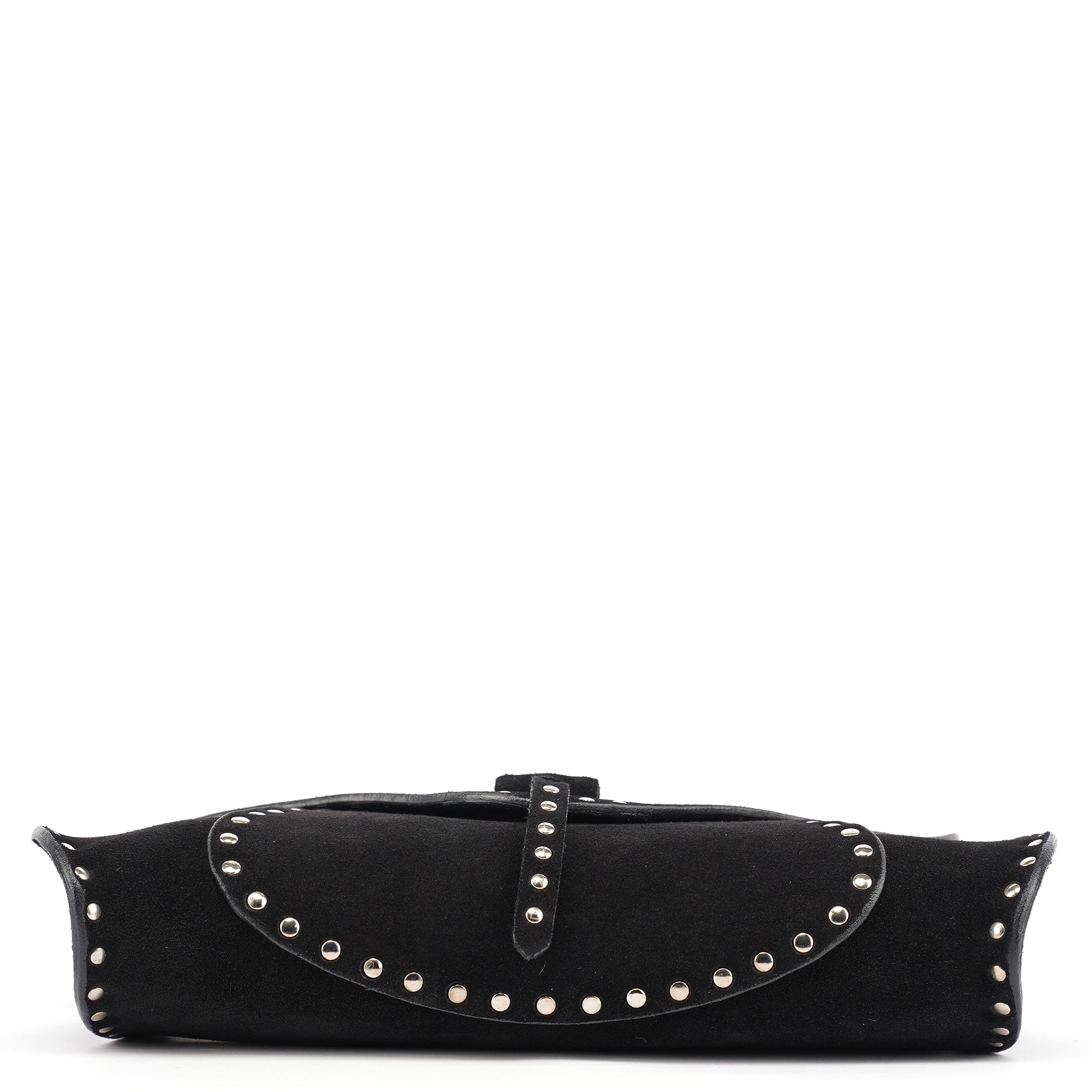 Designed in the early 2000s, this vintage Céline shoulder bag showcases a distinctive Western-inspired aesthetic that predates Phoebe Philo's arrival at the house. Crafted in black suede with silver-tone studs outlining the envelope-style flap and continuing along the shoulder strap, the bag features a magnetic closure and a sleek elongated silhouette. The interior includes one inner pocket.