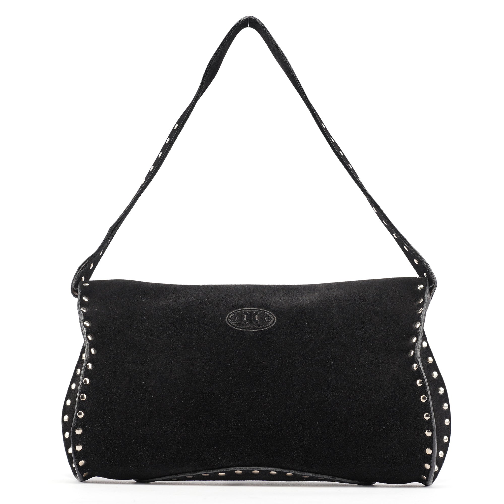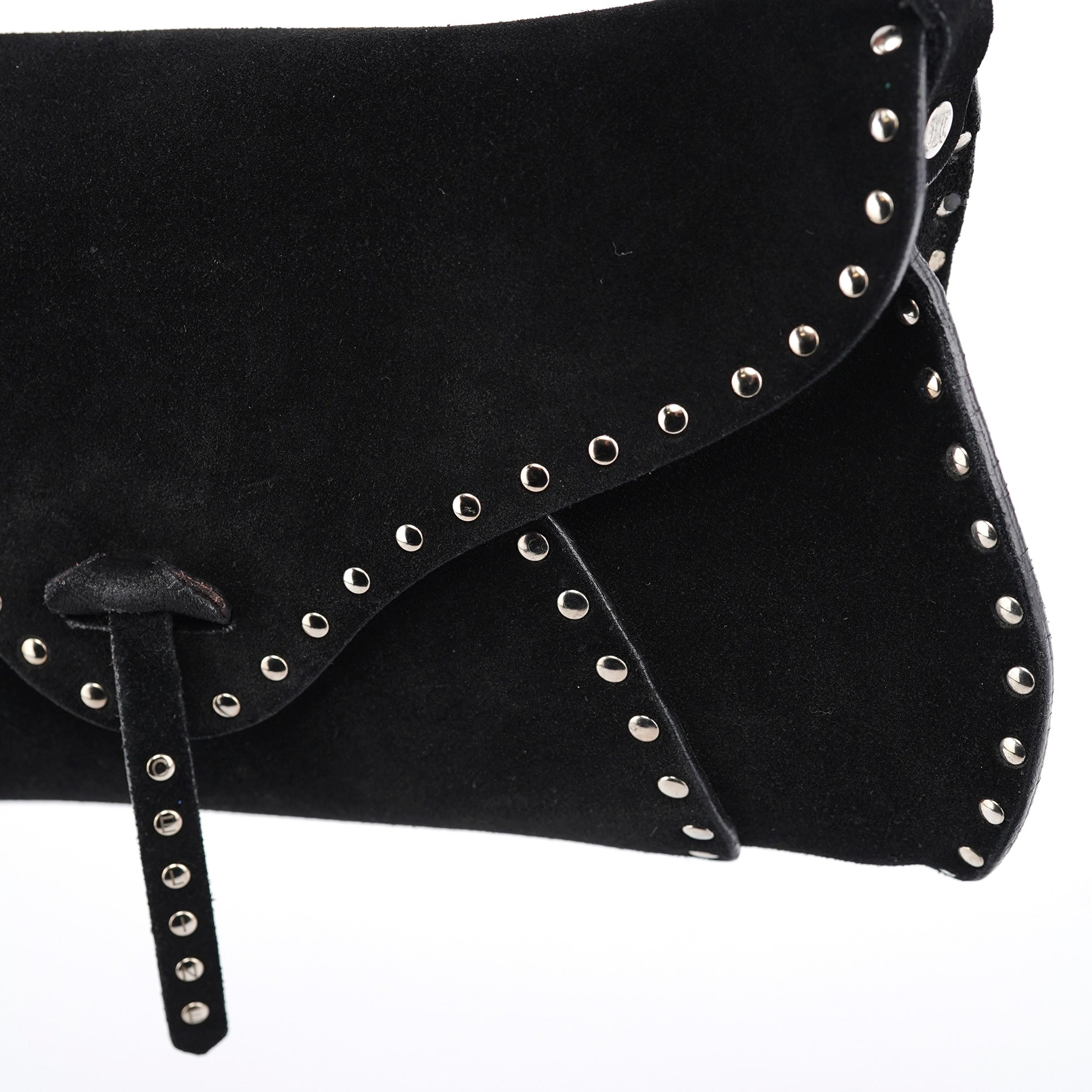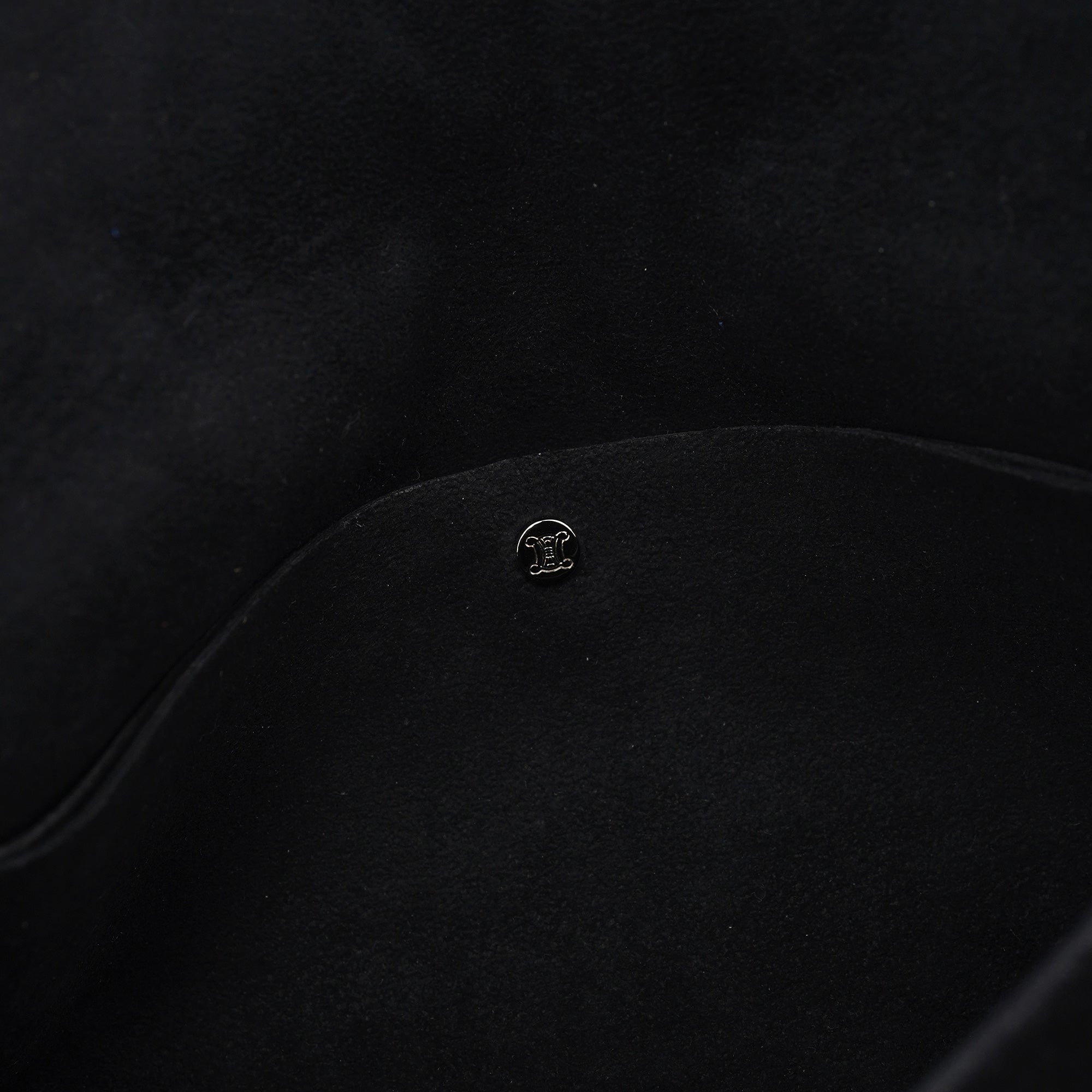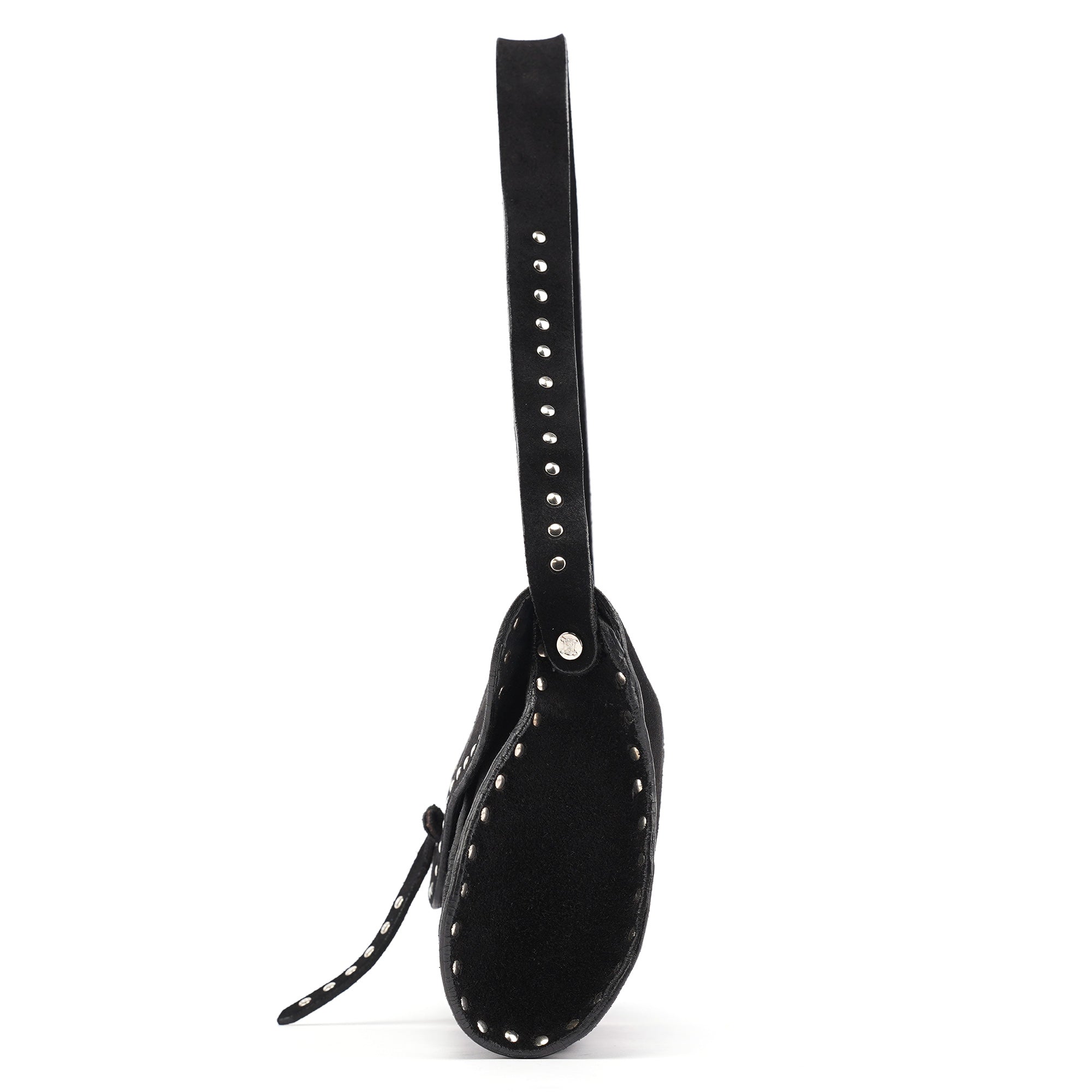 Designed in the early 2000s, this vintage Céline shoulder bag showcases a distinctive Western-inspired aesthetic that predates Phoebe Philo's arrival at the house. Crafted in black suede with silver-tone studs outlining the envelope-style flap and continuing along the shoulder strap, the bag features a magnetic closure and a sleek elongated silhouette. The interior includes one inner pocket.