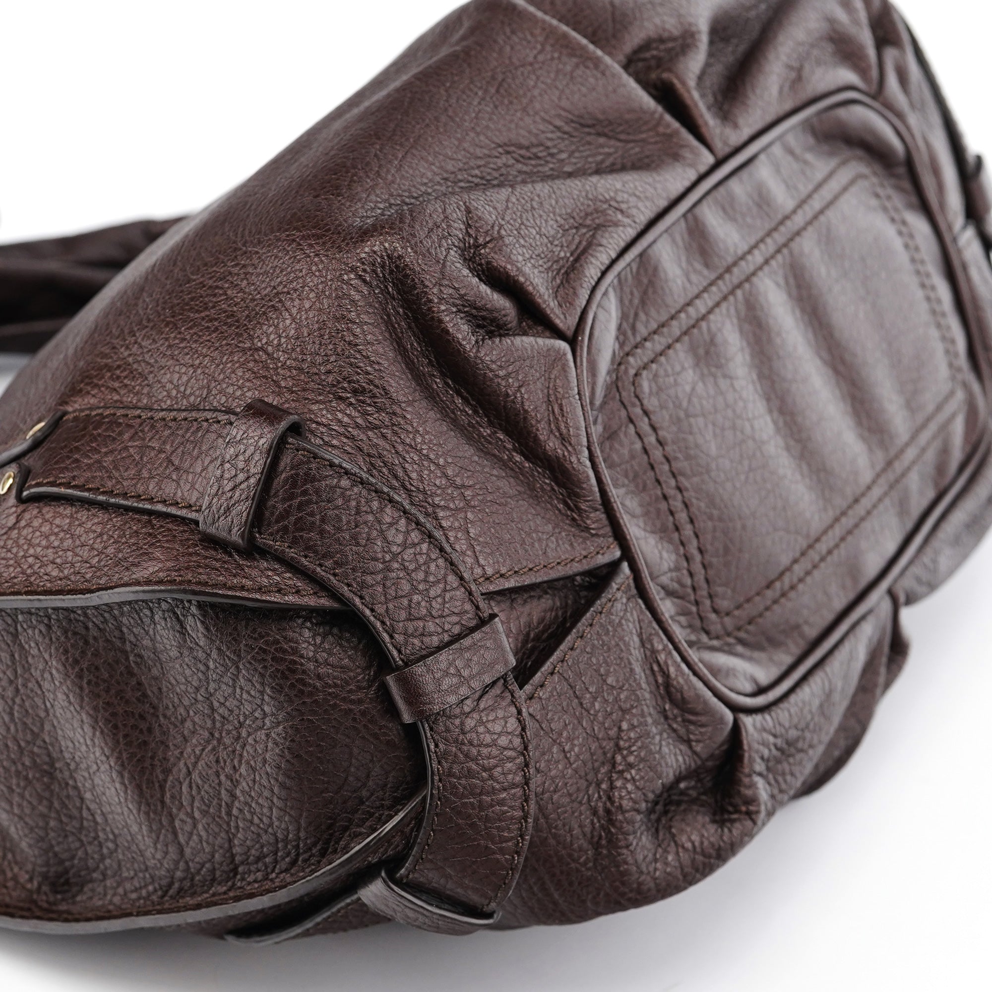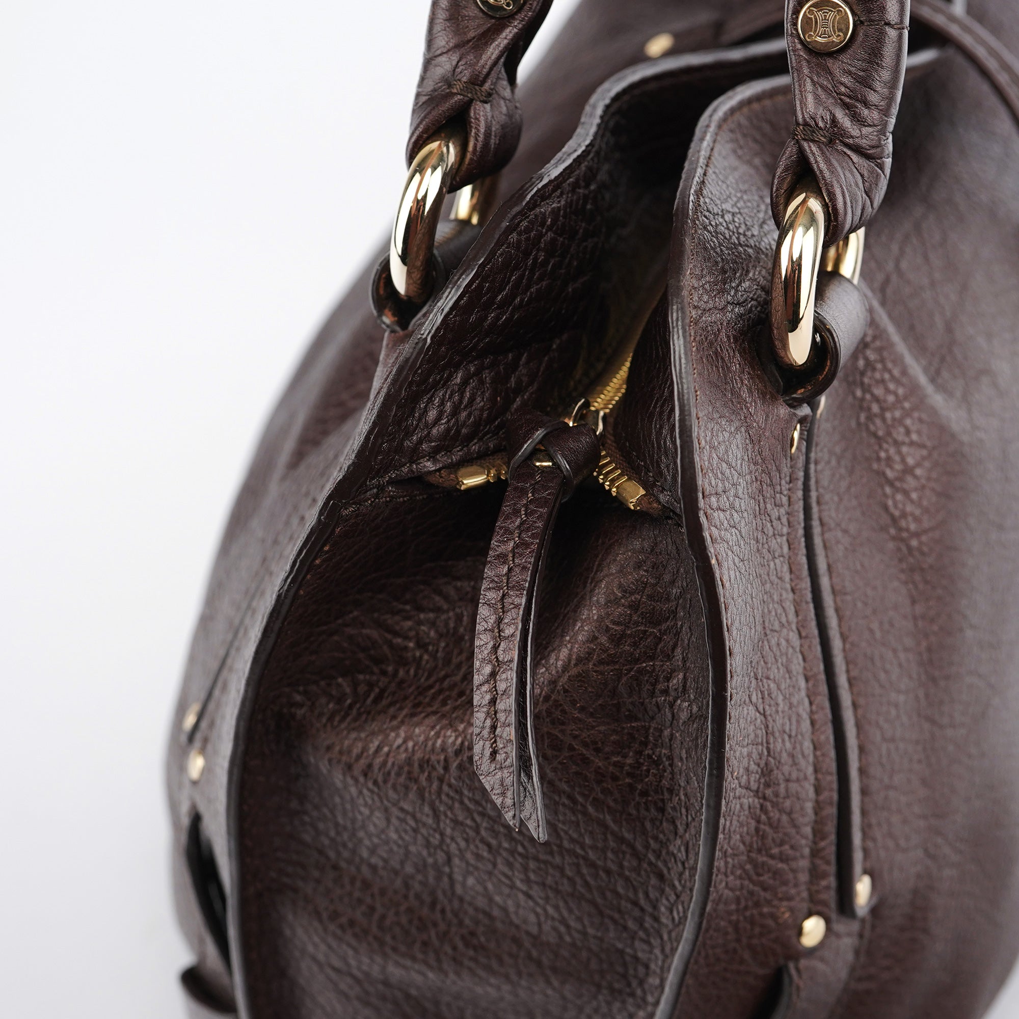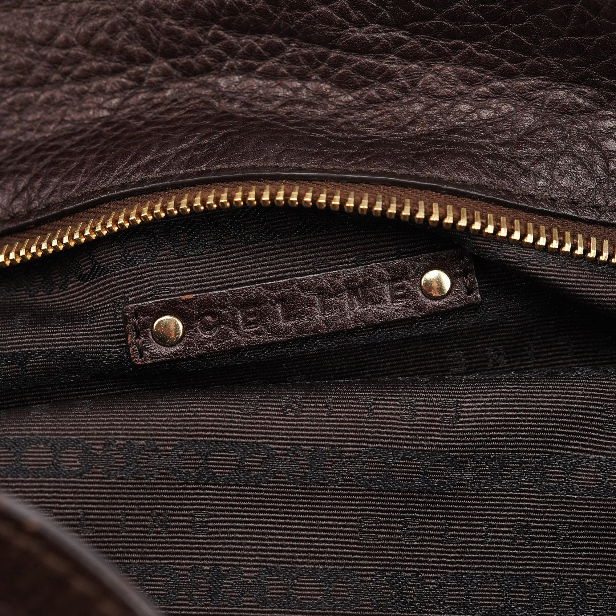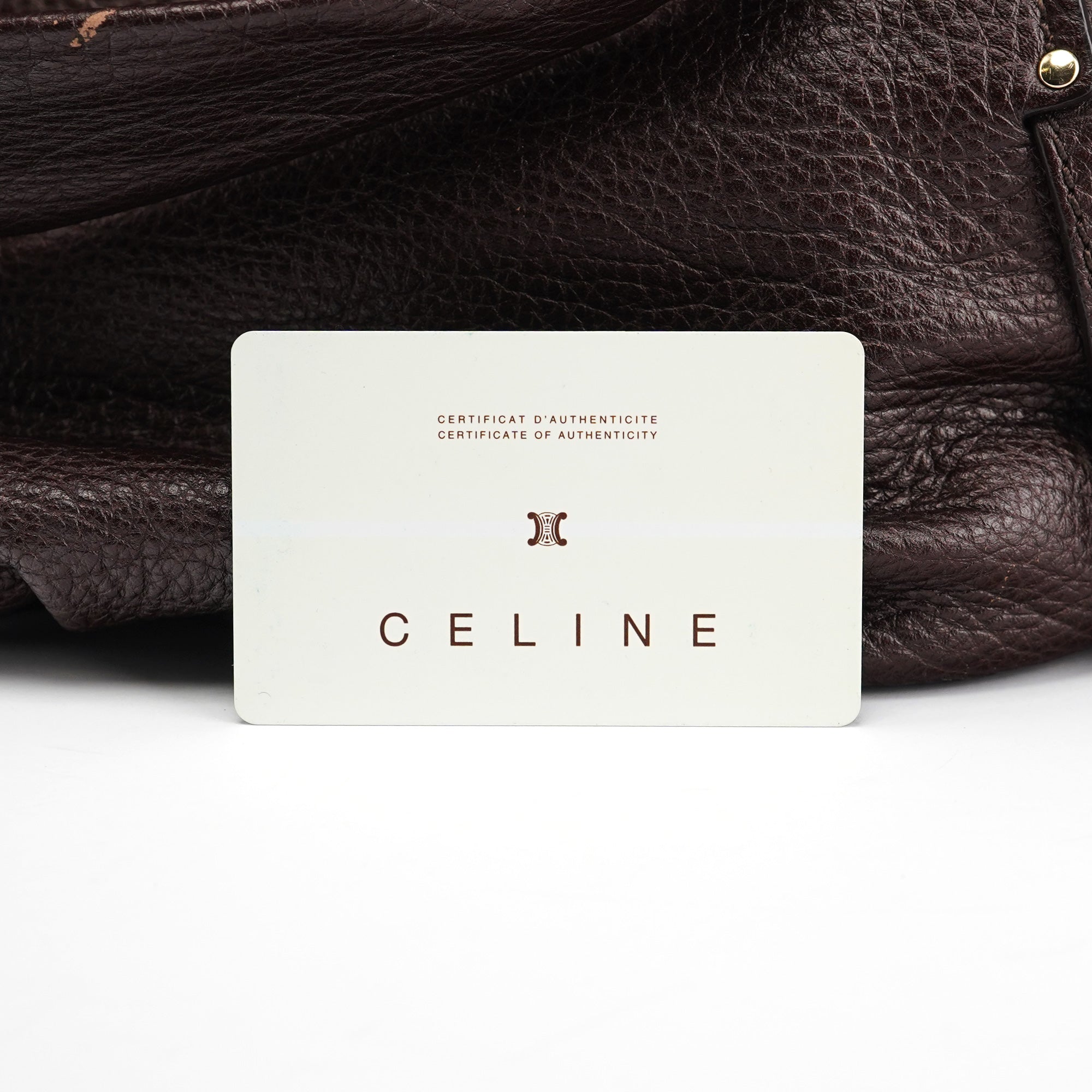 Designed in the early 2000's, this vintage Celine Bittersweet shoulder bag was crafted from brown grained leather. The relaxed silhouette features dual top handles with drawstring closure, hardware accents, a spacious interior with five slip pockets and one zip pocket, and an exterior side pocket. The supple leather and slouchy shape create a refined yet casual aesthetic.