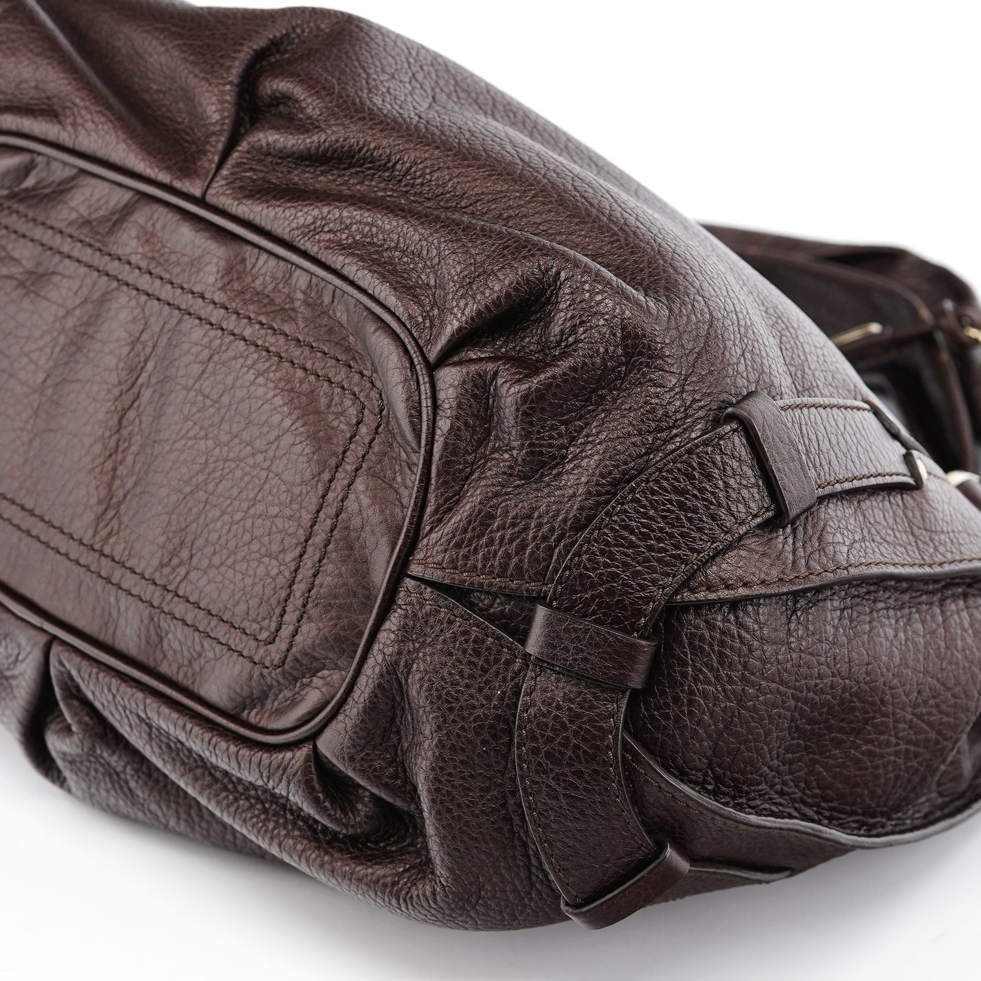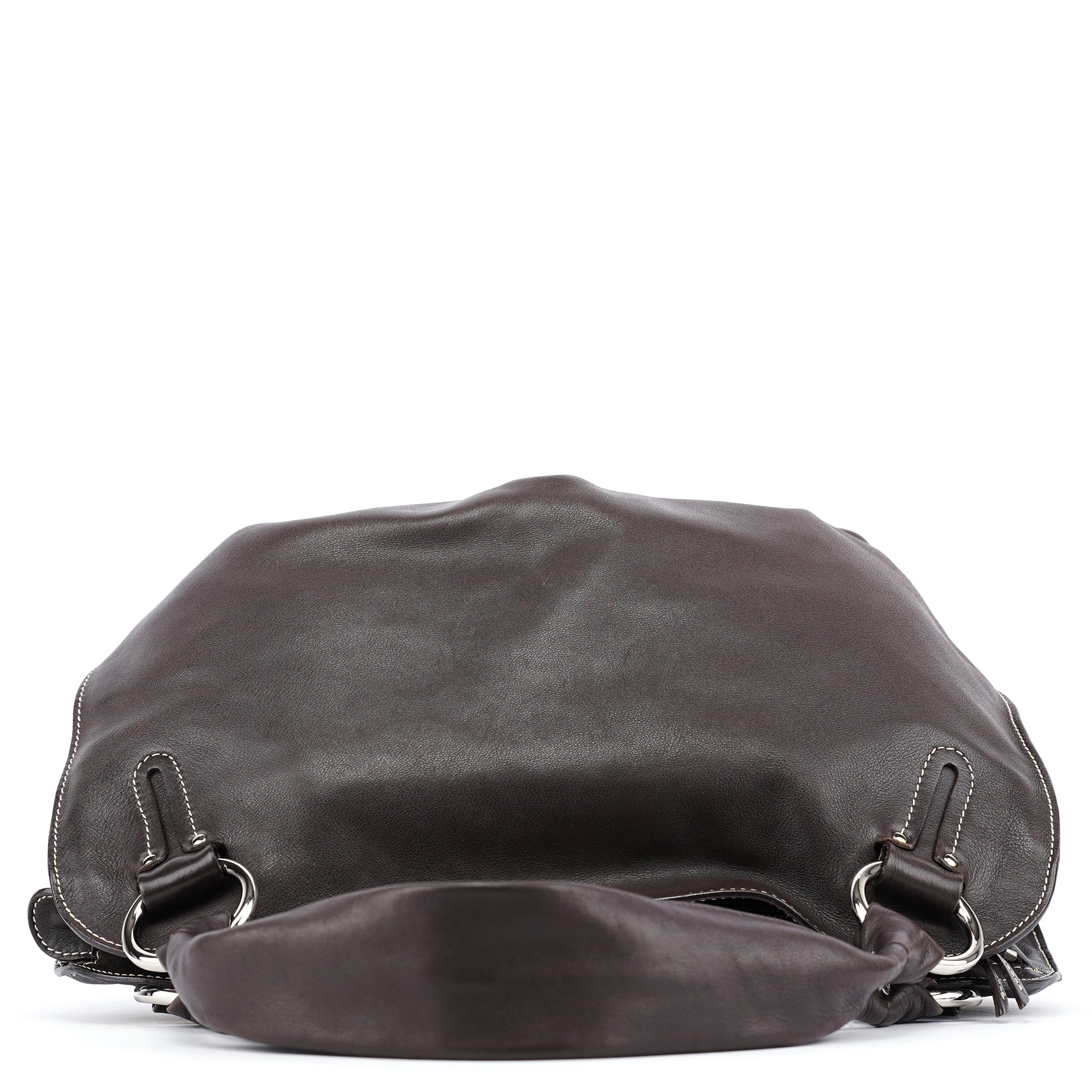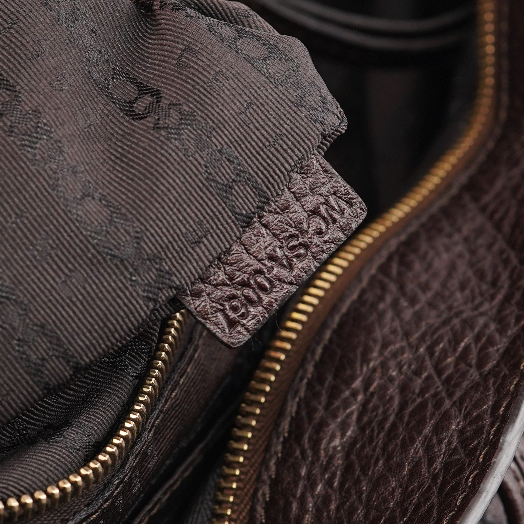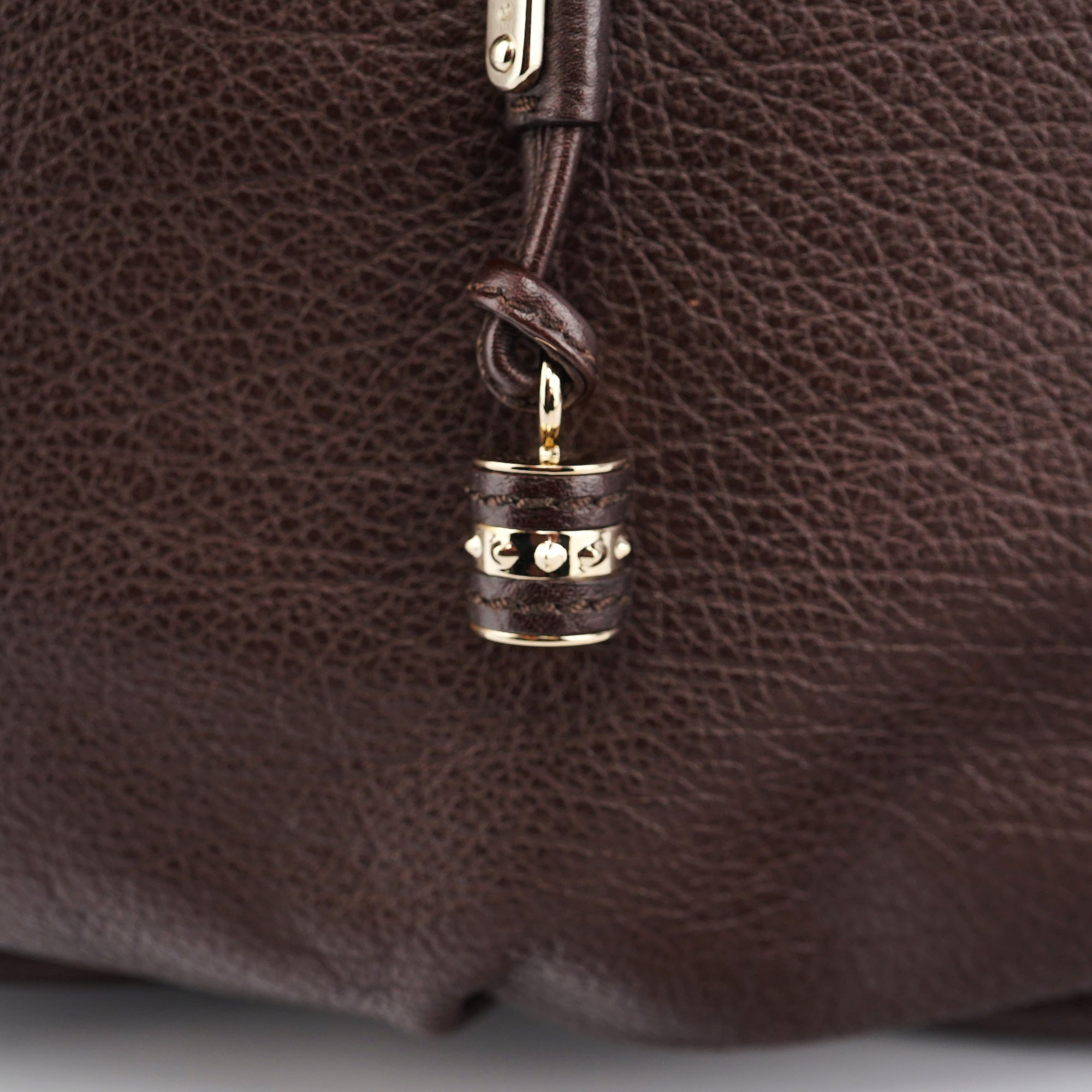 Designed in the early 2000's, this vintage Celine Bittersweet shoulder bag was crafted from brown grained leather. The relaxed silhouette features dual top handles with drawstring closure, hardware accents, a spacious interior with five slip pockets and one zip pocket, and an exterior side pocket. The supple leather and slouchy shape create a refined yet casual aesthetic.