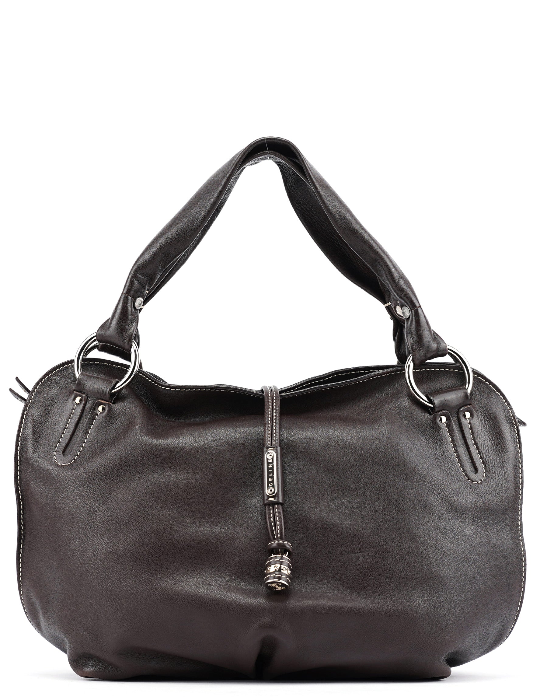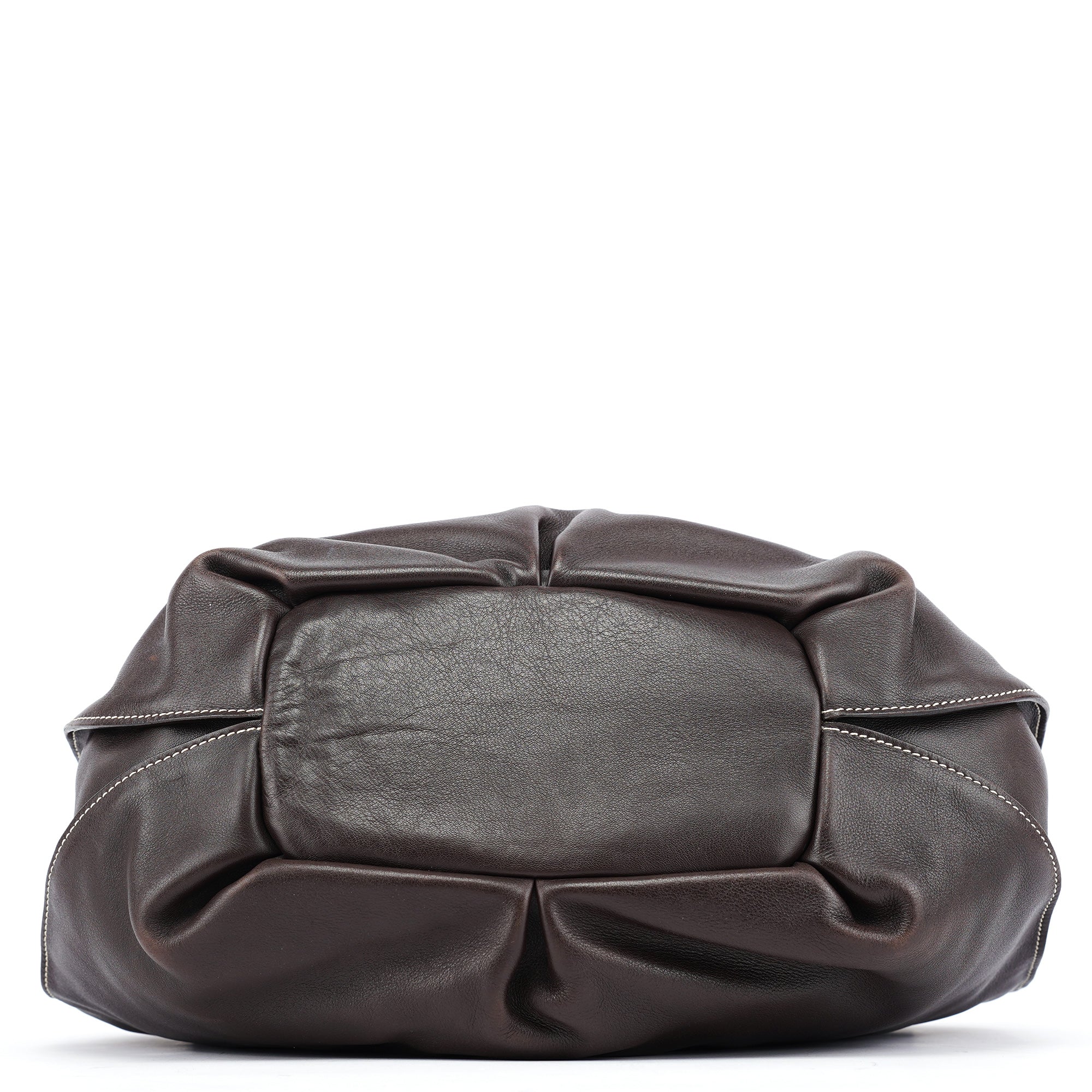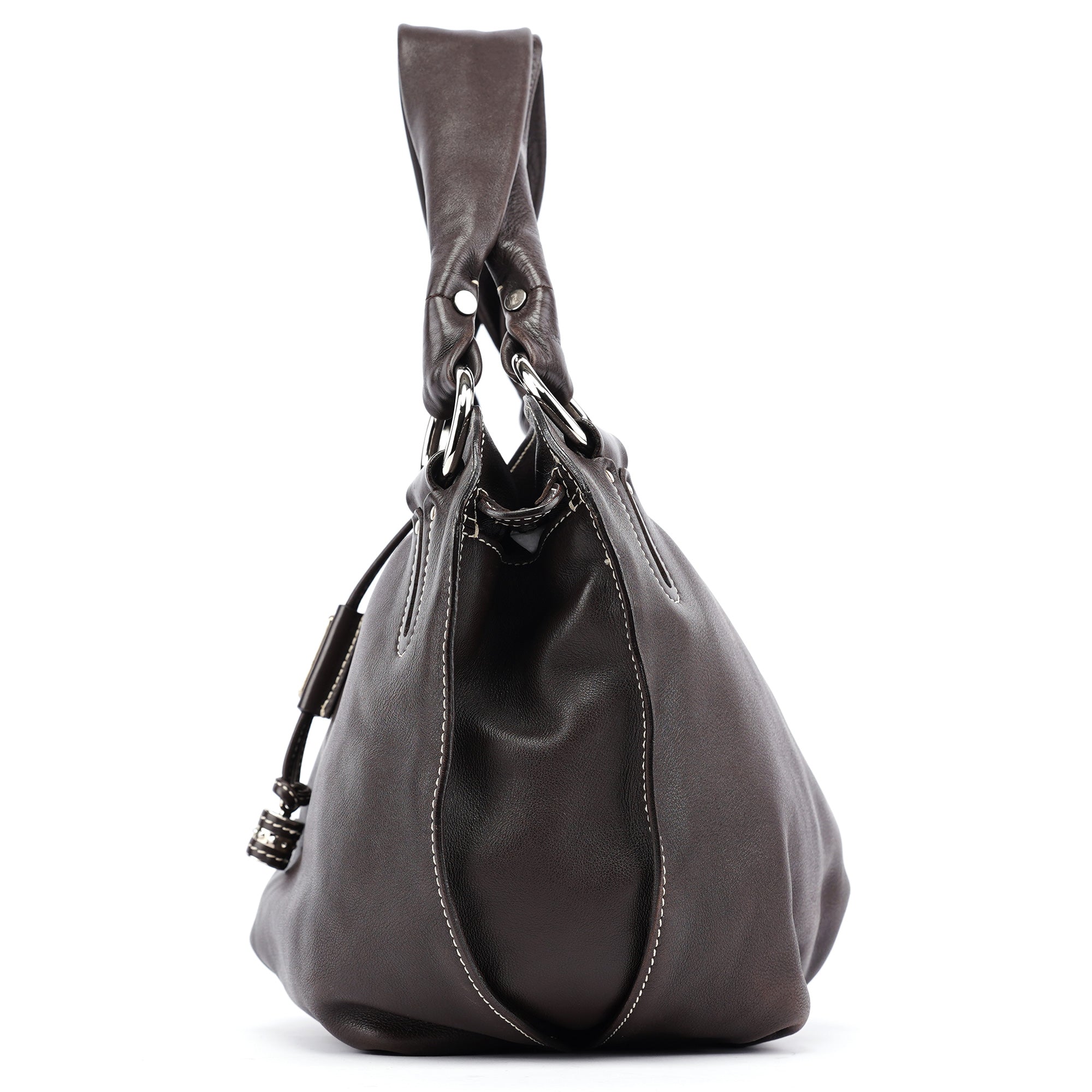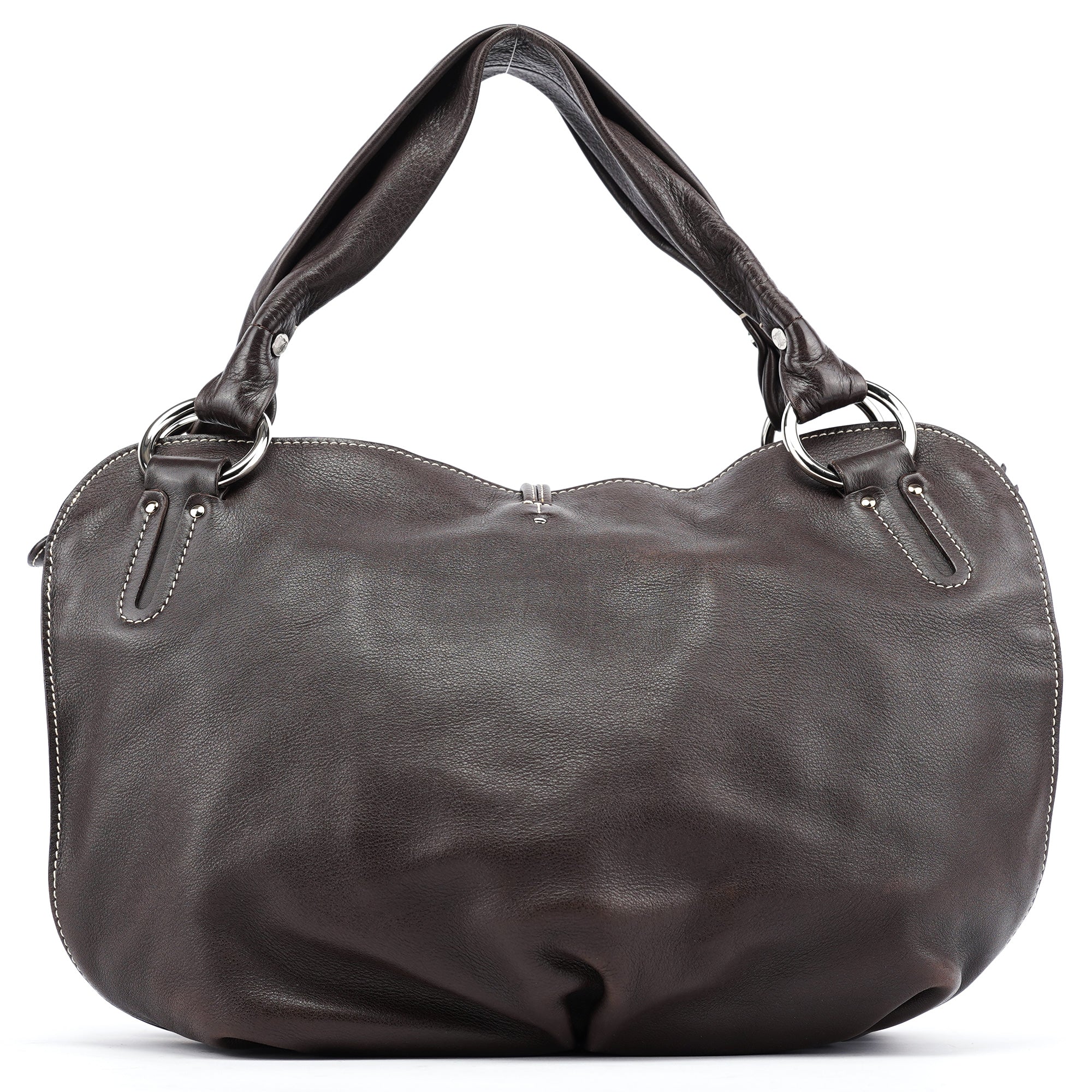 Designed in the early 2000's, this vintage Celine Bittersweet shoulder bag was crafted from brown grained leather. The relaxed silhouette features dual top handles with drawstring closure, hardware accents, a spacious interior with five slip pockets and one zip pocket, and an exterior side pocket. The supple leather and slouchy shape create a refined yet casual aesthetic.