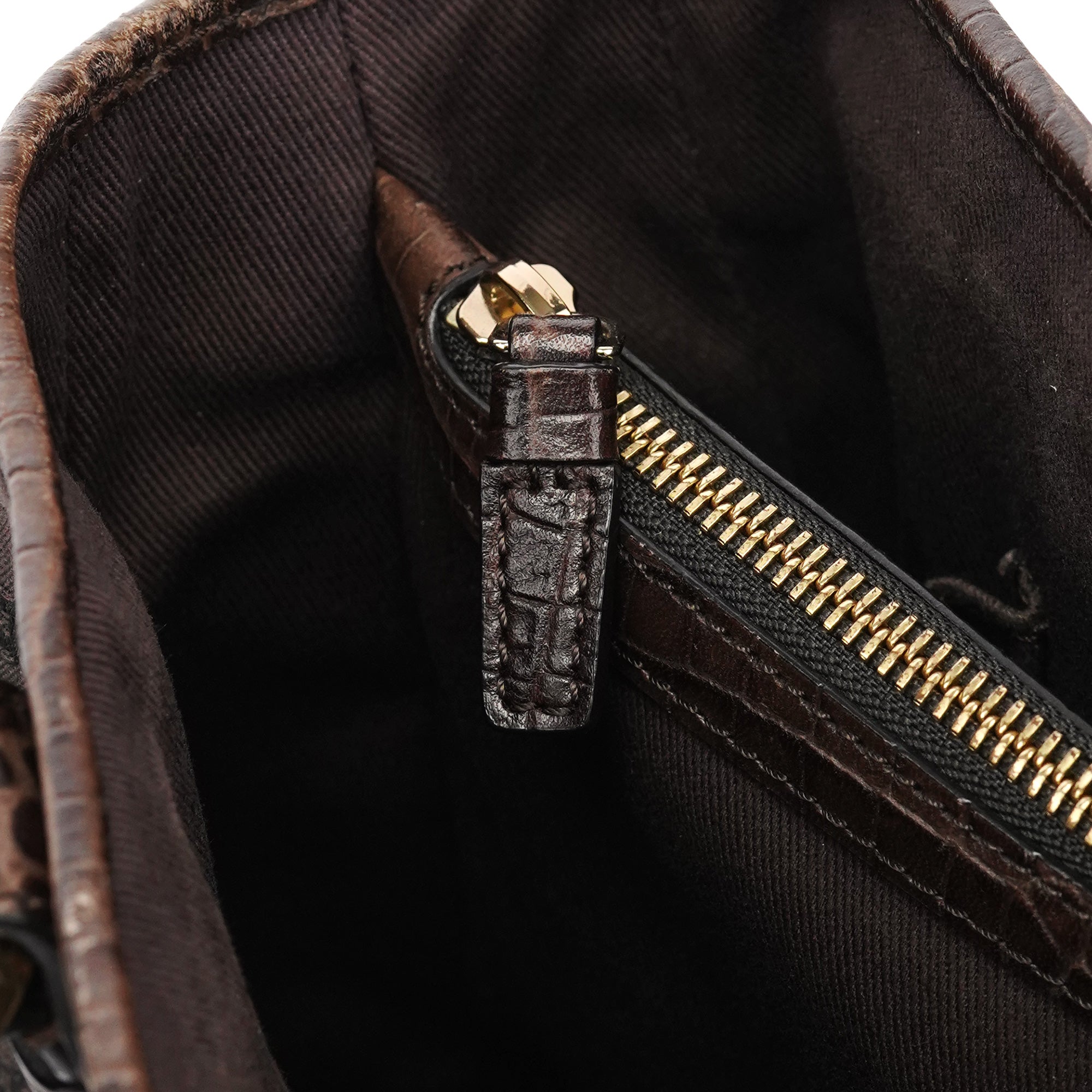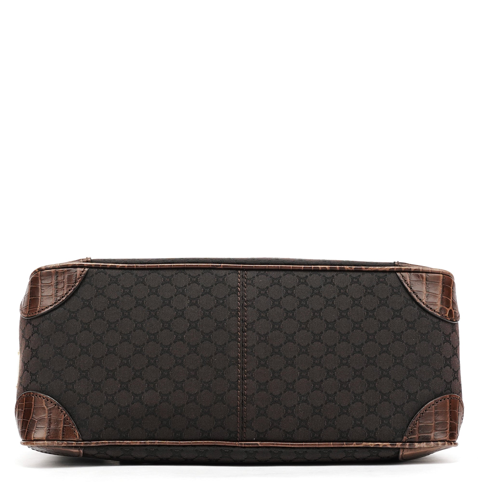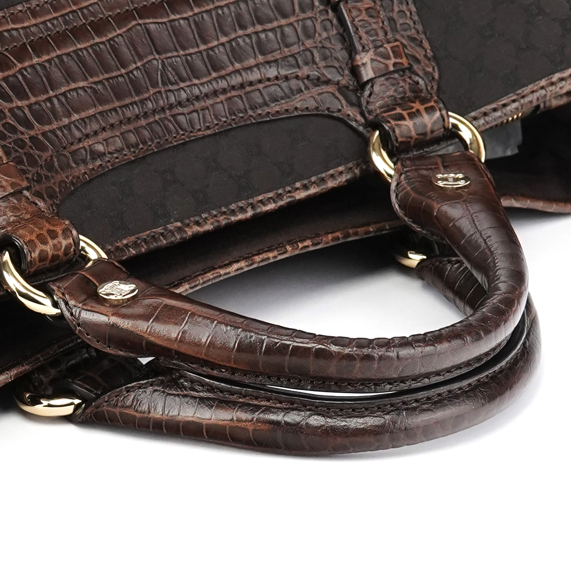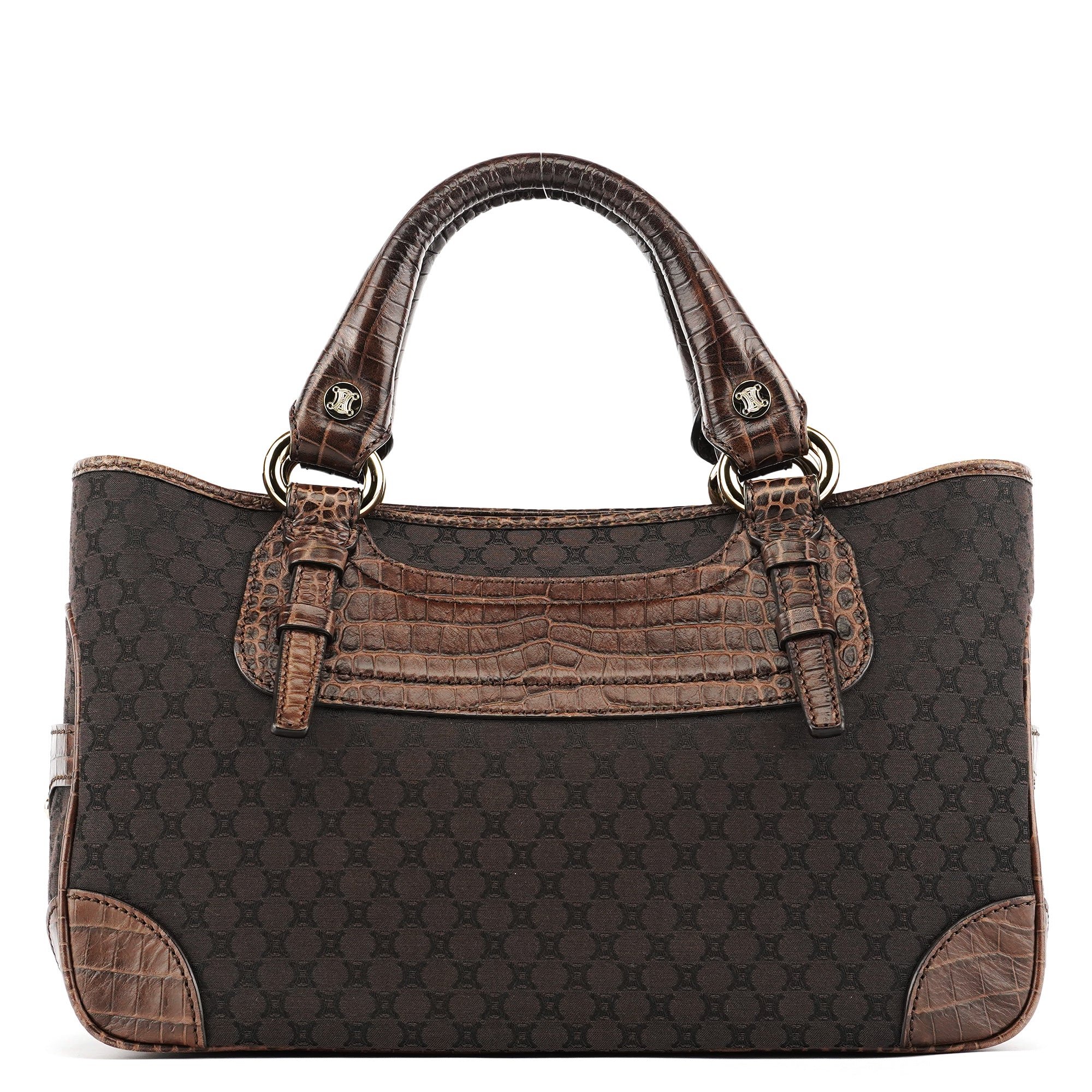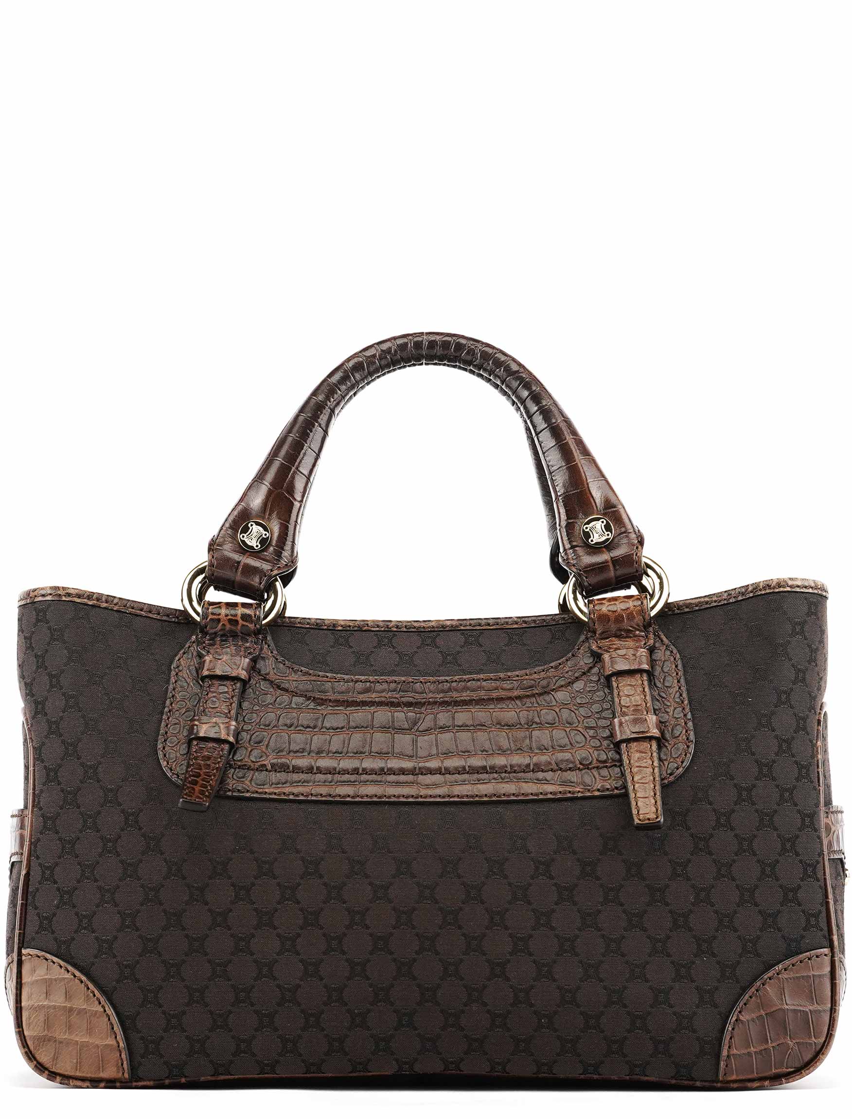 Designed in the early 2000s, this Céline Boogie bag is crafted in brown monogram canvas with croc-embossed leather trim and structured top handles. The interior features three compartments, including a central zip compartment, finished with a dark textile lining and gold-tone hardware.