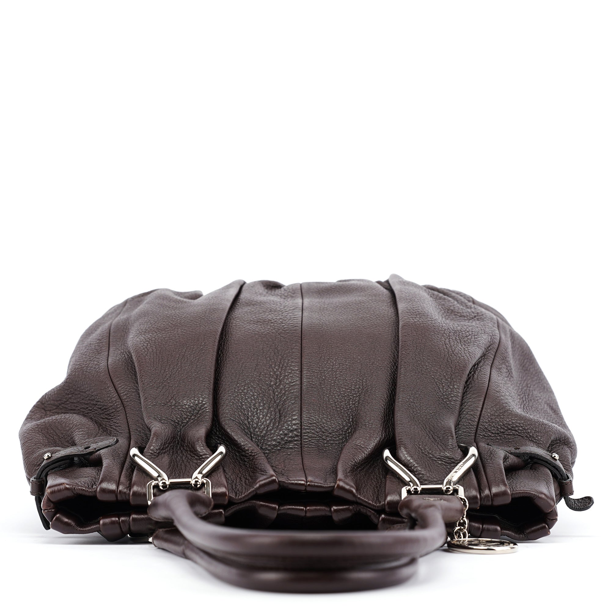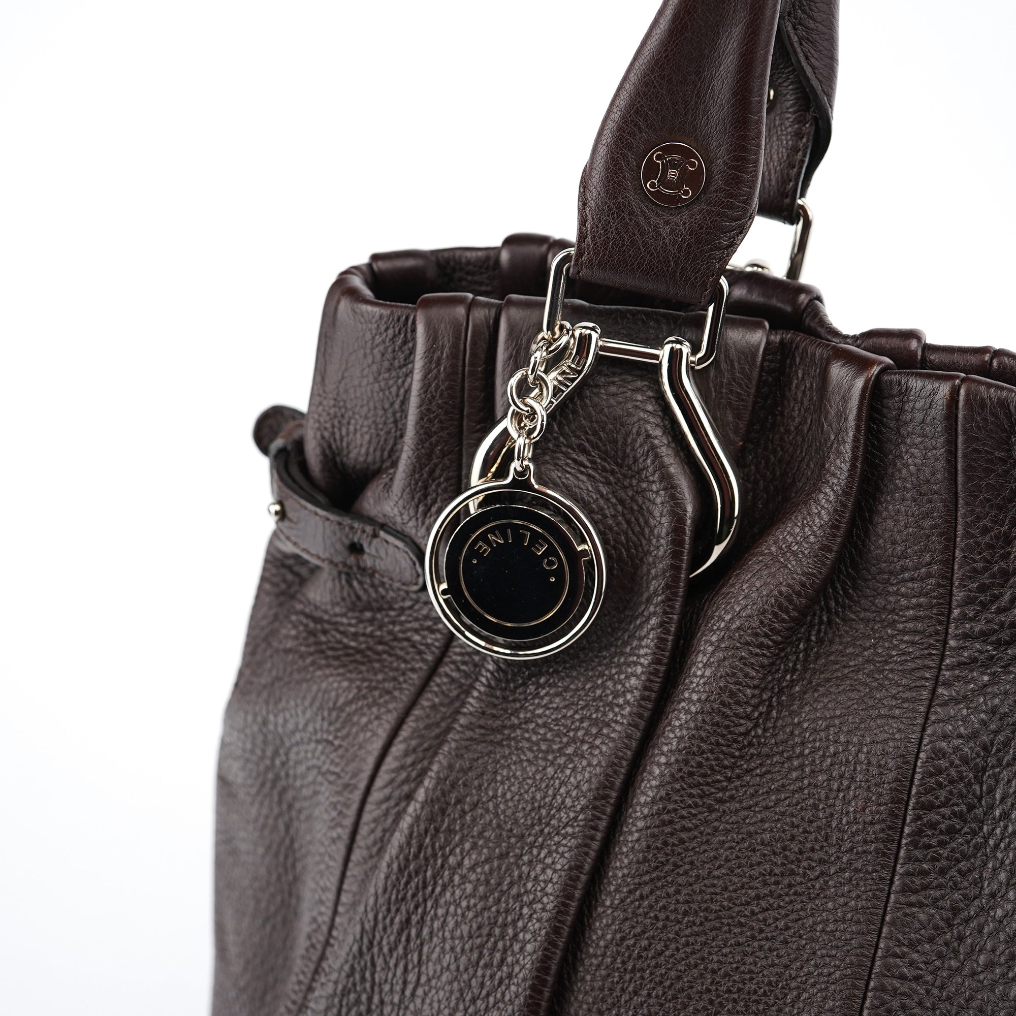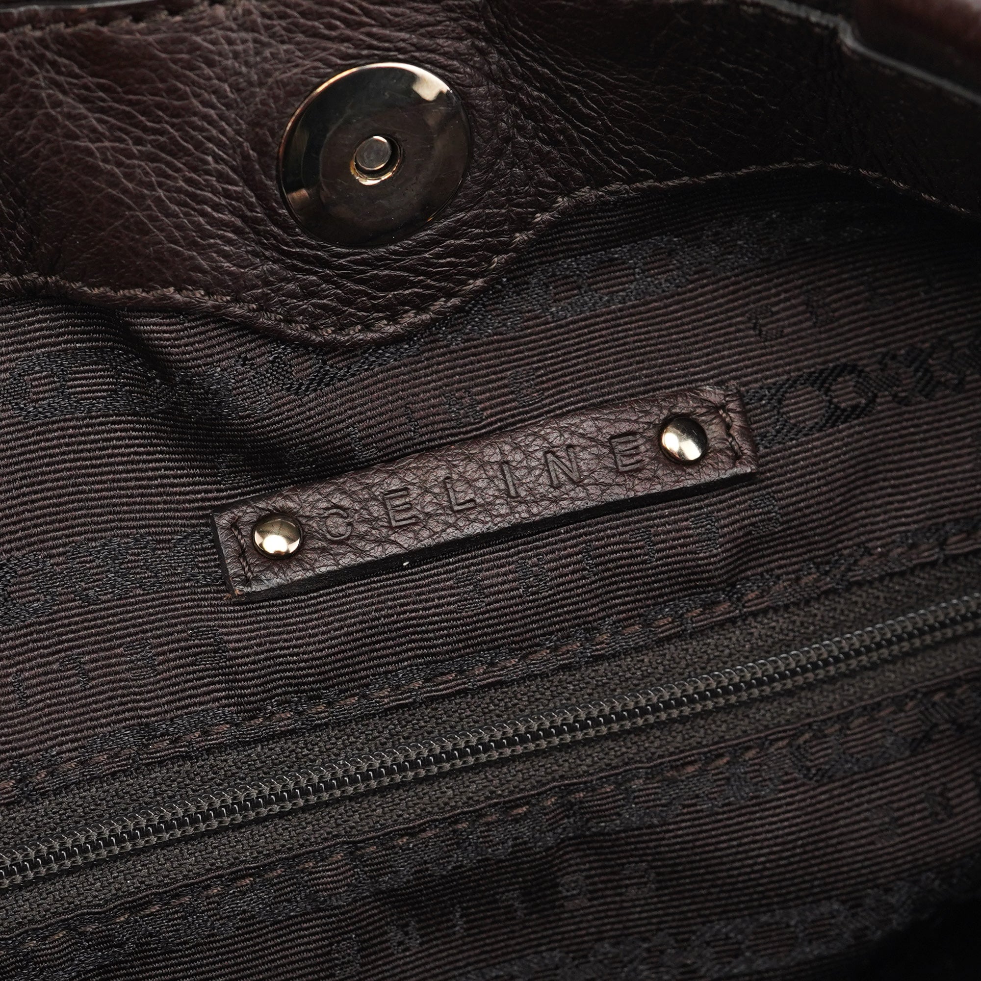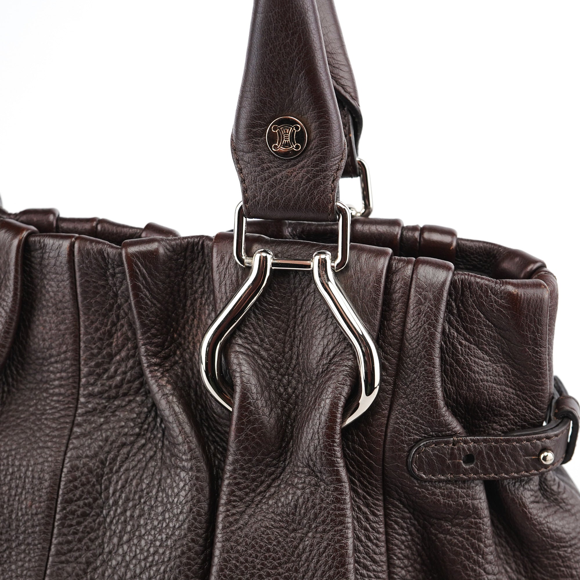 Designed in the early 2000's, this vintage Céline Pillow tote bag features brown leather with a gathered, pillow-like silhouette. The bag includes dual shoulder straps with decorative hardware detailing in silver tone, a drawstring-style gathered construction, and ring hardware accents. The interior is lined in satin including an interior zipper pocket.