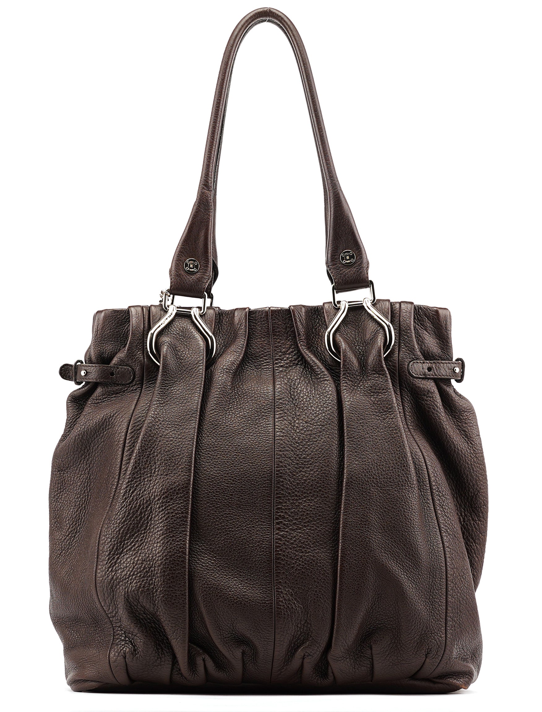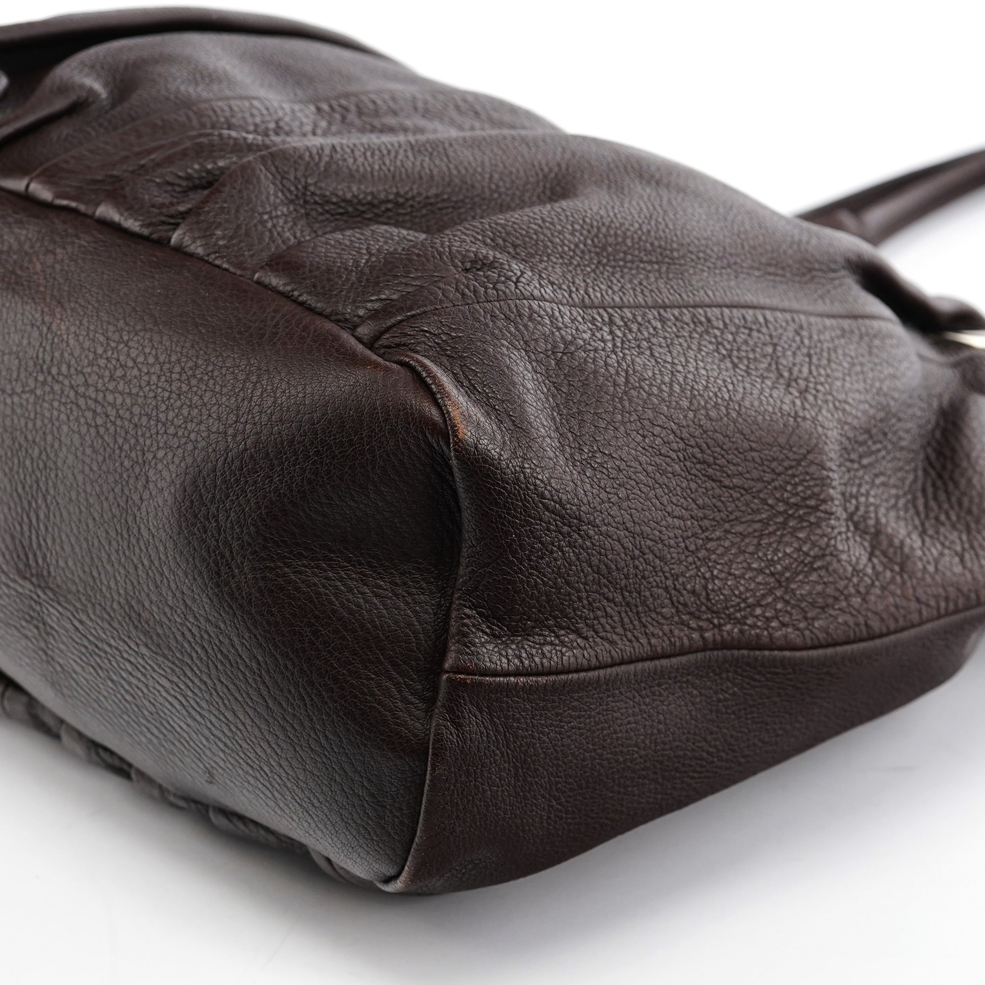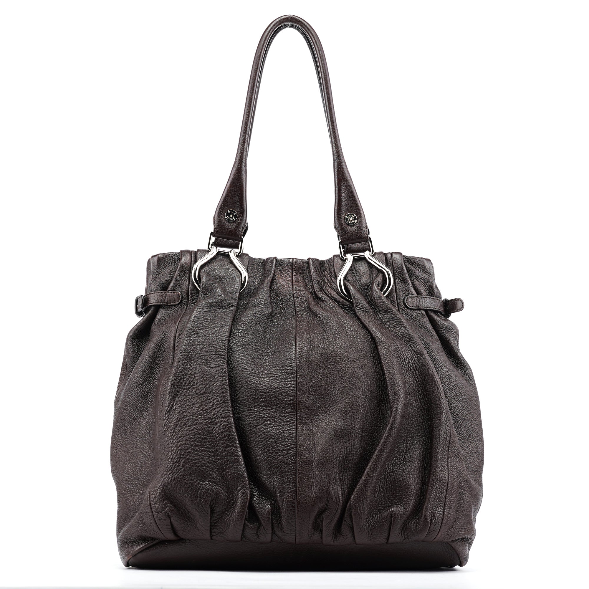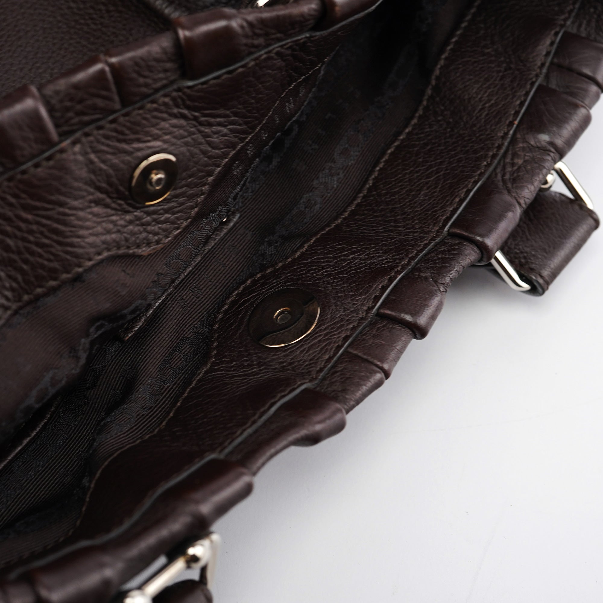 Designed in the early 2000's, this vintage Céline Pillow tote bag features brown leather with a gathered, pillow-like silhouette. The bag includes dual shoulder straps with decorative hardware detailing in silver tone, a drawstring-style gathered construction, and ring hardware accents. The interior is lined in satin including an interior zipper pocket.