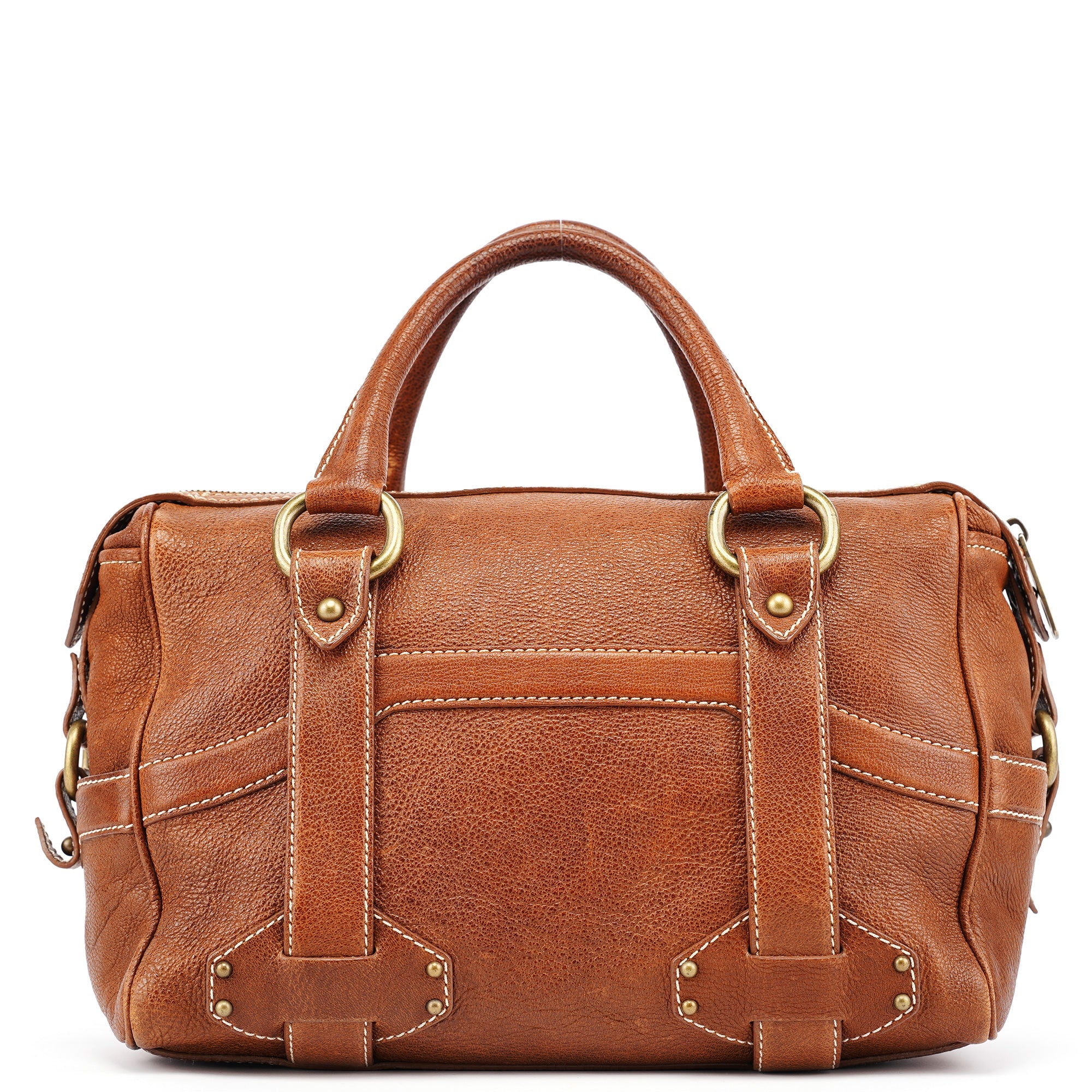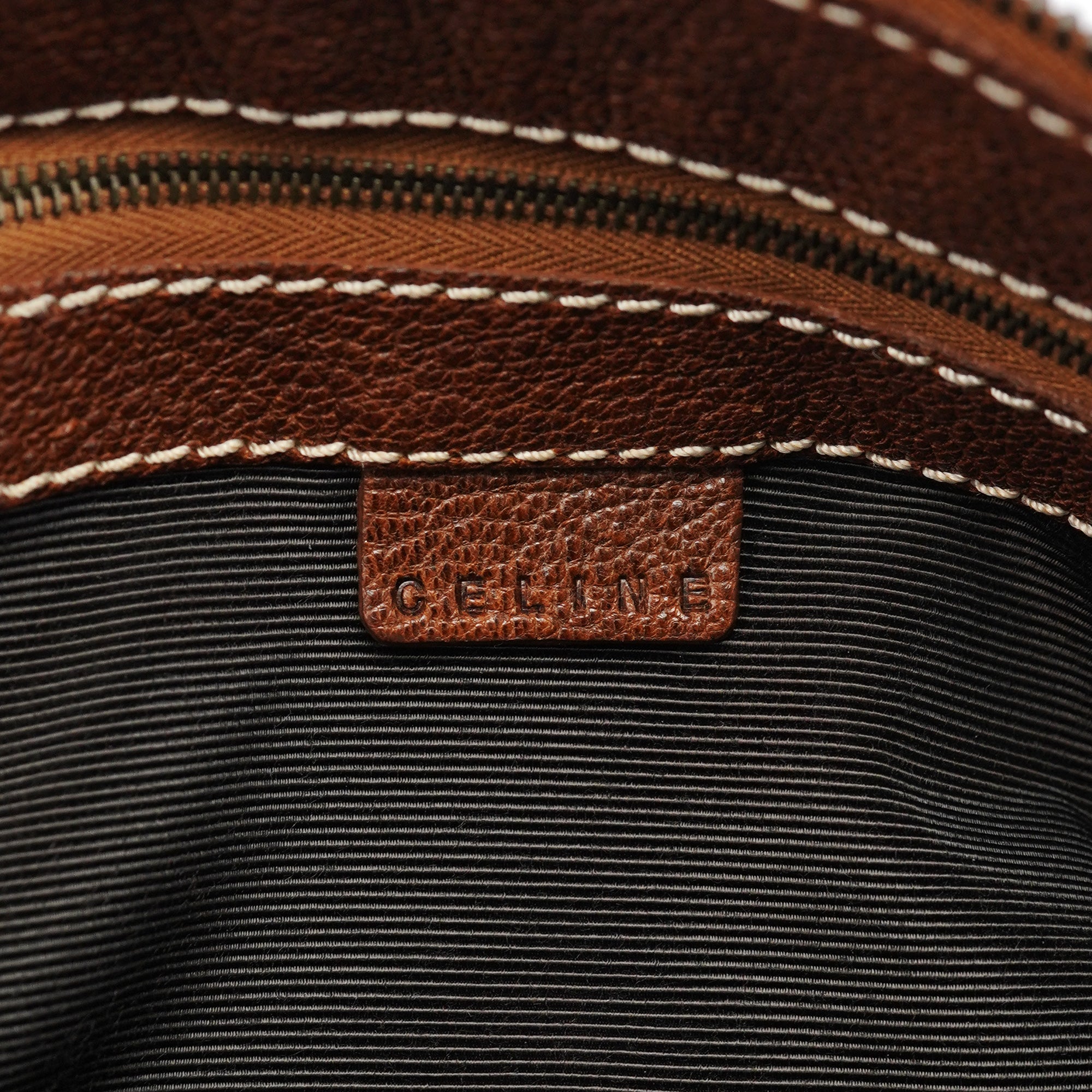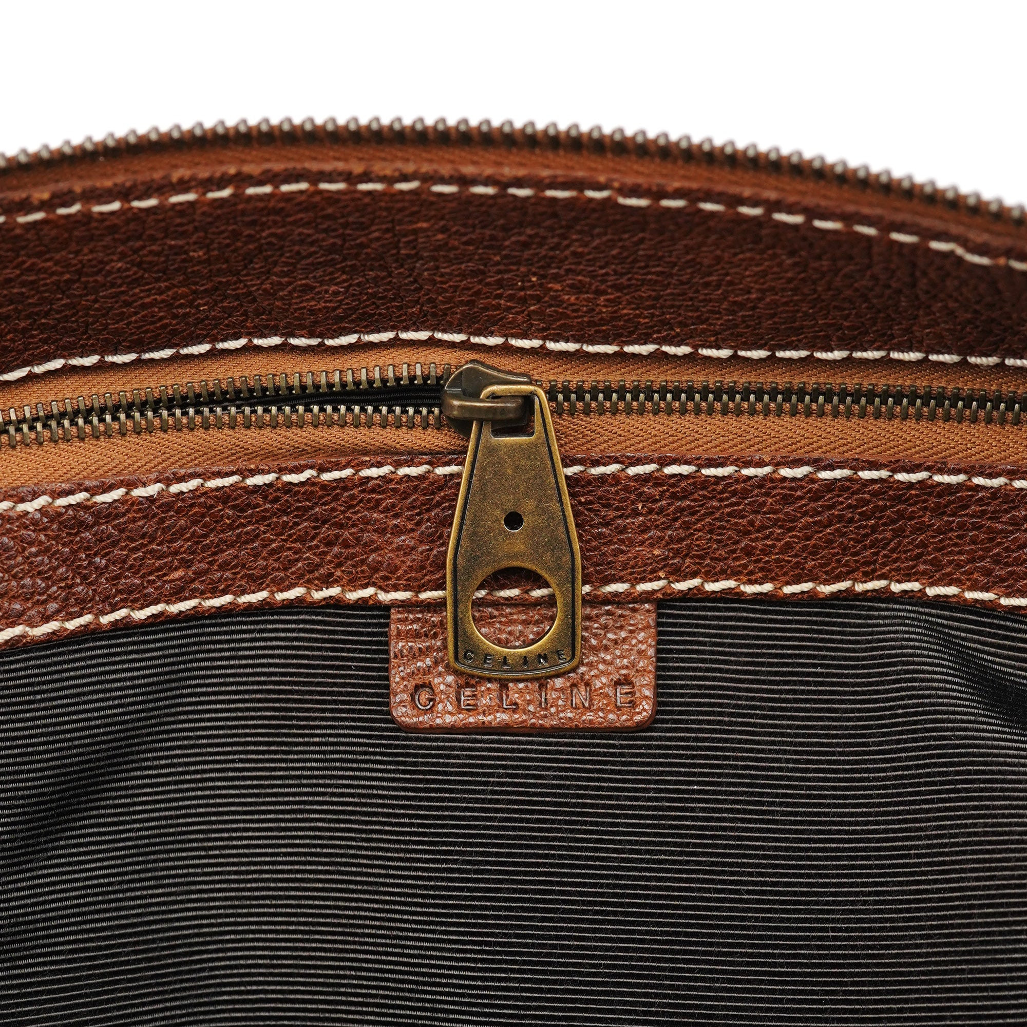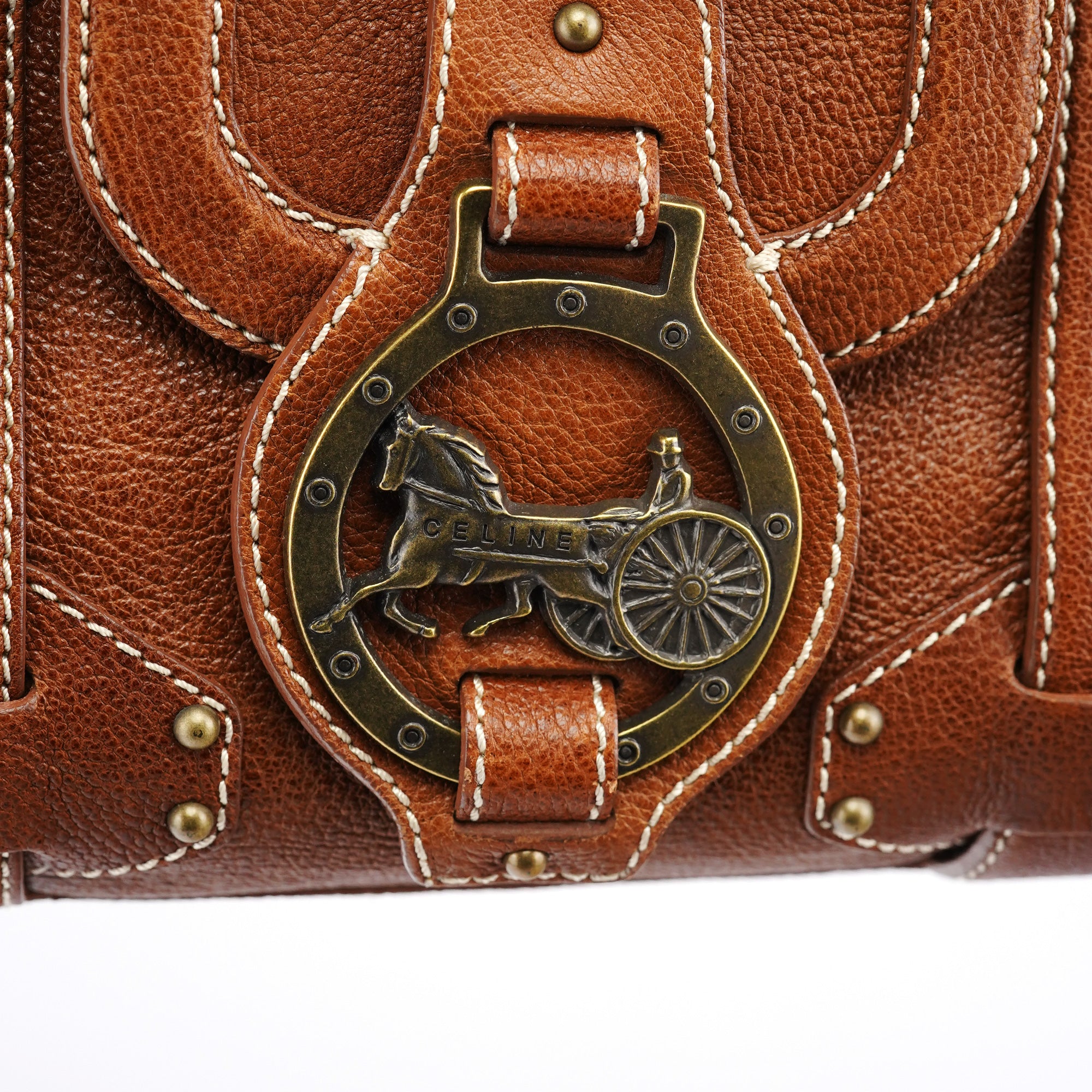 Designed in the early 2000s, this Céline Boston bag features camel brown leather with carriage-style Triomphe hardware that adds vintage charm. The structured silhouette includes dual handles, decorative stitching details, and a flap closure with the signature circular clasp. The interior is lined in fabric with pockets for organization.