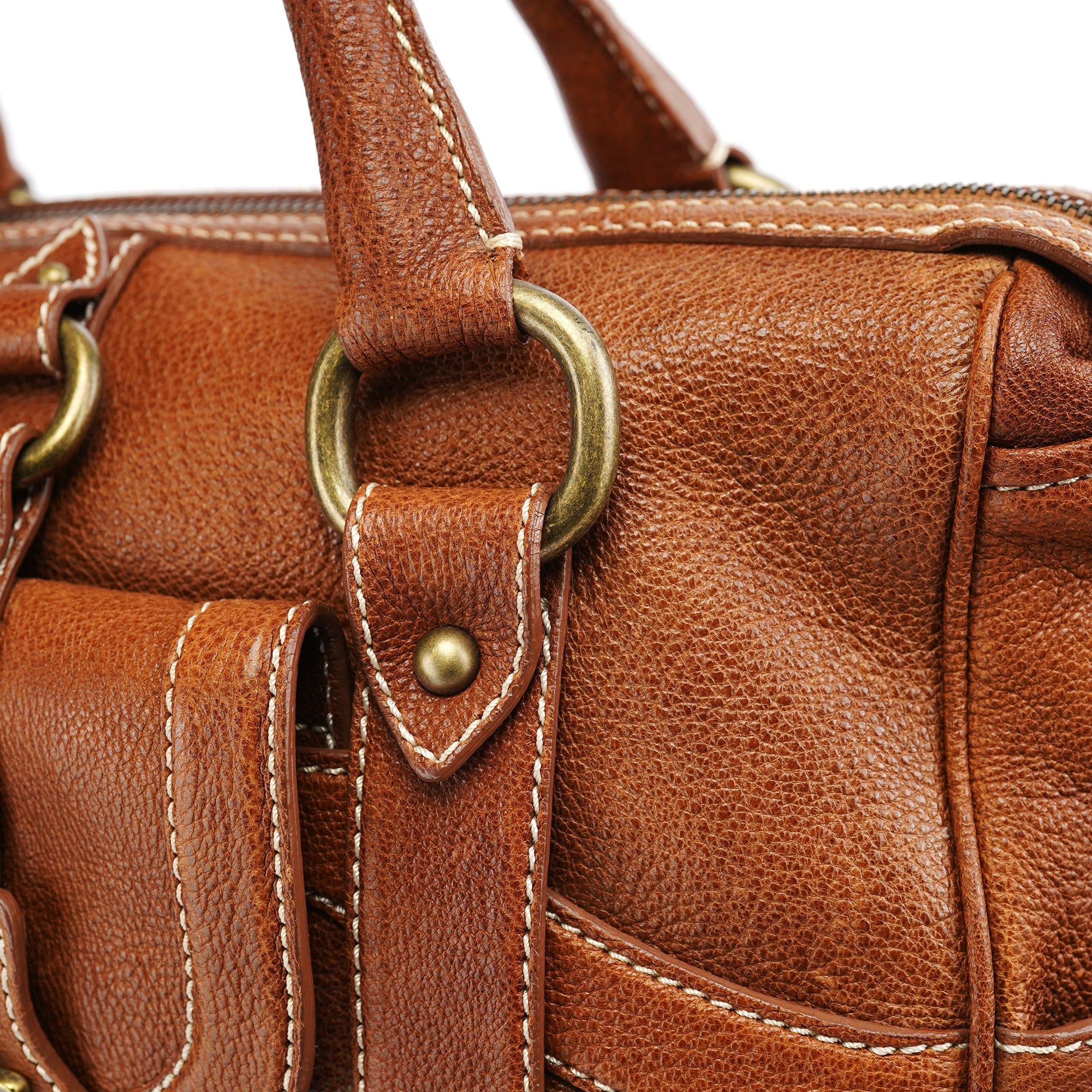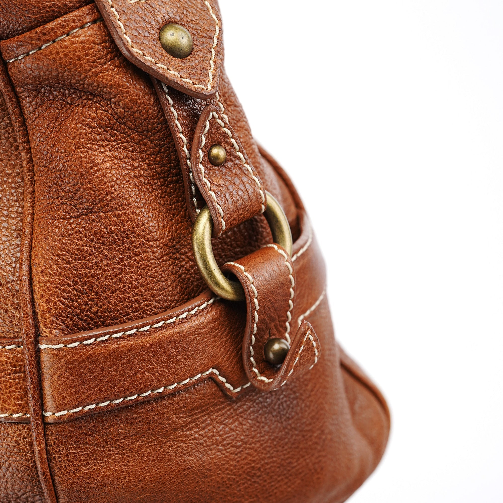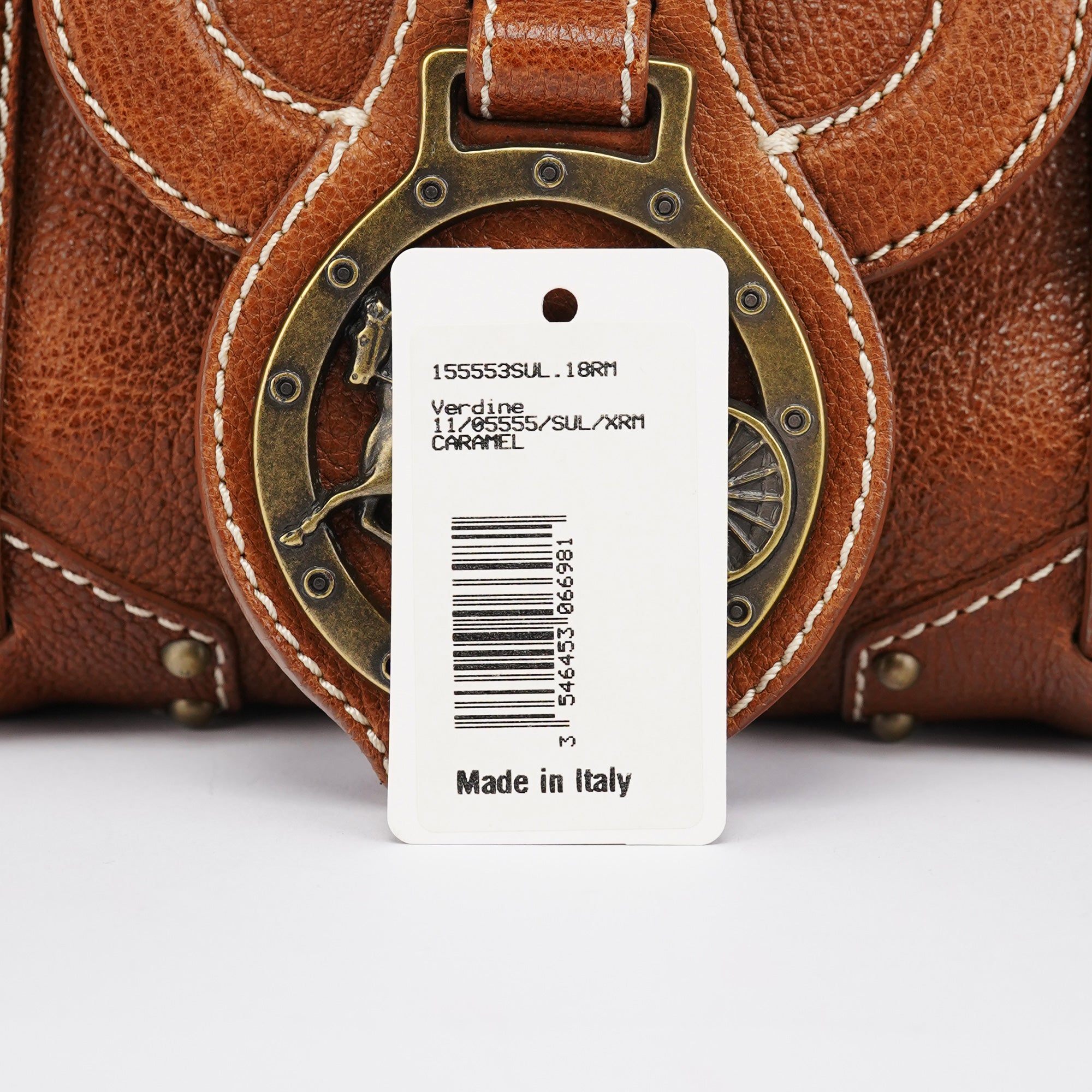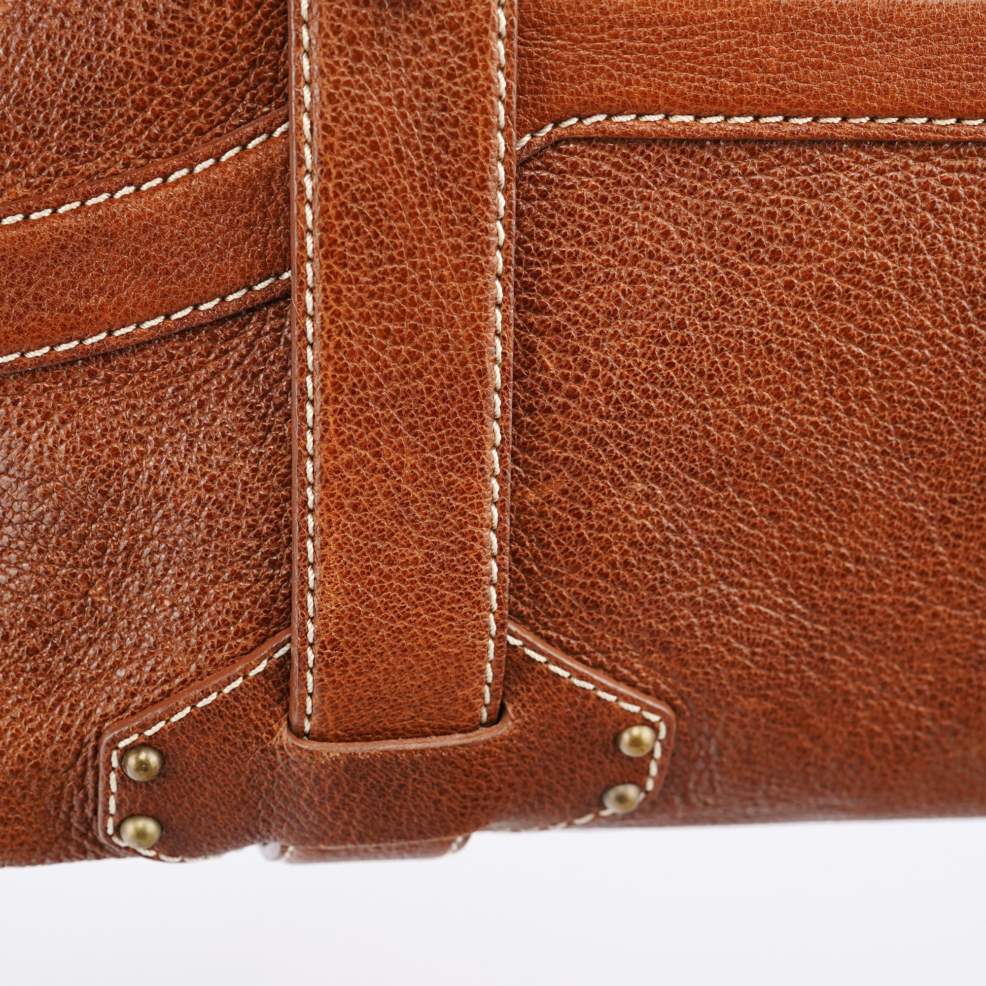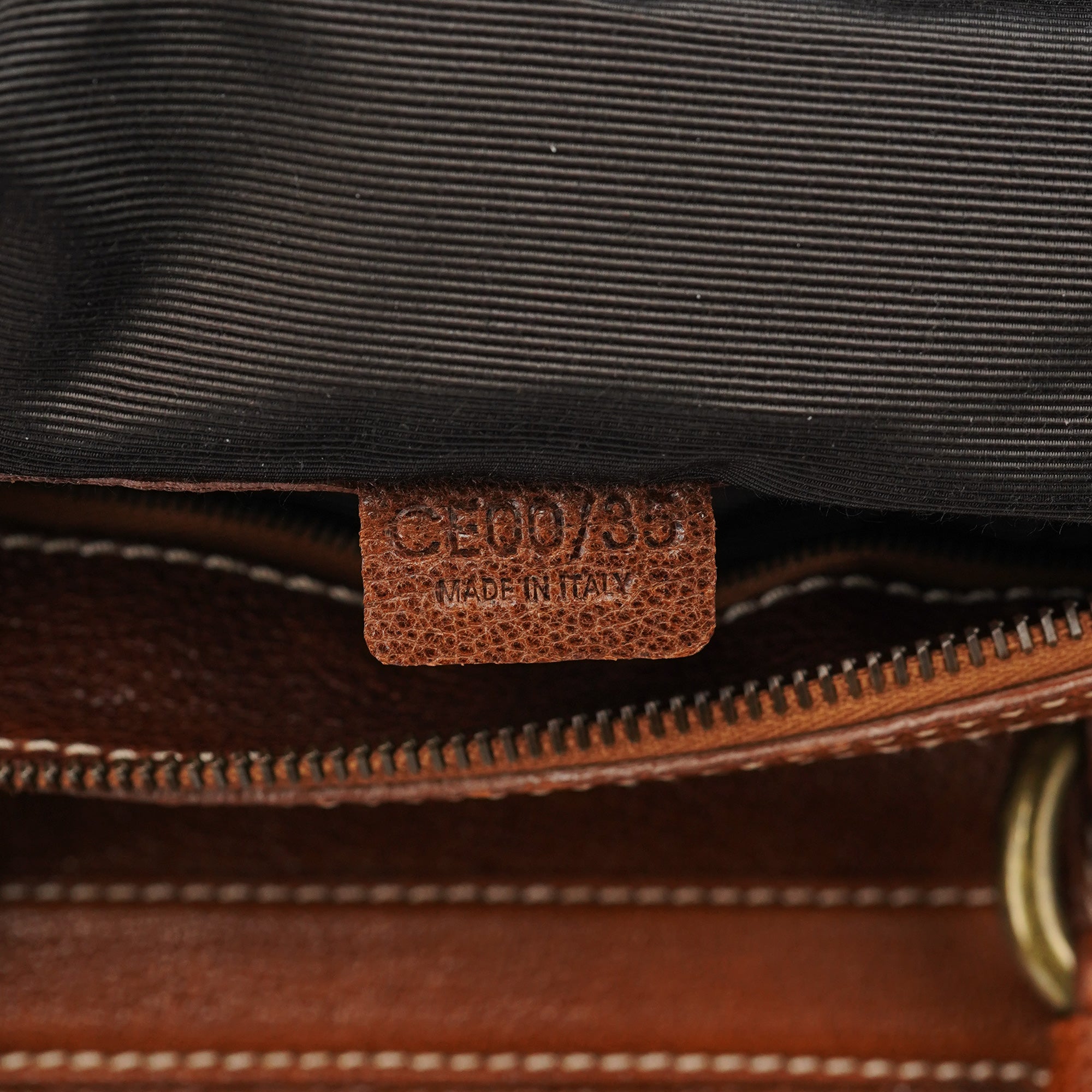 Designed in the early 2000s, this Céline Boston bag features camel brown leather with carriage-style Triomphe hardware that adds vintage charm. The structured silhouette includes dual handles, decorative stitching details, and a flap closure with the signature circular clasp. The interior is lined in fabric with pockets for organization.