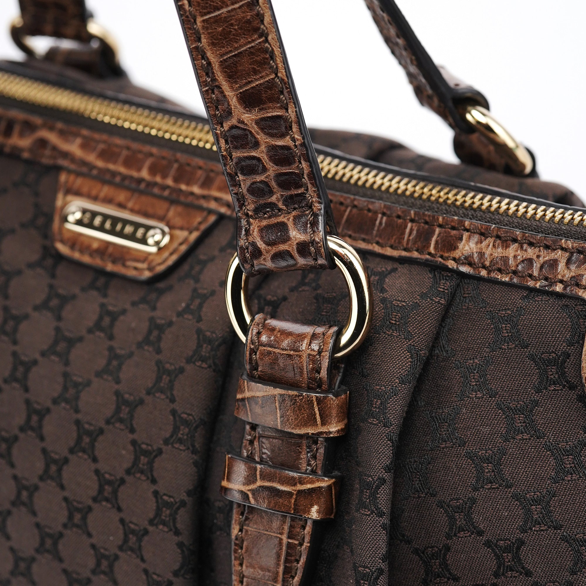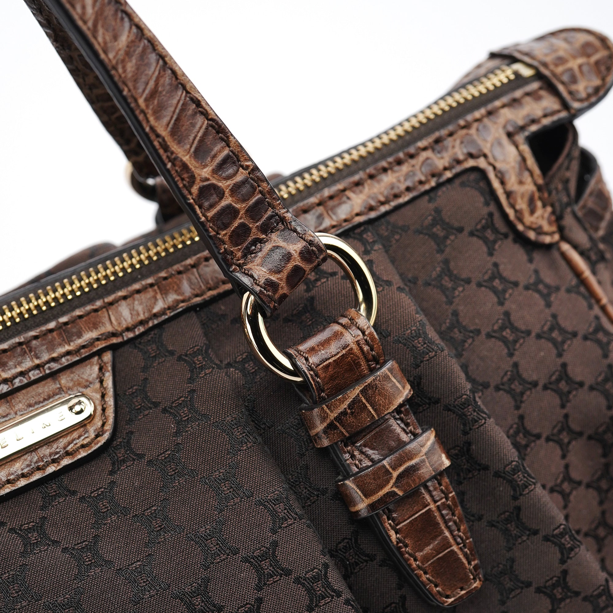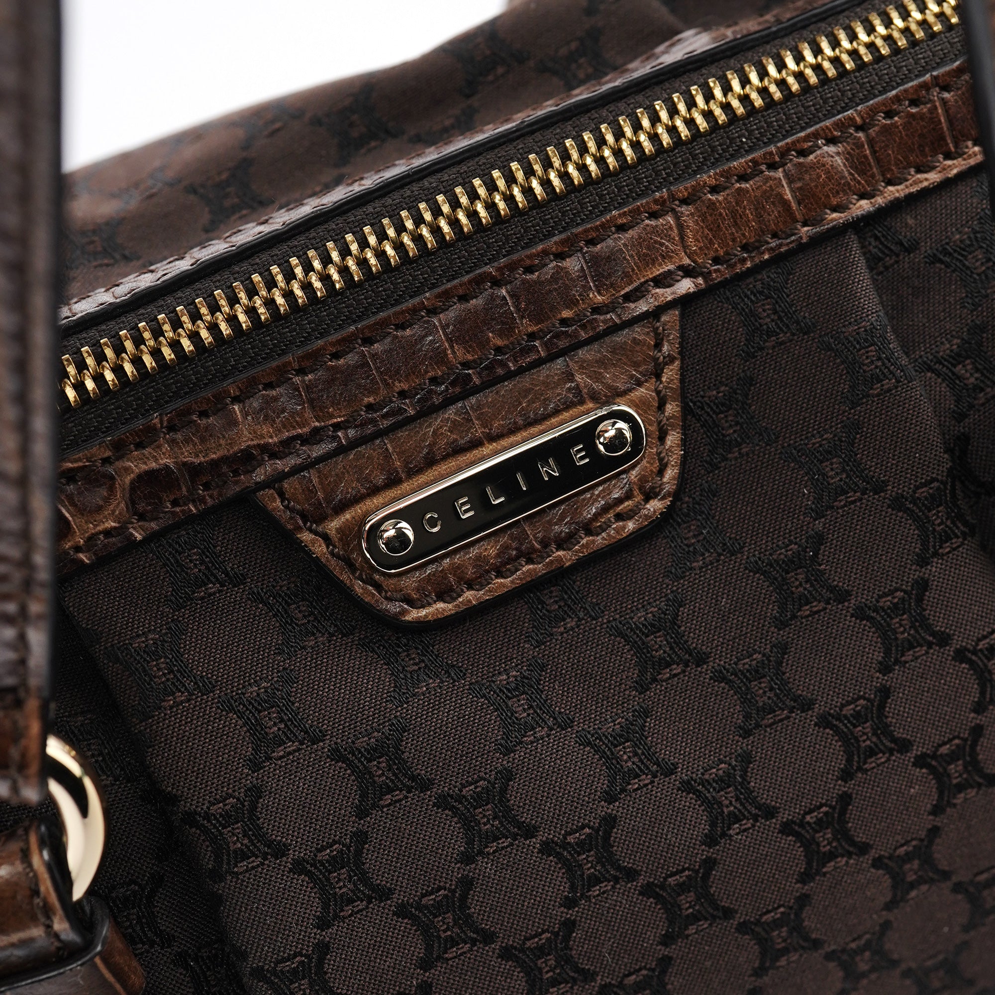 Designed in the early 2000s, this vintage Céline Macadam tote bag features the house's iconic triomphe monogram canvas in rich brown tones with embossed crocodile-textured leather trim. The spacious silhouette is secured with a top zip closure and gold-tone hardware, offering both shoulder and hand-carry versatility with its dual leather straps. The interior provides ample room for daily essentials.