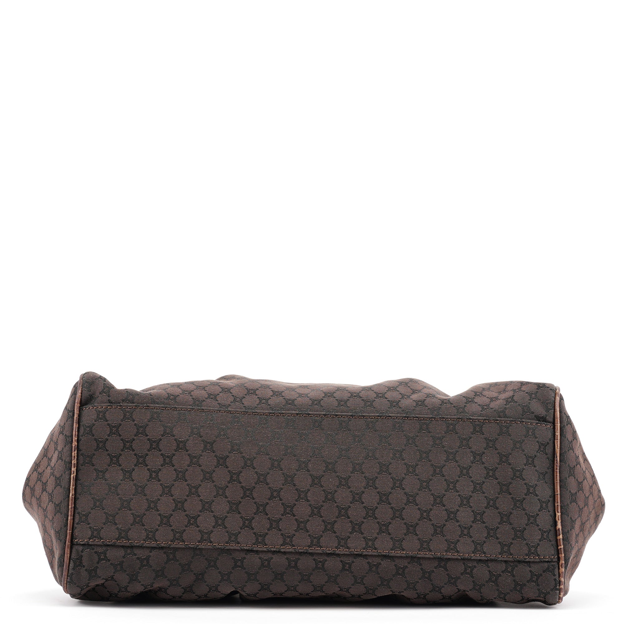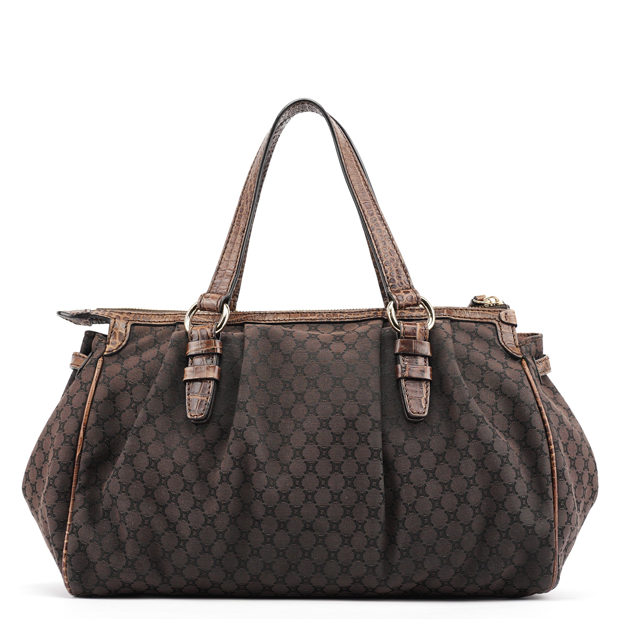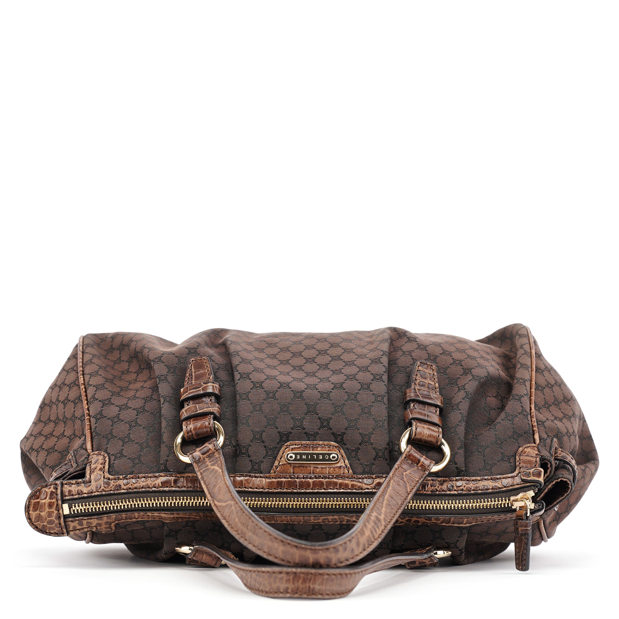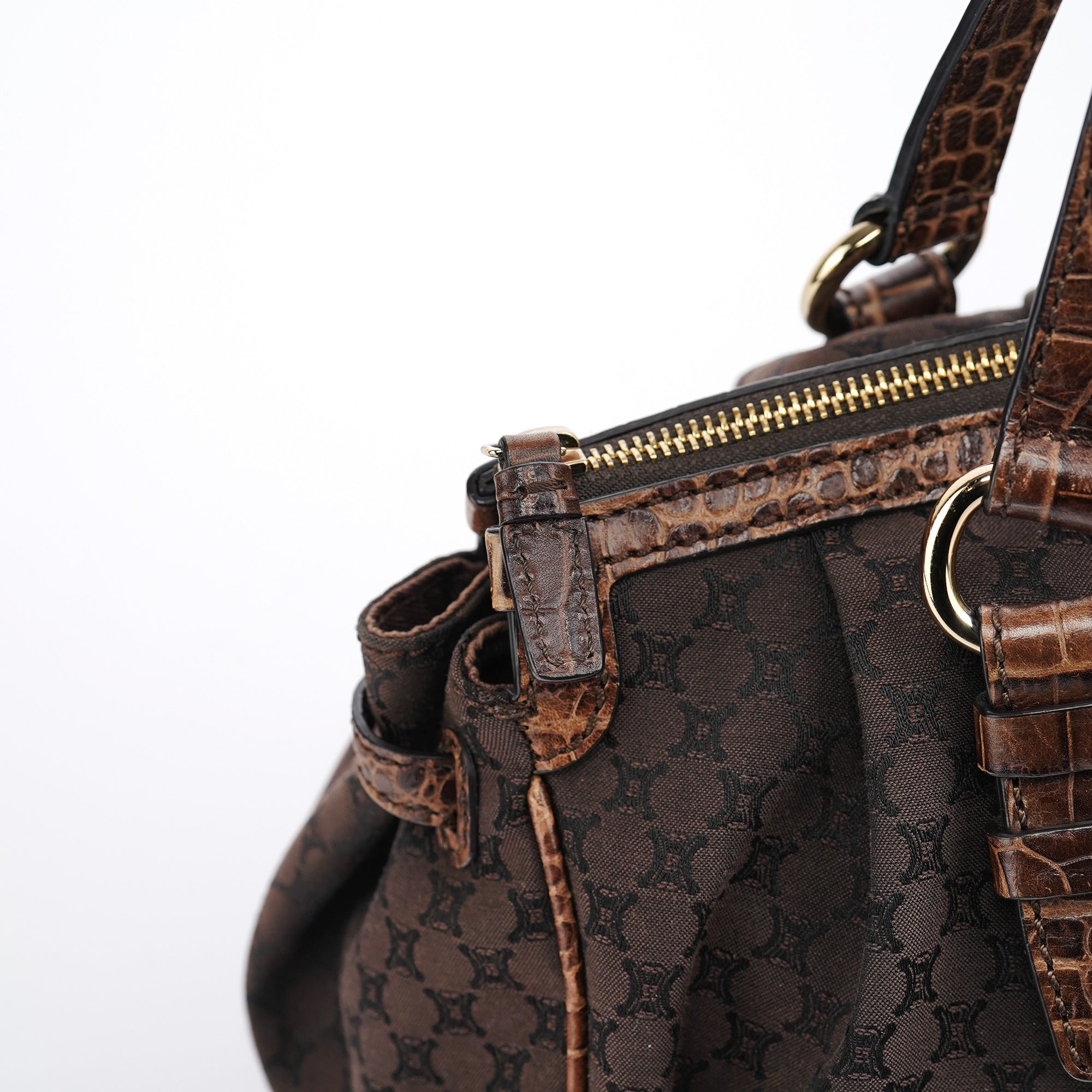 Designed in the early 2000s, this vintage Céline Macadam tote bag features the house's iconic triomphe monogram canvas in rich brown tones with embossed crocodile-textured leather trim. The spacious silhouette is secured with a top zip closure and gold-tone hardware, offering both shoulder and hand-carry versatility with its dual leather straps. The interior provides ample room for daily essentials.