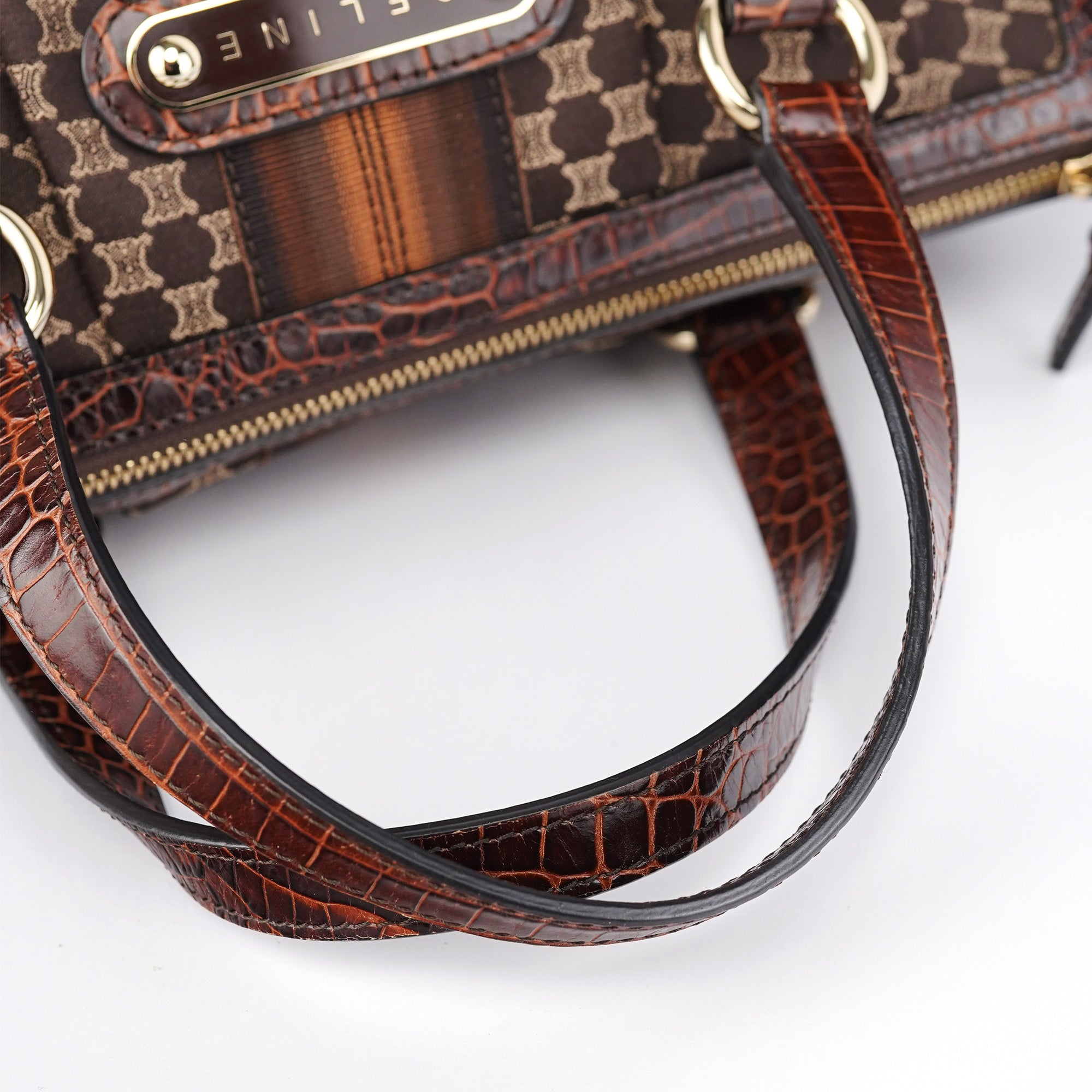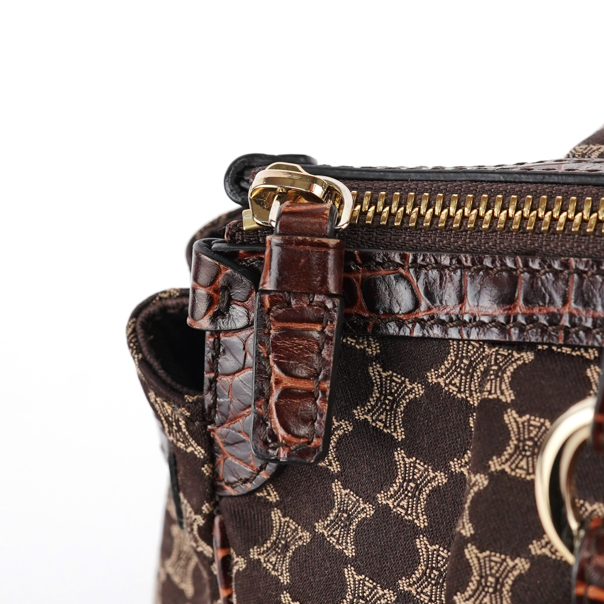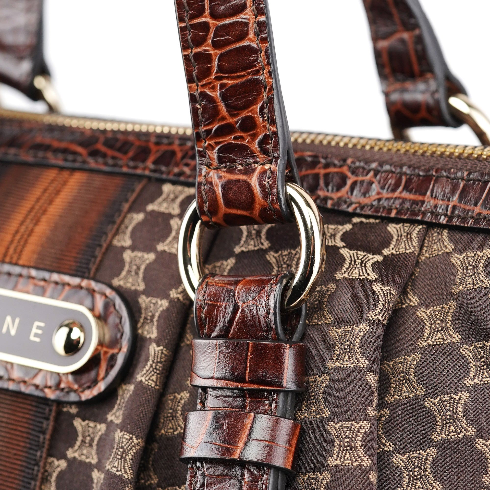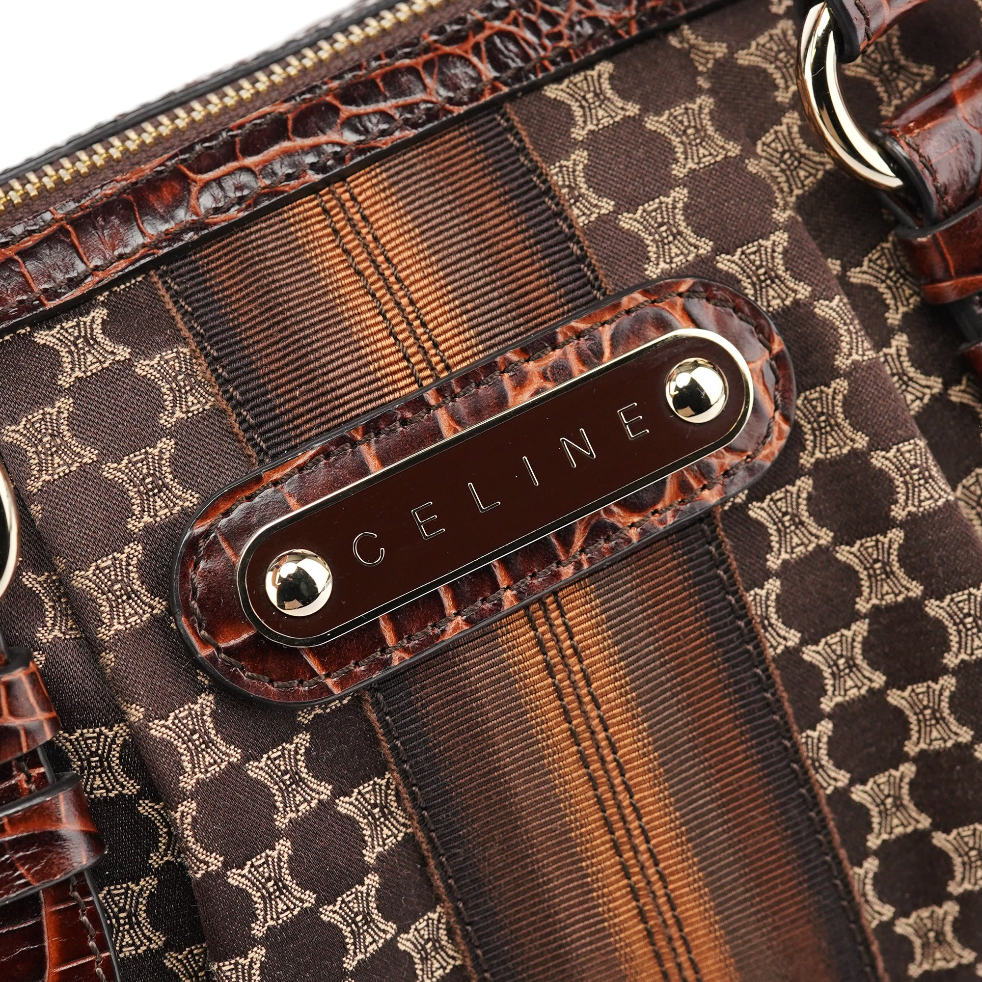 Designed in the early 2000s, this Céline Triumph tote bag is crafted from classic Triomphe monogram with brown croc-embossed leather. The spacious silhouette features dual rolled top handles, a refined zip-top closure, and opens to a canvas-lined interior equipped with a single zip pocket.