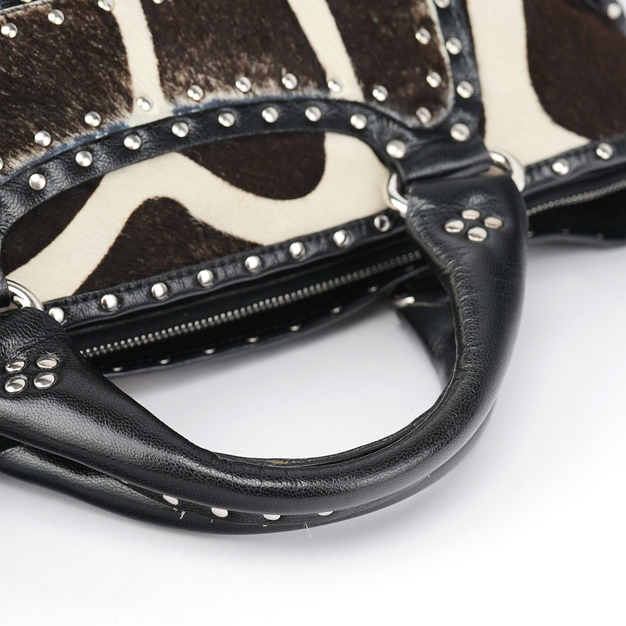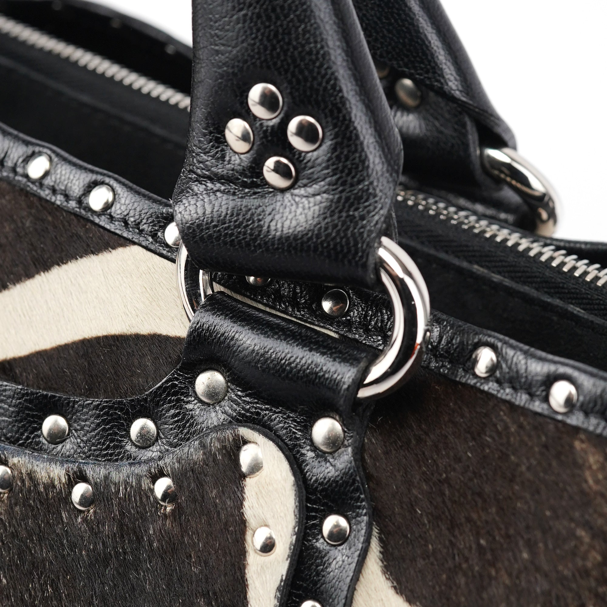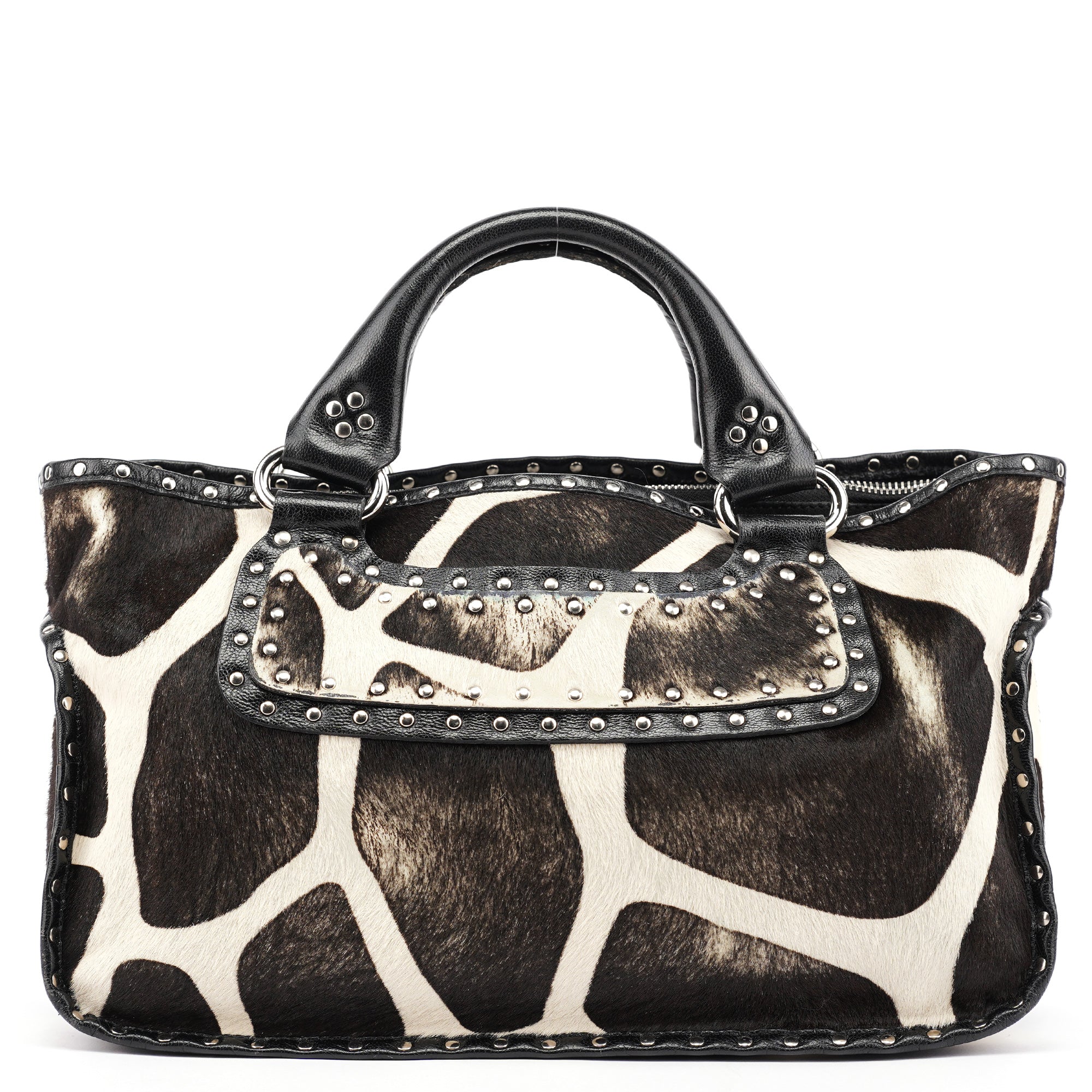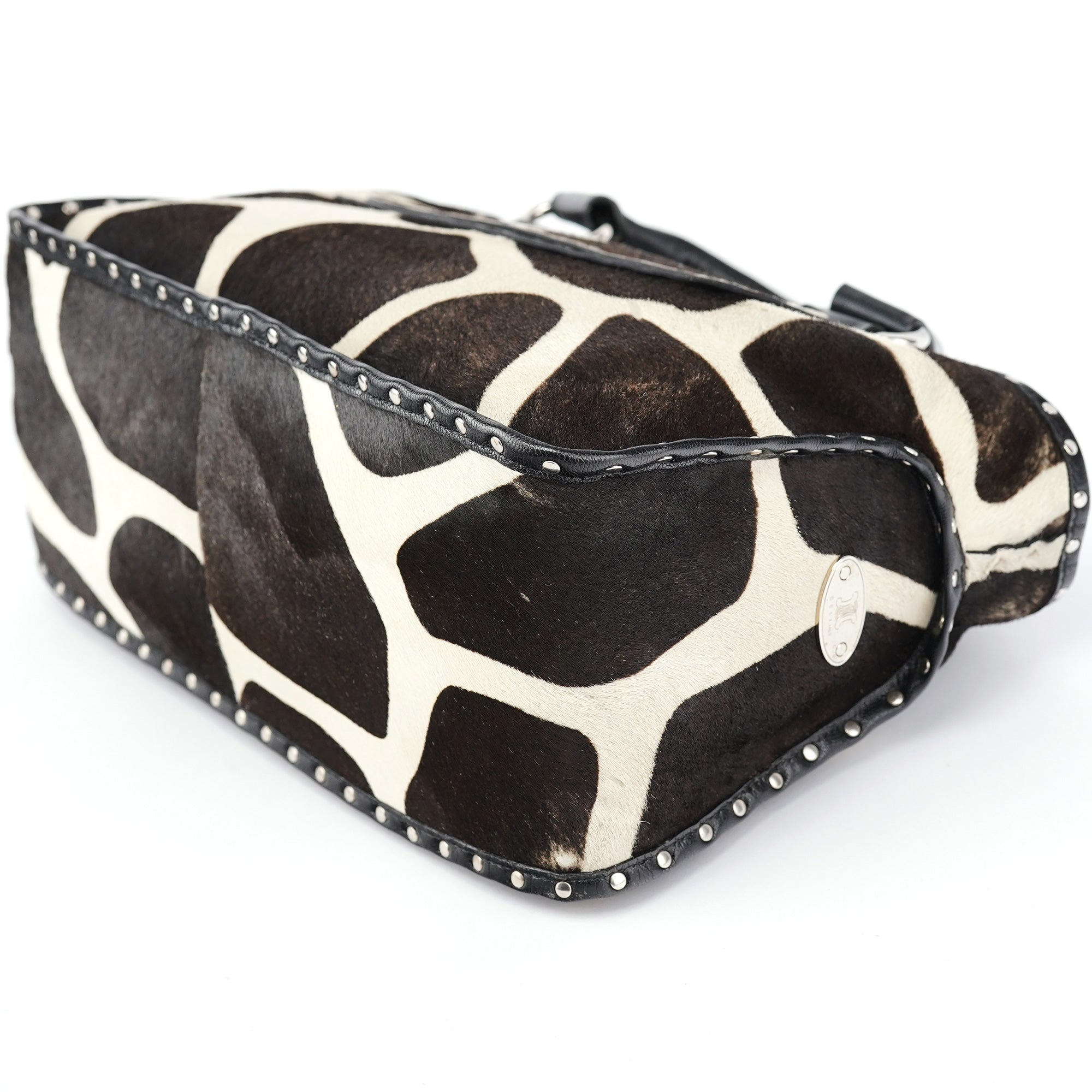 Designed in the early 2000s, this Celine Boogie tote bag is crafted in black and white calf hair with black leather trim and silver-tone studs. The structured silhouette features rolled top handles, a snap-tab frame, and a spacious canvas-lined interior with a central zipper compartment and two slip pockets.