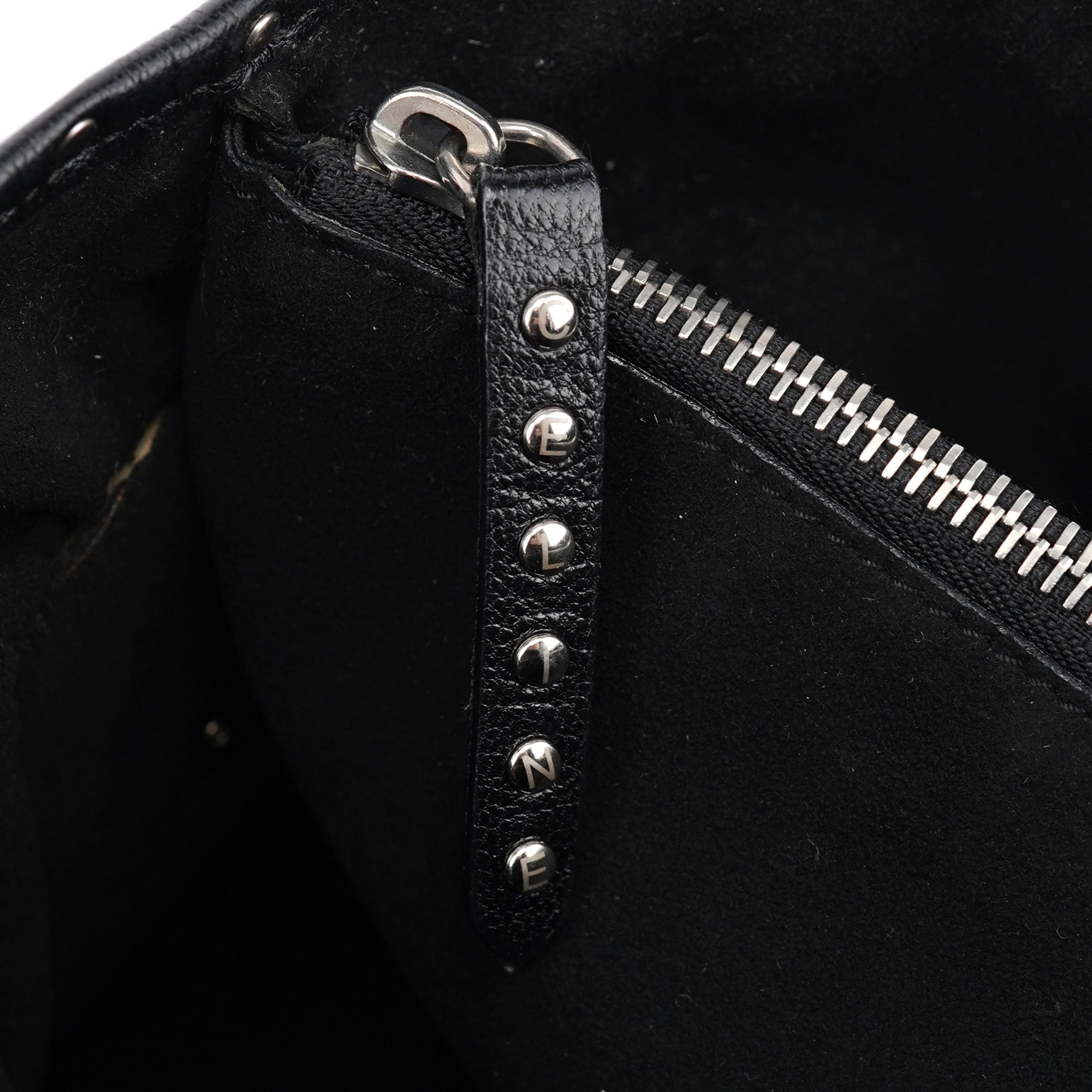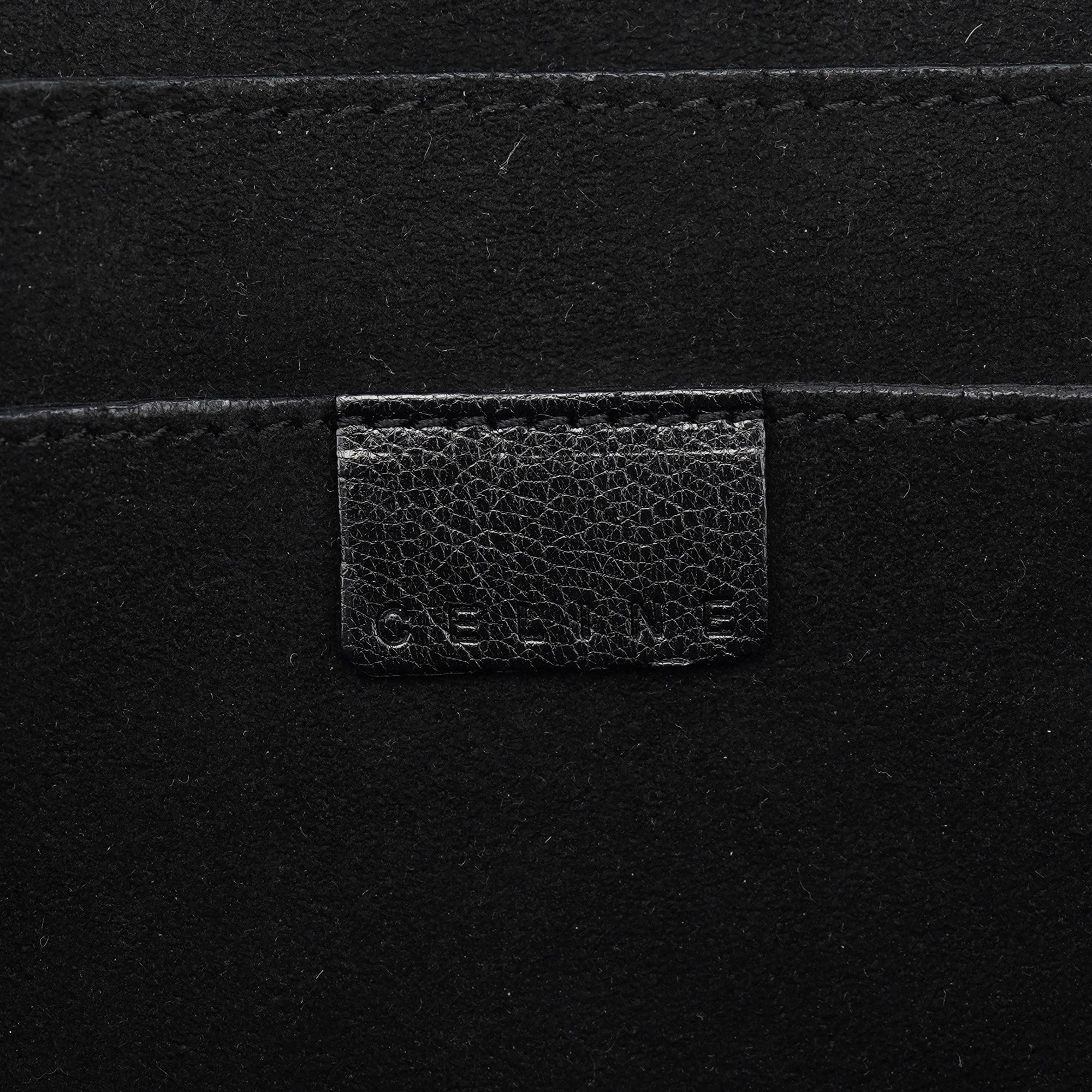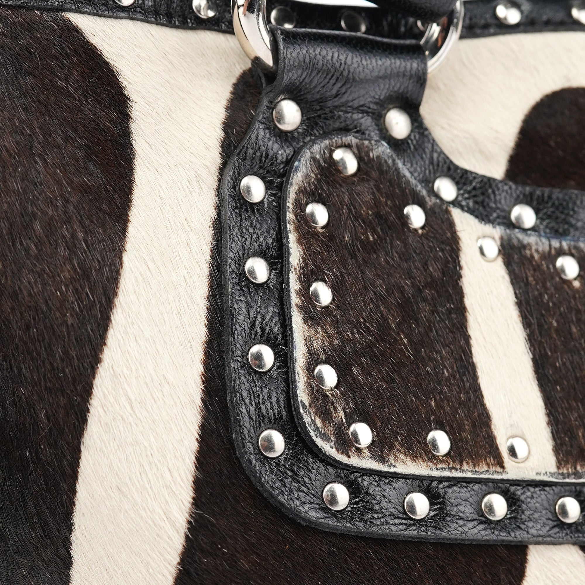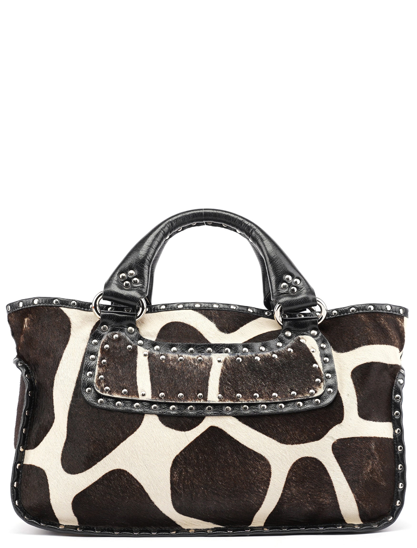 Designed in the early 2000s, this Celine Boogie tote bag is crafted in black and white calf hair with black leather trim and silver-tone studs. The structured silhouette features rolled top handles, a snap-tab frame, and a spacious canvas-lined interior with a central zipper compartment and two slip pockets.