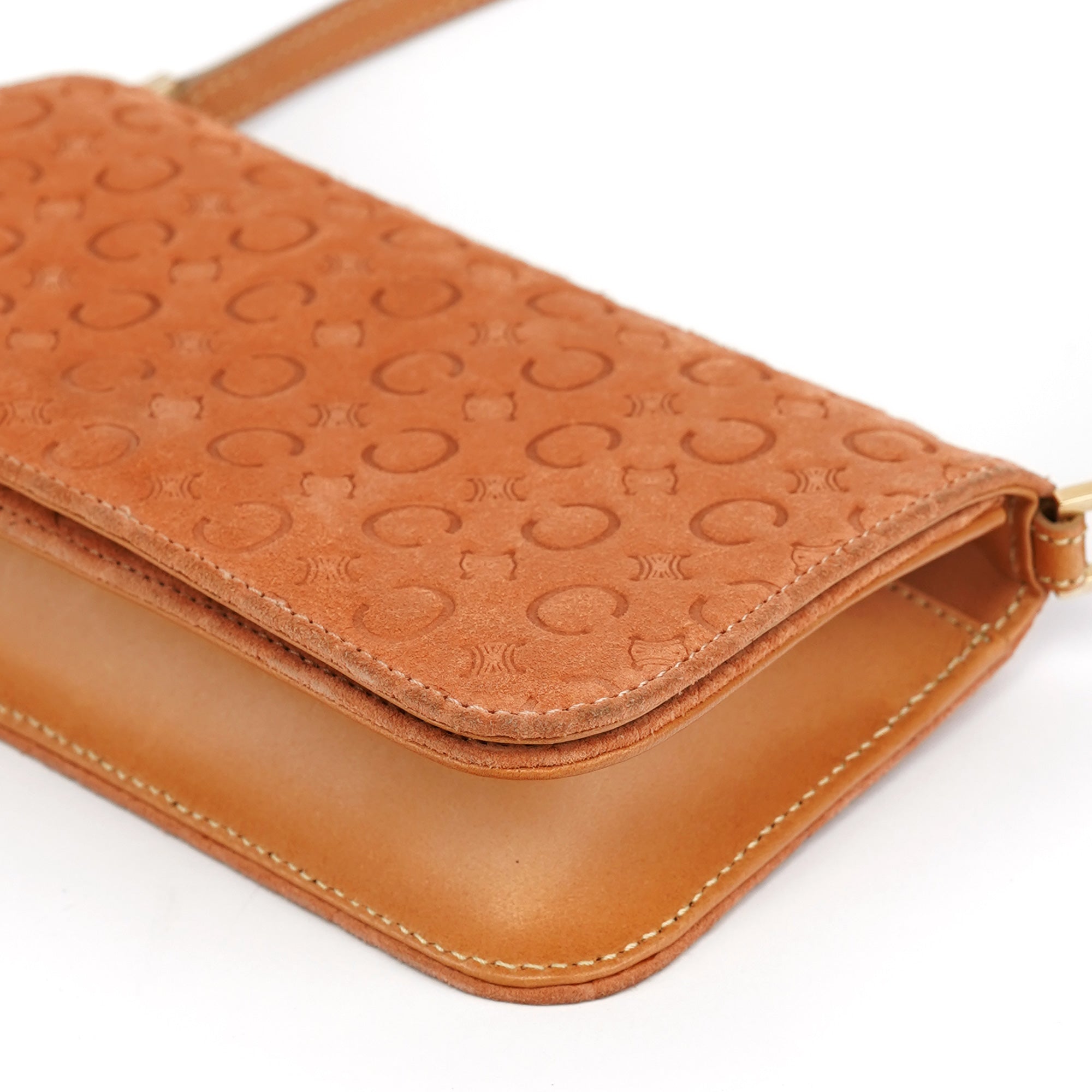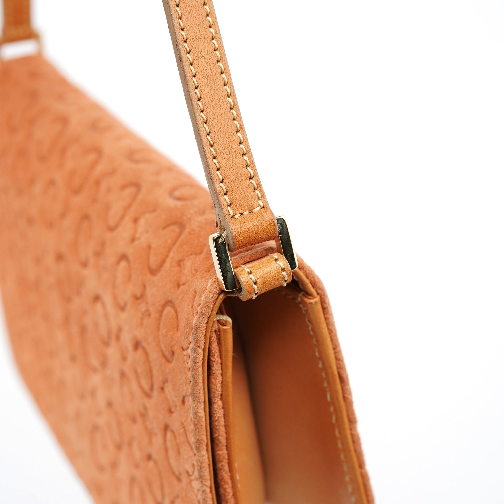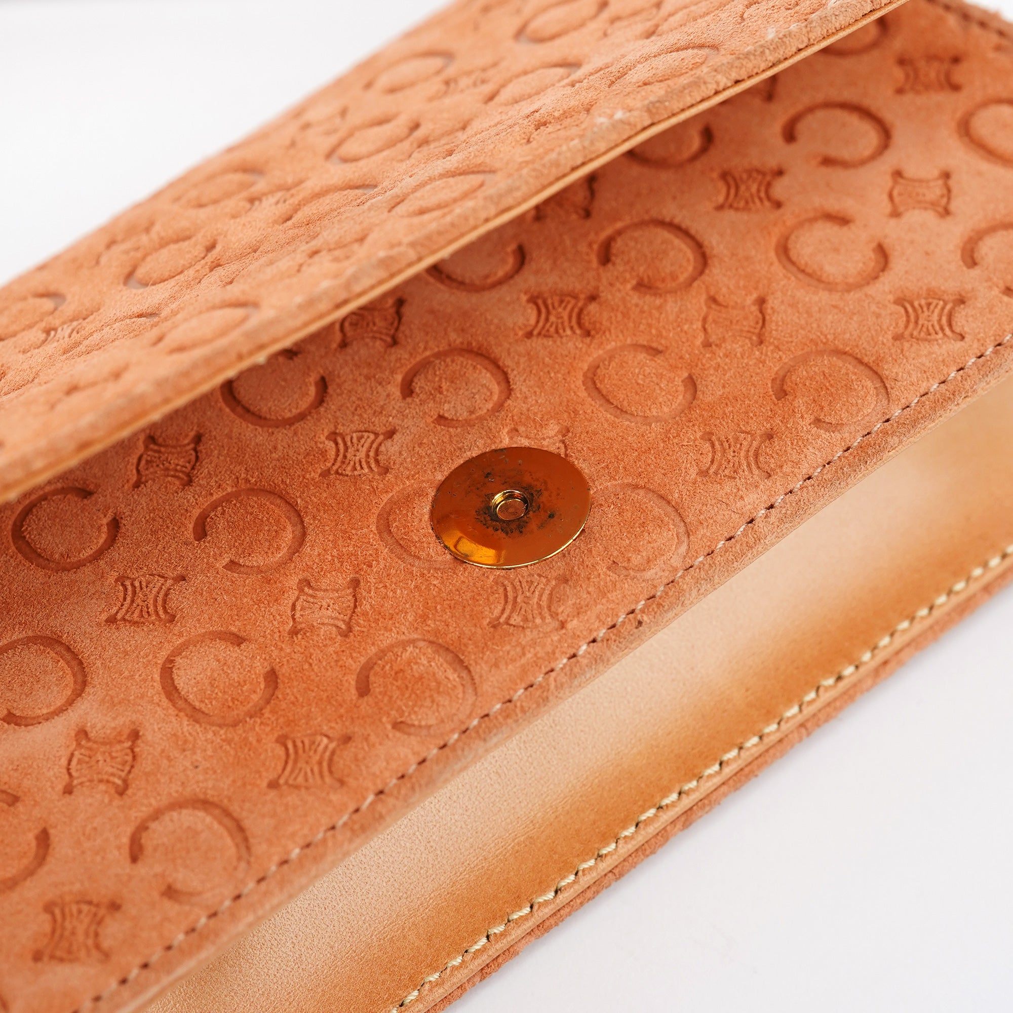 Designed in the early 2000's, this vintage Céline Macadam shoulder bag features orange suede embossed with the signature Macadam C pattern and tan leather trim along the edges. The bag has a single shoulder strap and a magnetic flap closure. The interior is lined in satin and includes a slip pocket.