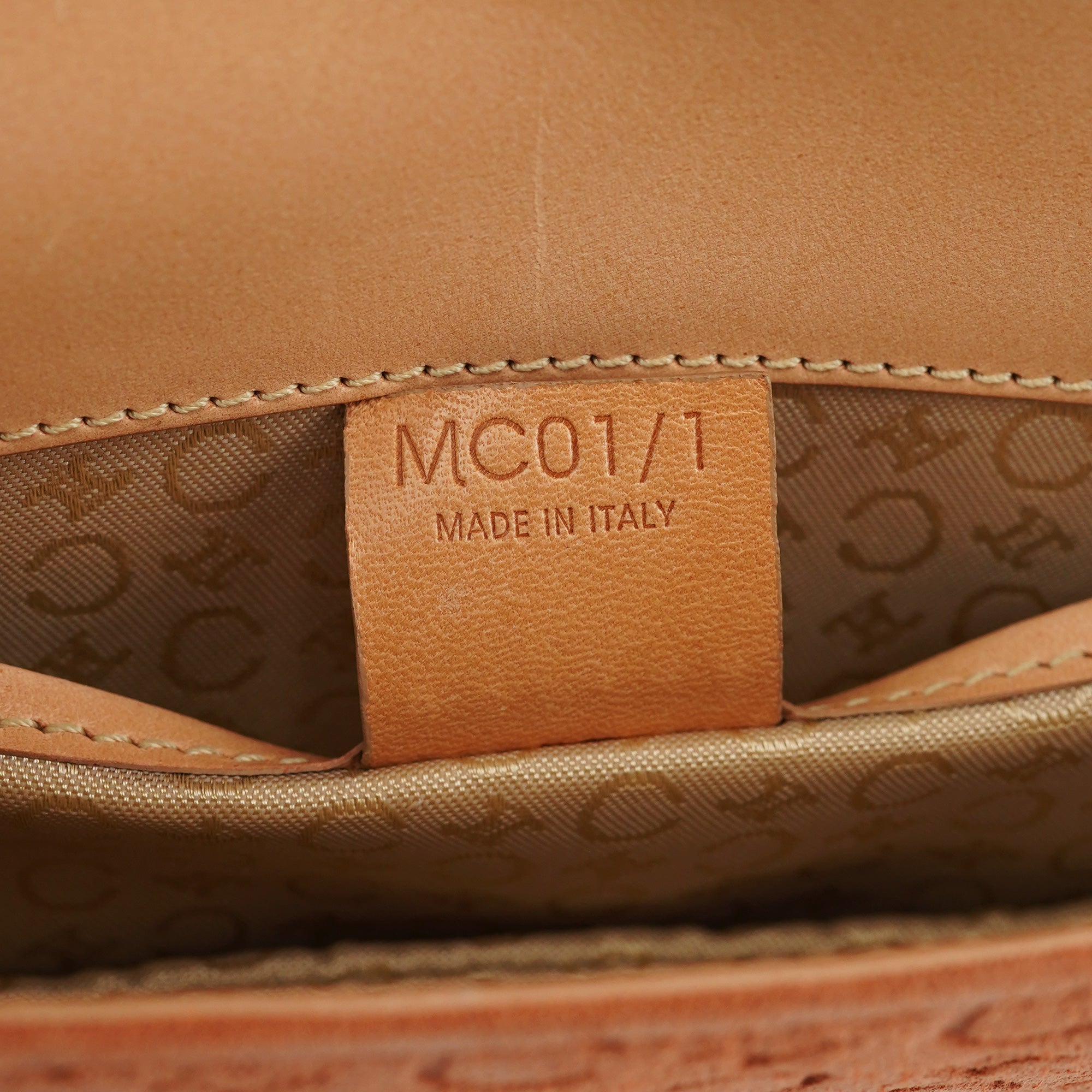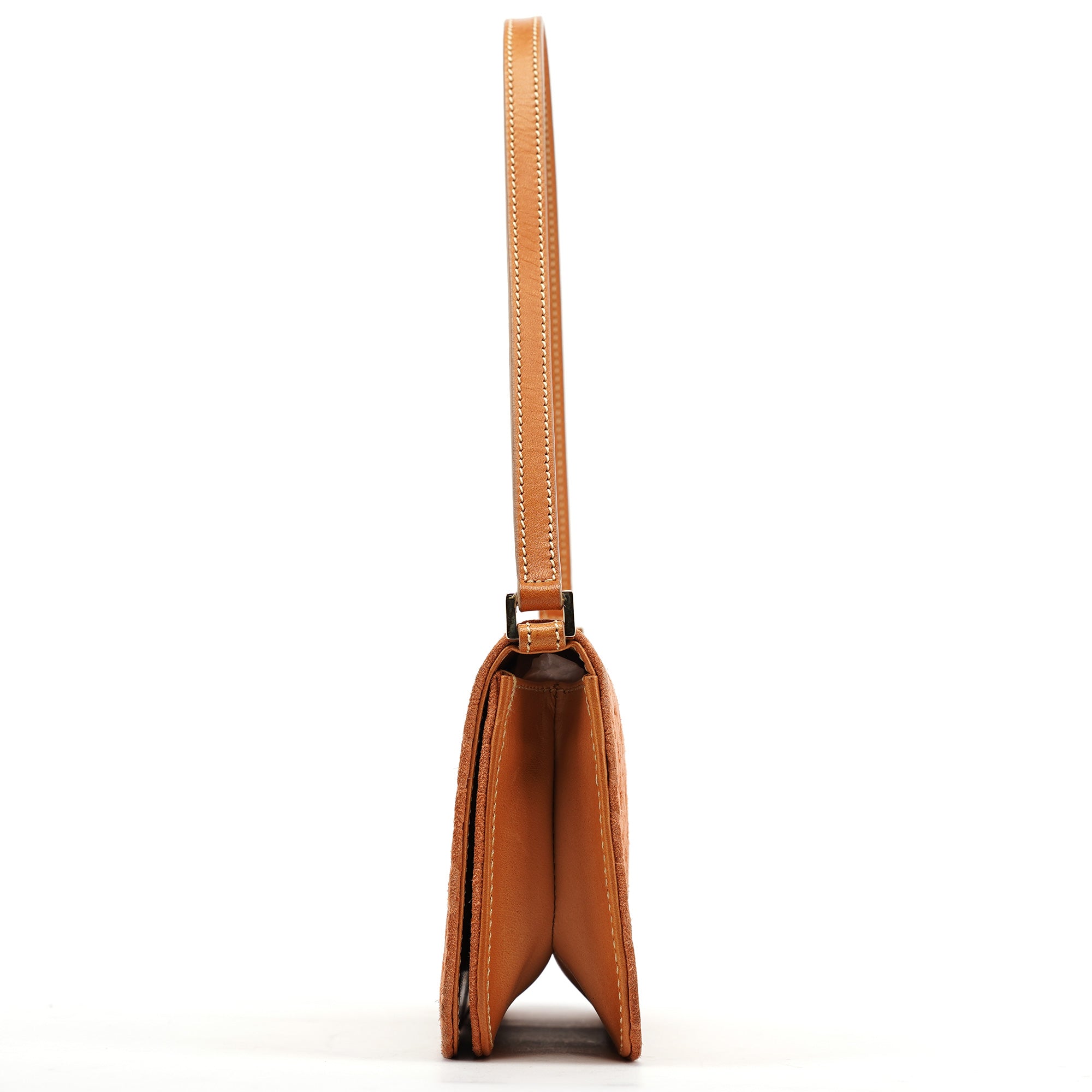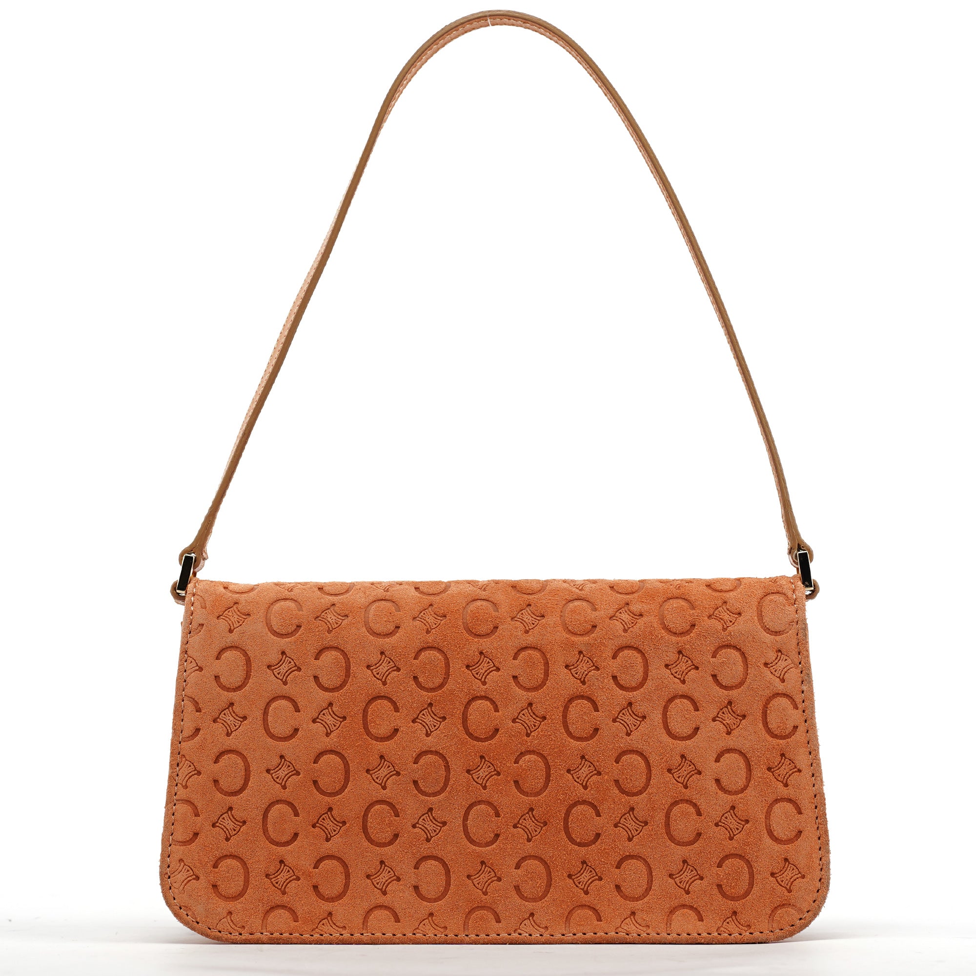 Designed in the early 2000's, this vintage Céline Macadam shoulder bag features orange suede embossed with the signature Macadam C pattern and tan leather trim along the edges. The bag has a single shoulder strap and a magnetic flap closure. The interior is lined in satin and includes a slip pocket.