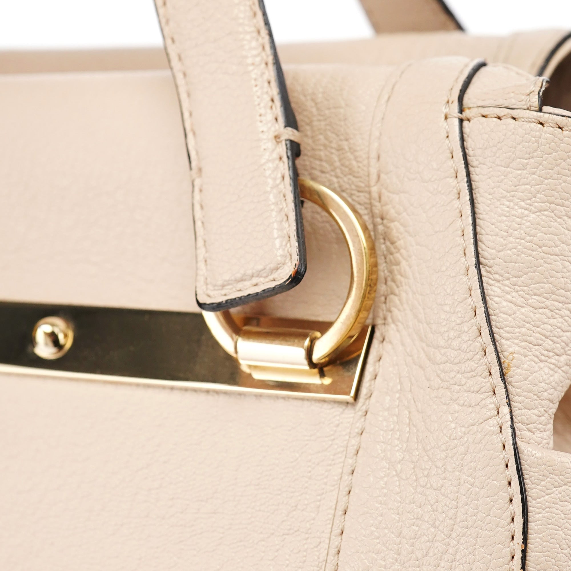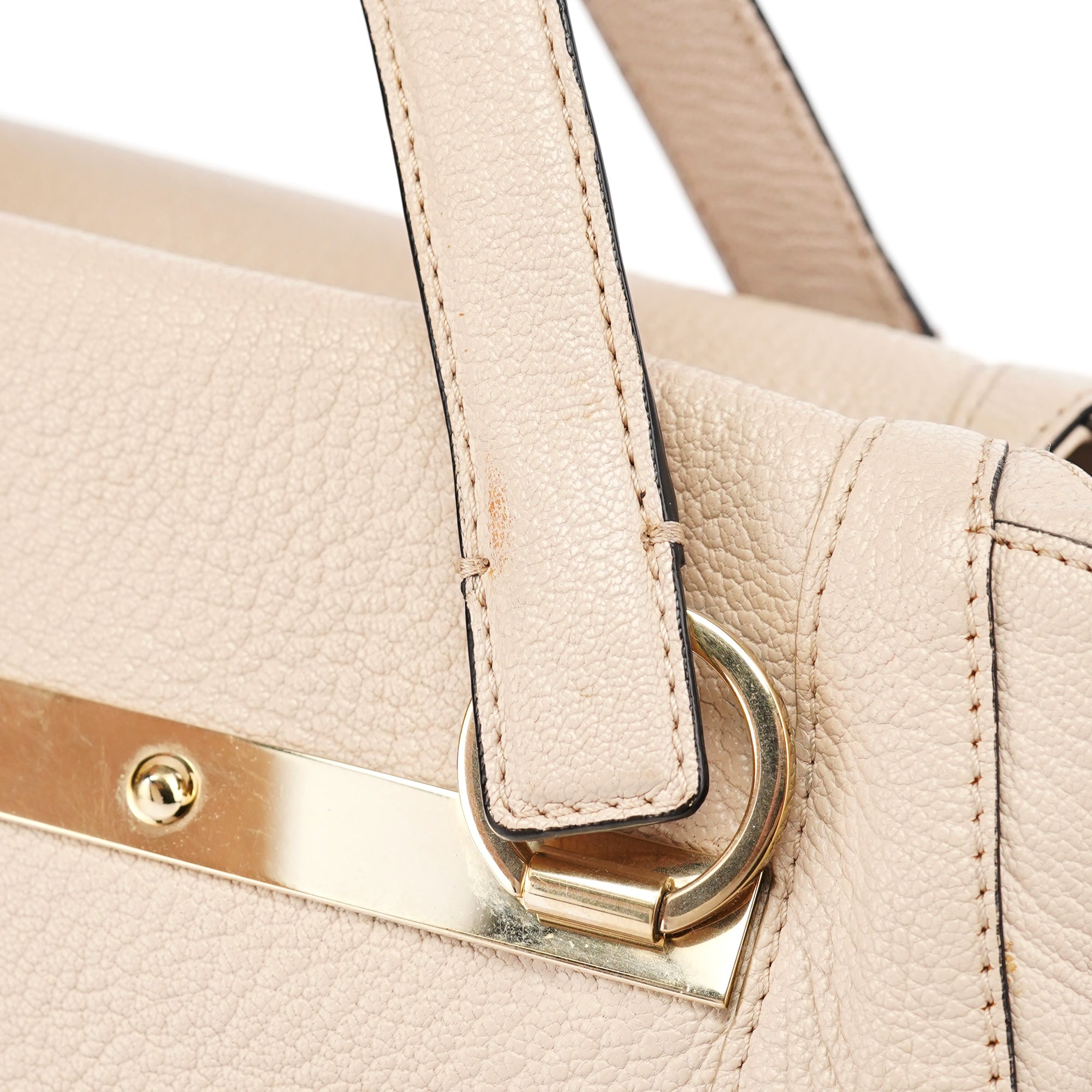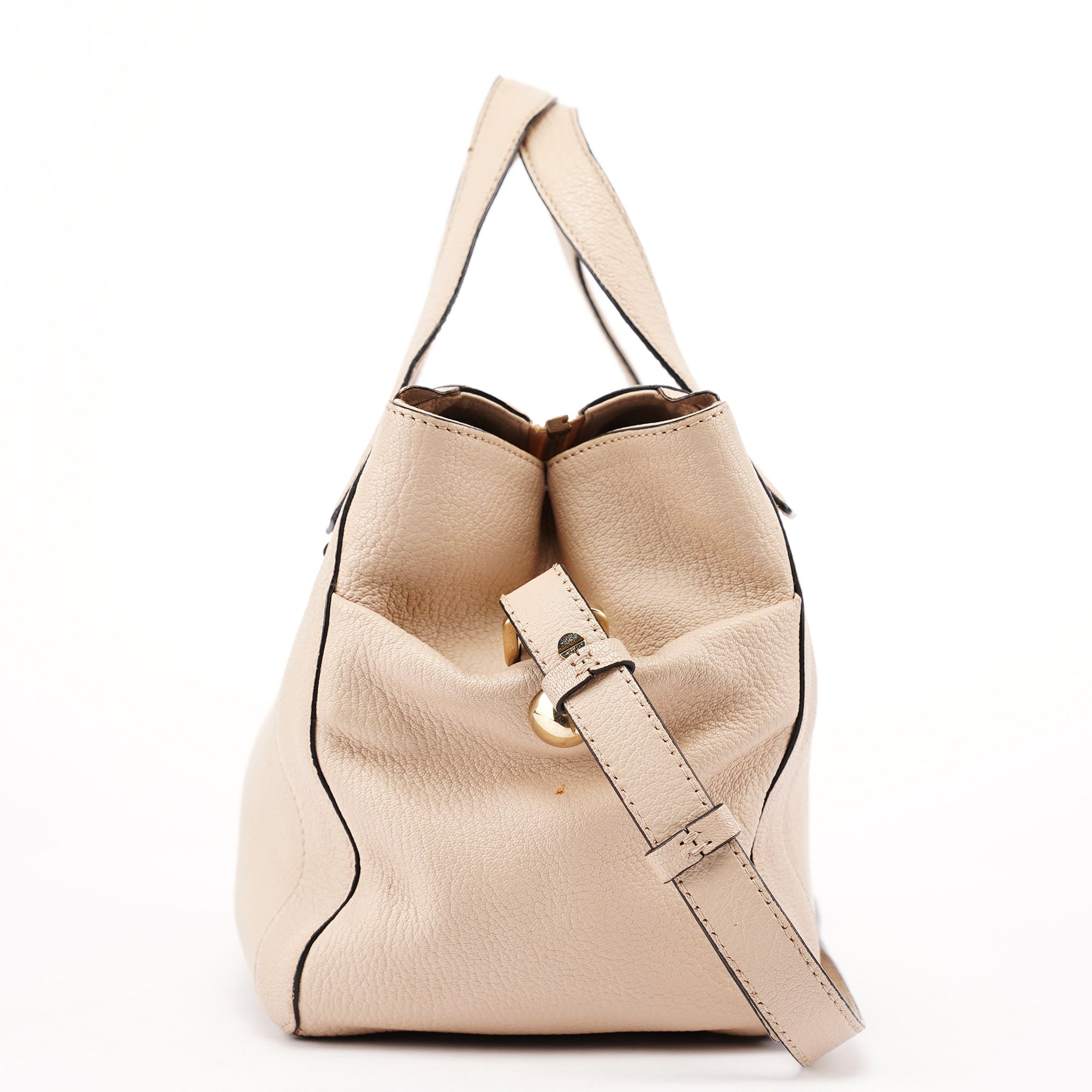Designed in the 2010s, this structured 2-way tote is crafted in beige pebbled calfskin leather with polished gold-tone hardware and double rolled top handles. The elegant silhouette features a detachable crossbody strap and a wide top opening with a signature logo-engraved metal bar accent. The interior is lined in fabric with a zip pocket for essentials.