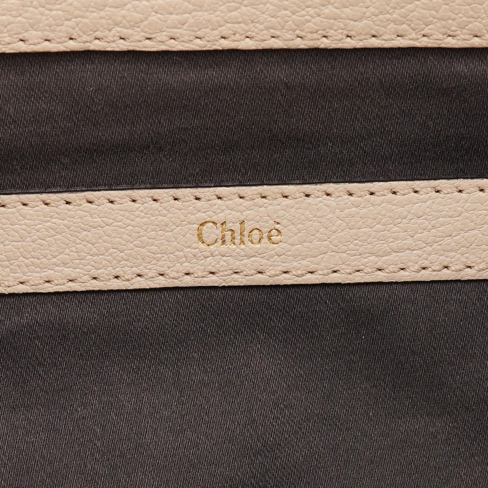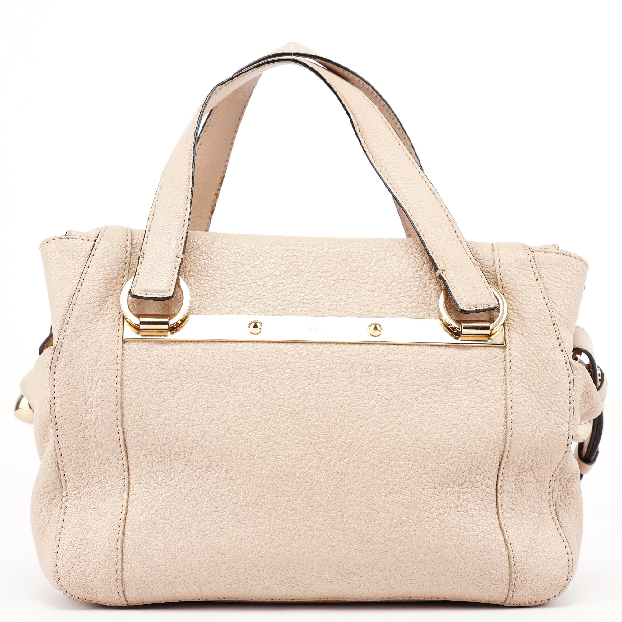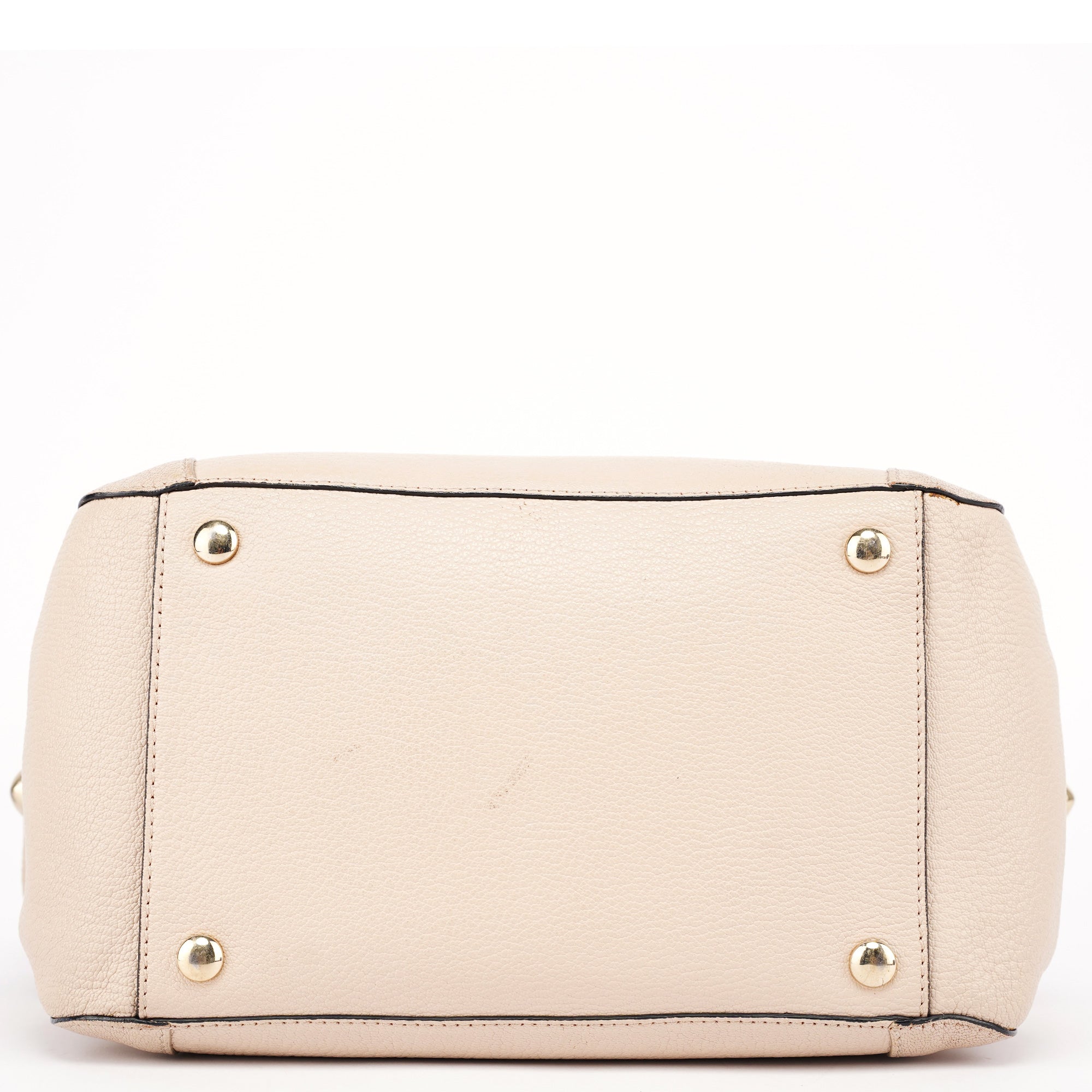 Designed in the 2010s, this structured 2-way tote is crafted in beige pebbled calfskin leather with polished gold-tone hardware and double rolled top handles. The elegant silhouette features a detachable crossbody strap and a wide top opening with a signature logo-engraved metal bar accent. The interior is lined in fabric with a zip pocket for essentials.