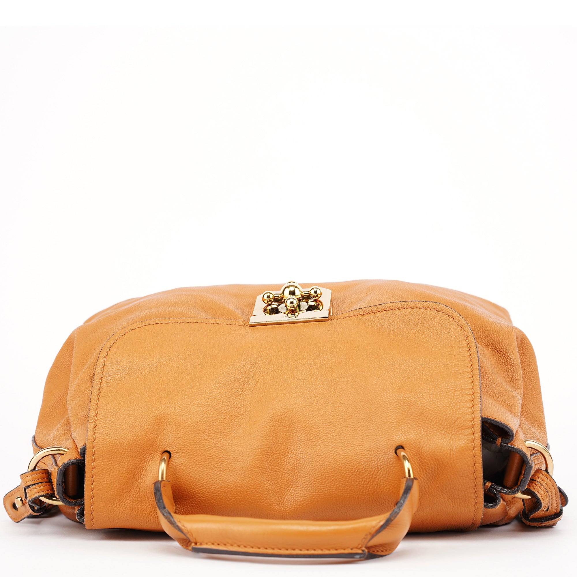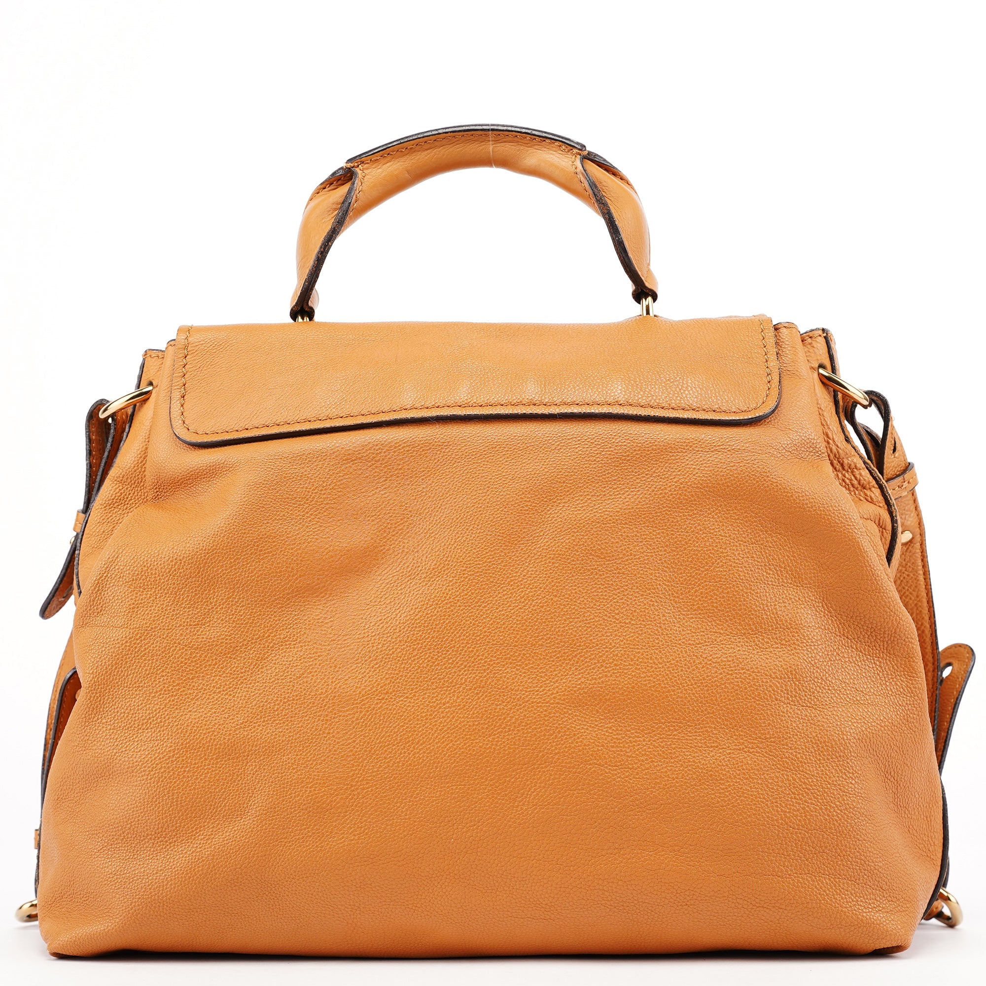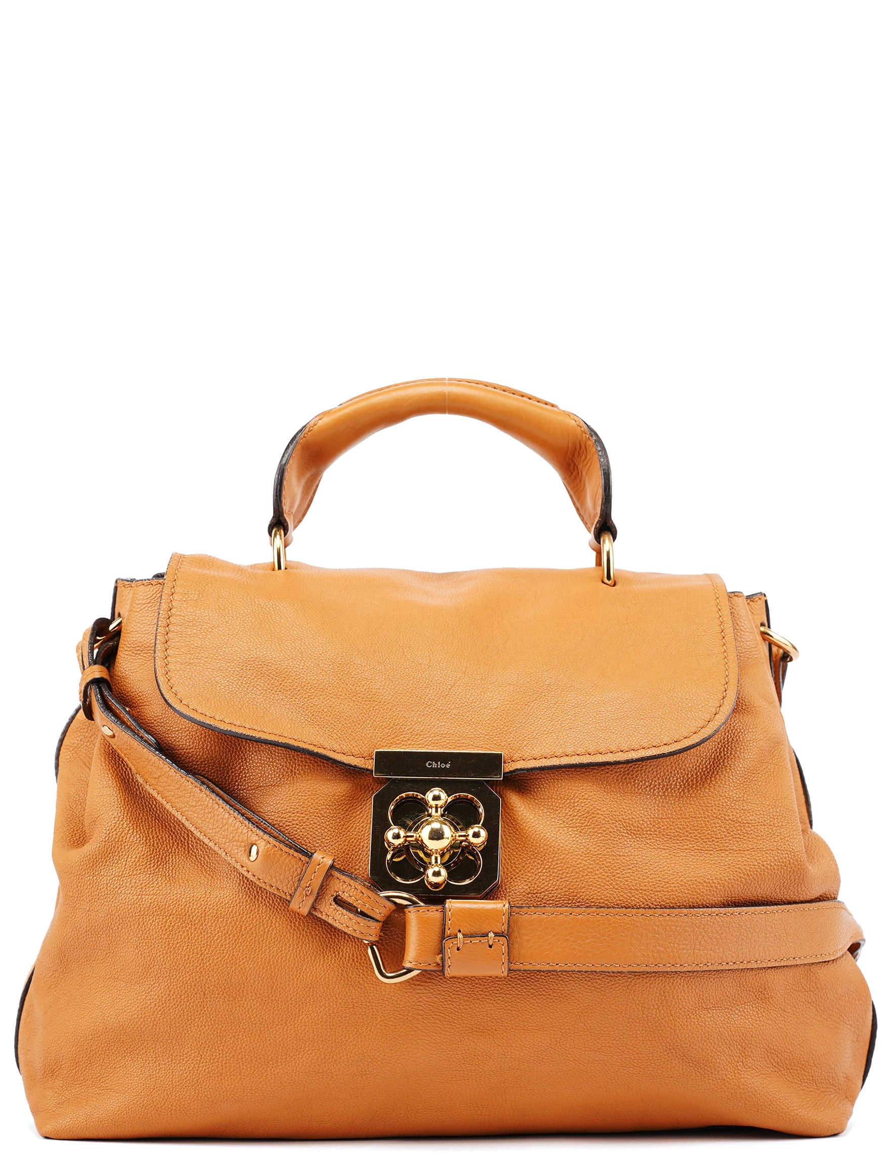 Designed in the 2010s, this Chloé 2-way bag is crafted from soft beige calfskin and features a structured flap silhouette secured with a signature gold-tone floral turn-lock closure. It includes a top handle and adjustable shoulder strap for versatile styling, while the interior is lined in dark textile and offers generous space for daily essentials.