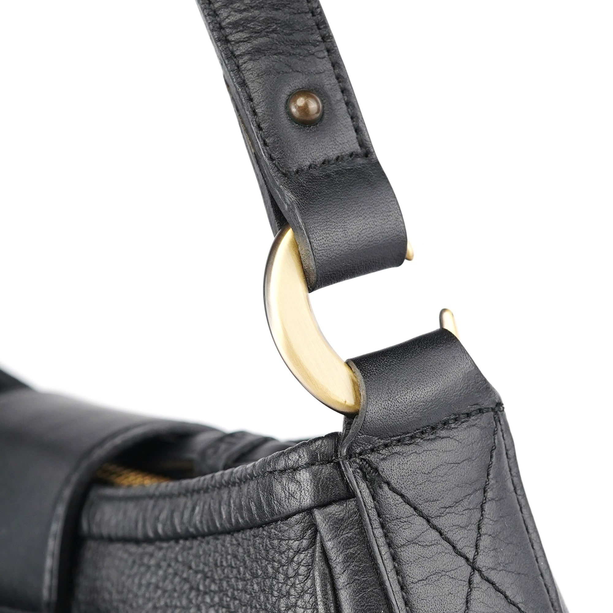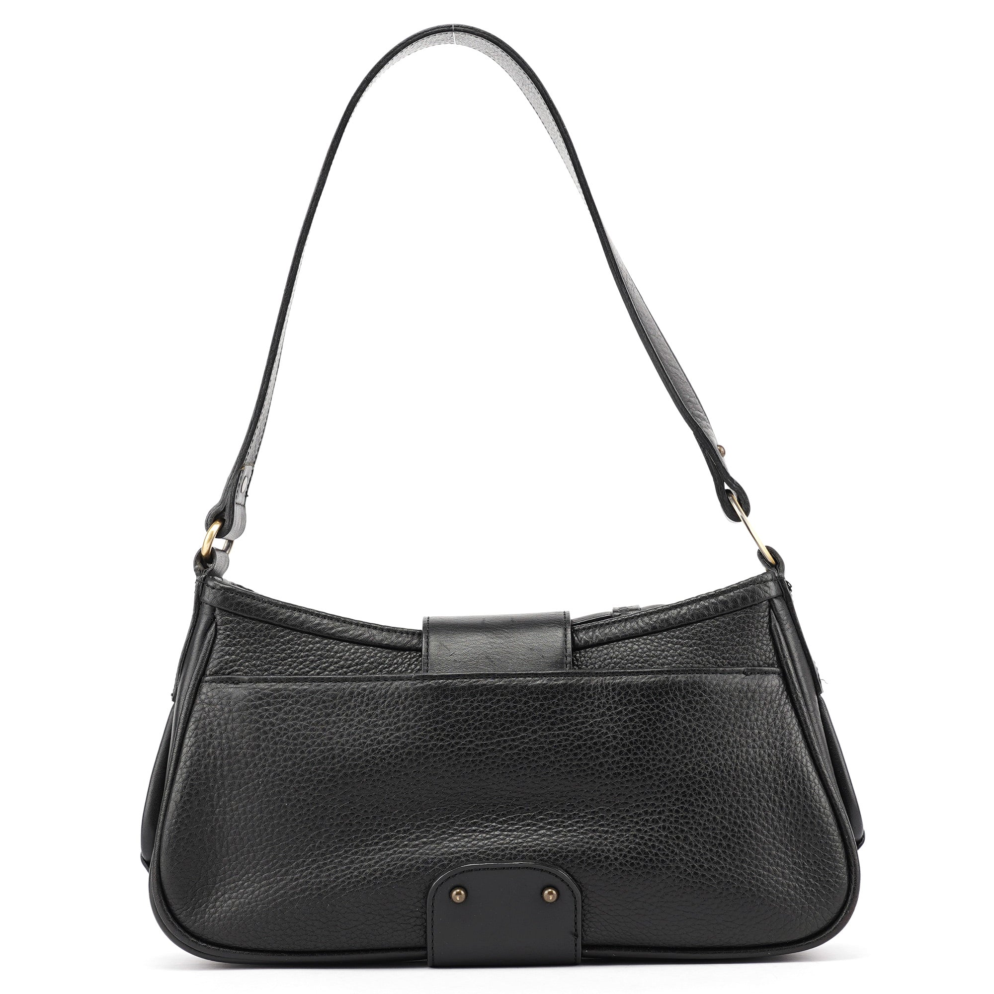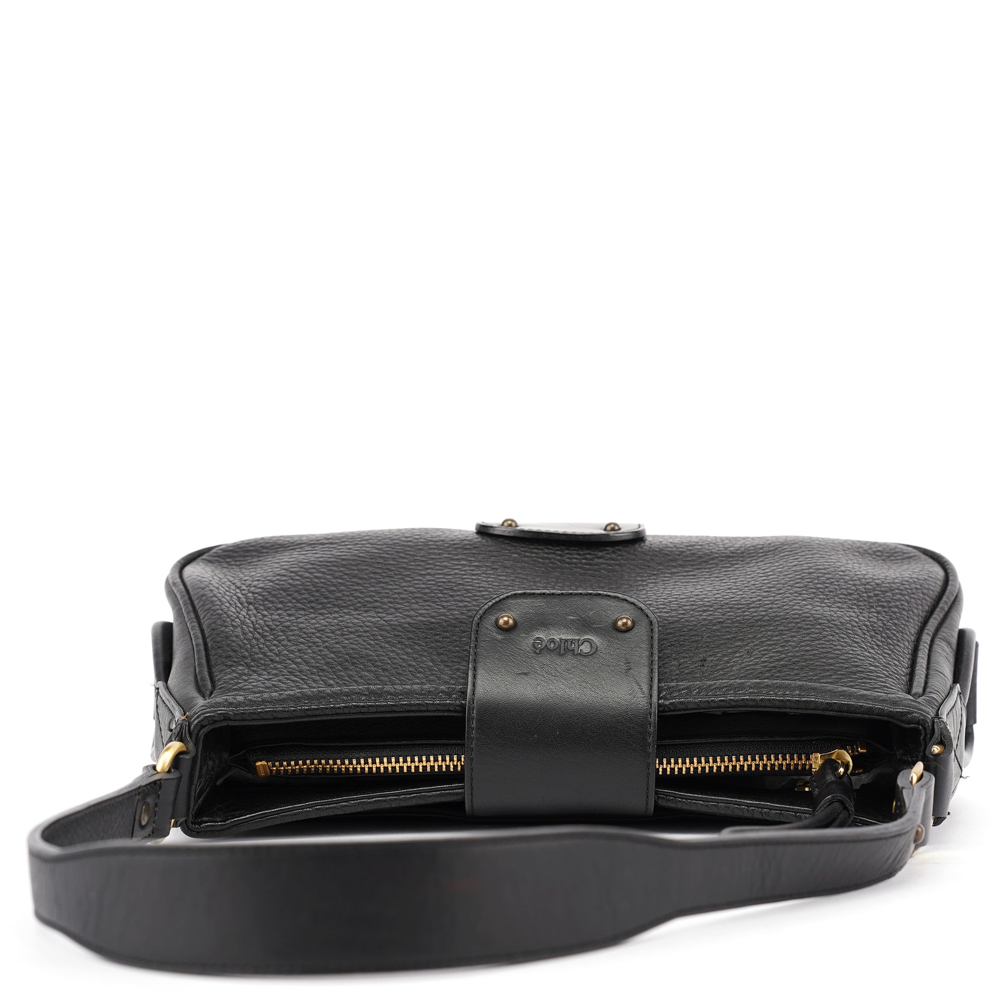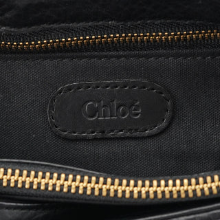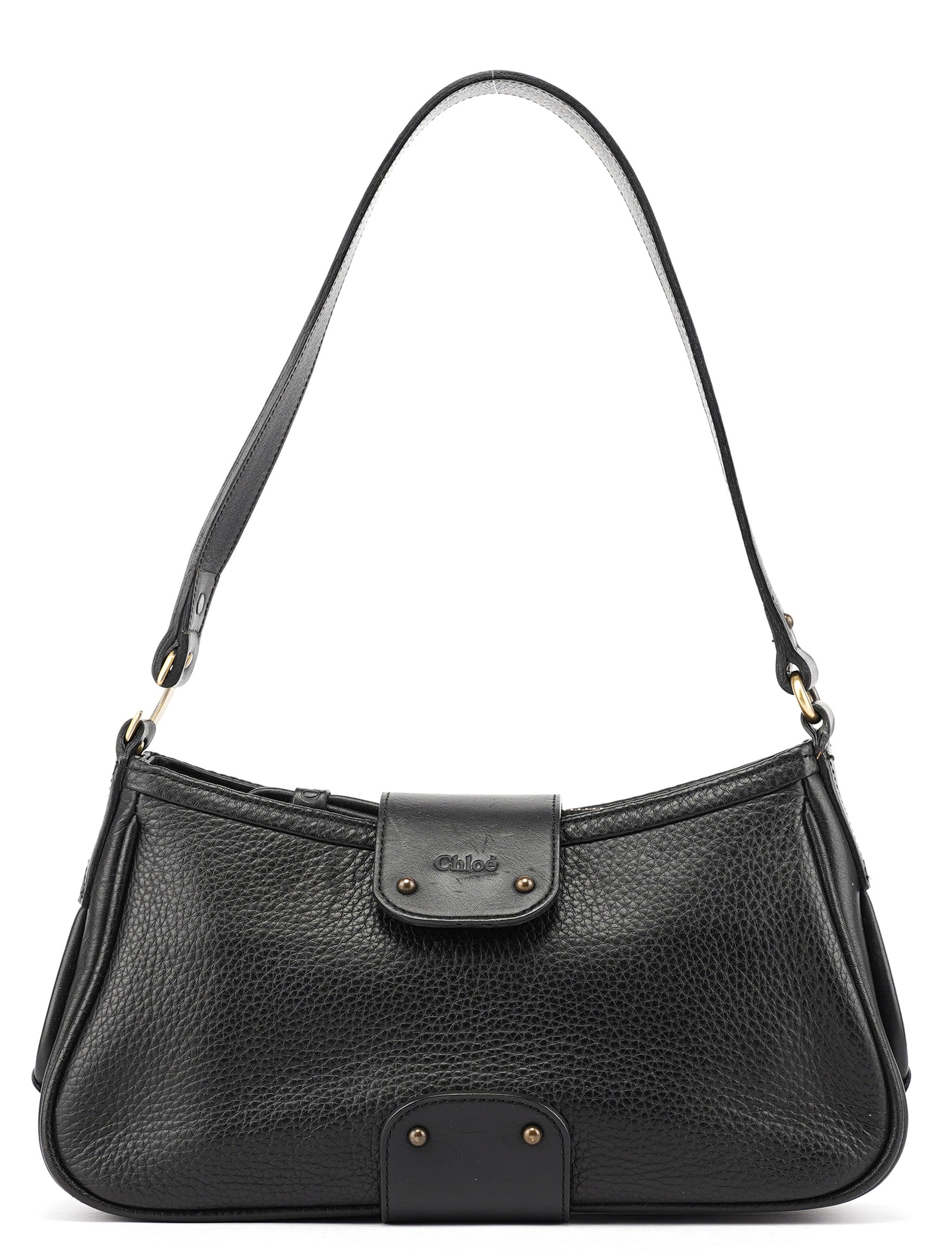 Designed in the early 2000s by Phoebe Philo, this Chloé shoulder bag is crafted from smooth and pebbled black calfskin in a structured hobo shape. It features a wide strap, fold-over flap with embossed logo, and antique brass rivet detailing. The interior is lined and secured with a top zip closure.
