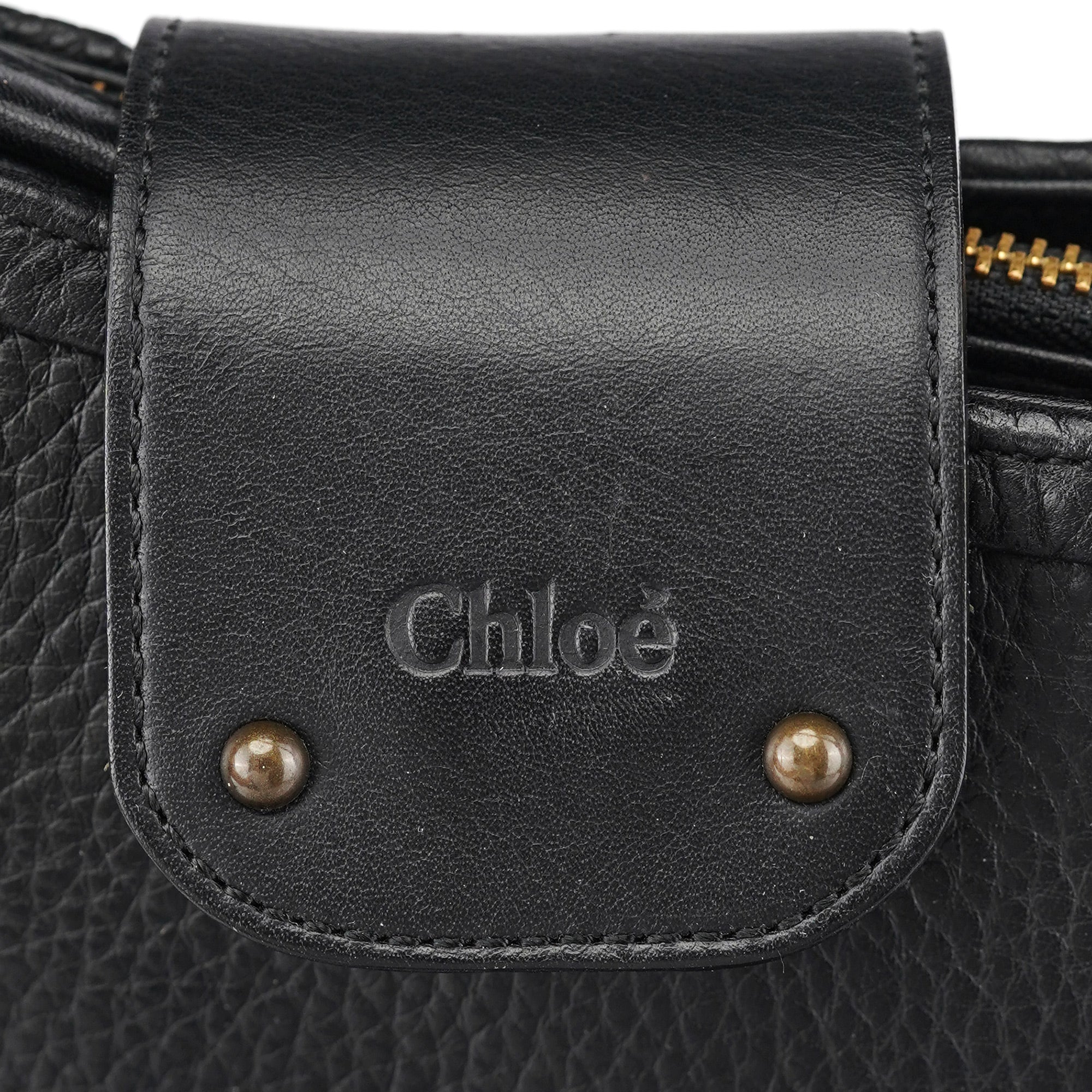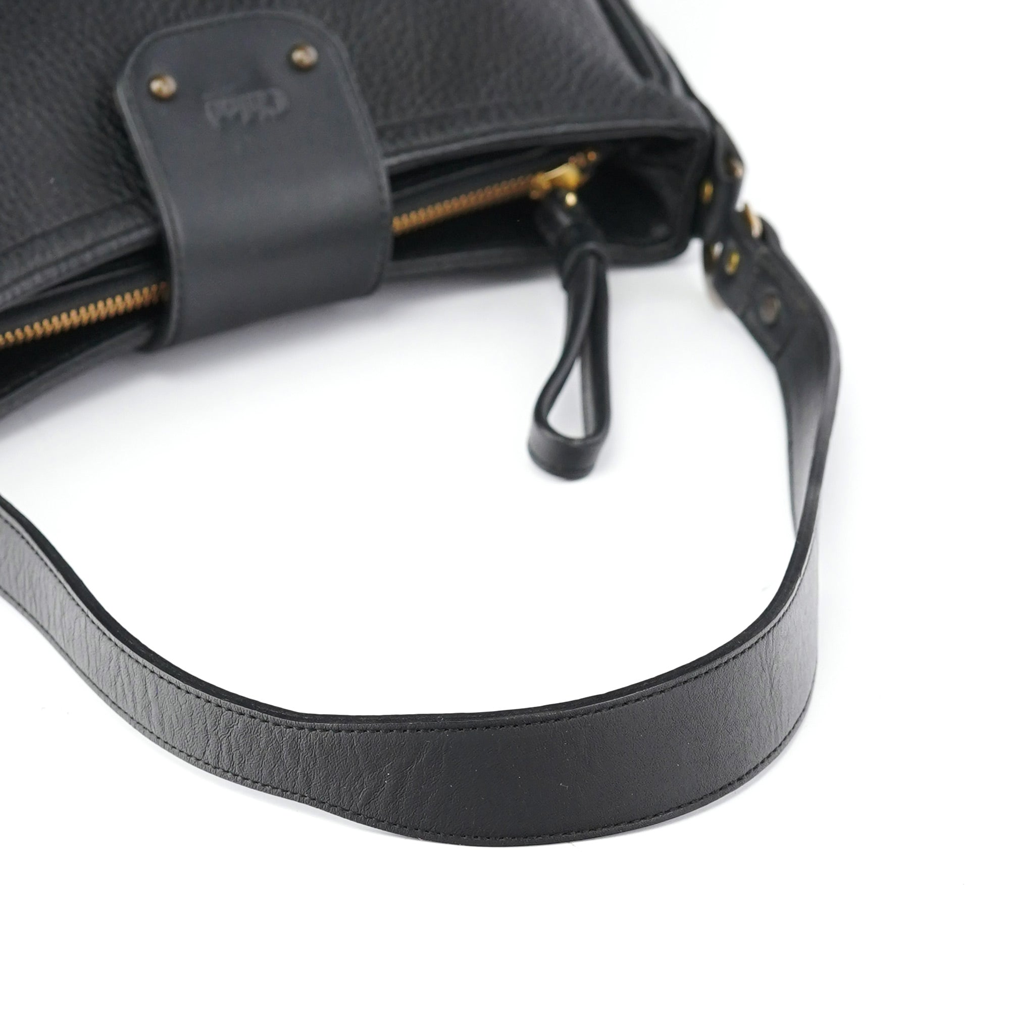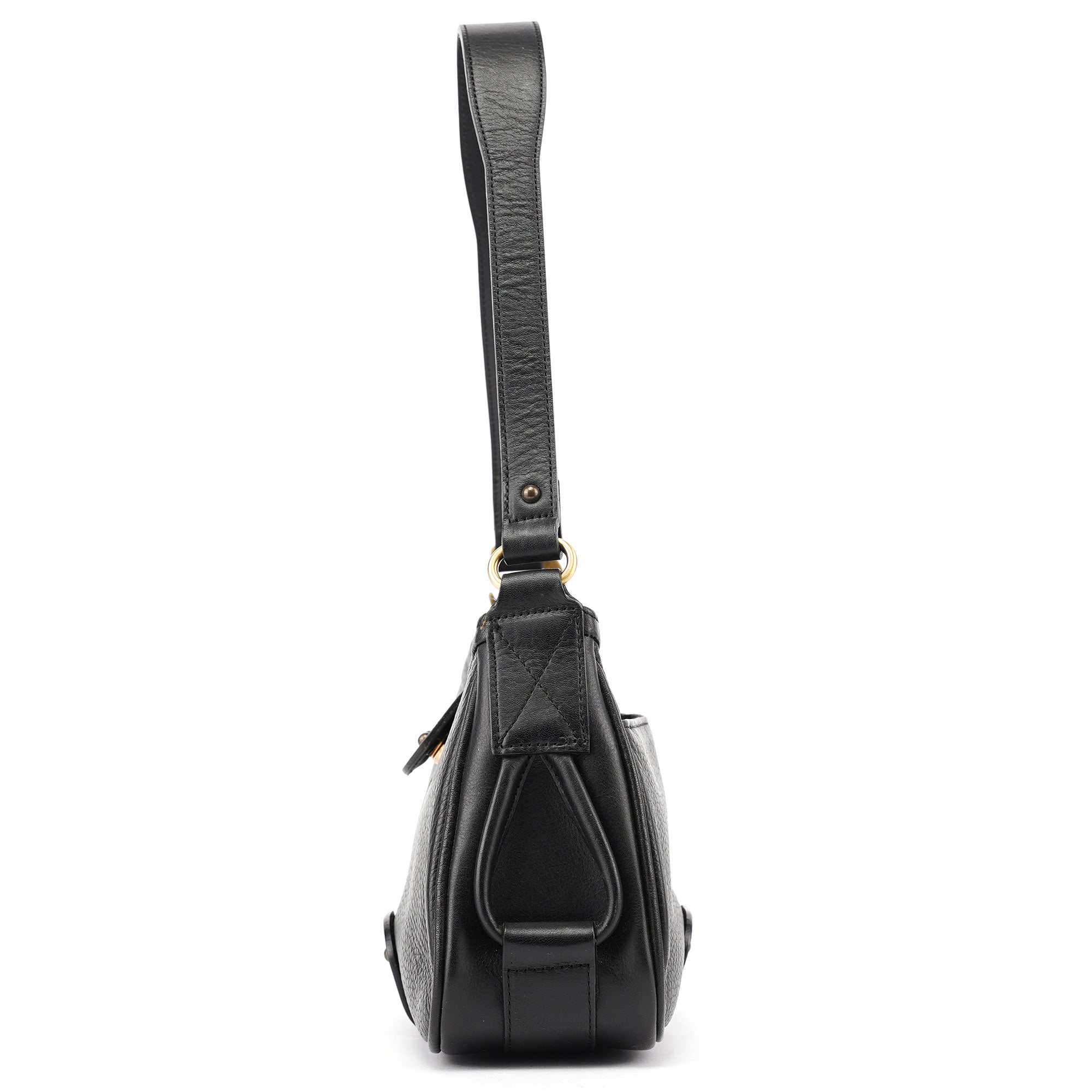 Designed in the early 2000s by Phoebe Philo, this Chloé shoulder bag is crafted from smooth and pebbled black calfskin in a structured hobo shape. It features a wide strap, fold-over flap with embossed logo, and antique brass rivet detailing. The interior is lined and secured with a top zip closure.