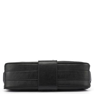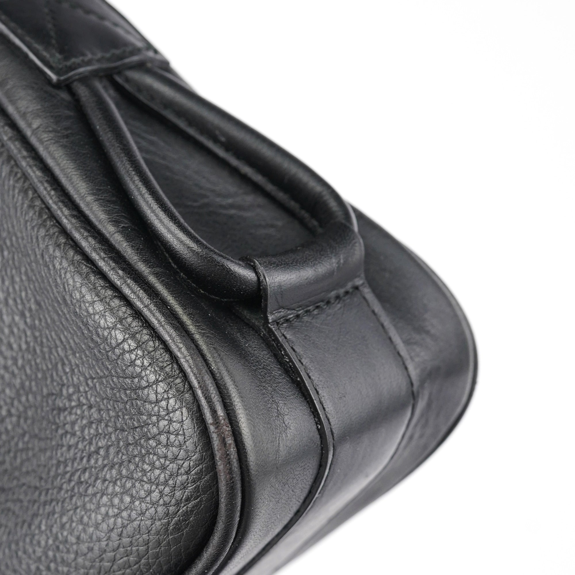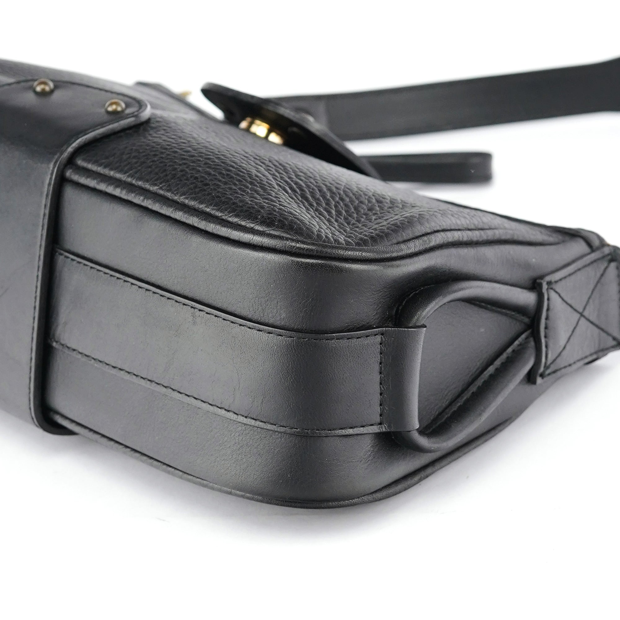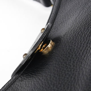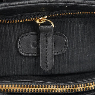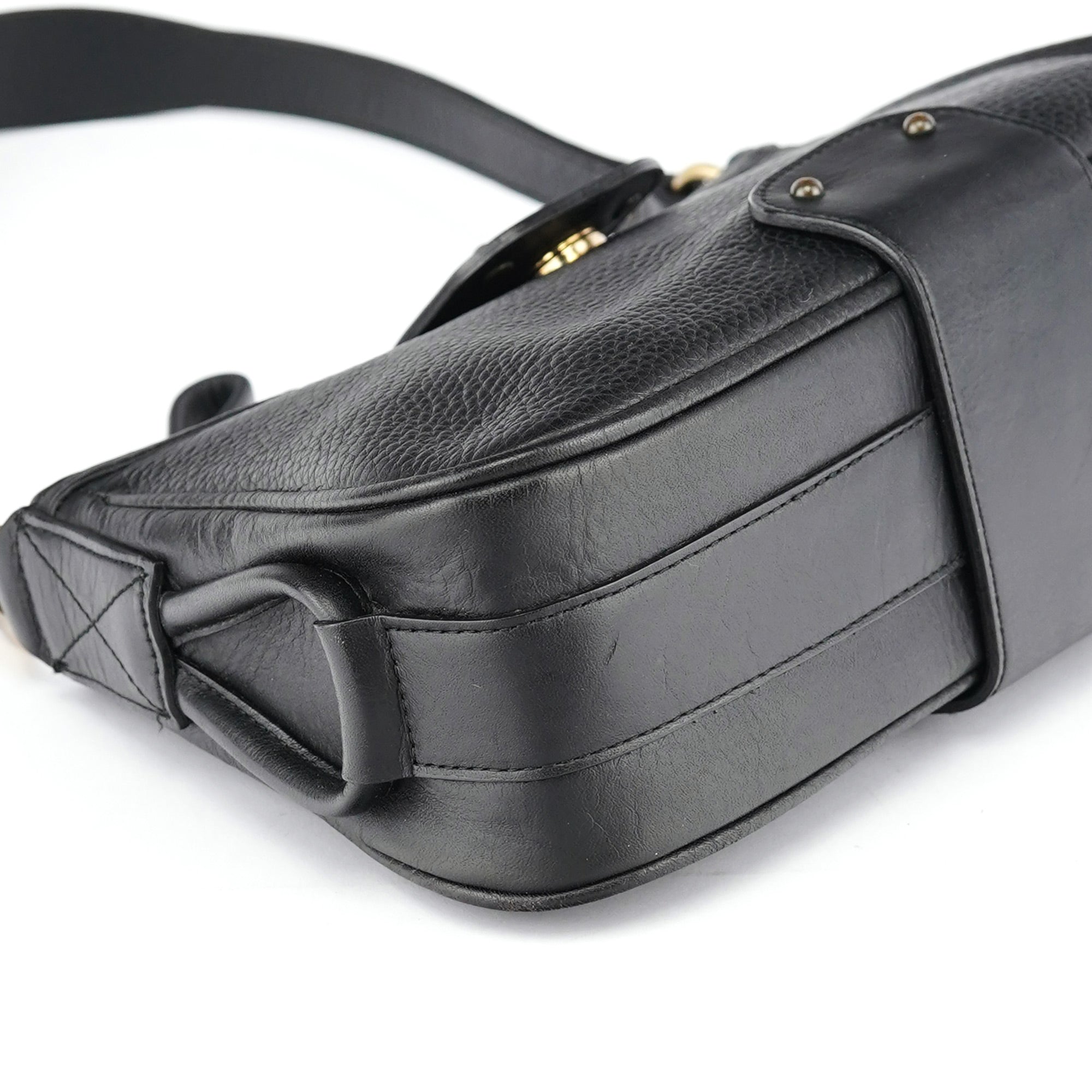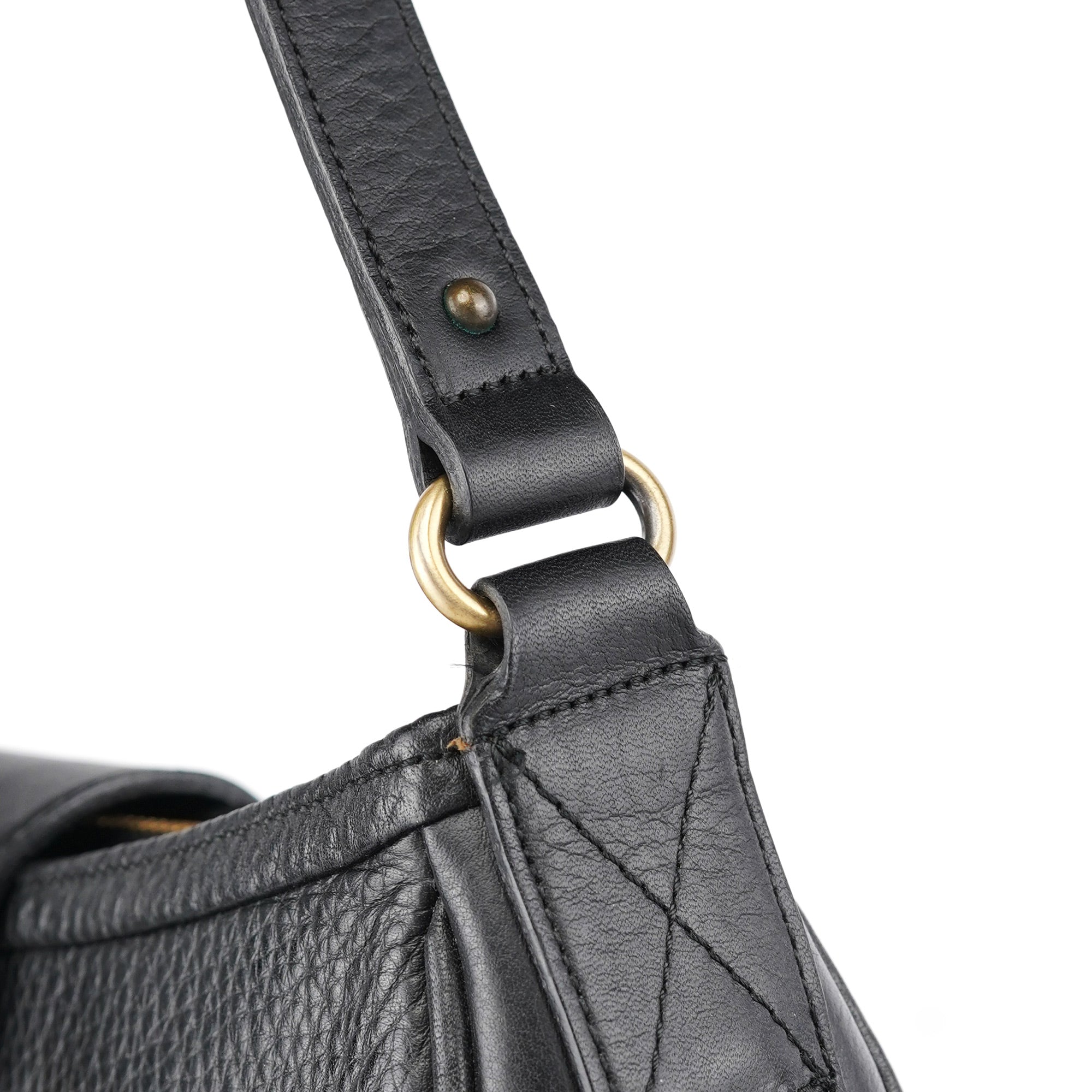 Designed in the early 2000s by Phoebe Philo, this Chloé shoulder bag is crafted from smooth and pebbled black calfskin in a structured hobo shape. It features a wide strap, fold-over flap with embossed logo, and antique brass rivet detailing. The interior is lined and secured with a top zip closure.