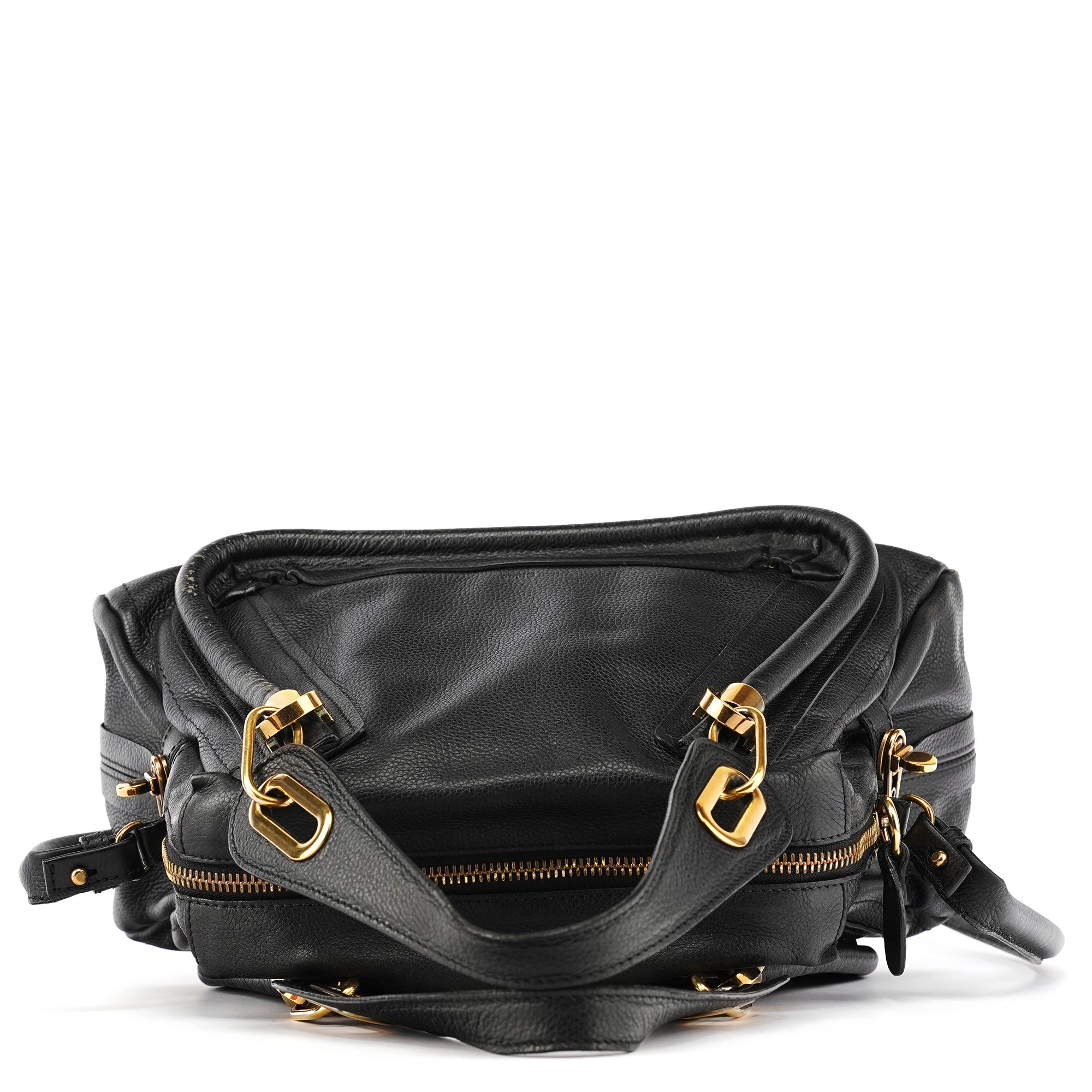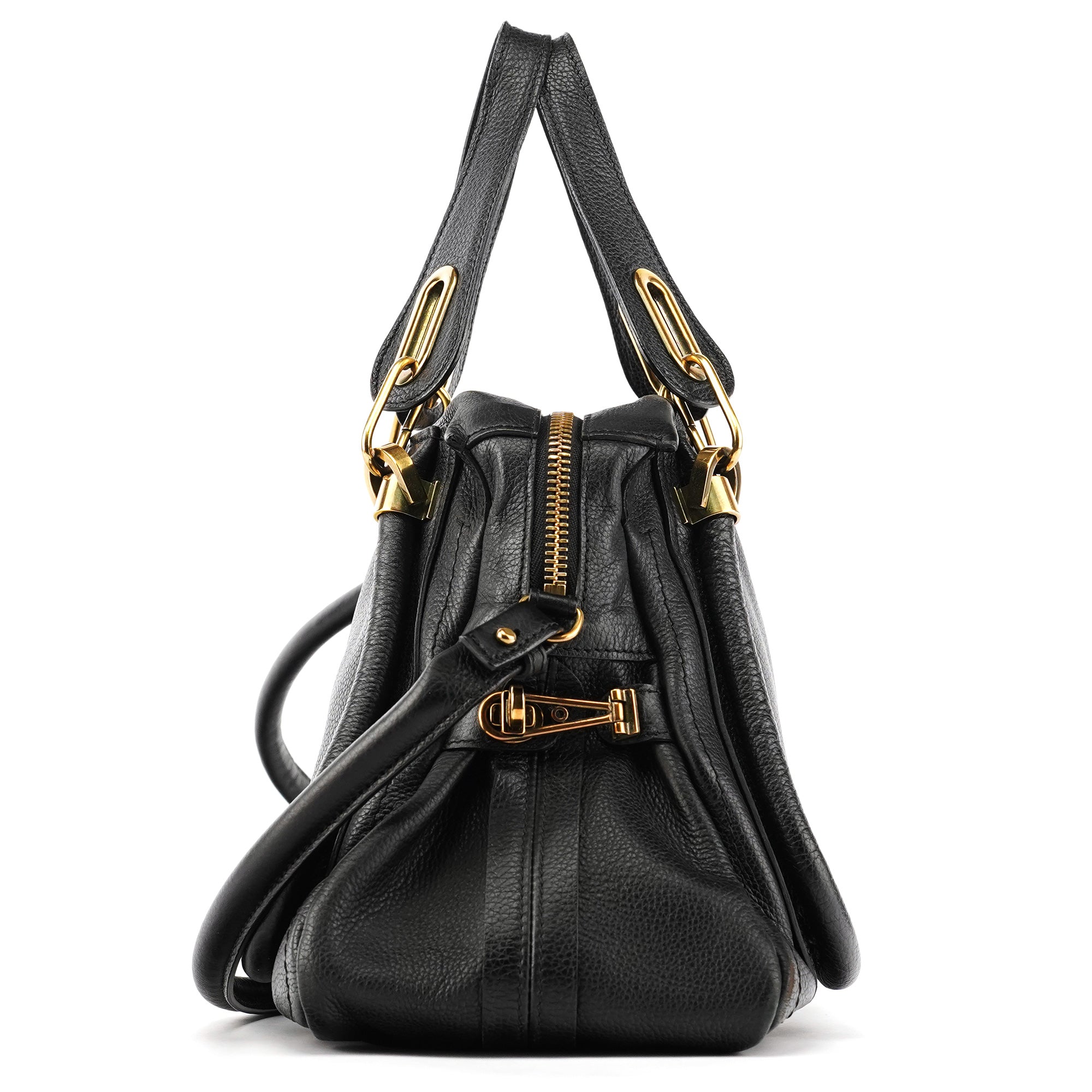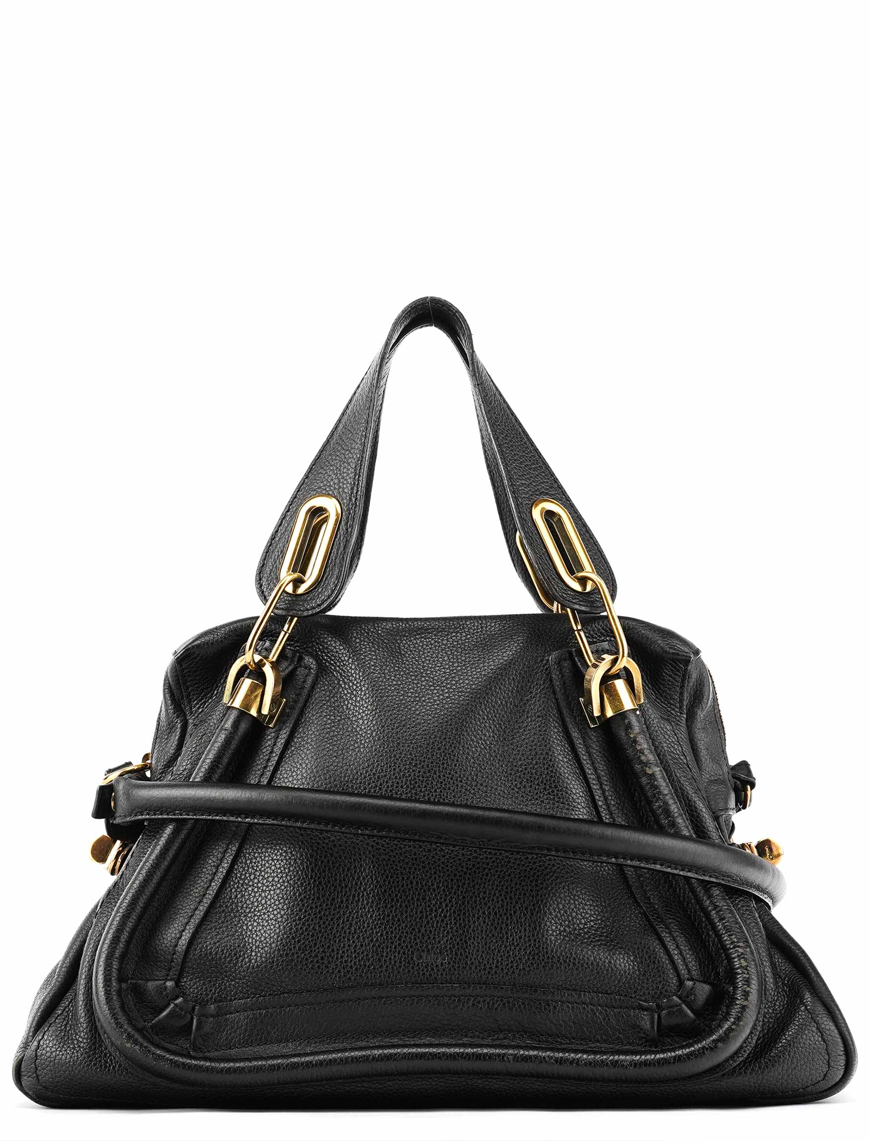 Designed in 2008 by Hannah MacGibbon, this vintage Chloé Paraty 2-way bag features soft black pebbled leather with the model's signature braided top handles and gleaming gold-tone hardware. The structured yet relaxed shape offers both top handles and a detachable shoulder strap, with a zip closure opening to a black fabric-lined interior with interior pockets.