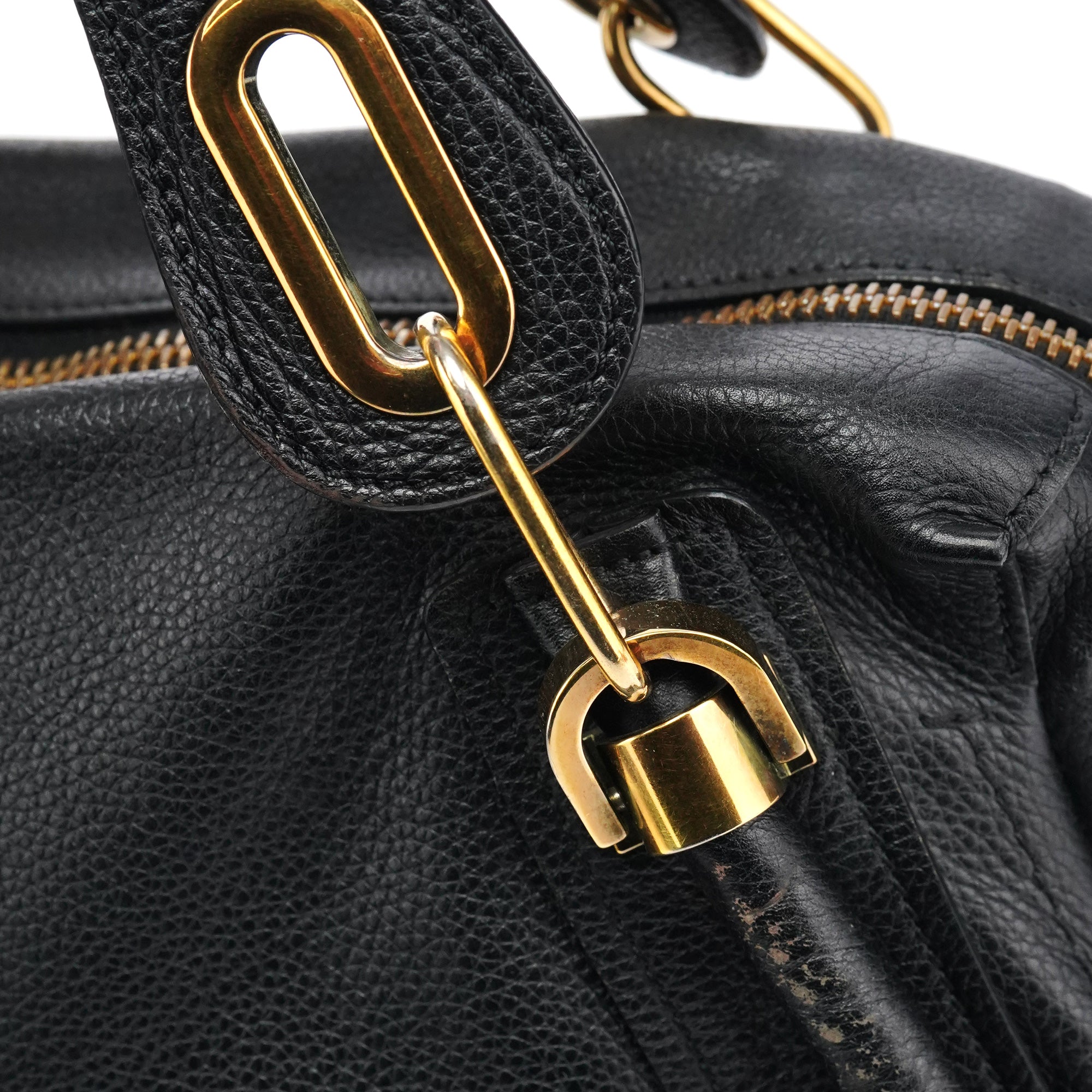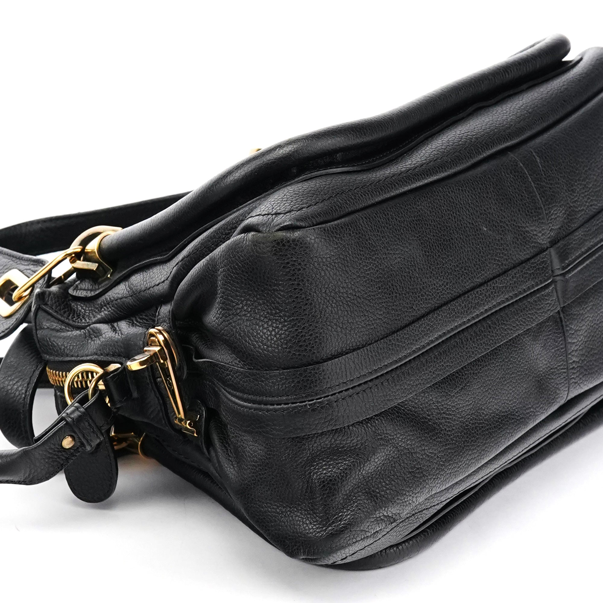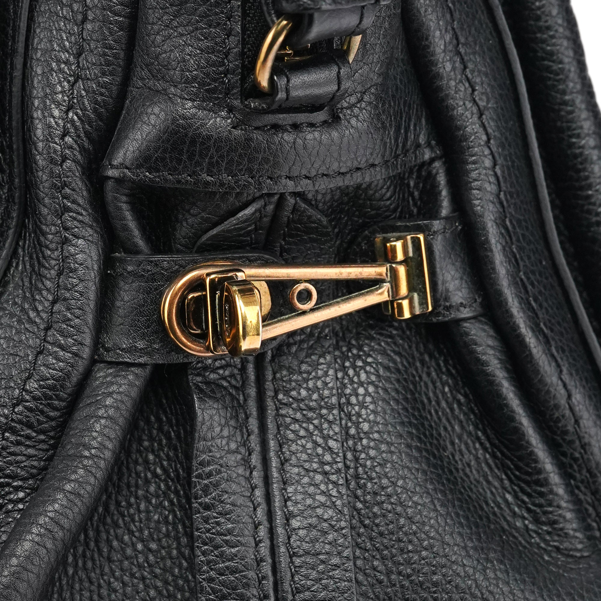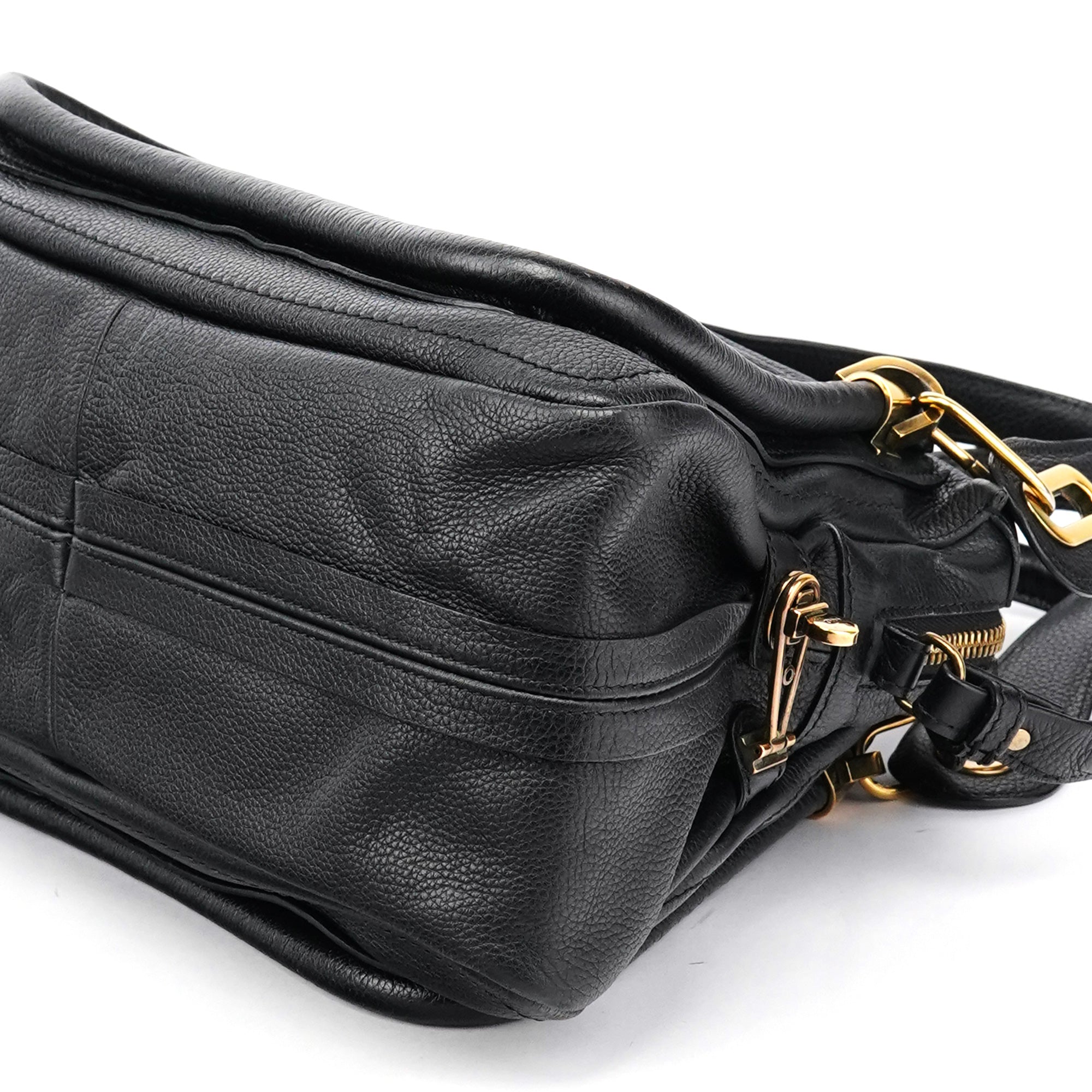 Designed in 2008 by Hannah MacGibbon, this vintage Chloé Paraty 2-way bag features soft black pebbled leather with the model's signature braided top handles and gleaming gold-tone hardware. The structured yet relaxed shape offers both top handles and a detachable shoulder strap, with a zip closure opening to a black fabric-lined interior with interior pockets.