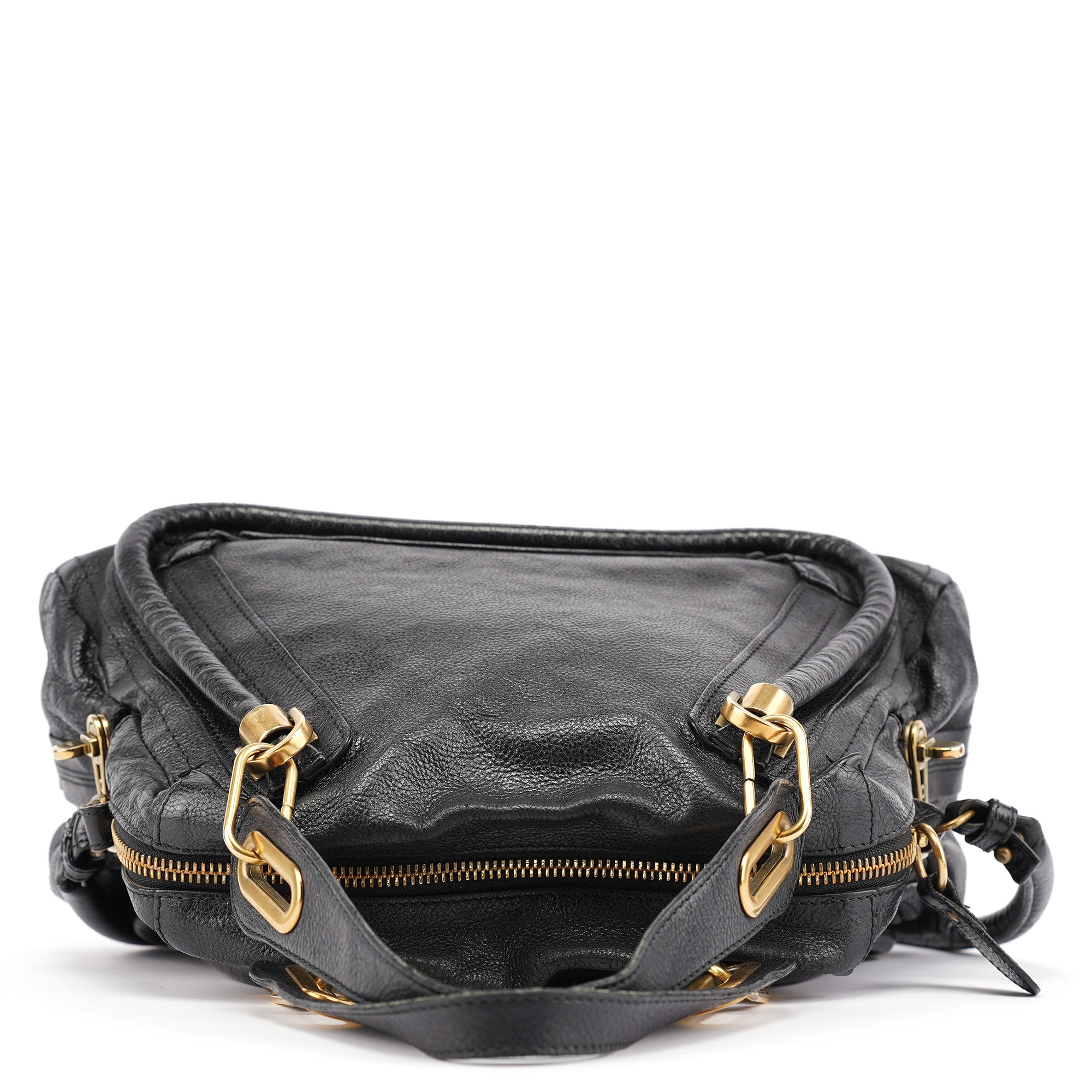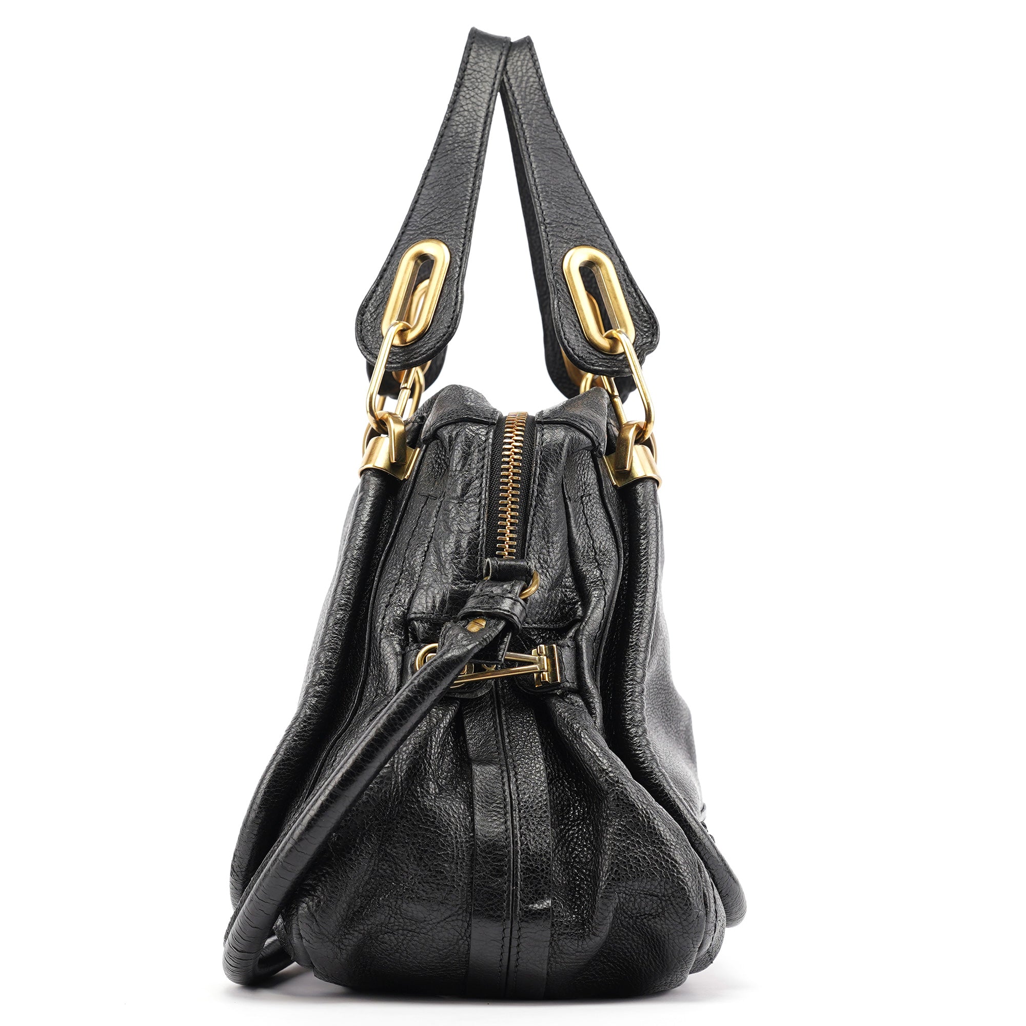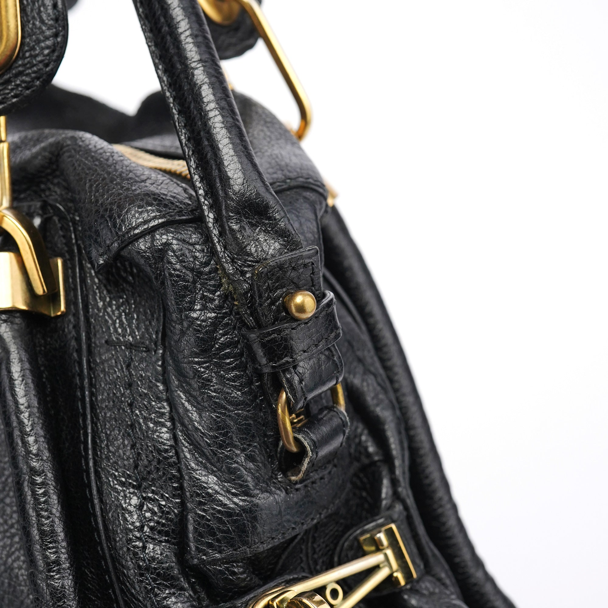 Designed in 2008 by Hannah MacGibbon, this vintage Chloé Paraty shoulder bag showcases the brand's signature bohemian-luxe aesthetic in supple black leather. The distinctive saddlebag silhouette features contrast stitching, brass-toned hardware including the characteristic double zip closure, and a spacious interior. The bag offers versatile 2-way styling with both shoulder and hand-carry options.