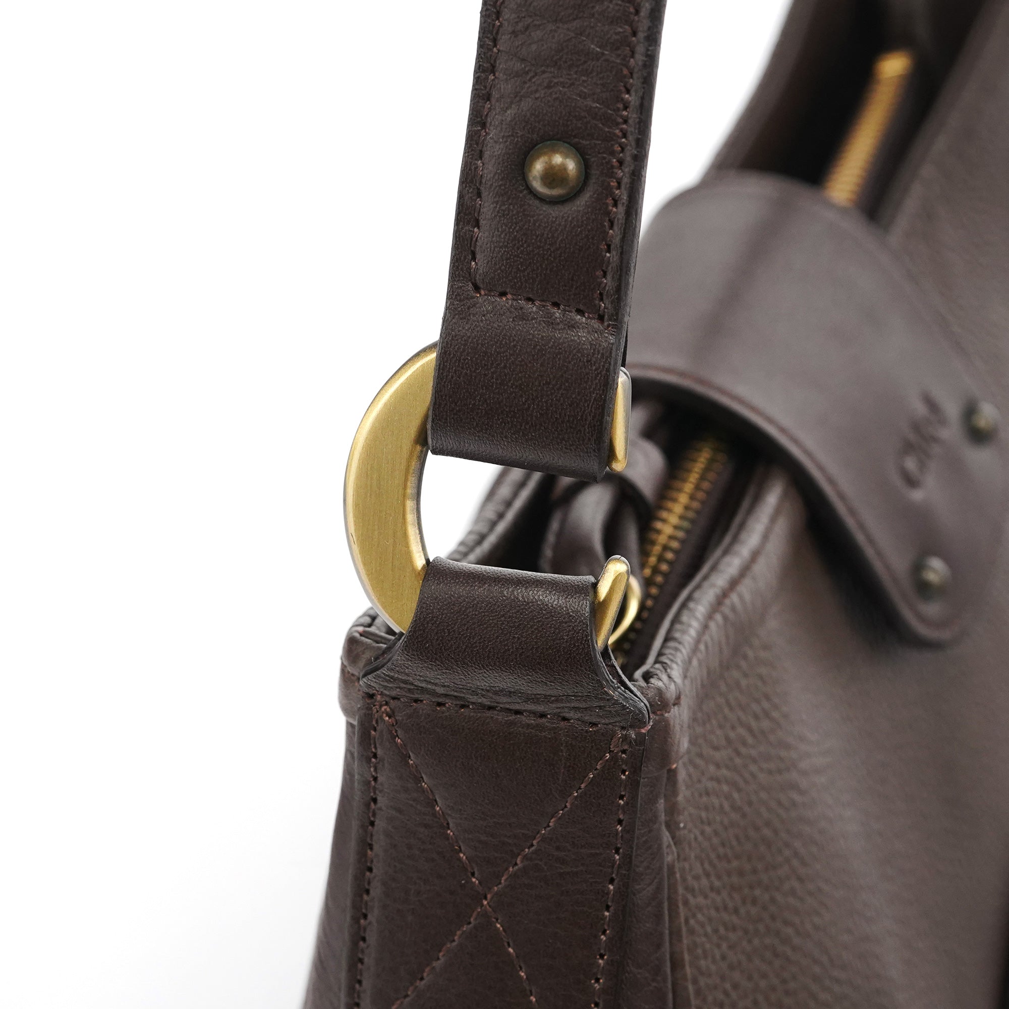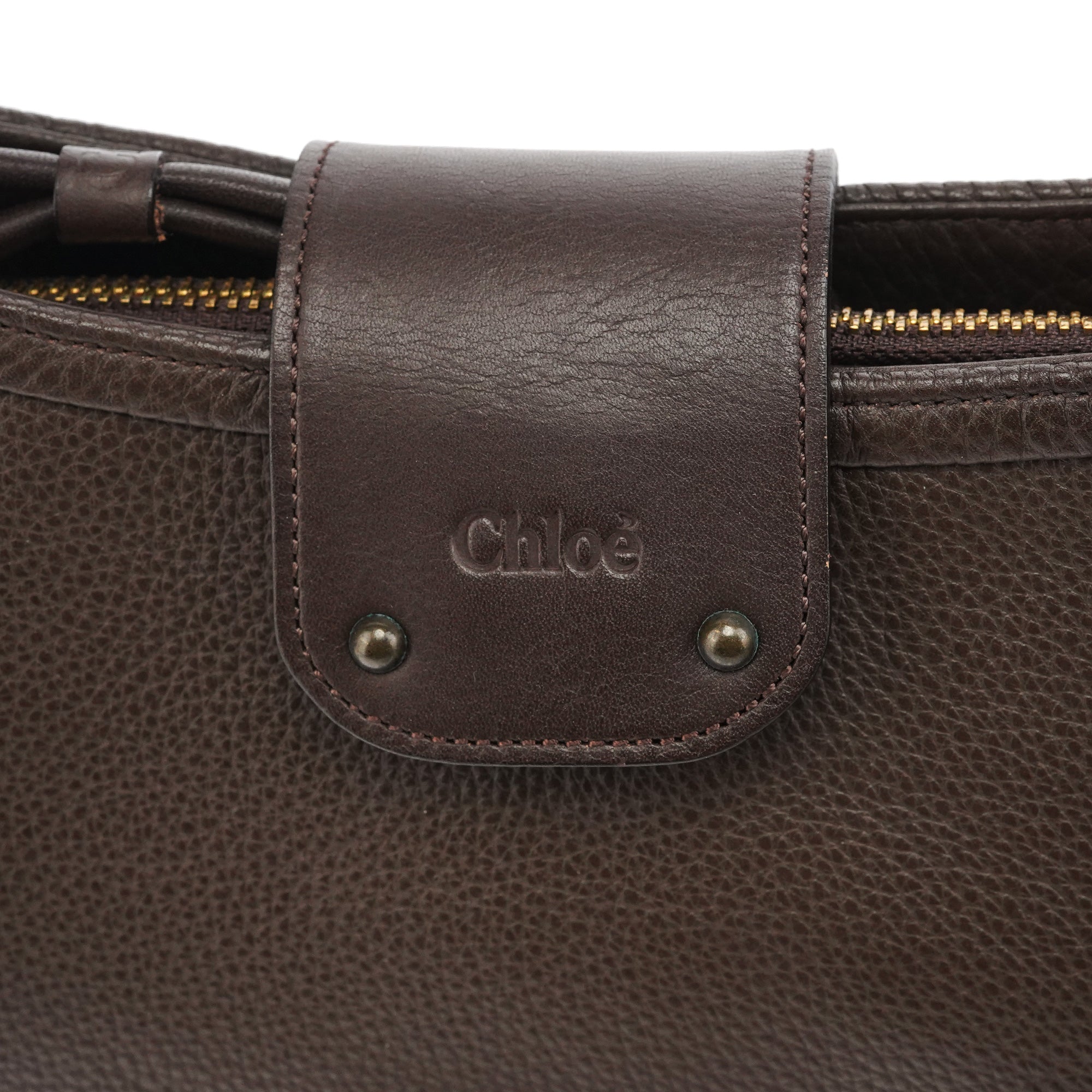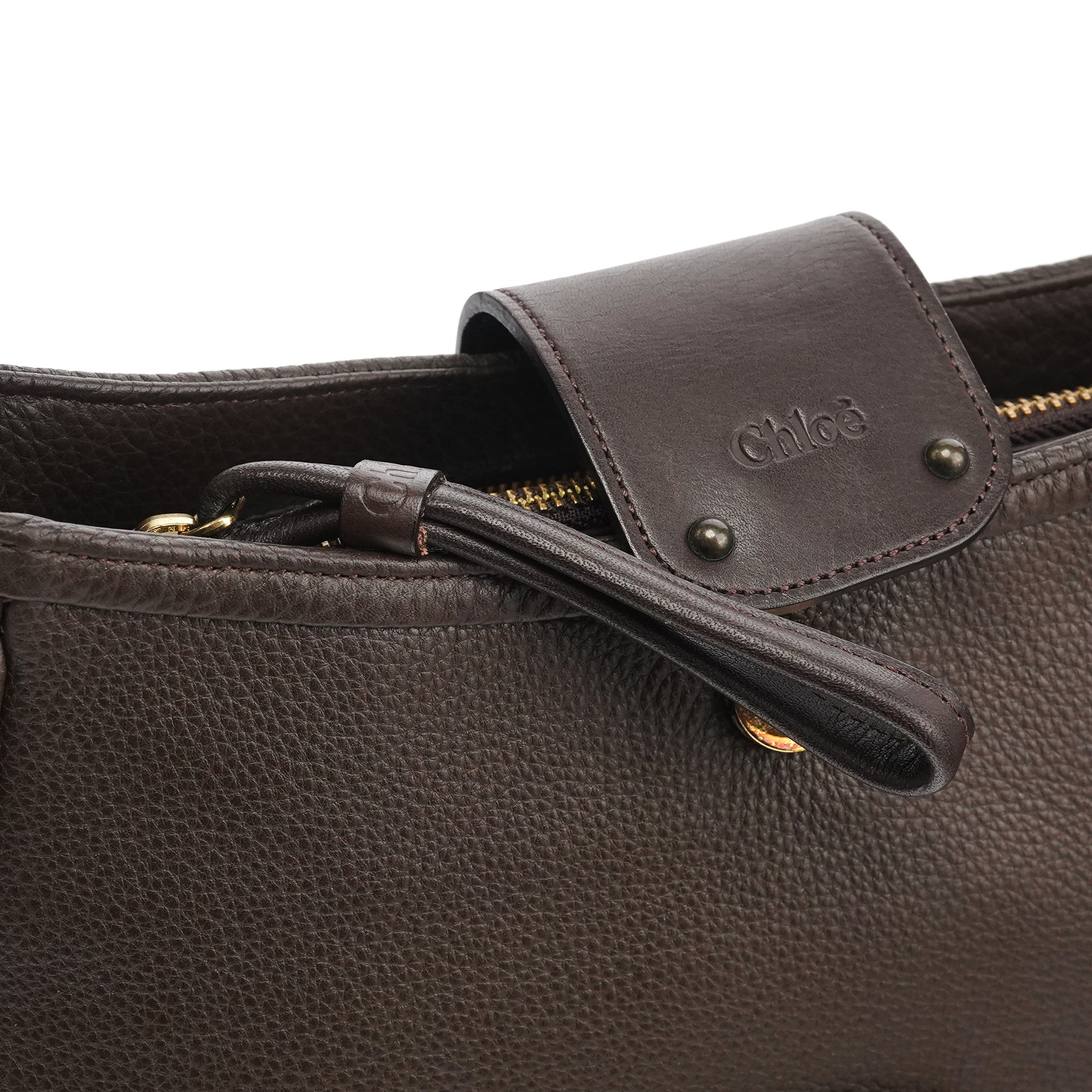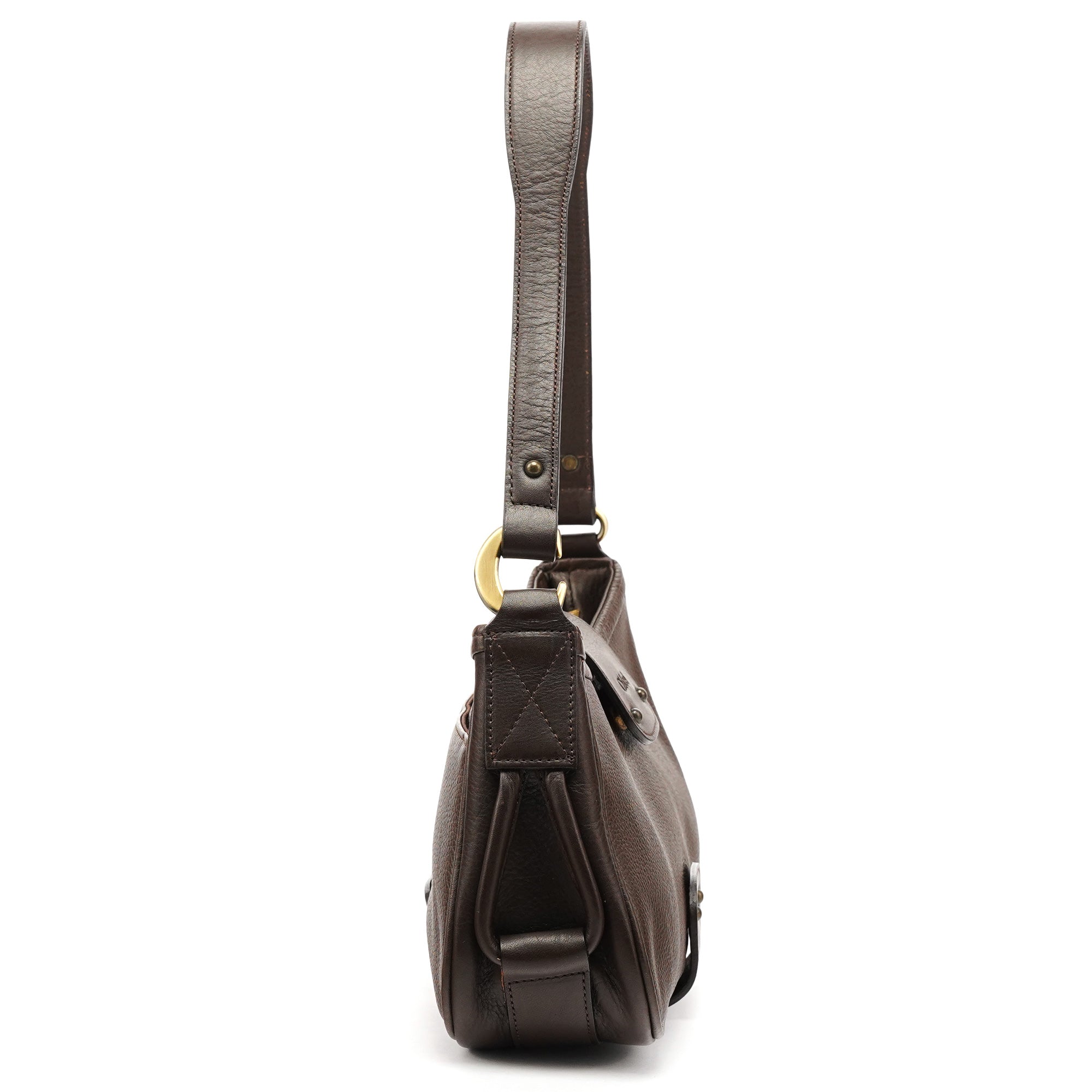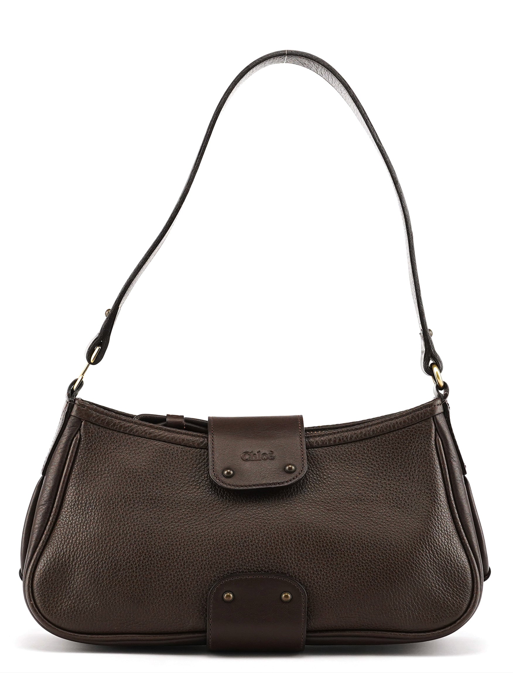 Designed in the early 2000s by Phoebe Philo, this vintage Chloé shoulder bag features rich brown cowhide leather with a distinctive crescent moon design. The compact silhouette showcases dual leather tabs with silver-tone studs, a single adjustable shoulder strap, and gold-tone hardware accents. The streamlined shape offers a zip-top closure with a spacious interior perfect for daily essentials.