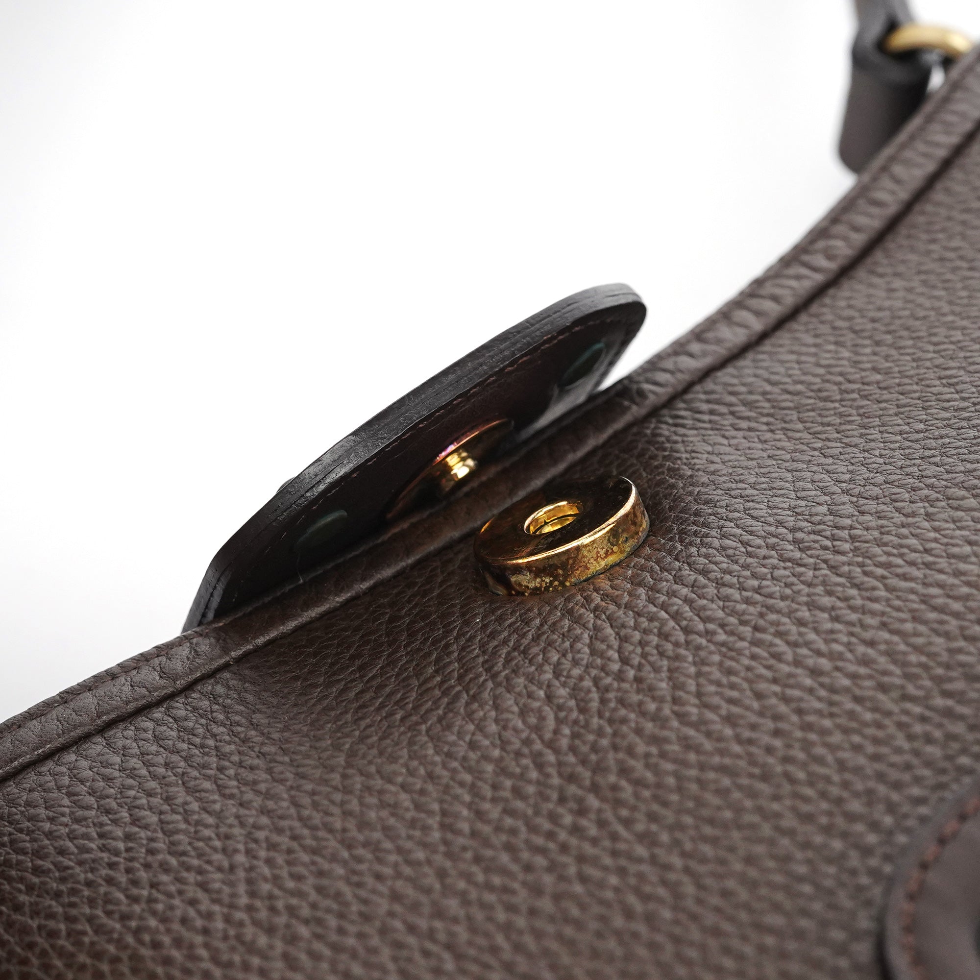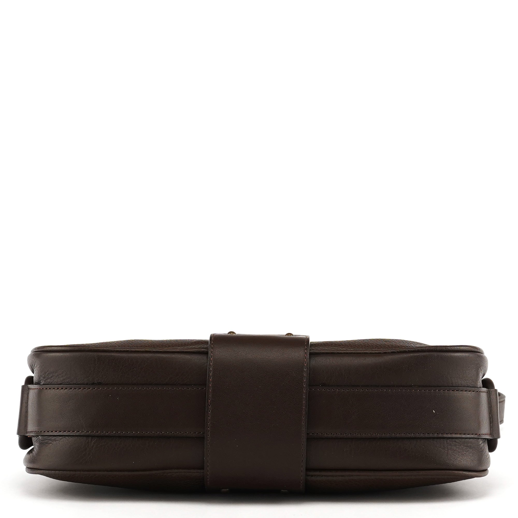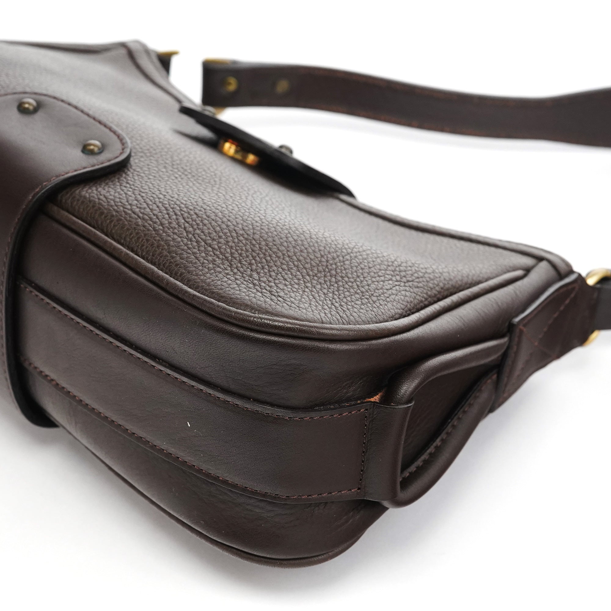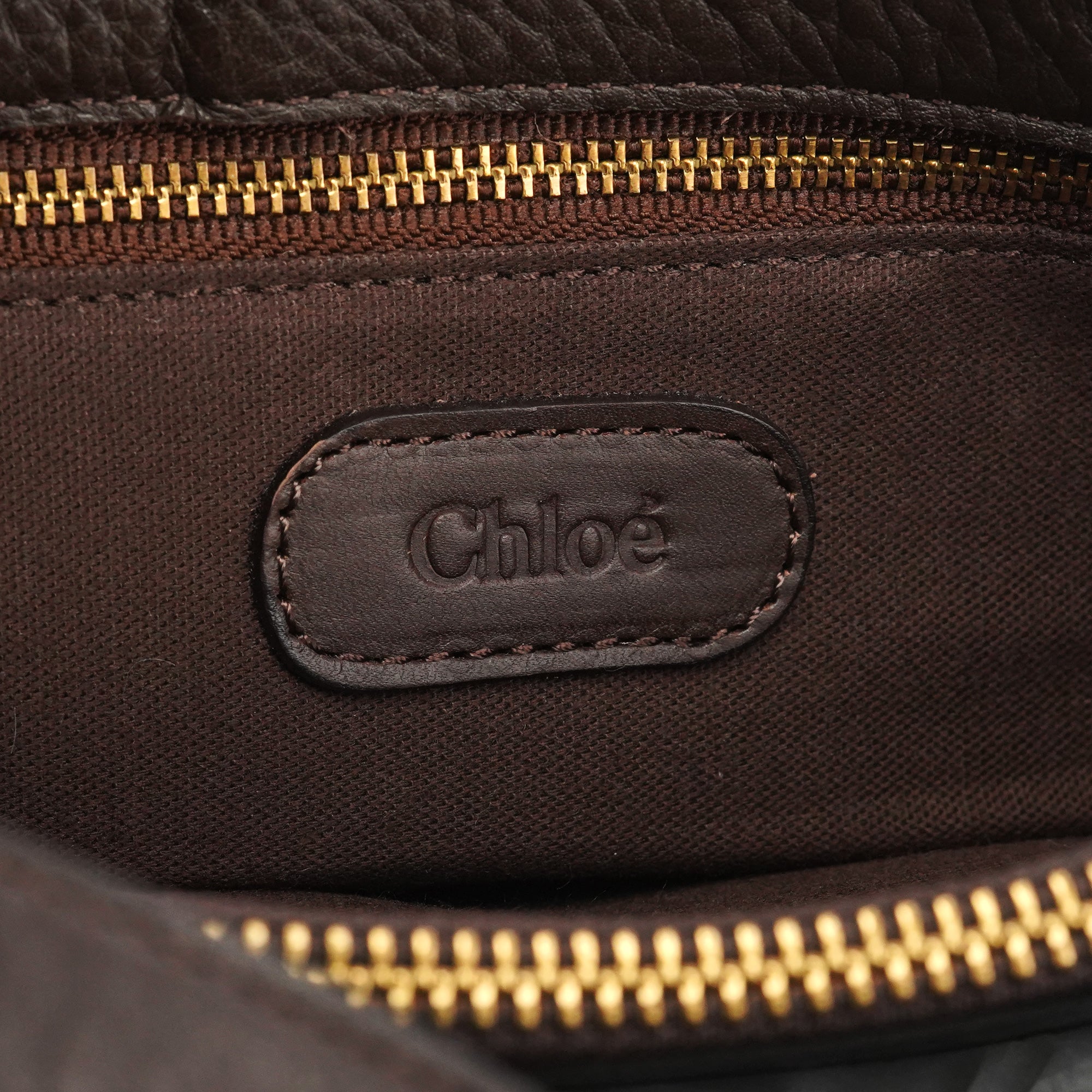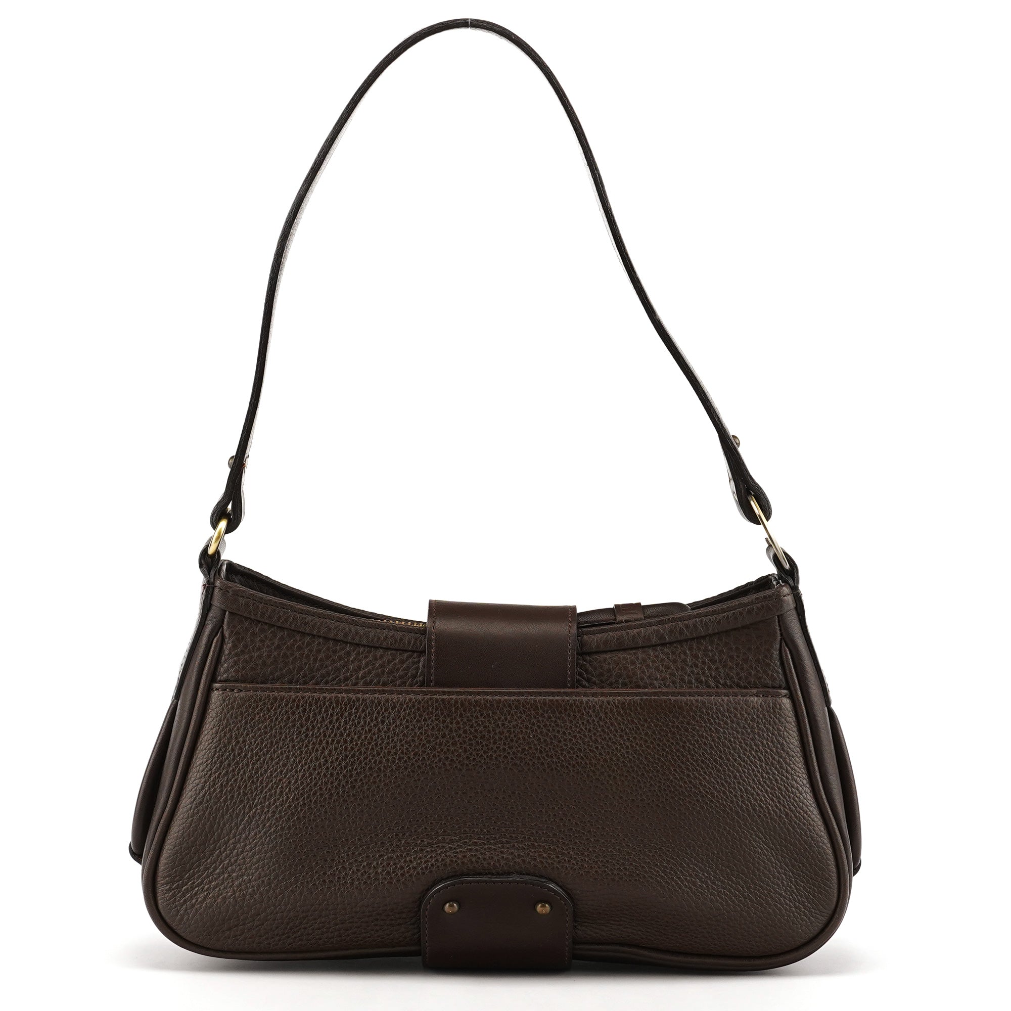 Designed in the early 2000s by Phoebe Philo, this vintage Chloé shoulder bag features rich brown cowhide leather with a distinctive crescent moon design. The compact silhouette showcases dual leather tabs with silver-tone studs, a single adjustable shoulder strap, and gold-tone hardware accents. The streamlined shape offers a zip-top closure with a spacious interior perfect for daily essentials.