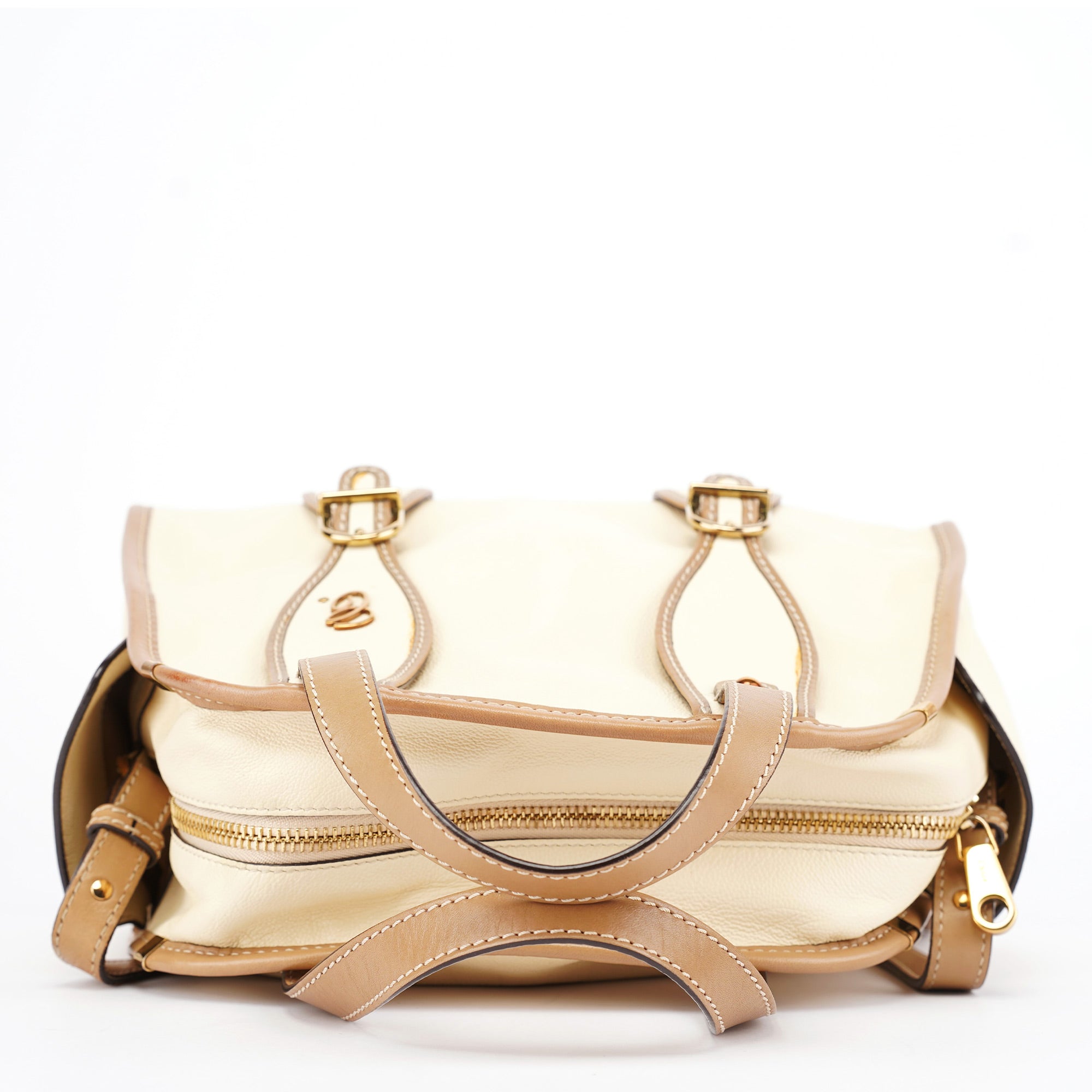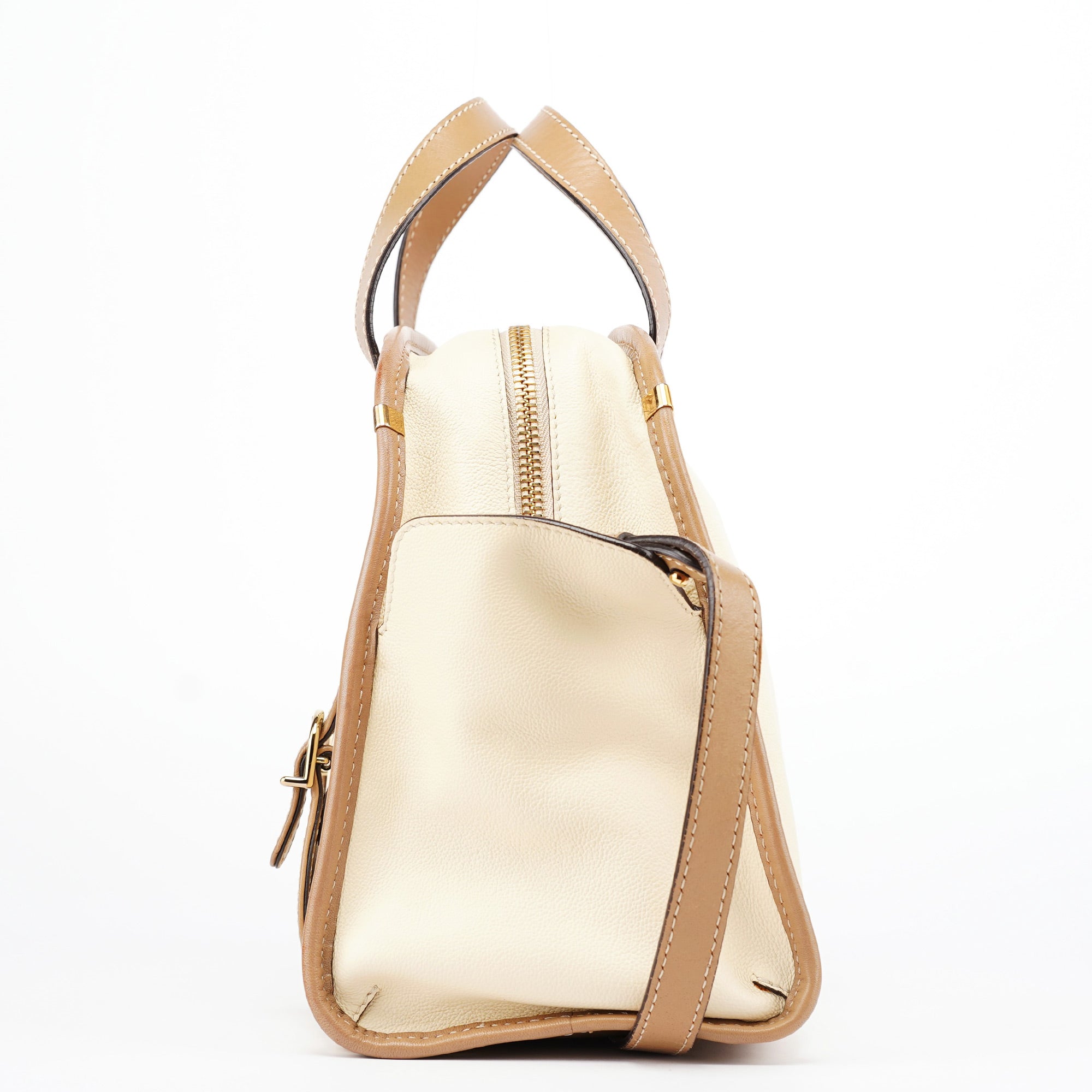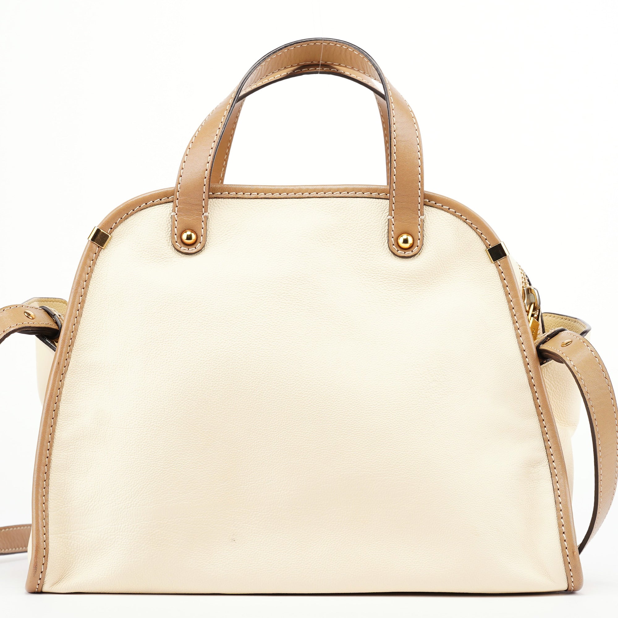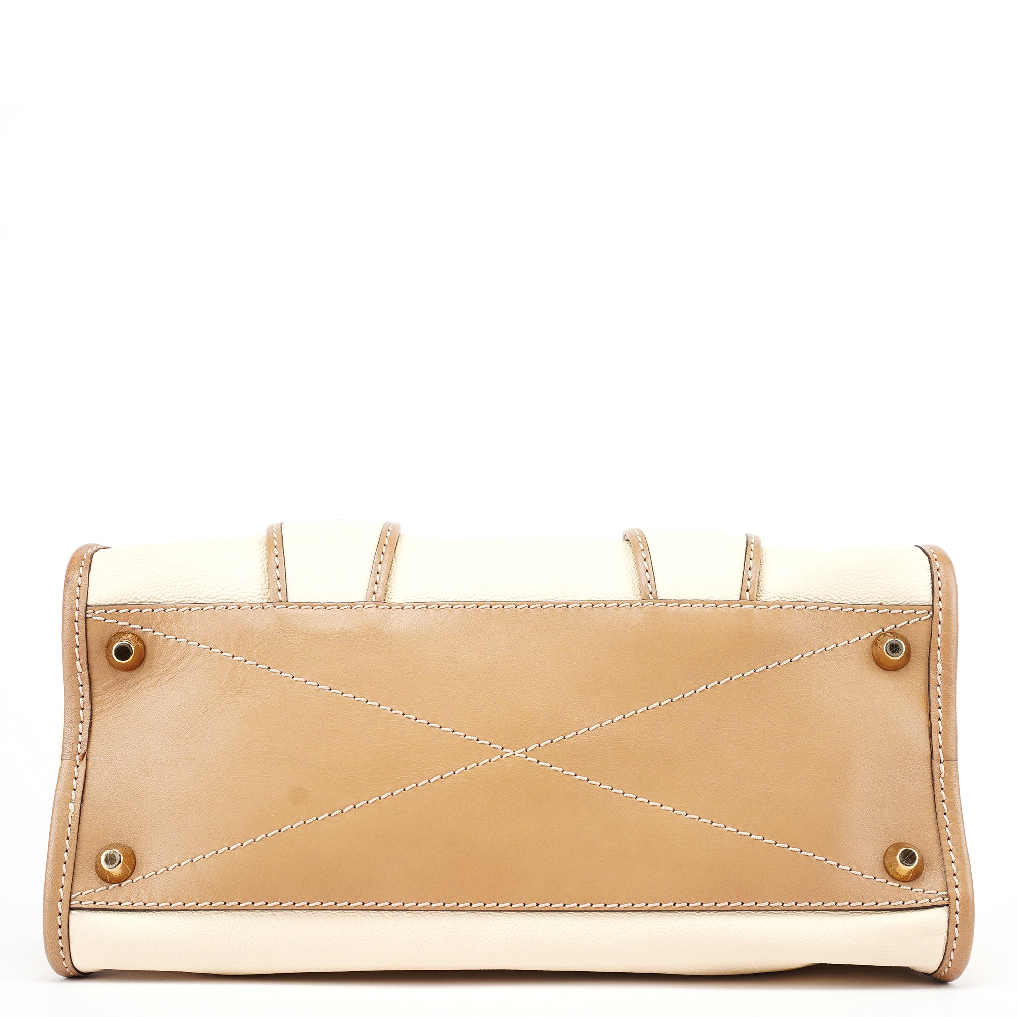 Designed in the early 2000s, this Chloé 2-way tote bag is crafted from cream leather with smooth tan trim and gold-tone hardware. The structured silhouette features double top handles, a detachable shoulder strap, and curved strap appliqués with small buckles. The interior is lined in beige fabric and includes a slip pocket with magnetic closure.